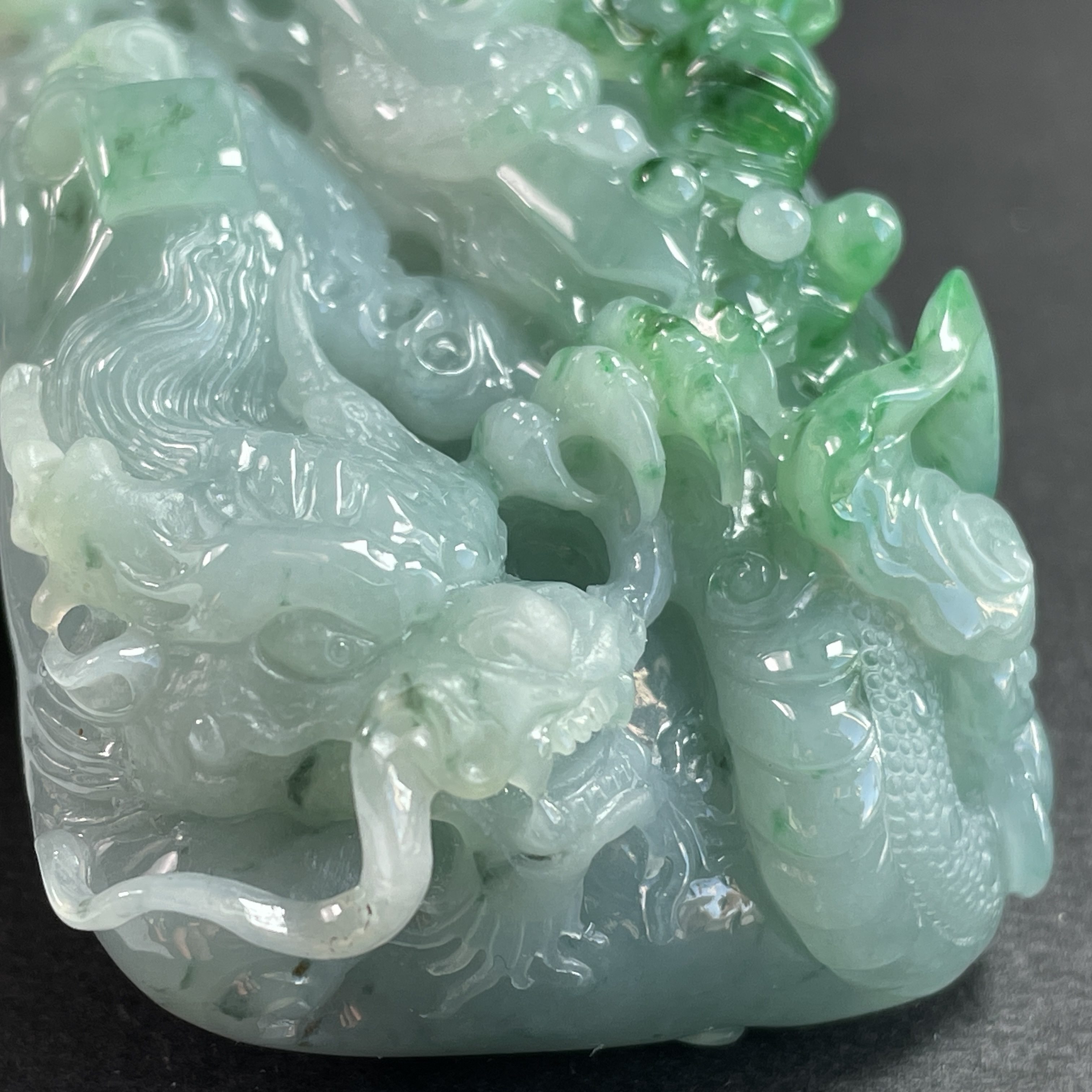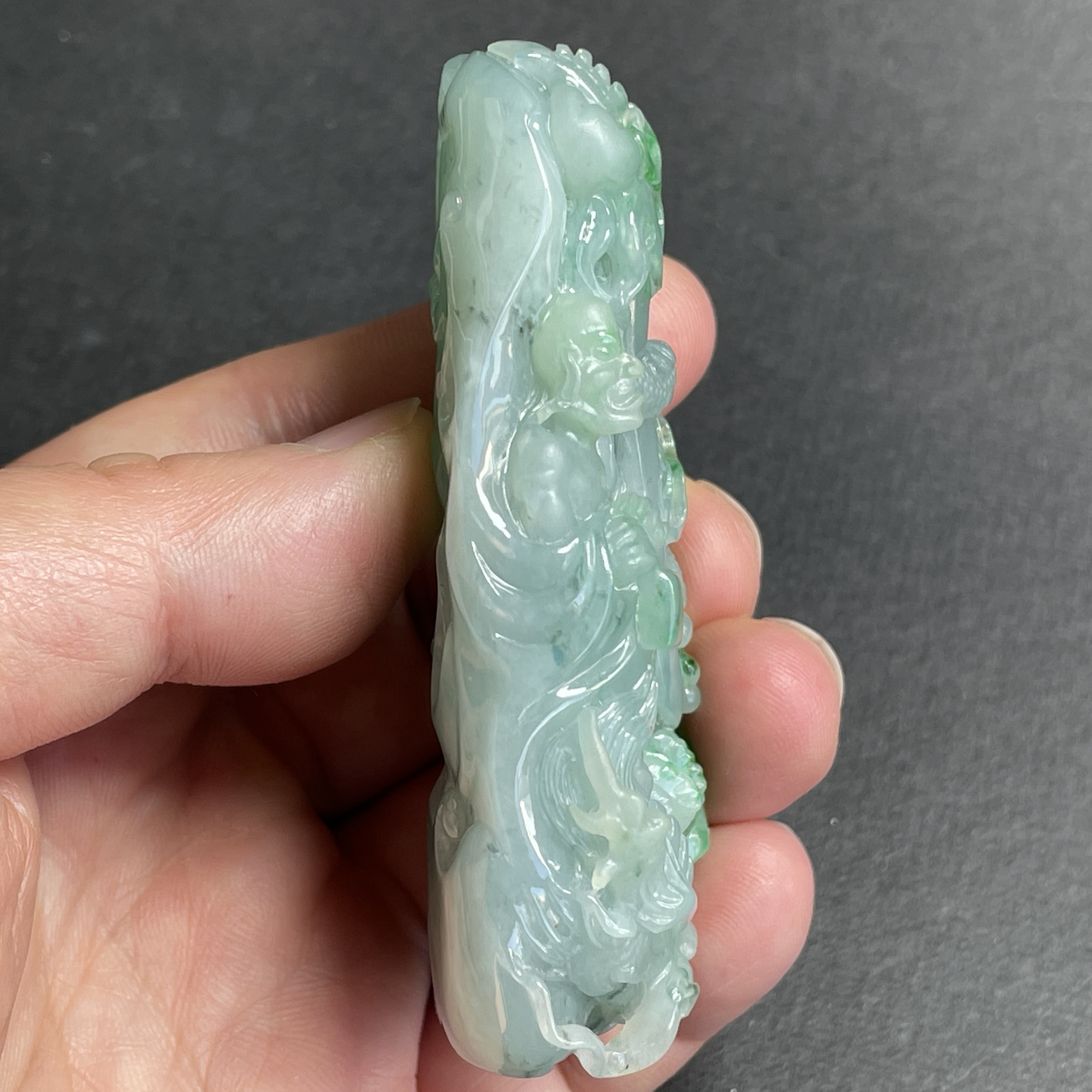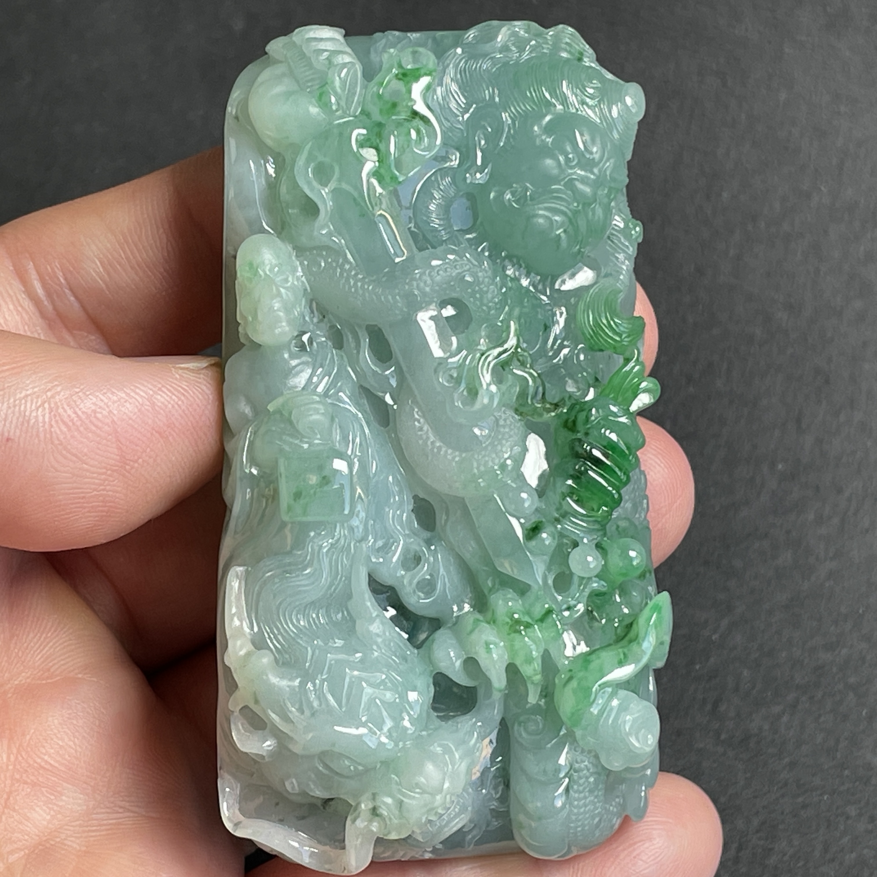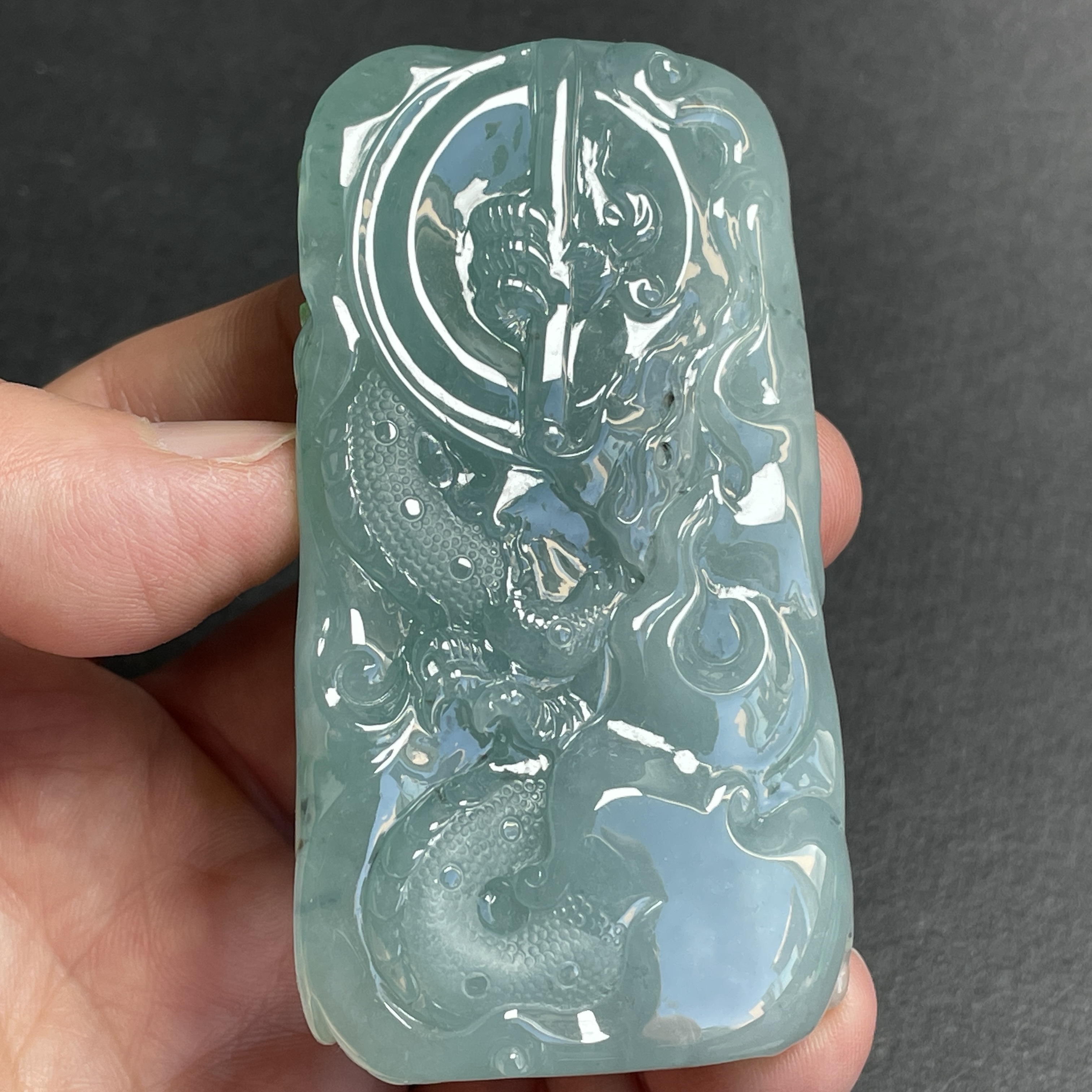 天然翡翠A玉,冰種陽綠,厚庄,種水色俱全,大師級作品,100%大師手工雕工,連檀木木座。完美無紋裂!