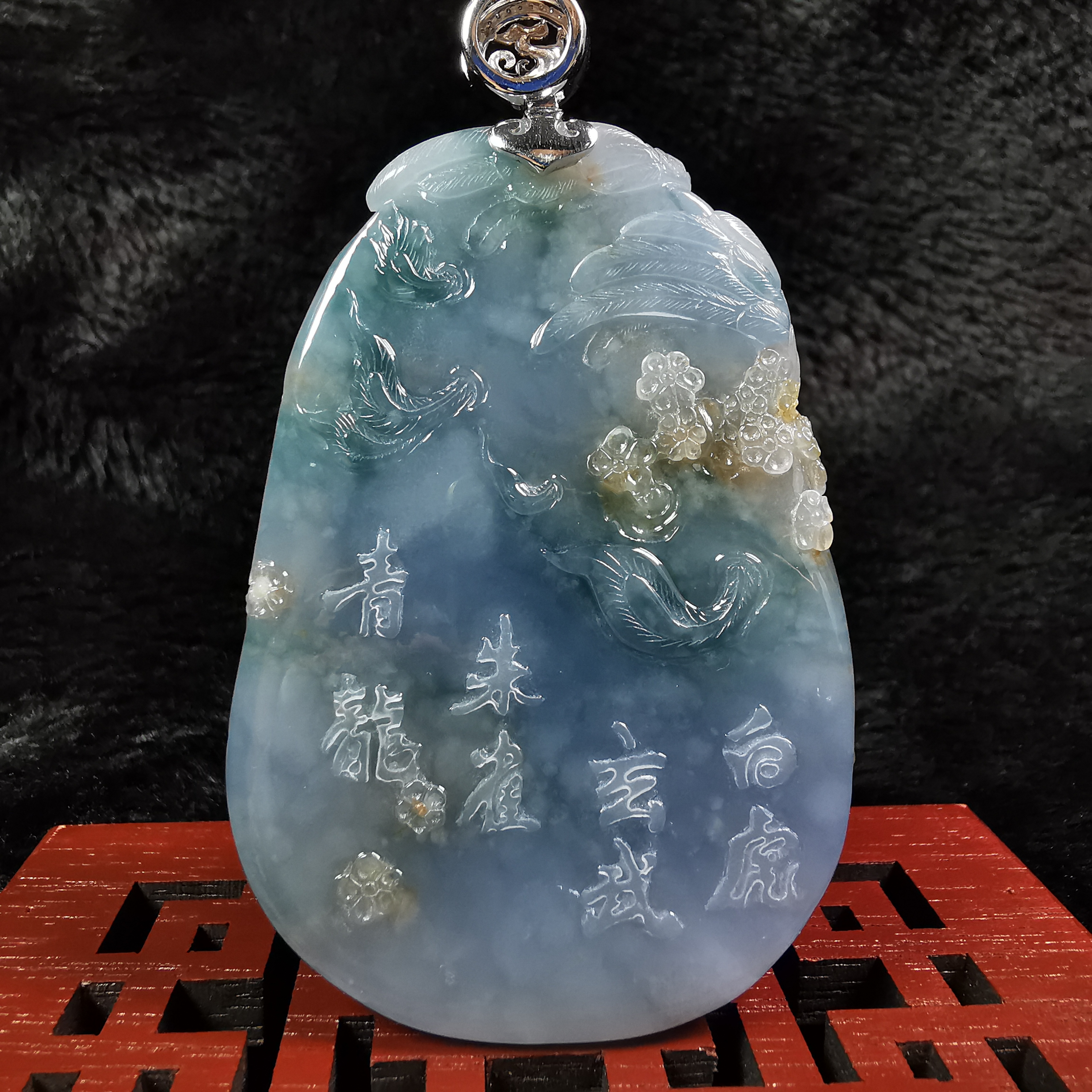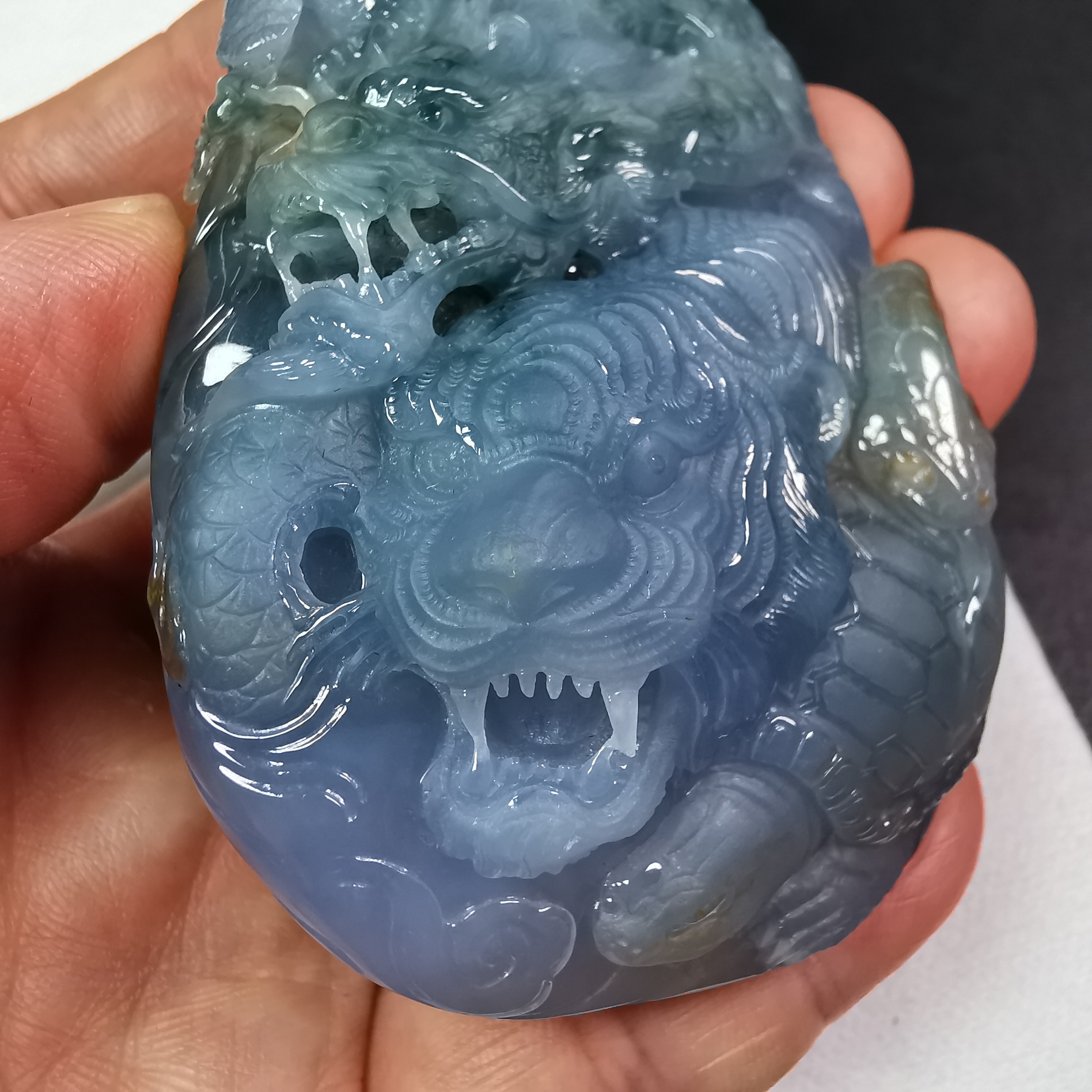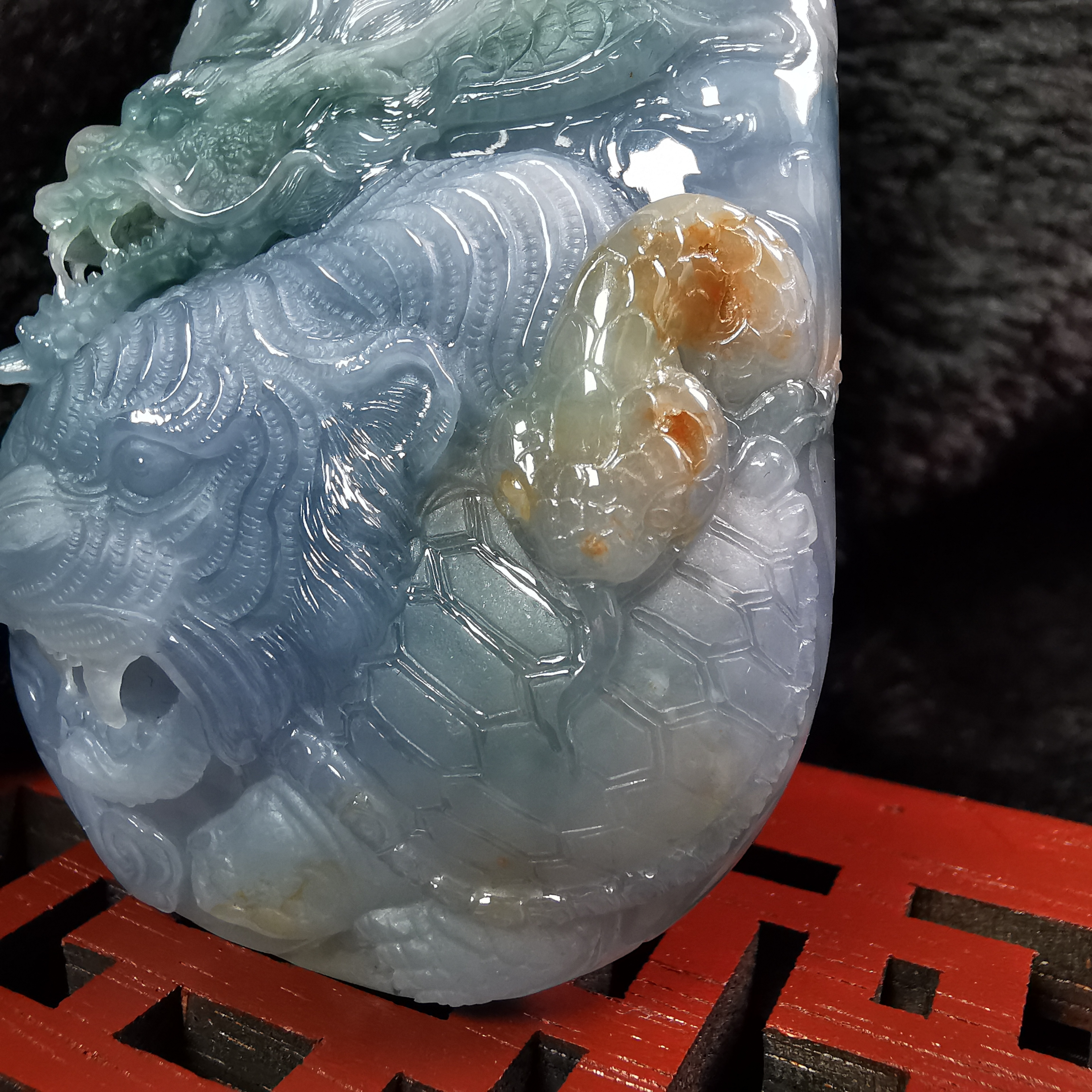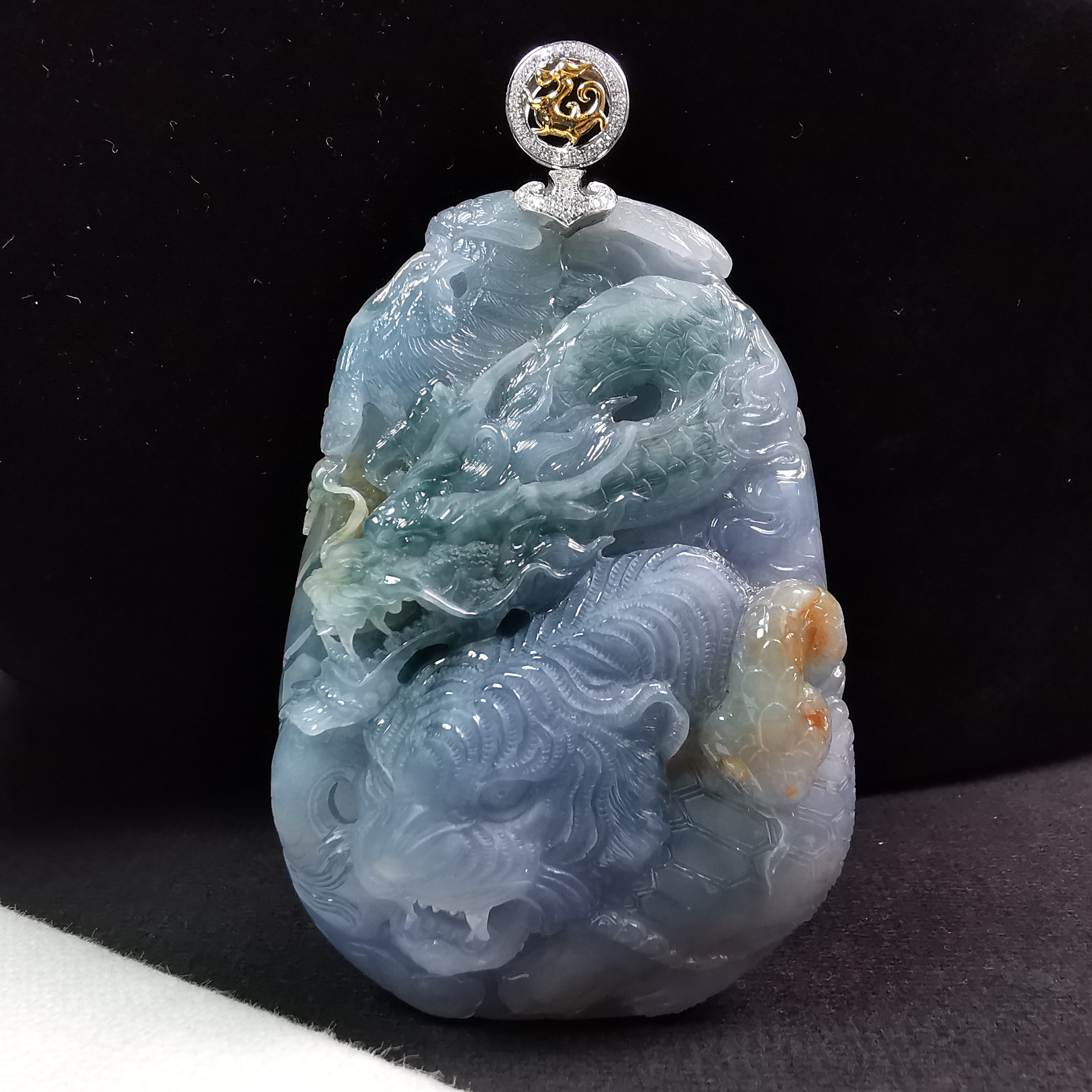 大師將一件原本帶有三色的玉料,巧妙地在每種顏色的分佈上,巧雕了四隻神獸,雕刻得十分兇猛,栩栩如生!三彩玉料 (紫底帶飄藍花、及黃翡),玉質細膩,底庄乾淨,完美無紋裂。扣頭是大師特別為此作品設計的,18K金配鑽