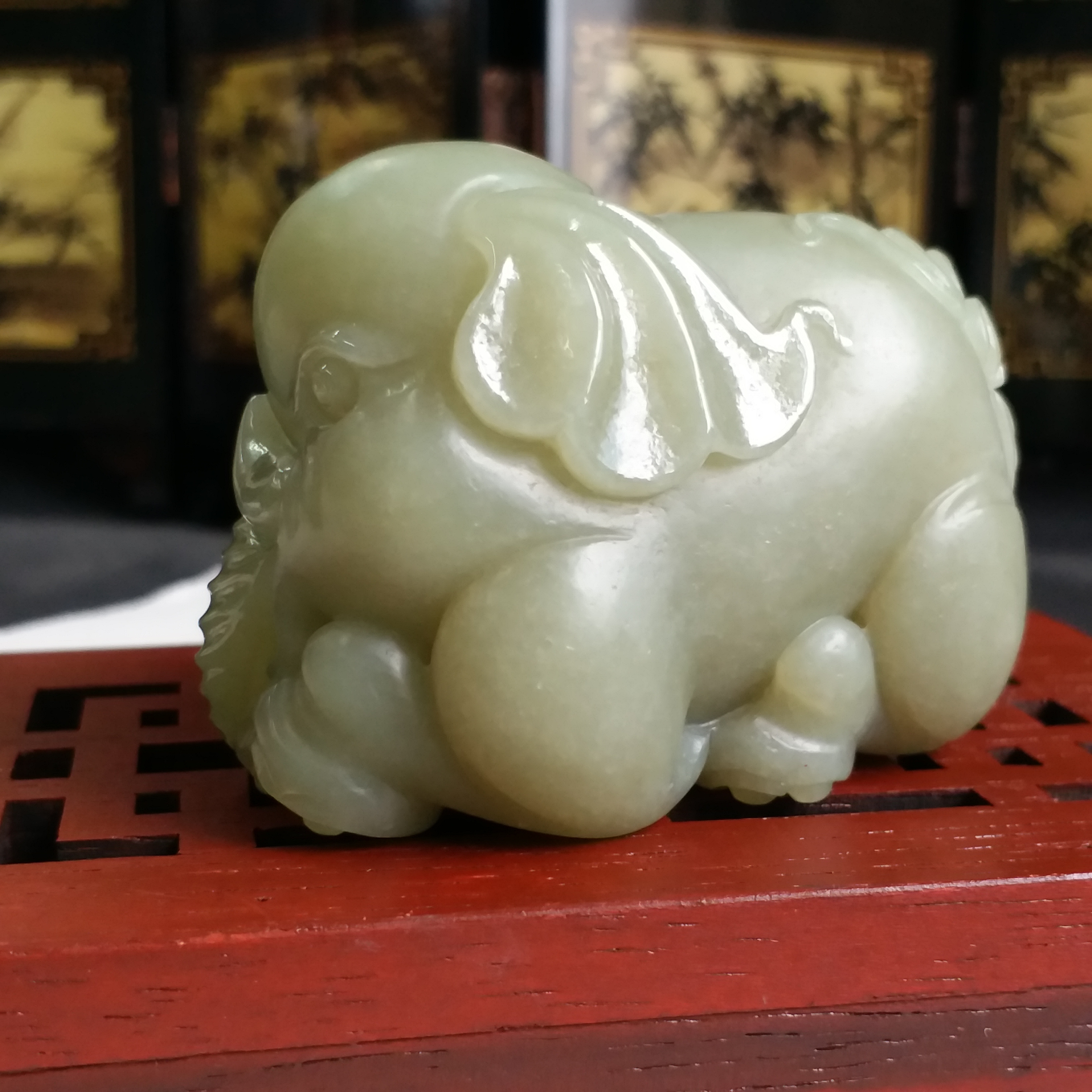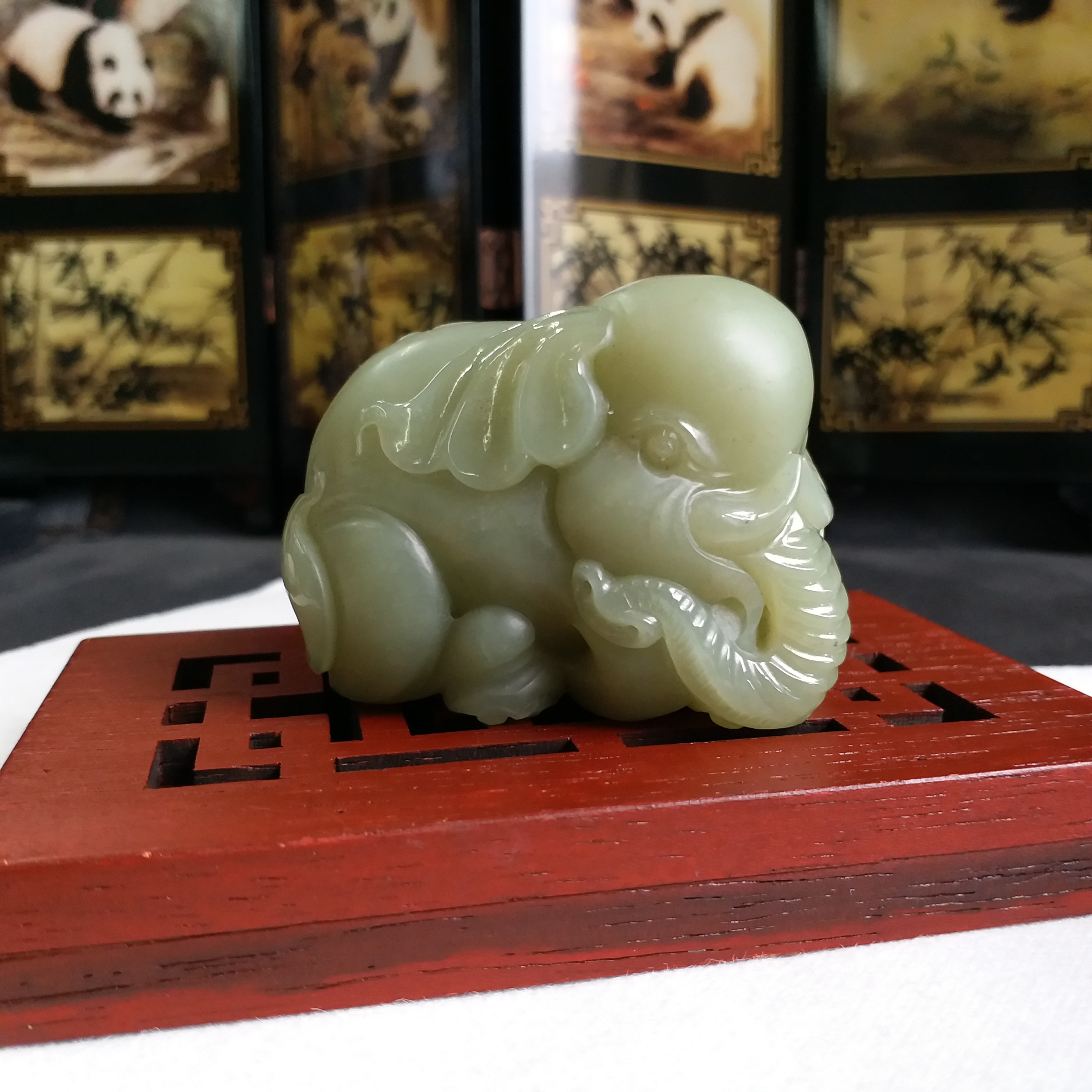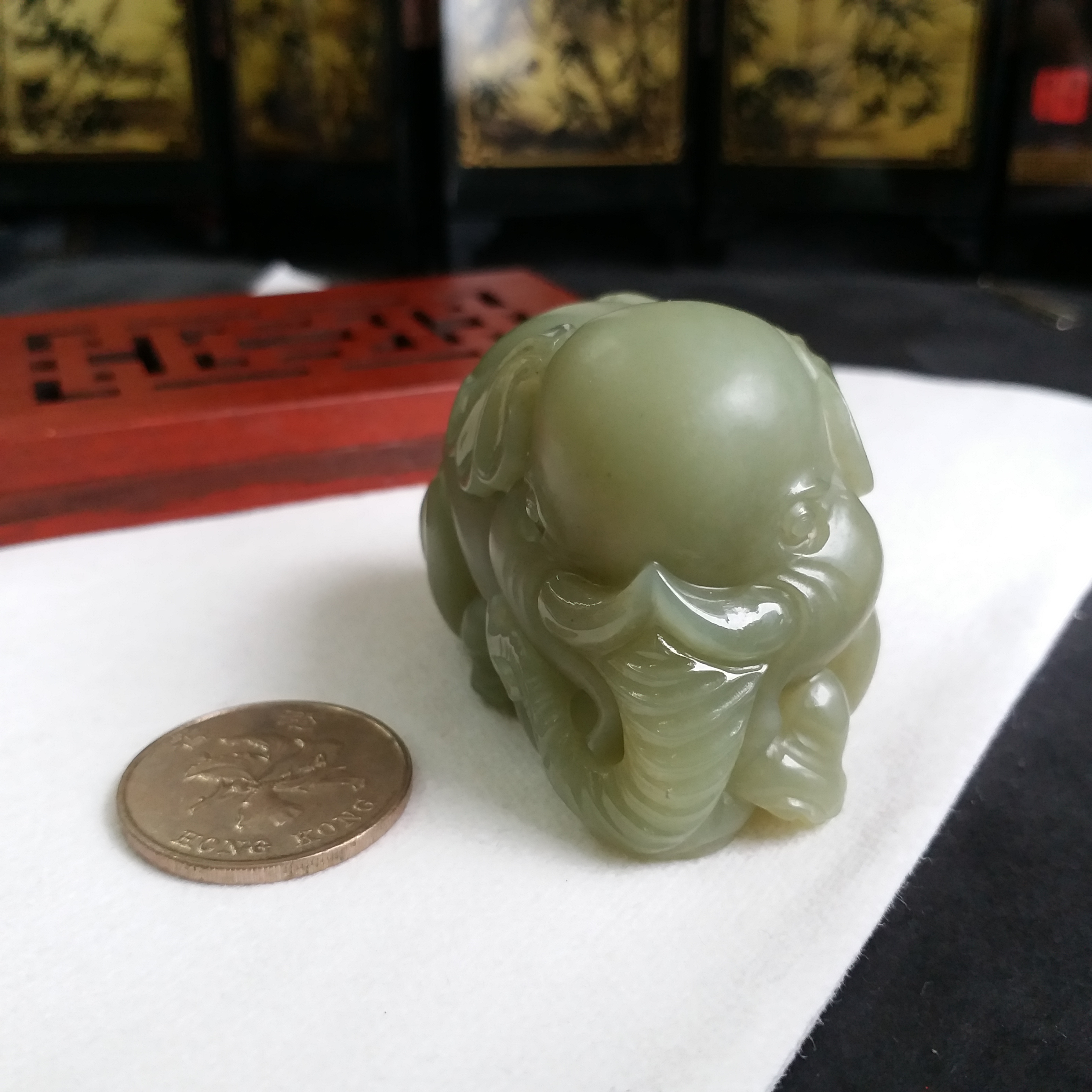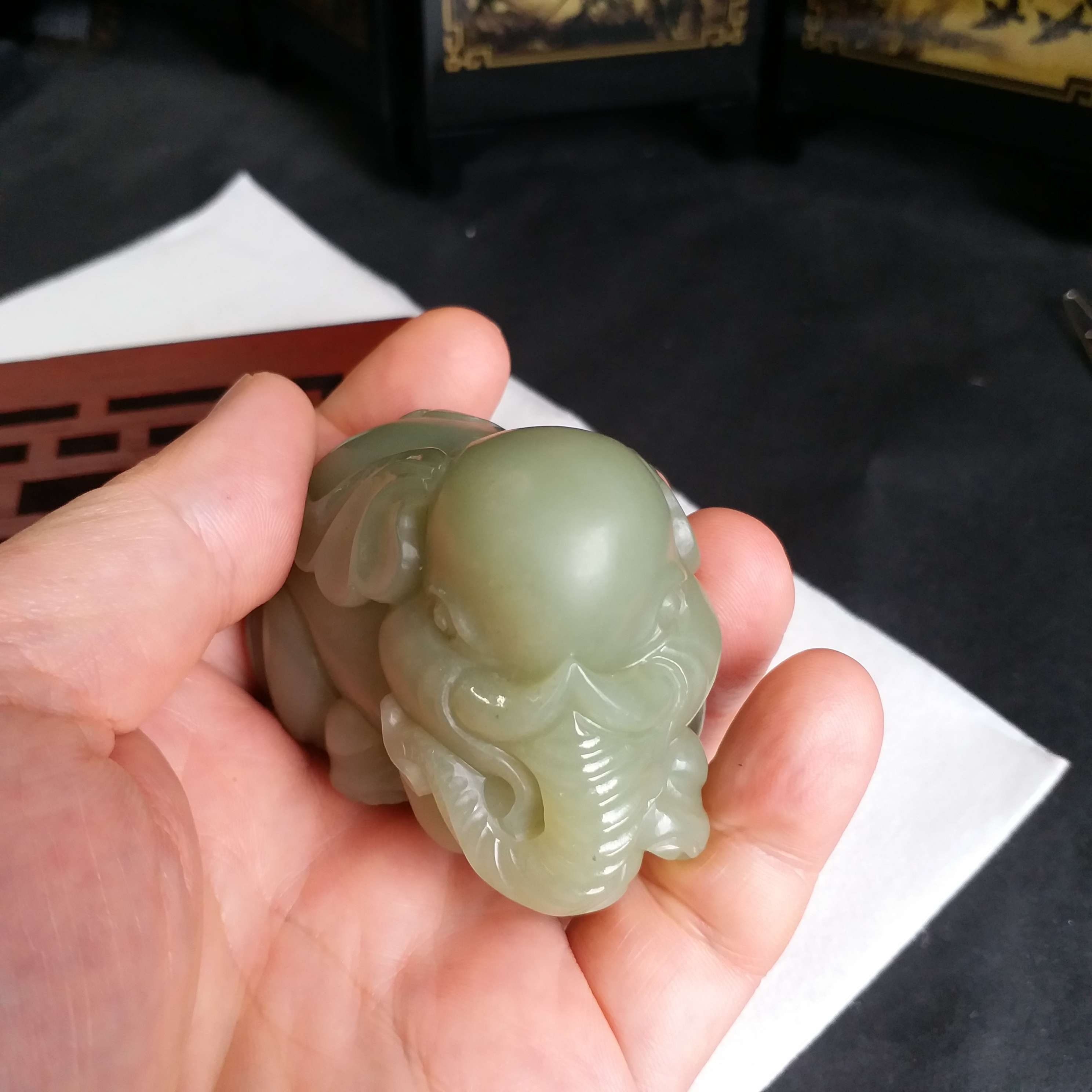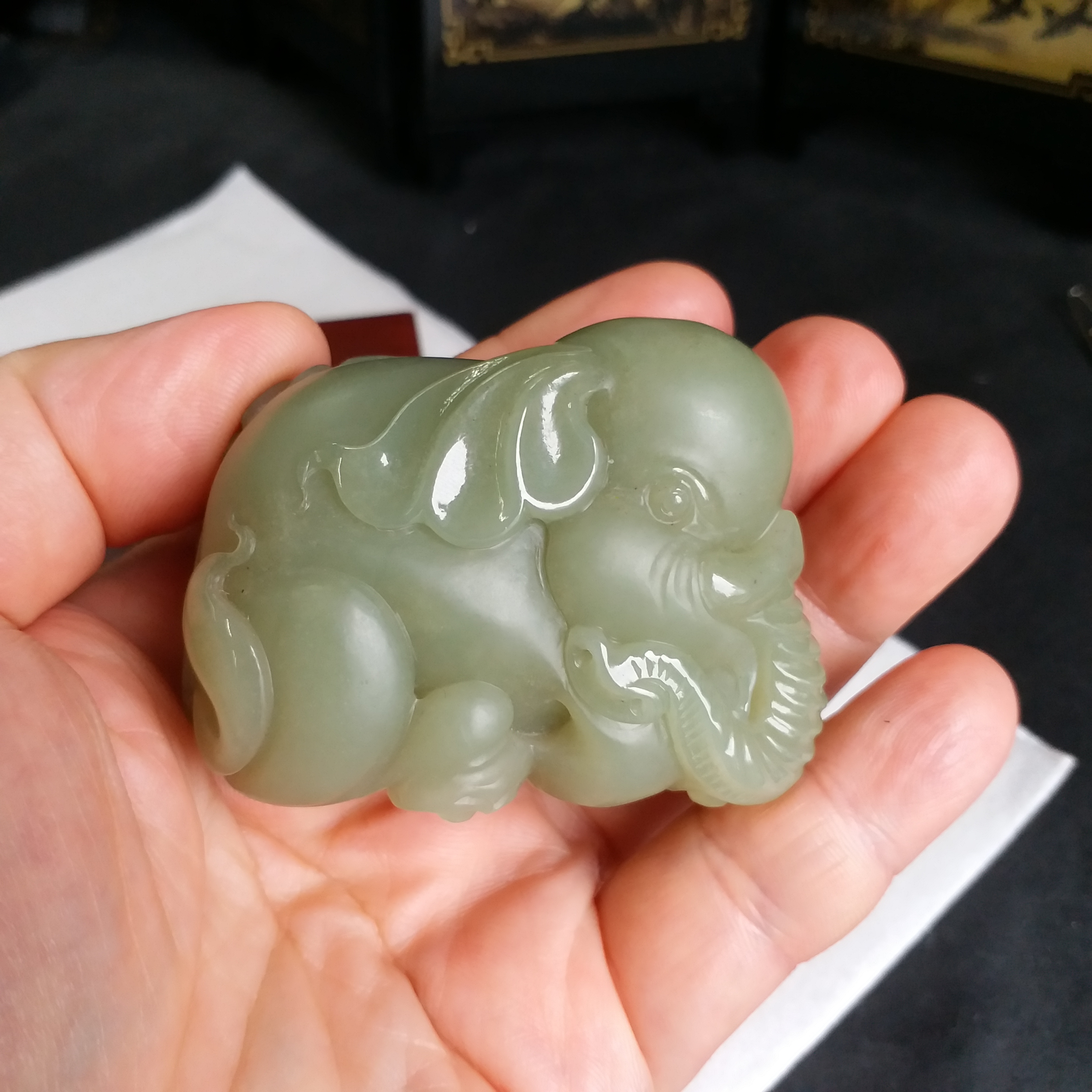 和田玉黃口料,油性好,過燈微結構,雕工精細,飽滿圓潤,適合作小擺件。古人云:「太平有象」,寓意:吉祥如意、也有吸財旺事業之願景。
