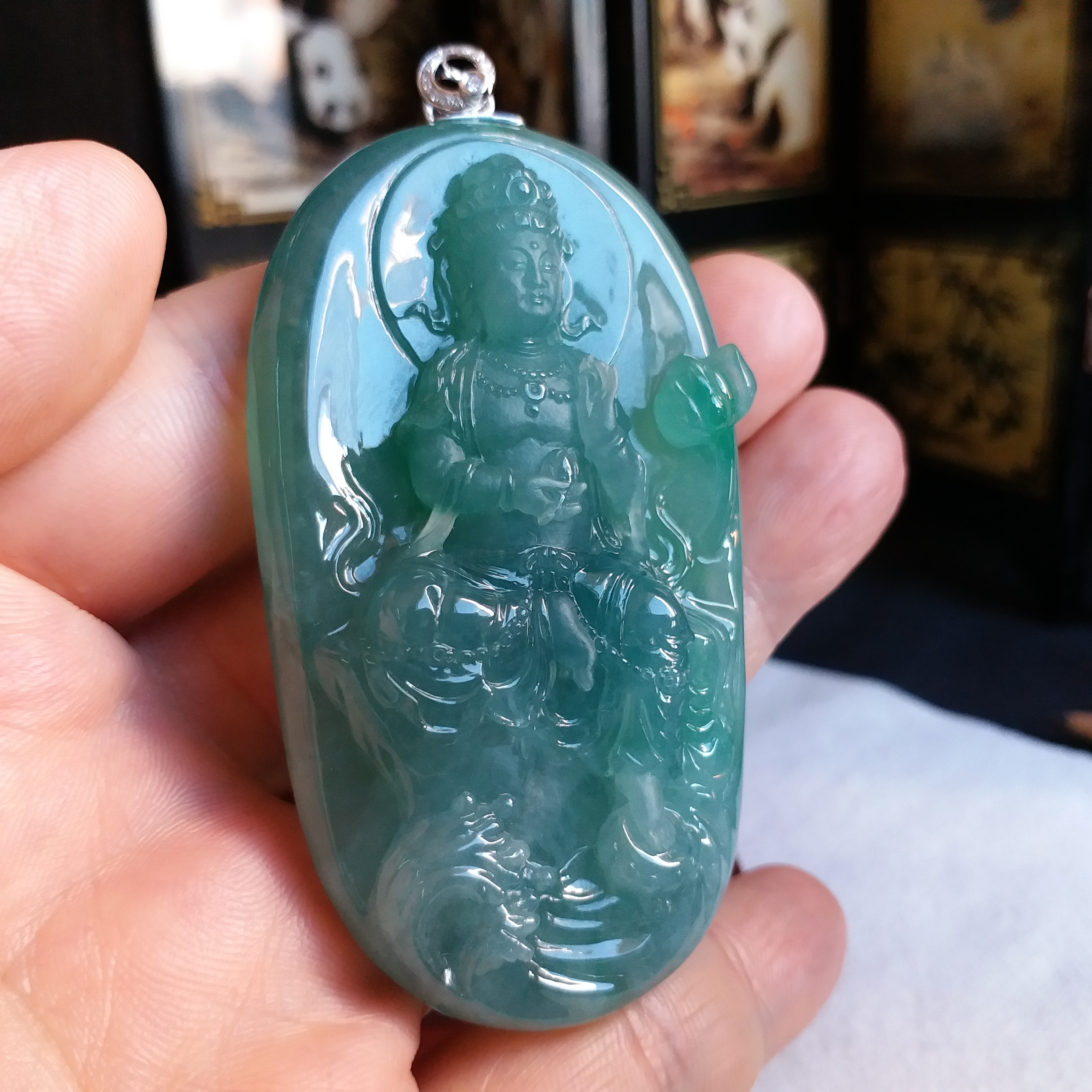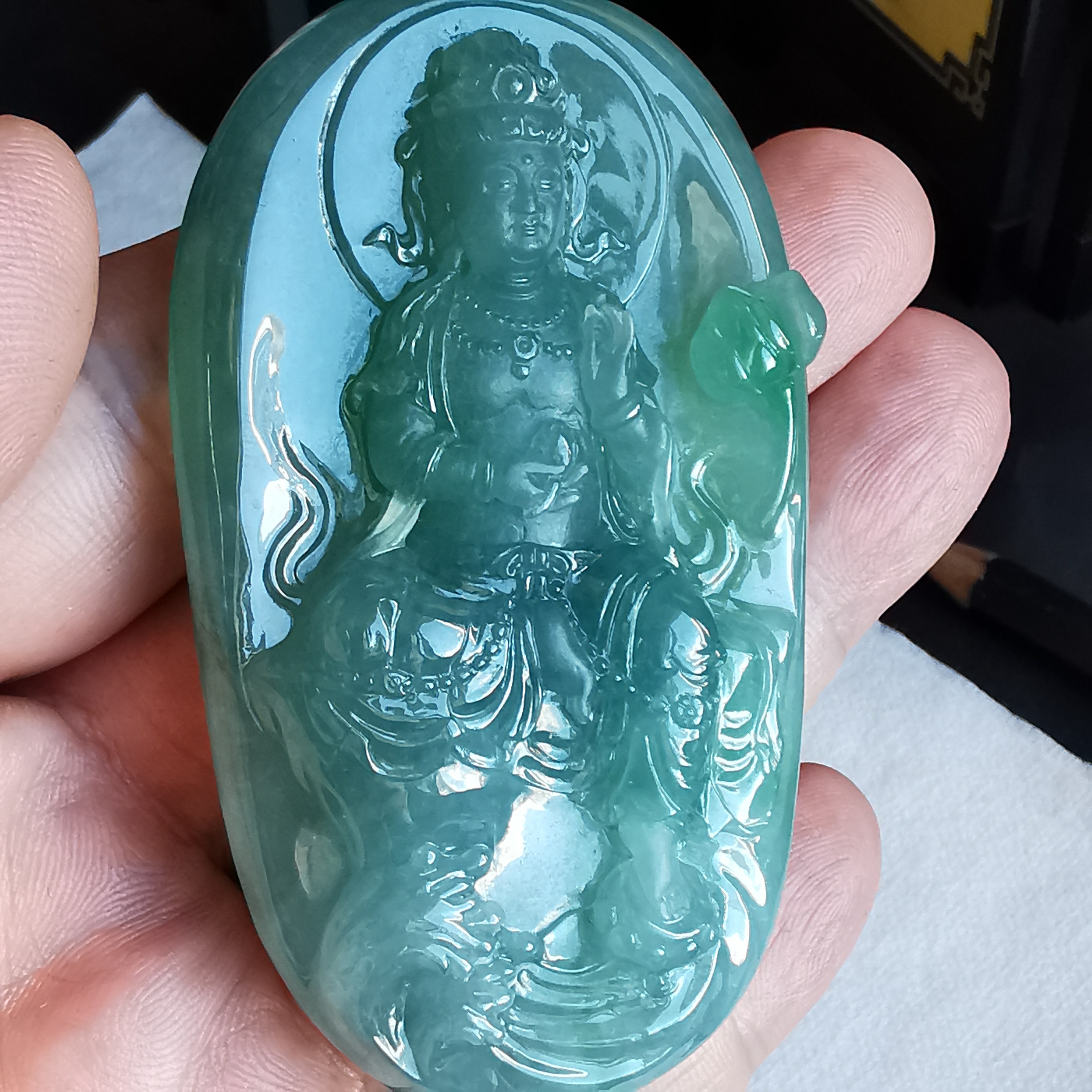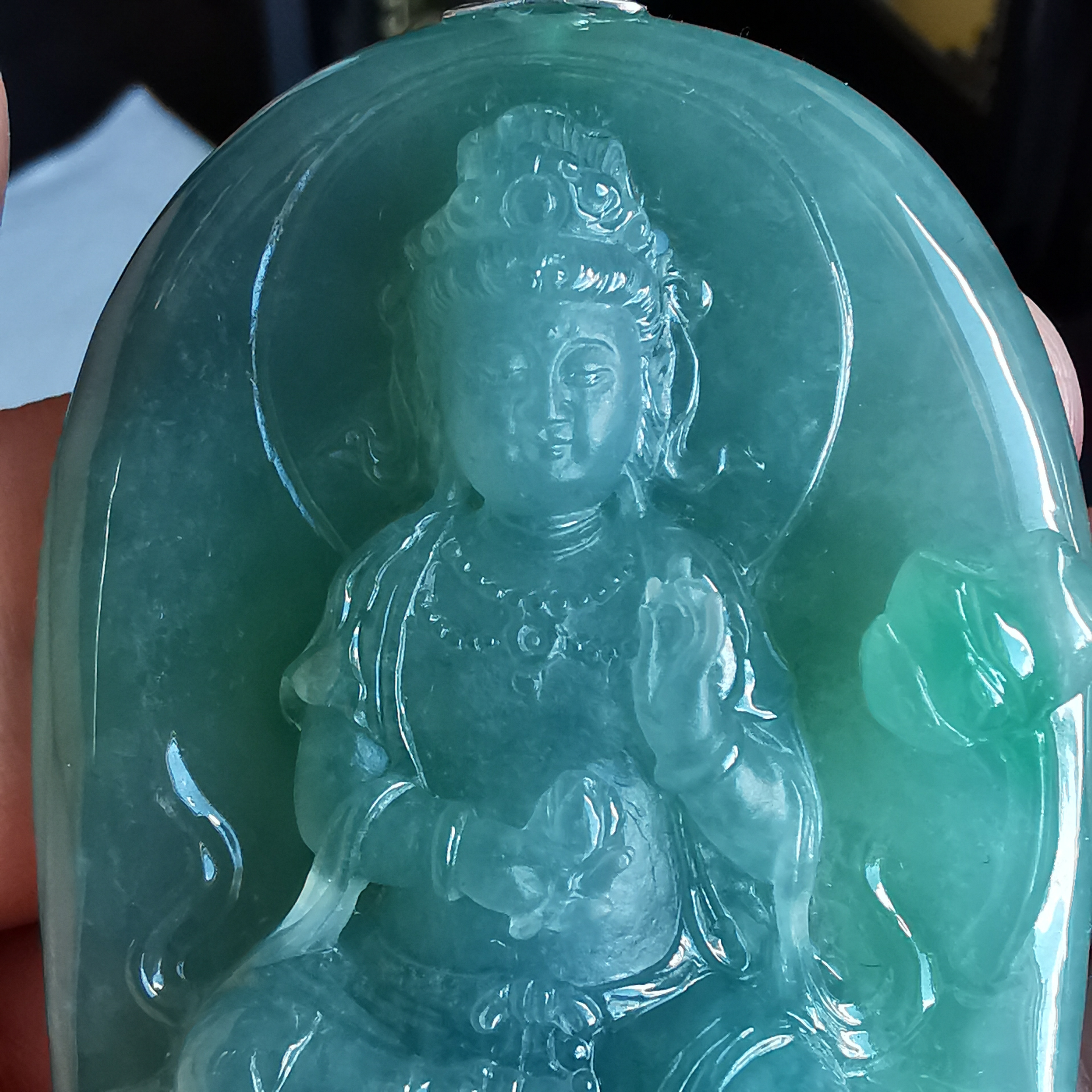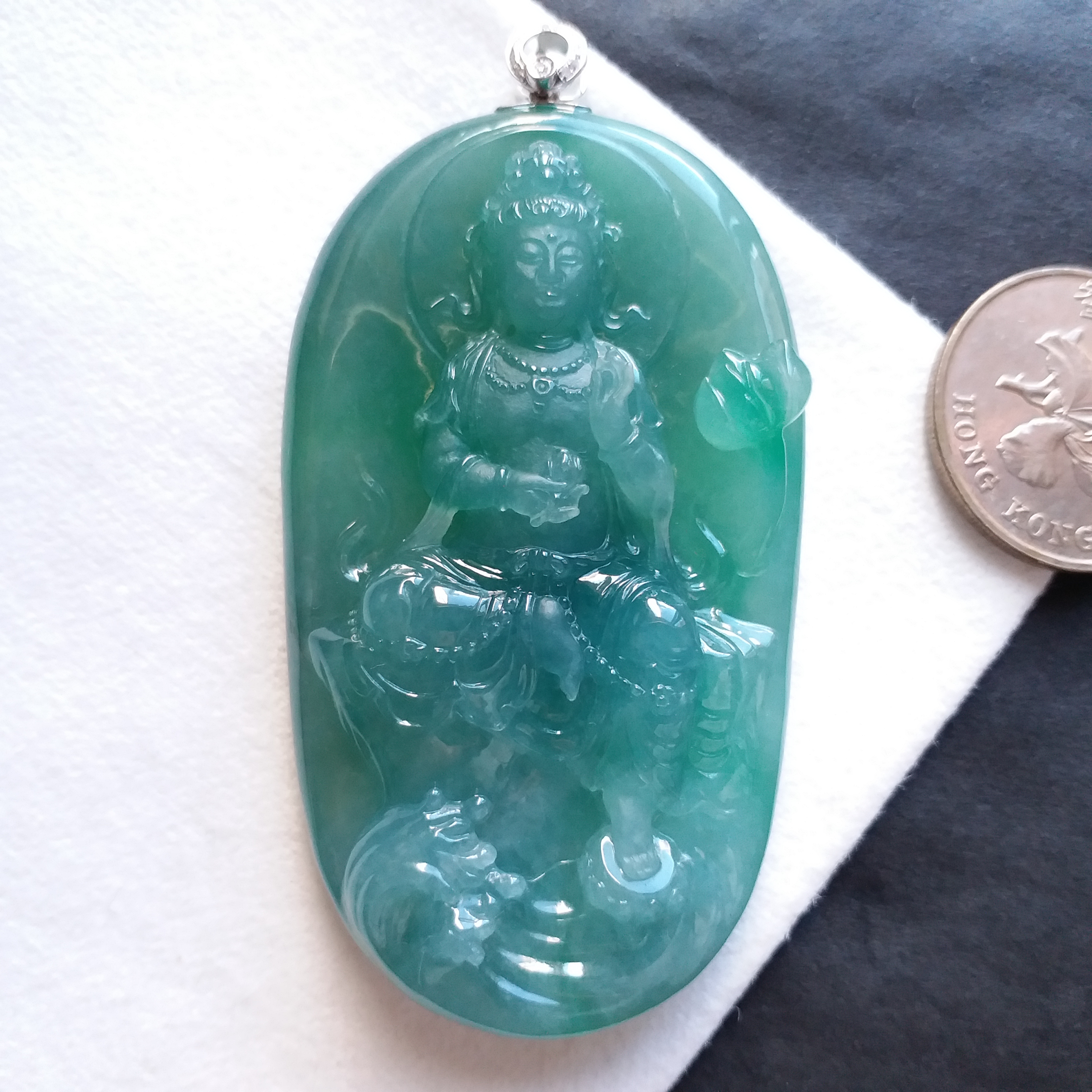 天然翡翠A玉,冰種滿綠,大師加龍老師之作品,100%手工精雕,觀音法相莊嚴,栩栩如生。完美無紋裂,配18K配鑽扣頭