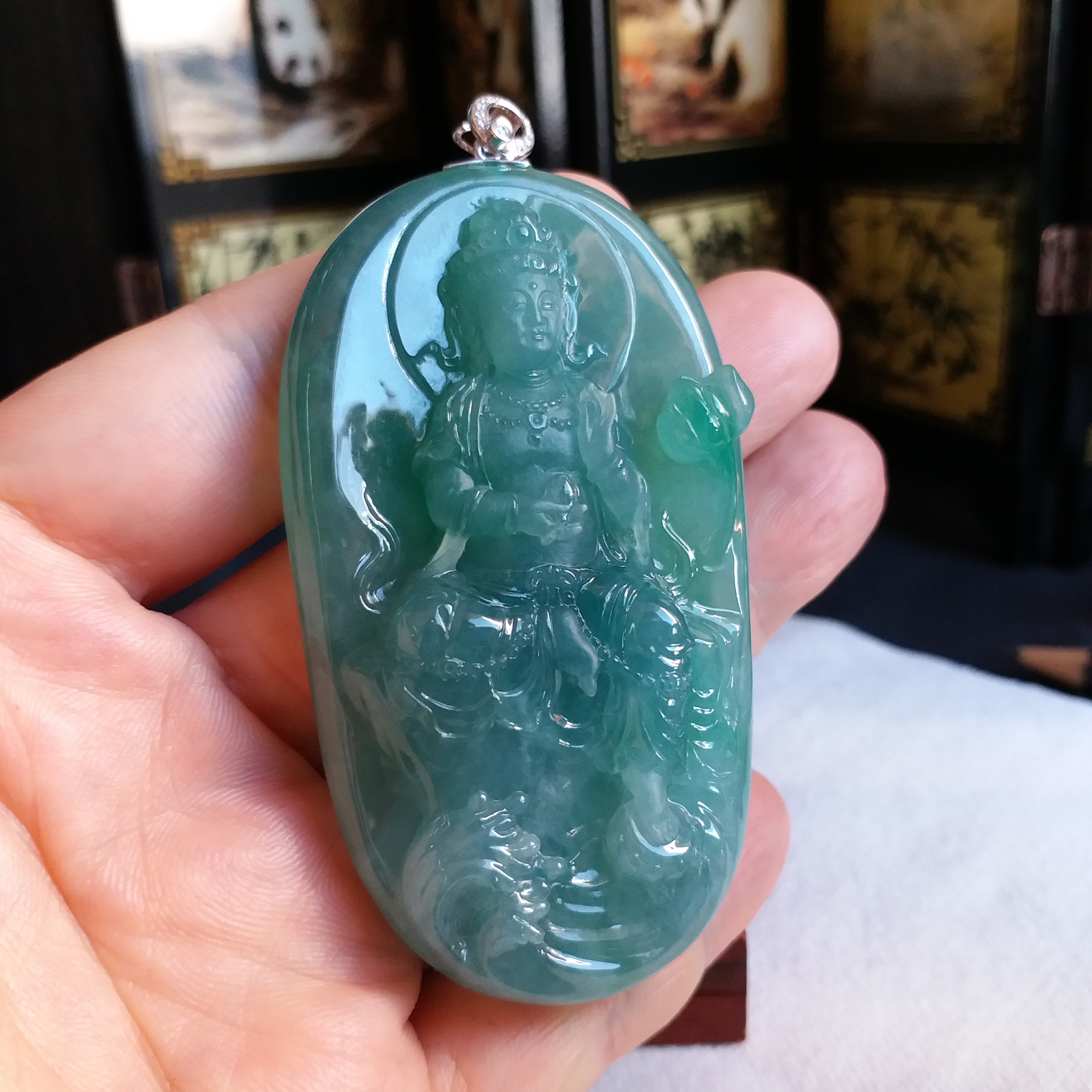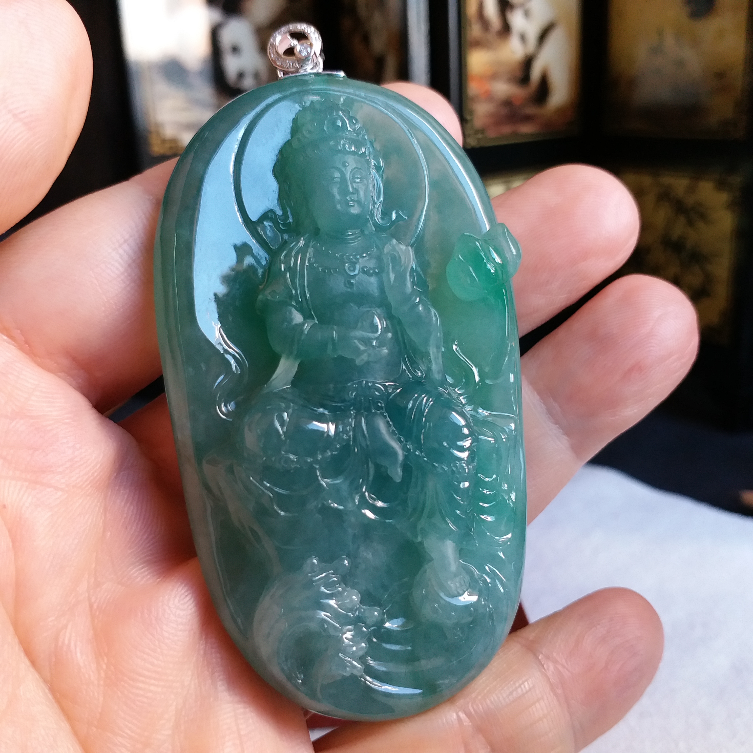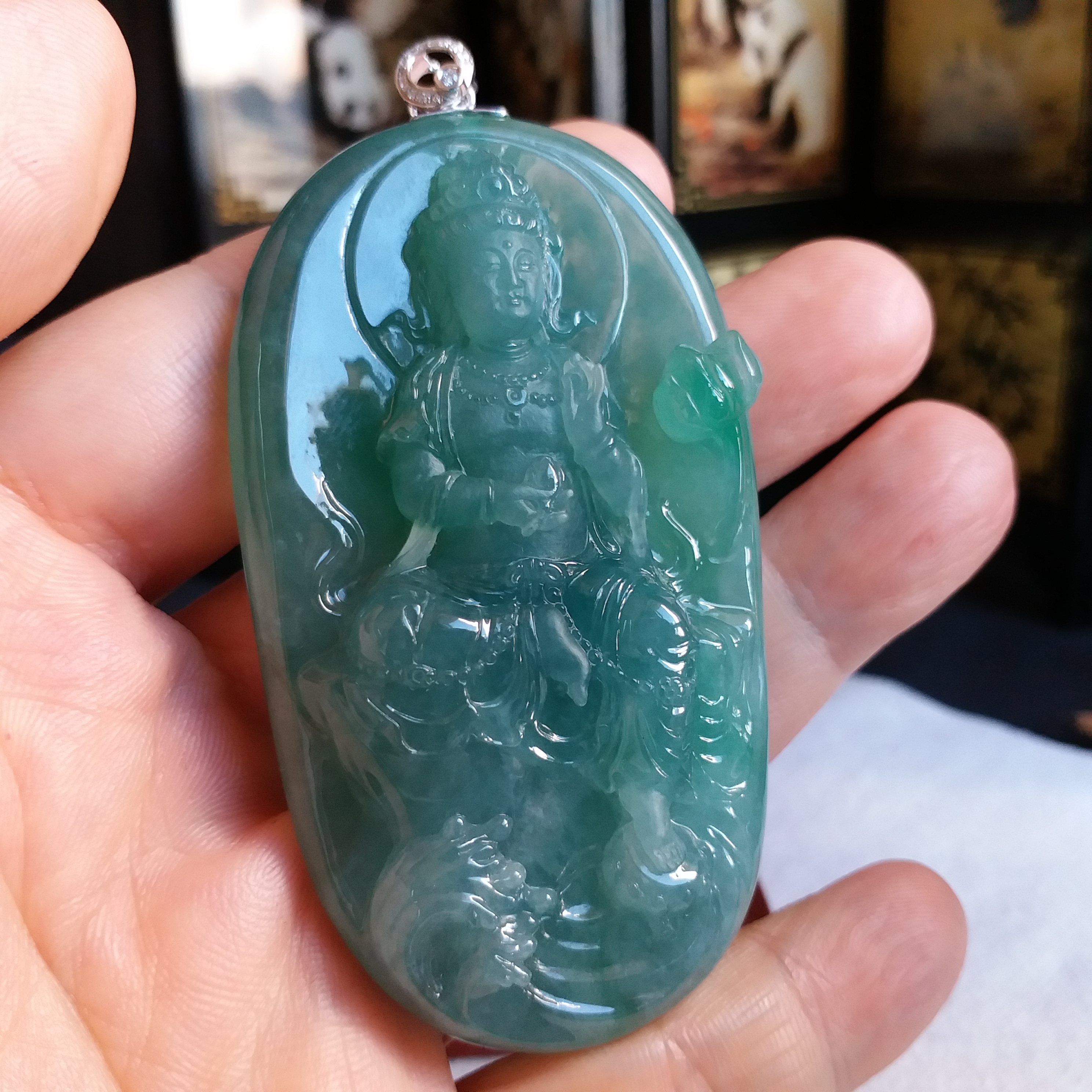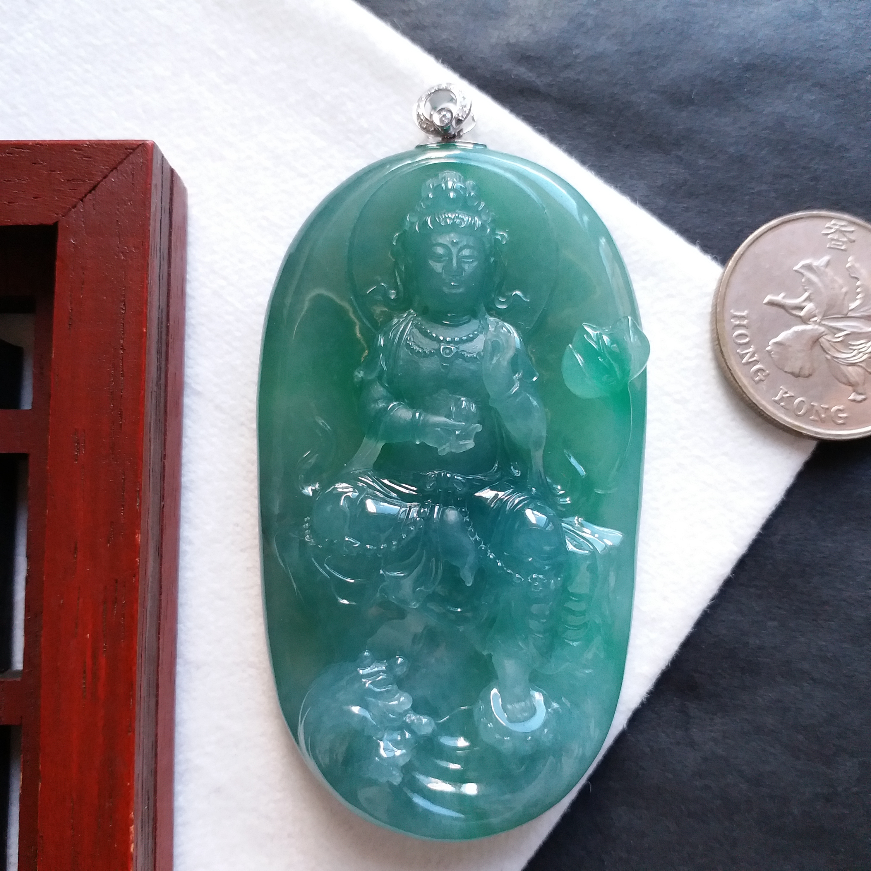 天然翡翠A玉,冰種滿綠,大師加龍老師之作品,100%手工精雕,觀音法相莊嚴,栩栩如生。完美無紋裂,配18K配鑽扣頭