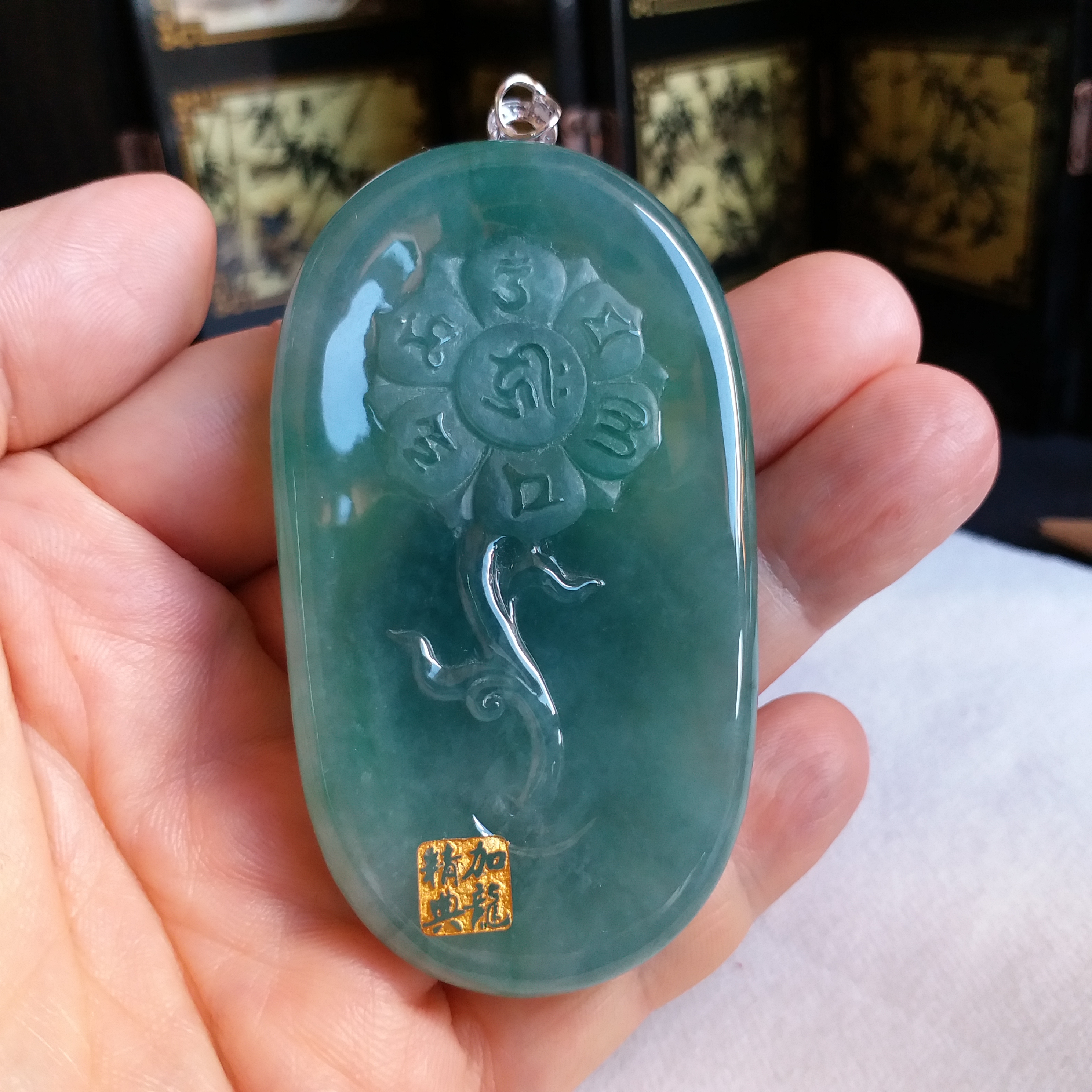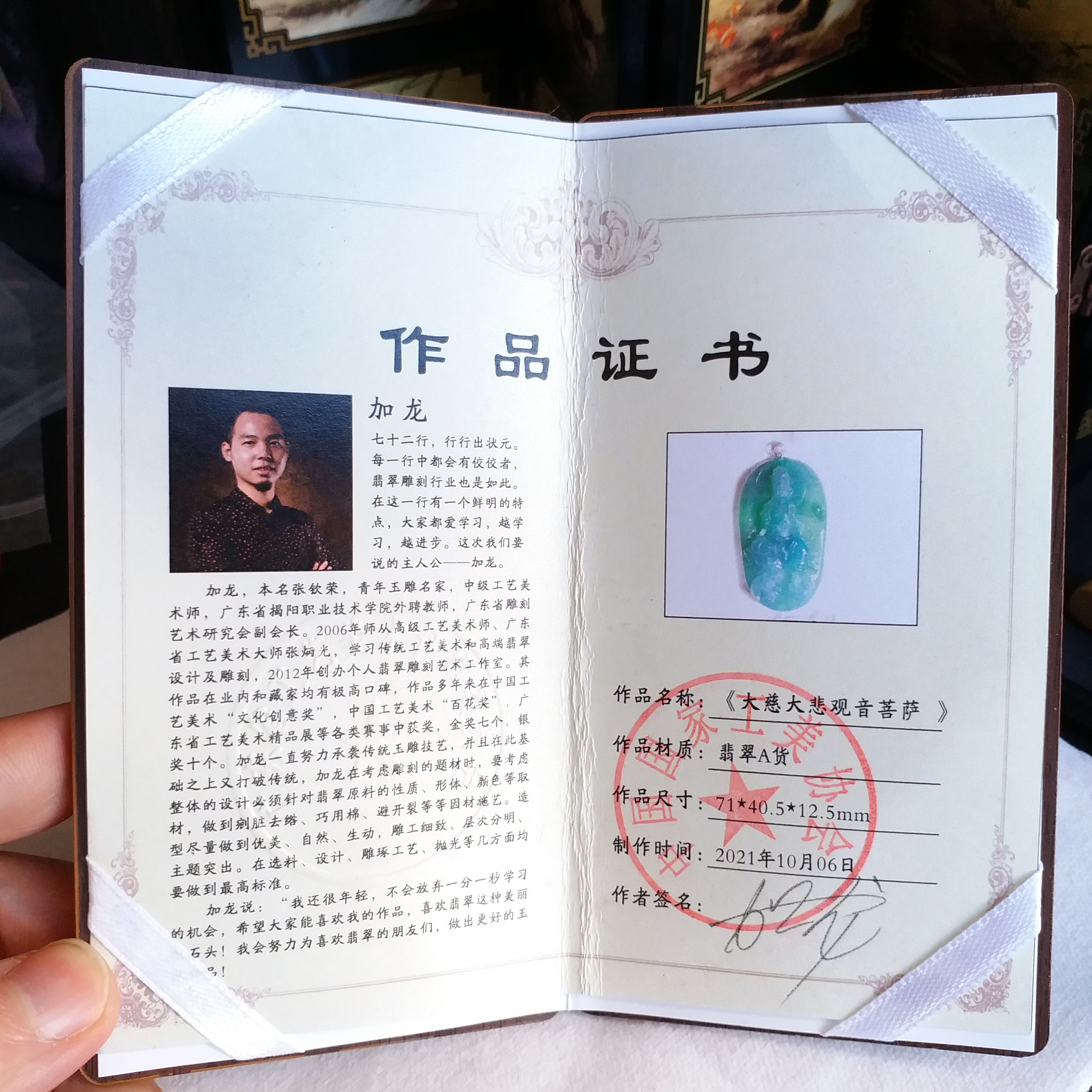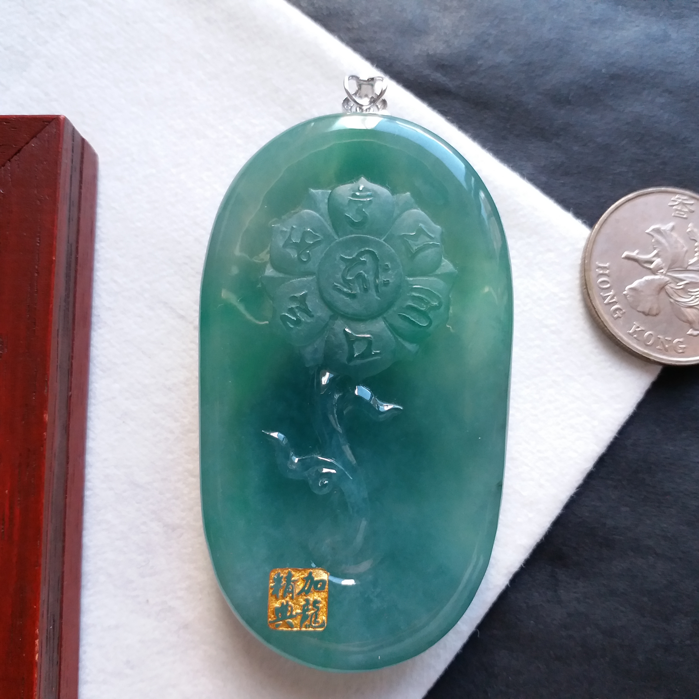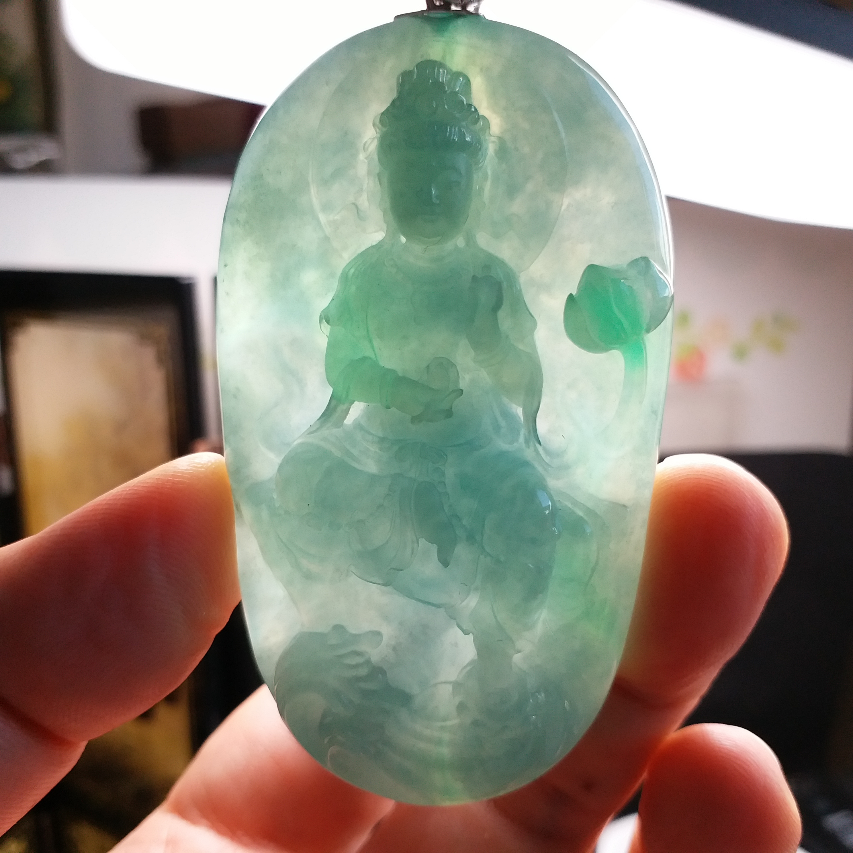 天然翡翠A玉,冰種滿綠,大師加龍老師之作品,100%手工精雕,觀音法相莊嚴,栩栩如生。完美無紋裂,配18K配鑽扣頭