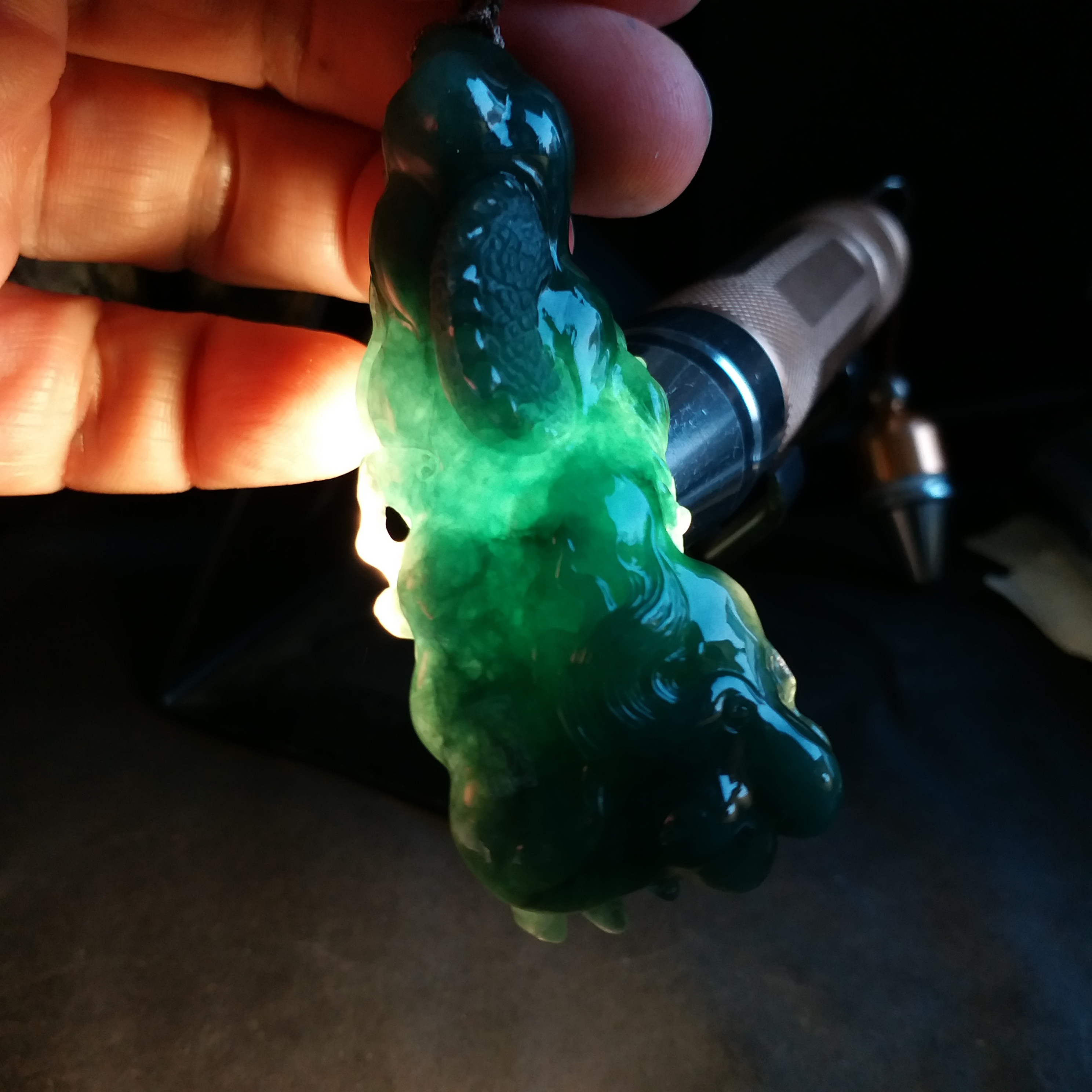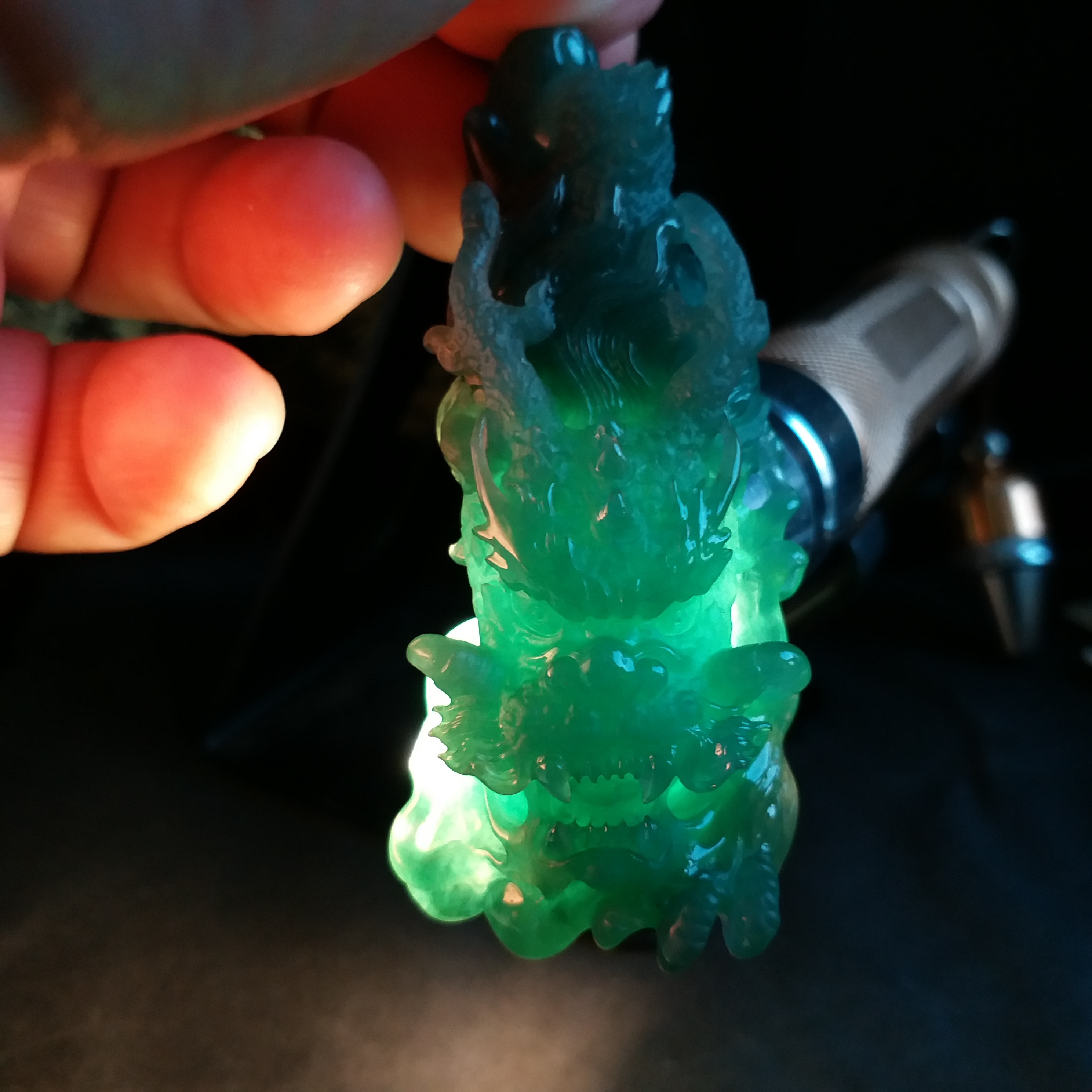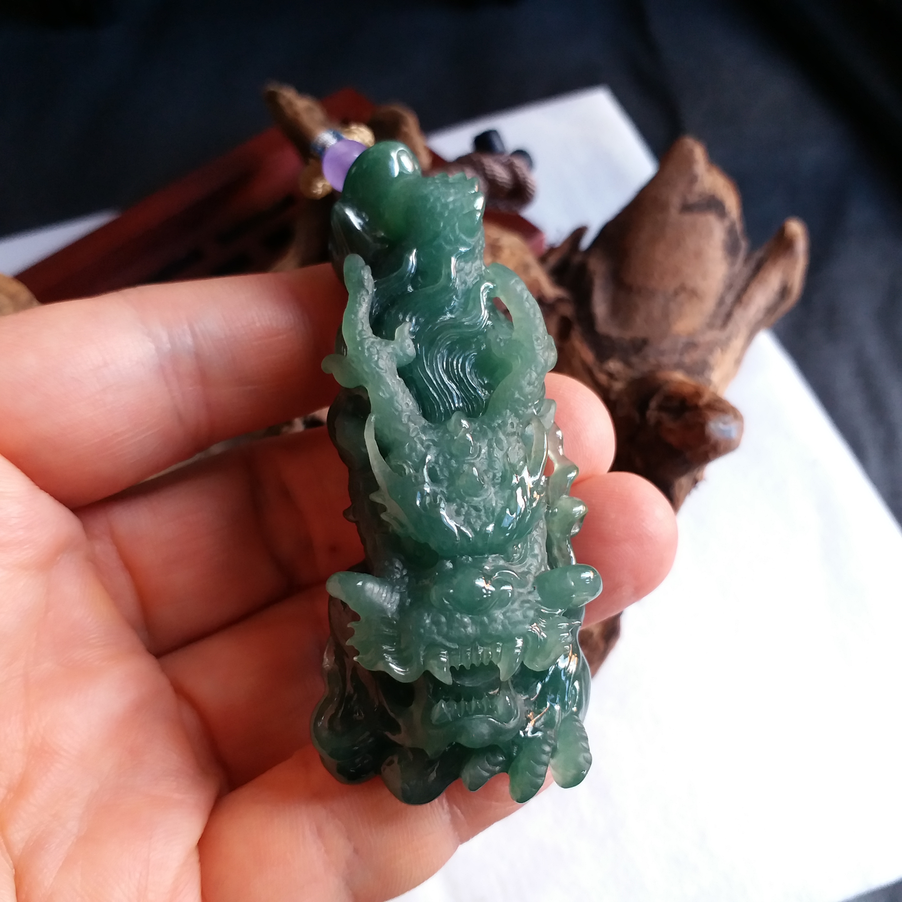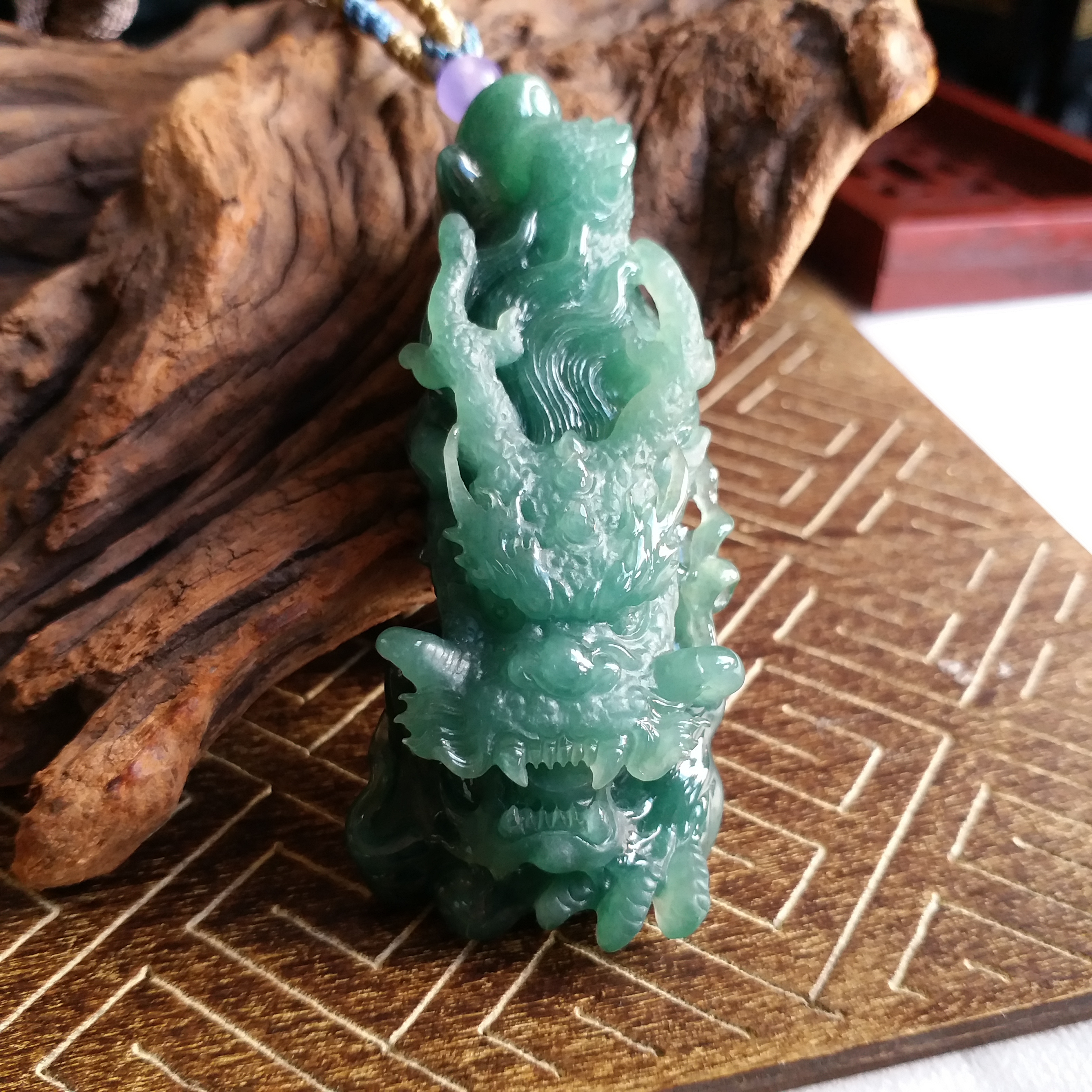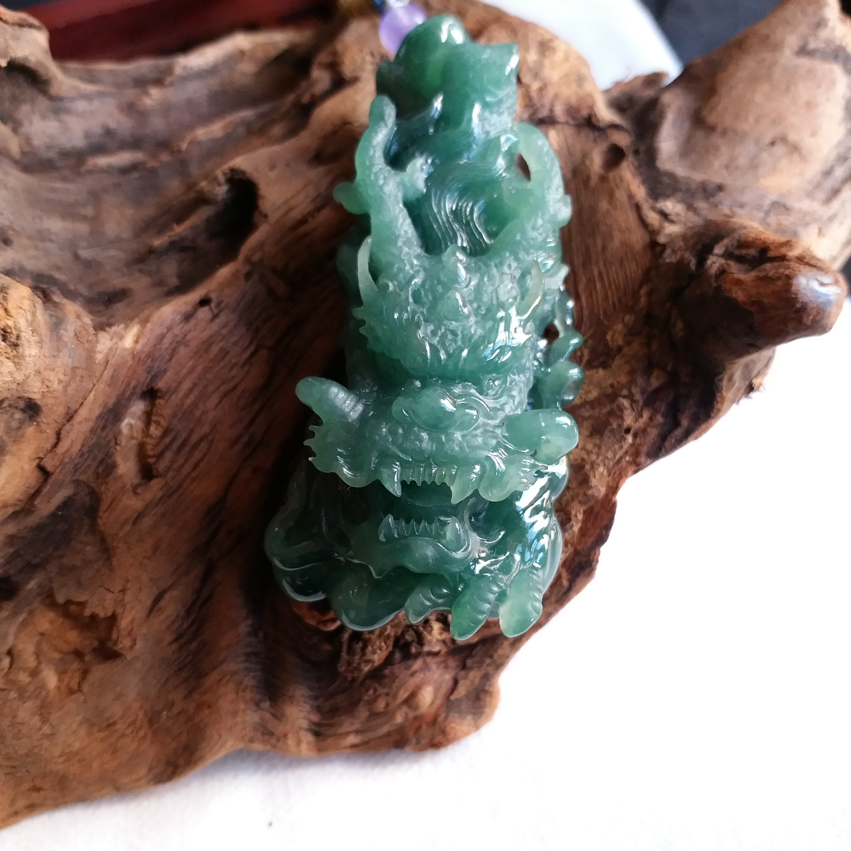 天然翡翠A玉,滿綠,底庄帶藍調,打燈透綠,完美。大師作品,全手工精雕,雕工精湛,龍相兇猛,能招財擋煞、趨吉避兇。