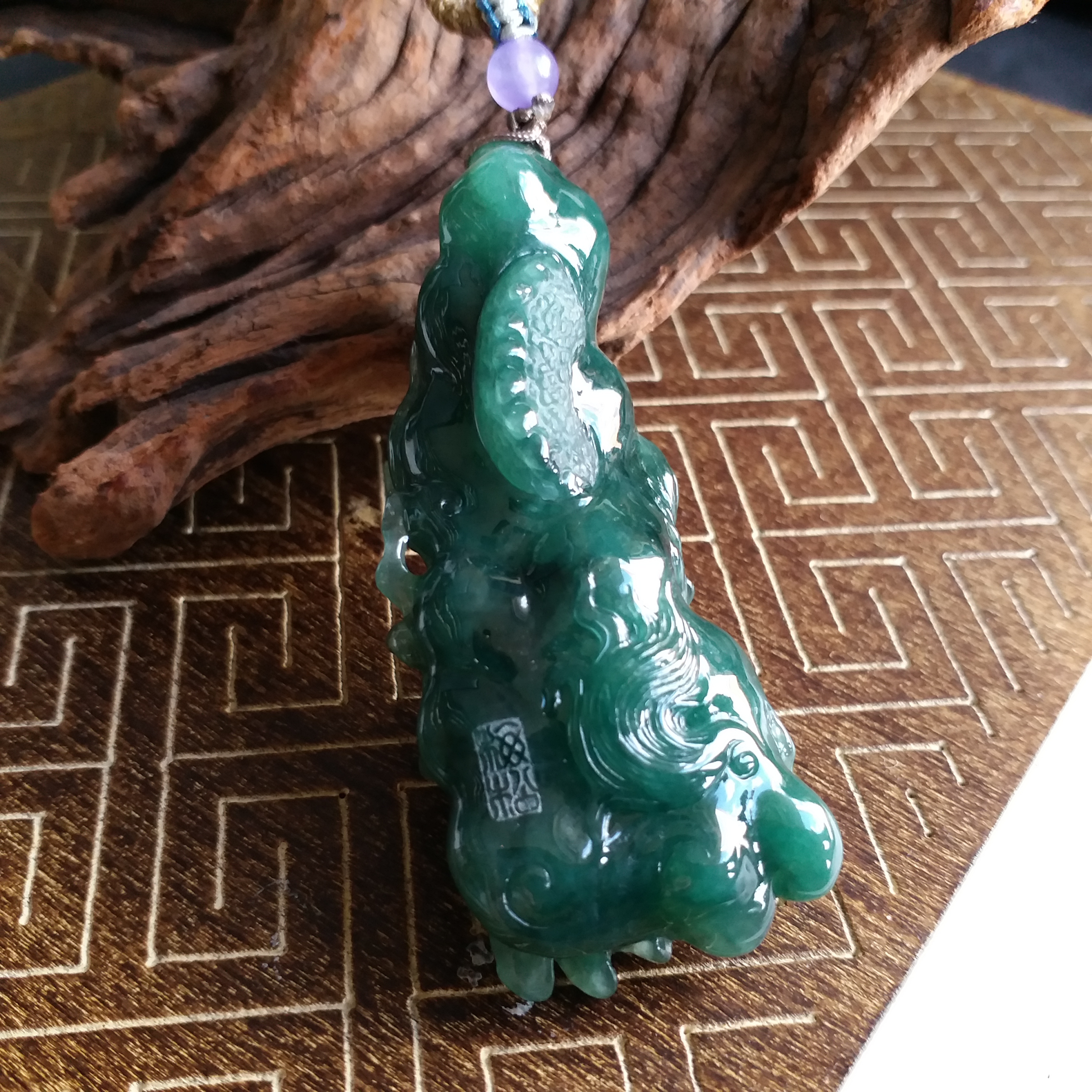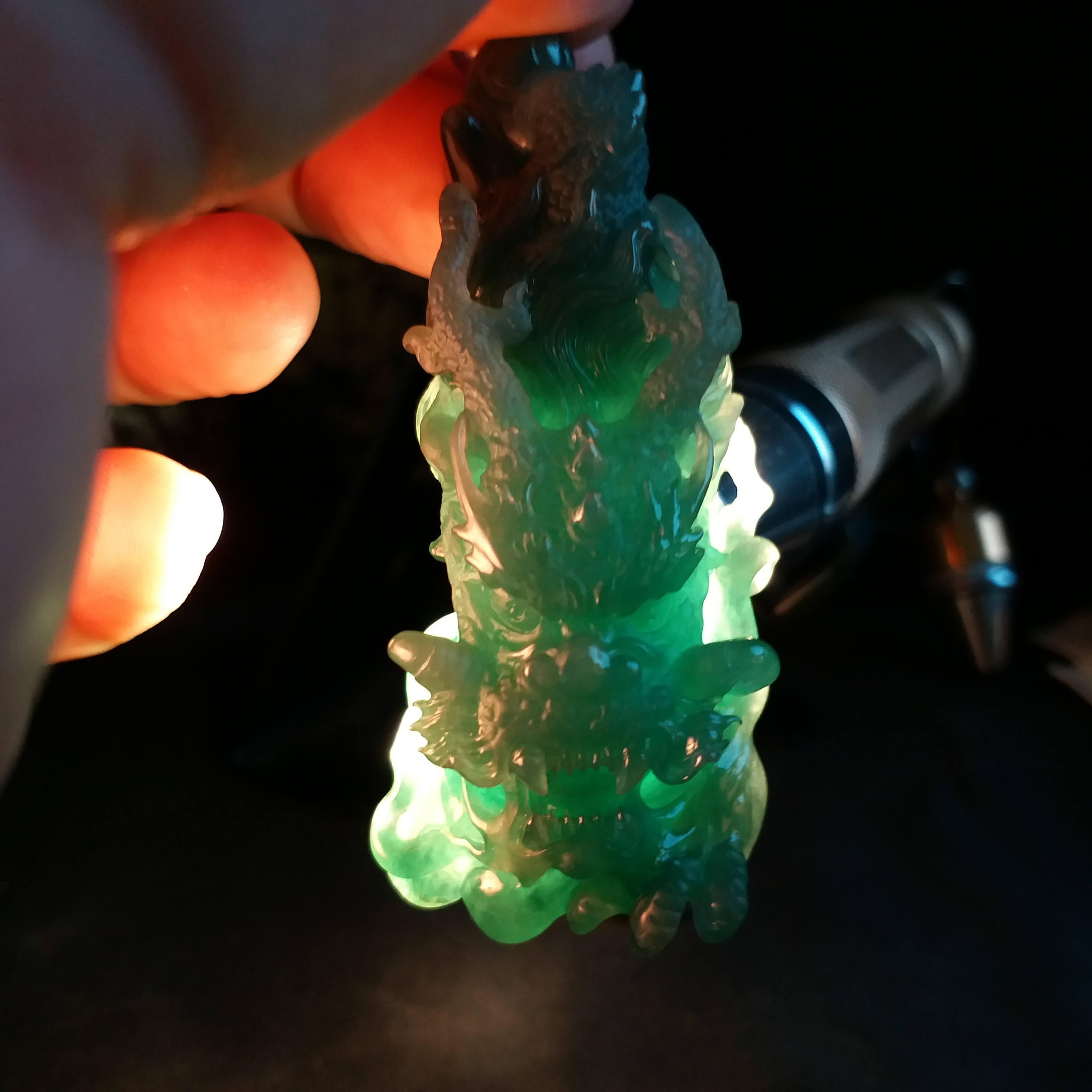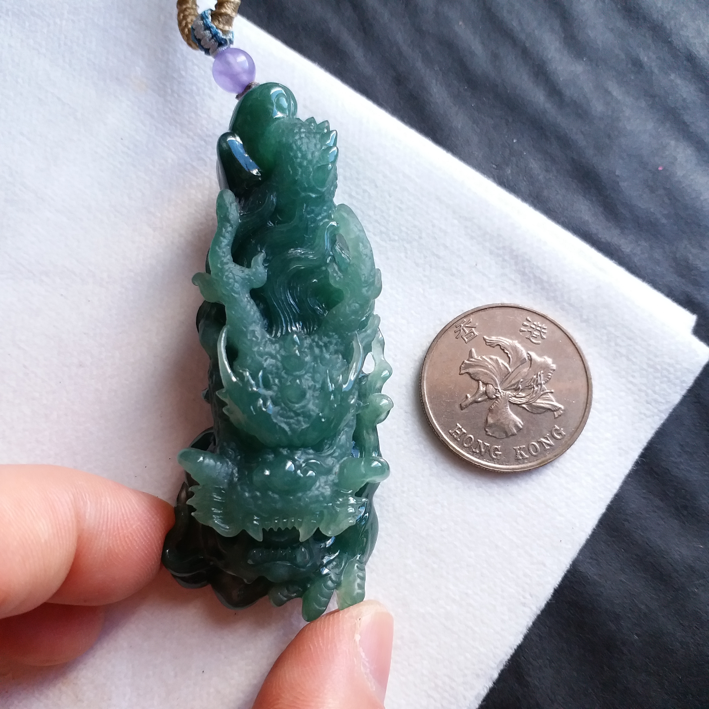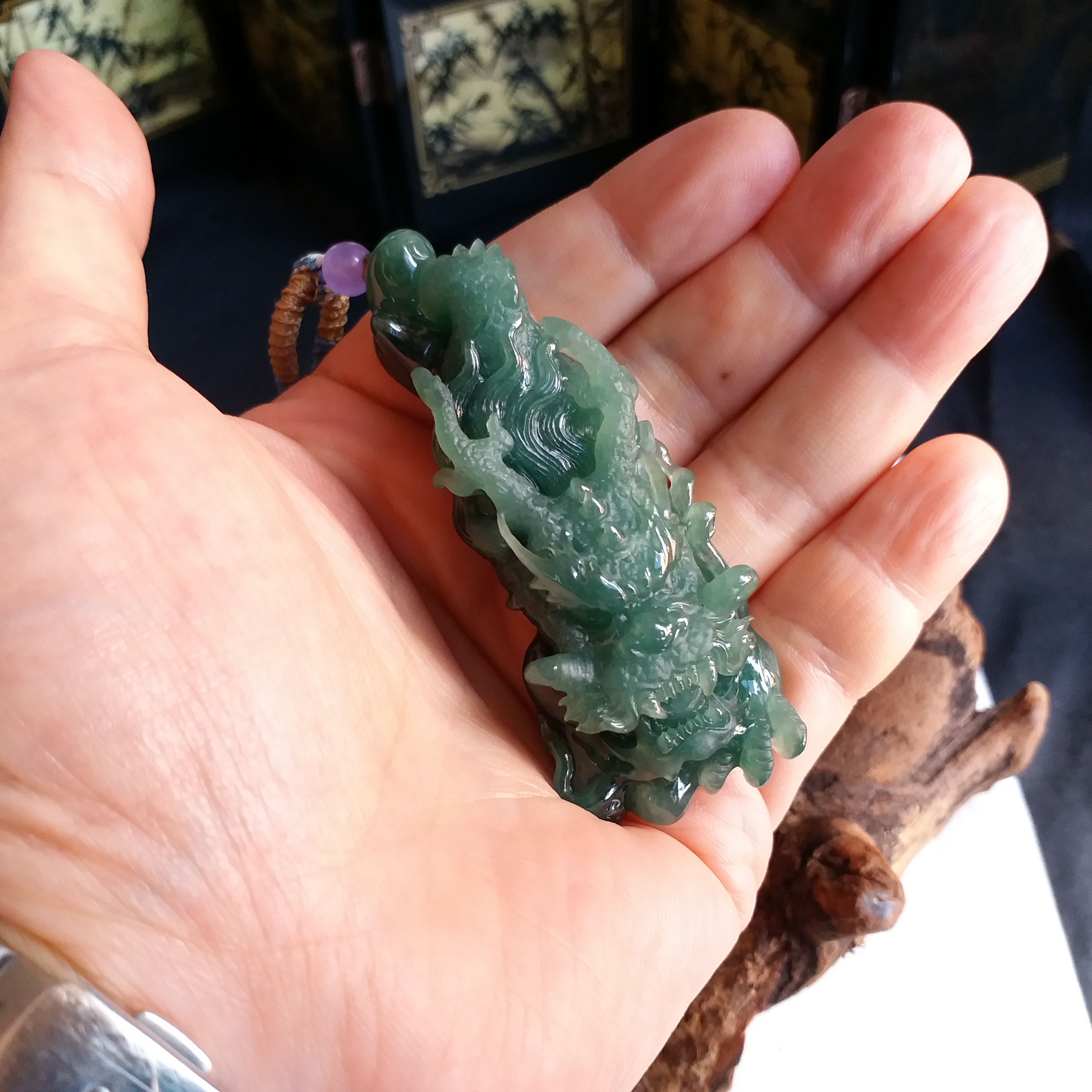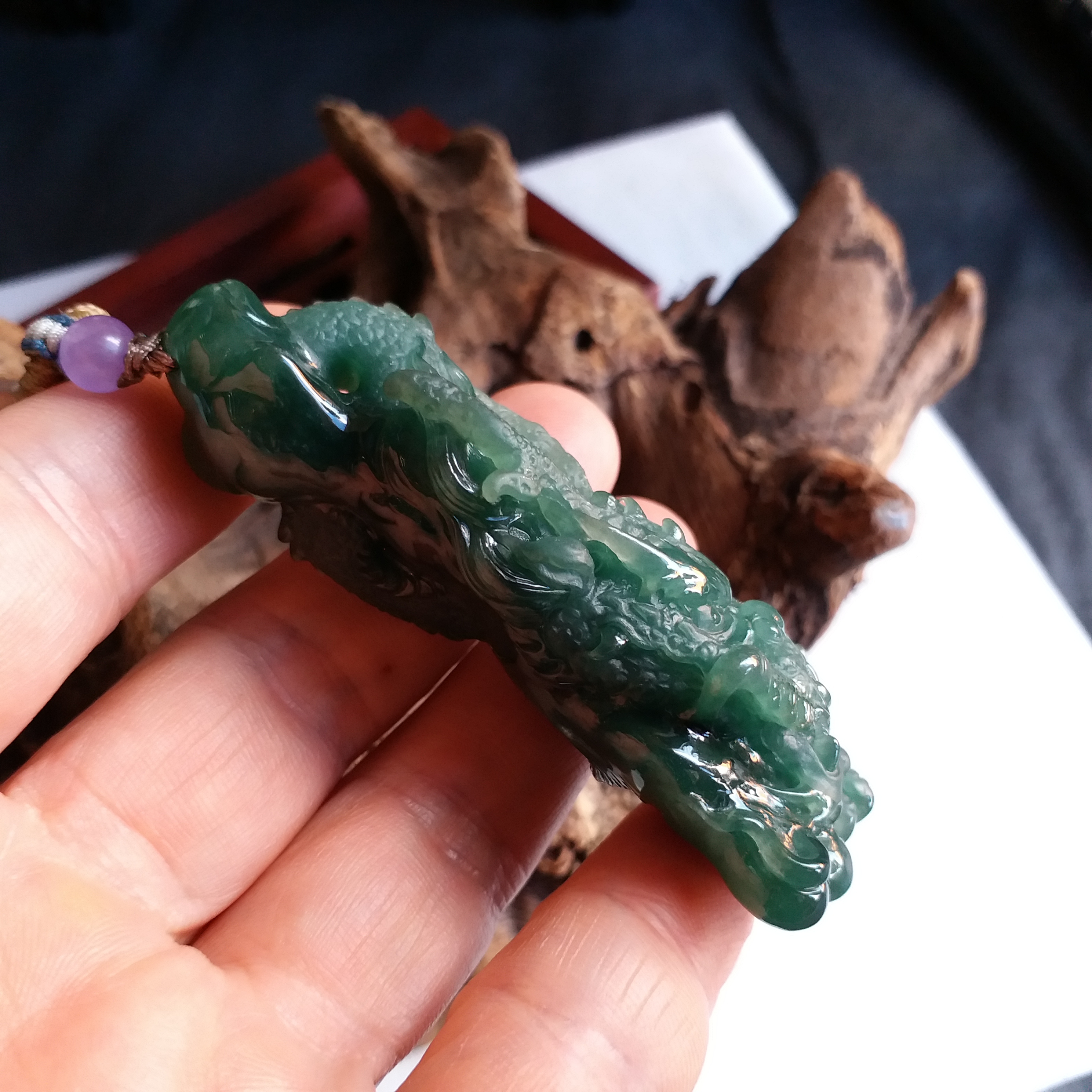 天然翡翠A玉,滿綠,底庄帶藍調,打燈透綠,完美。大師作品,全手工精雕,雕工精湛,龍相兇猛,能招財擋煞、趨吉避兇。