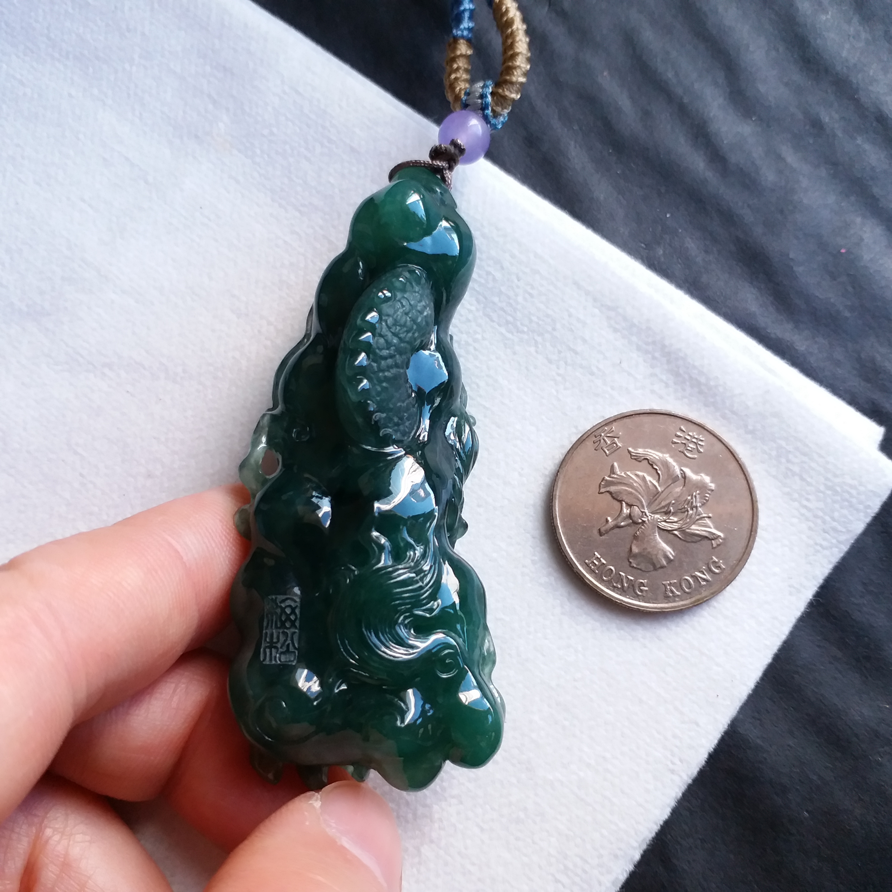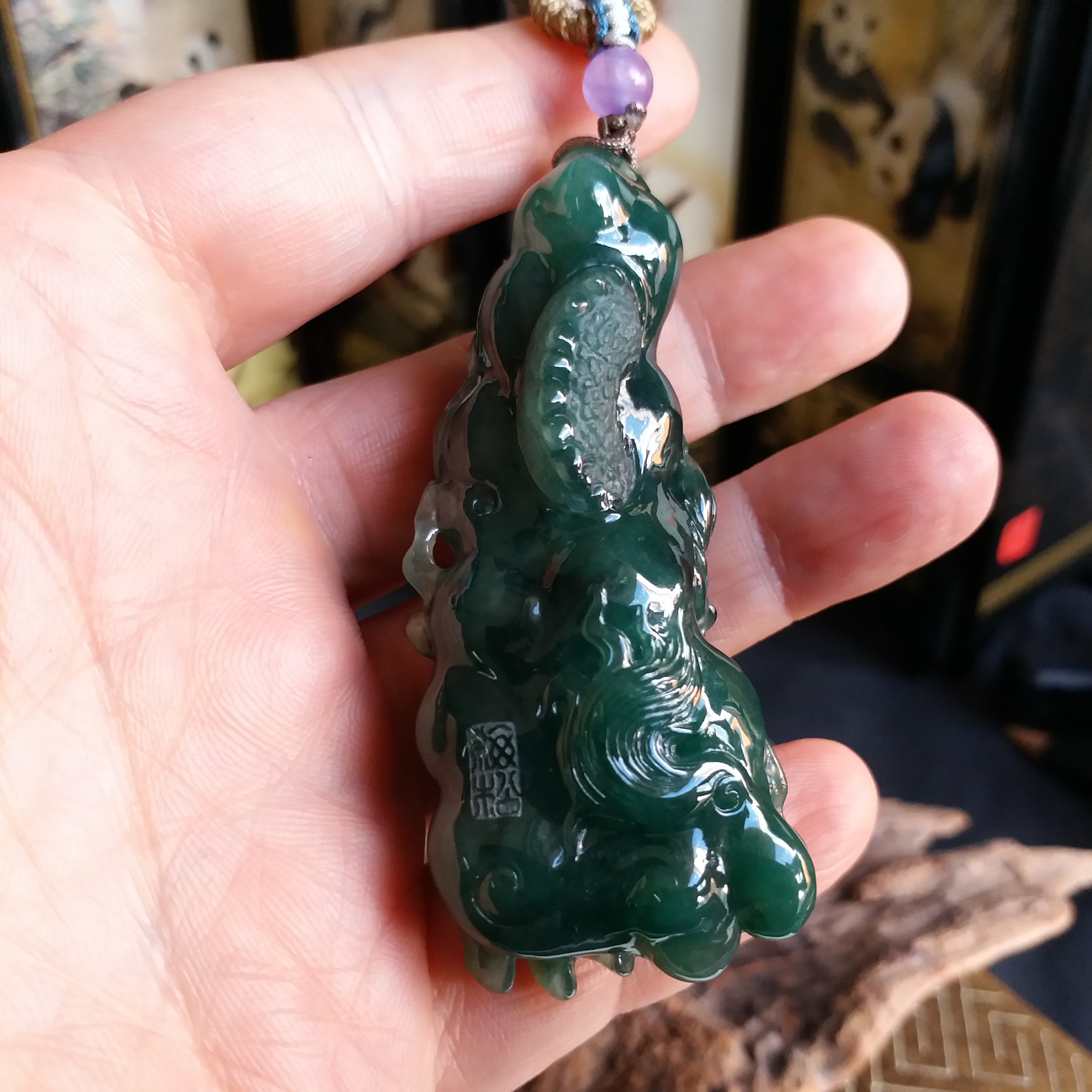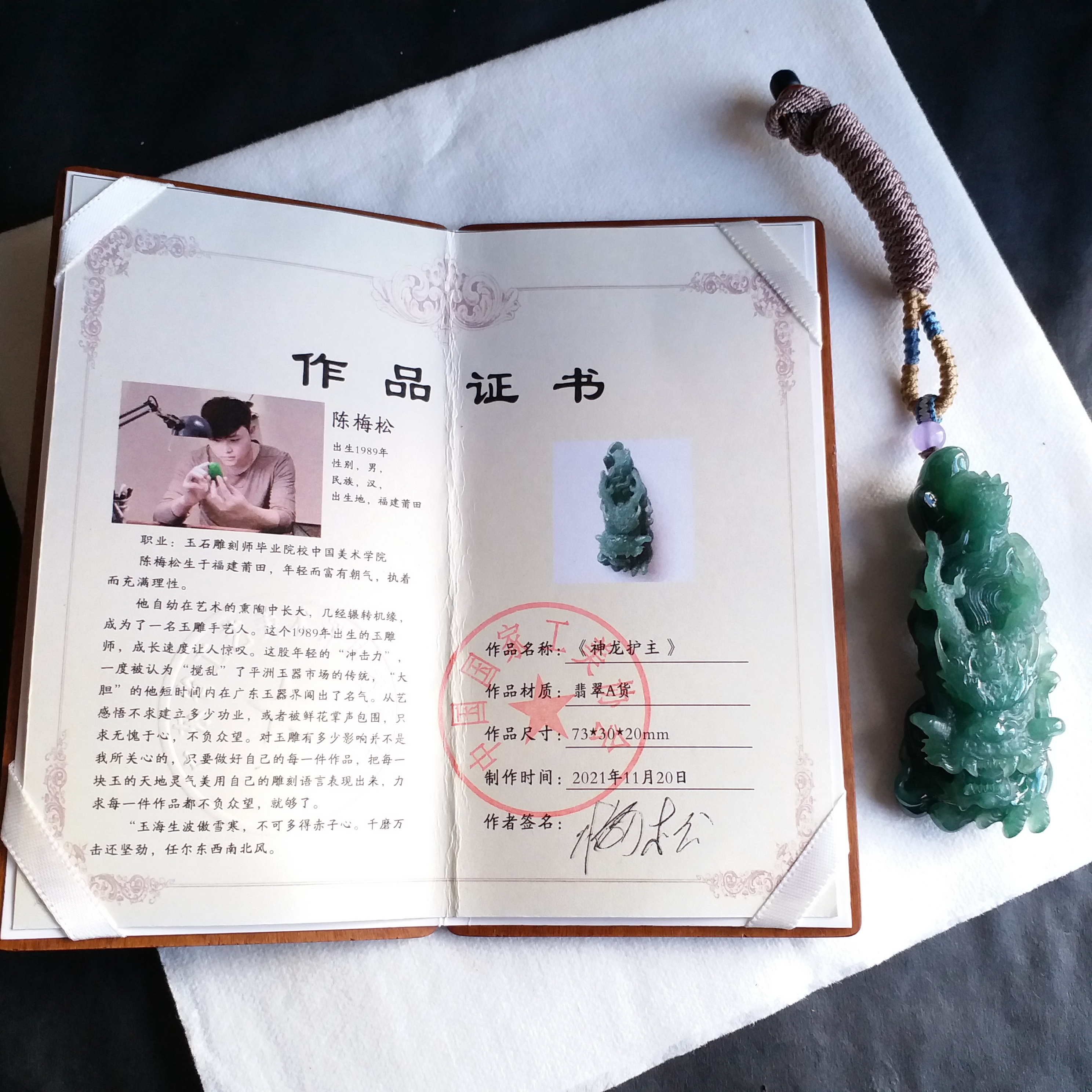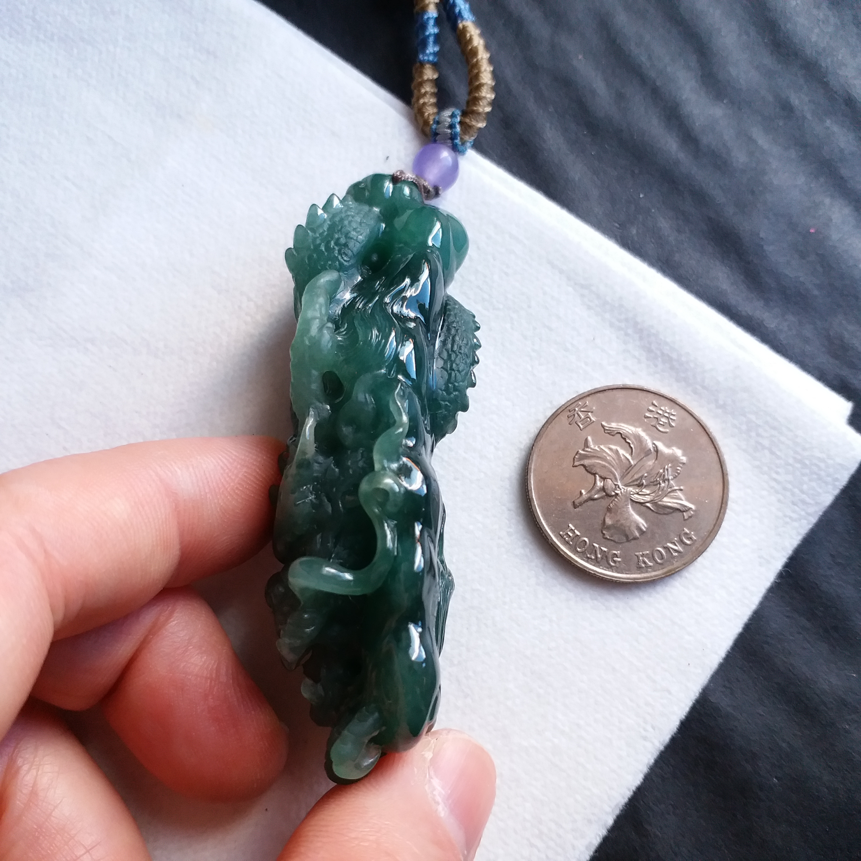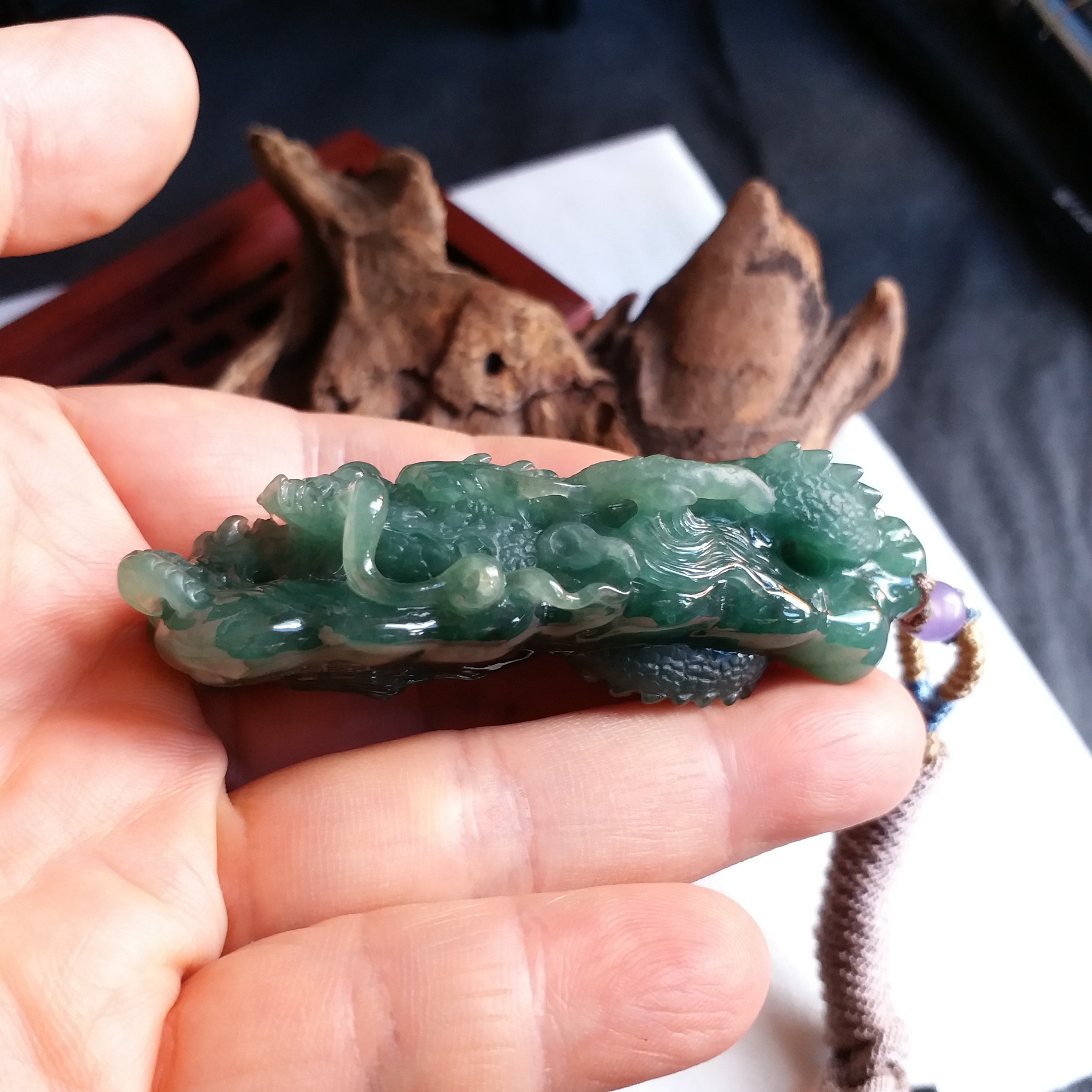 天然翡翠A玉,滿綠,底庄帶藍調,打燈透綠,完美。大師作品,全手工精雕,雕工精湛,龍相兇猛,能招財擋煞、趨吉避兇。