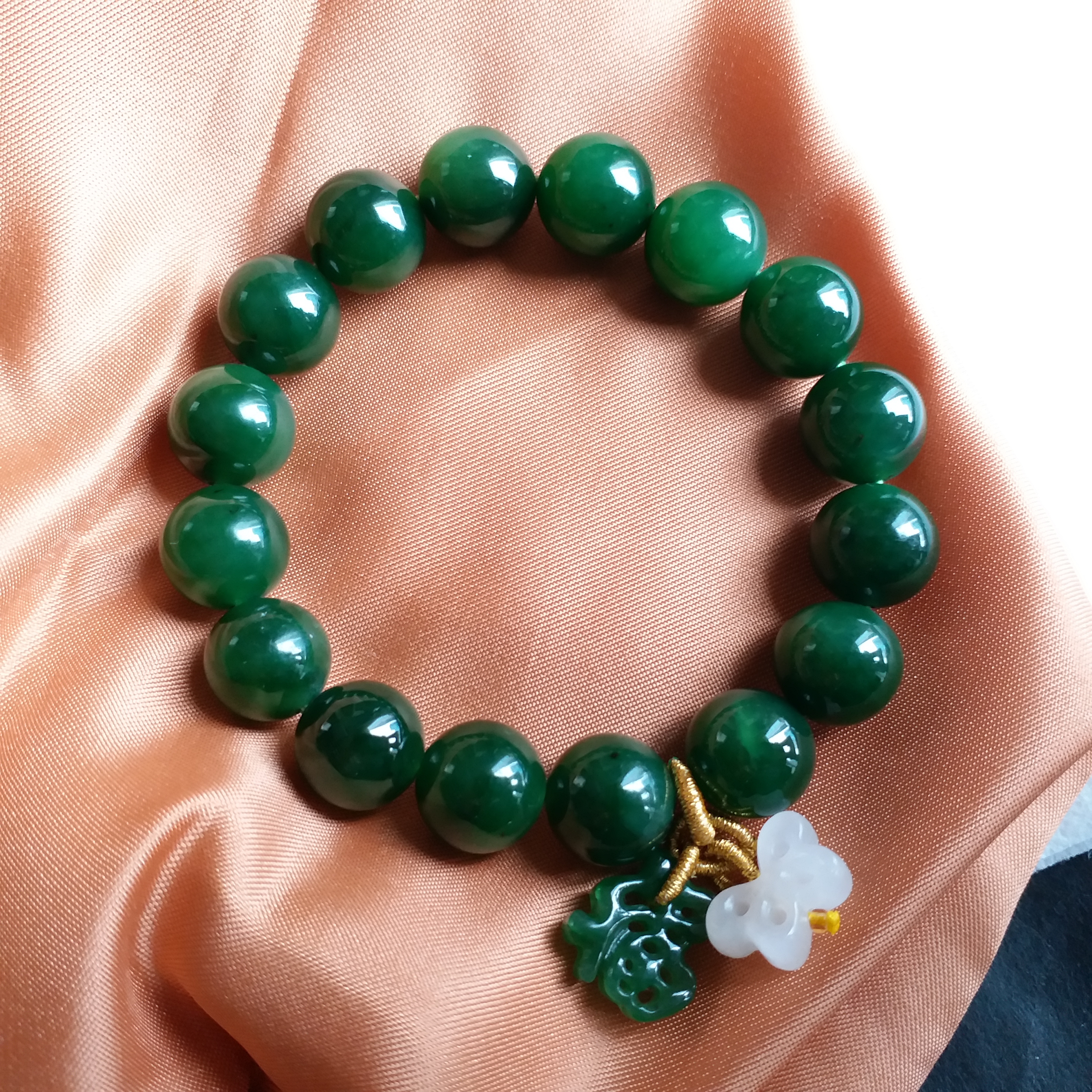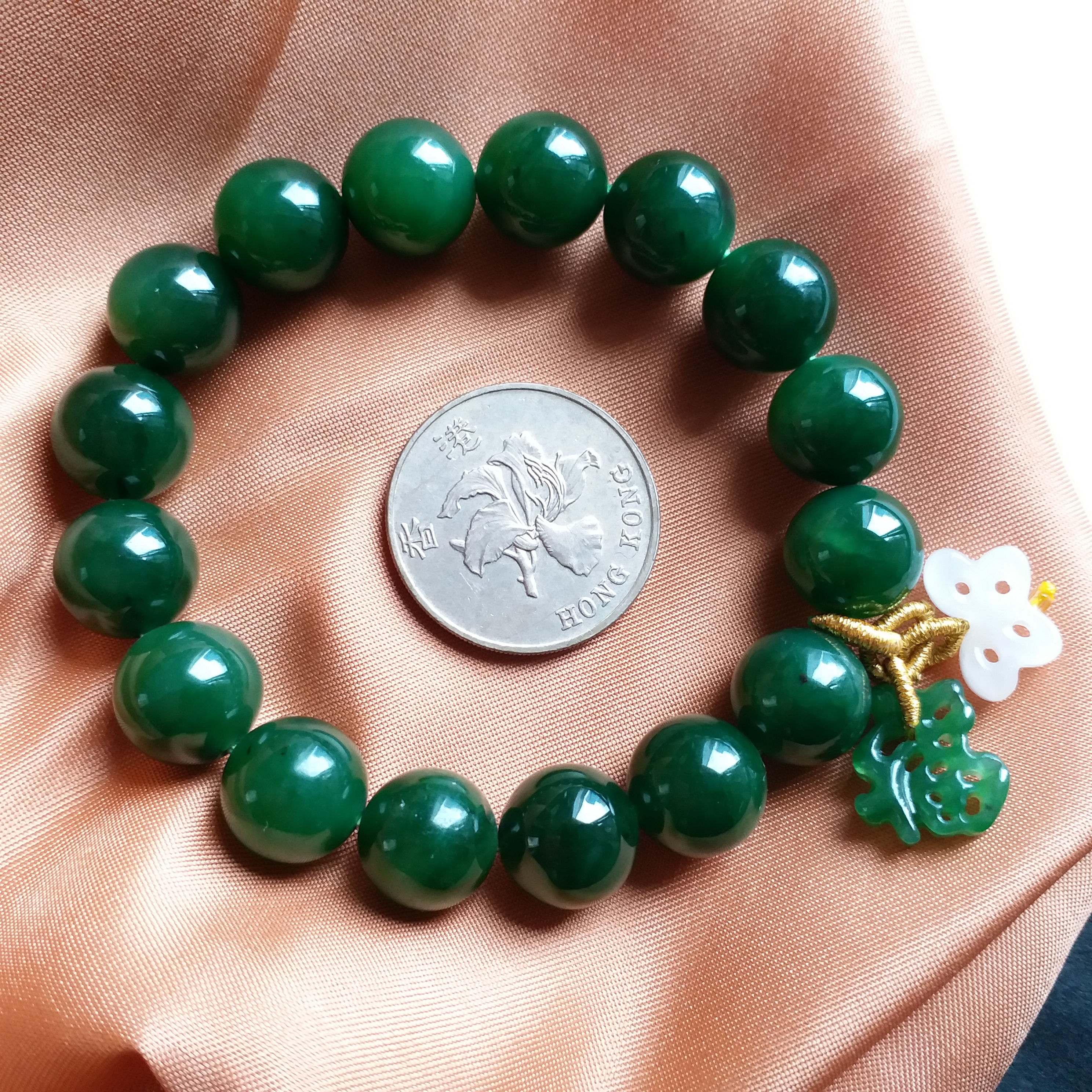 天然和田玉碧玉,滿色濃郁菠菜綠,色澤油亮,帶些少小黑點,是天然碧玉的特徵,非瑕疵,無礙。