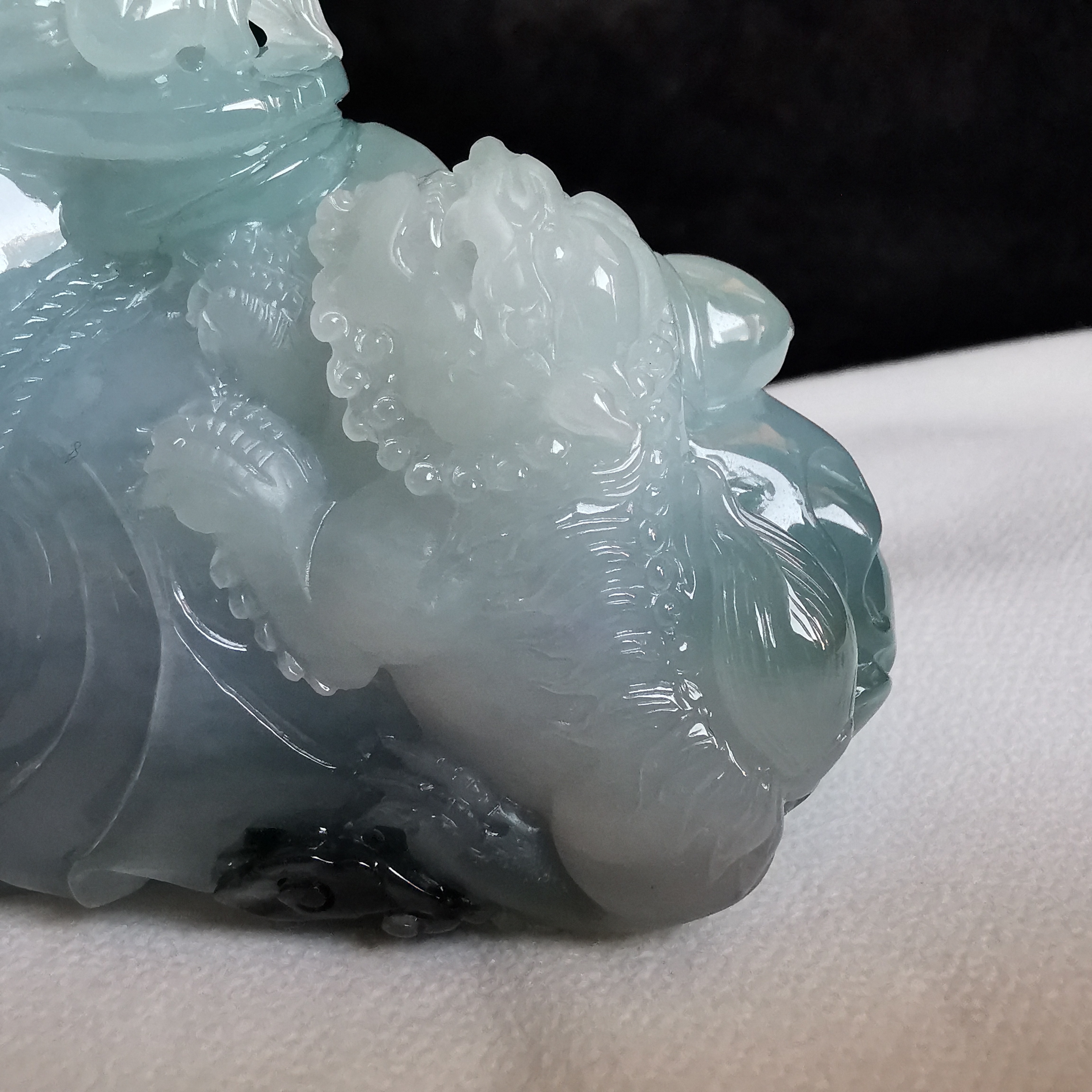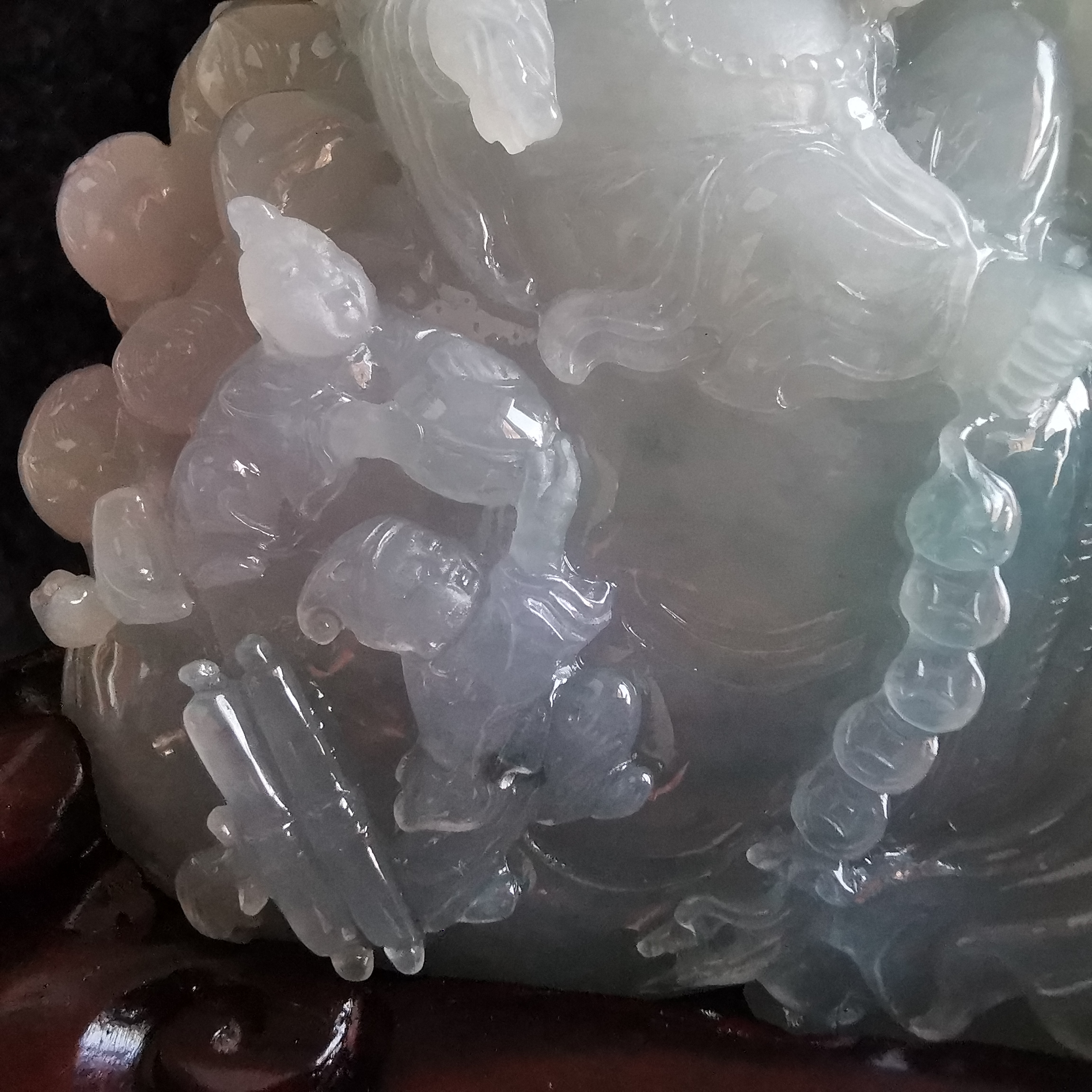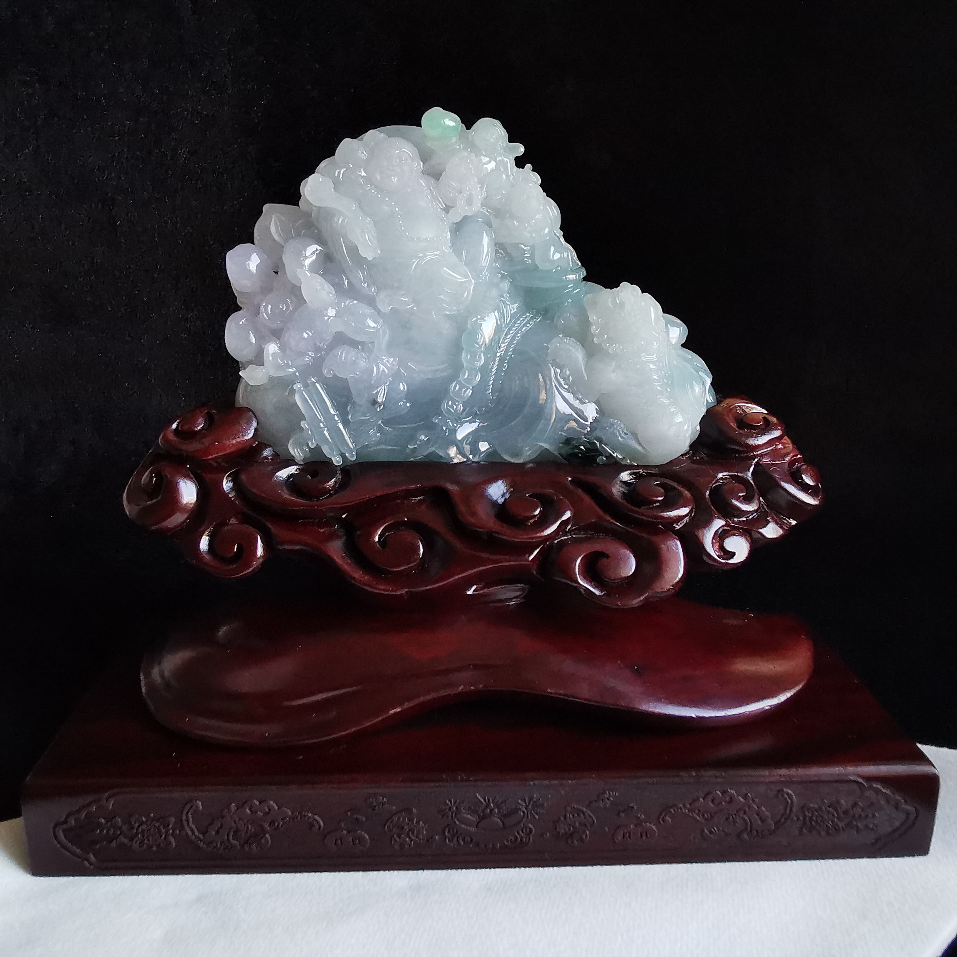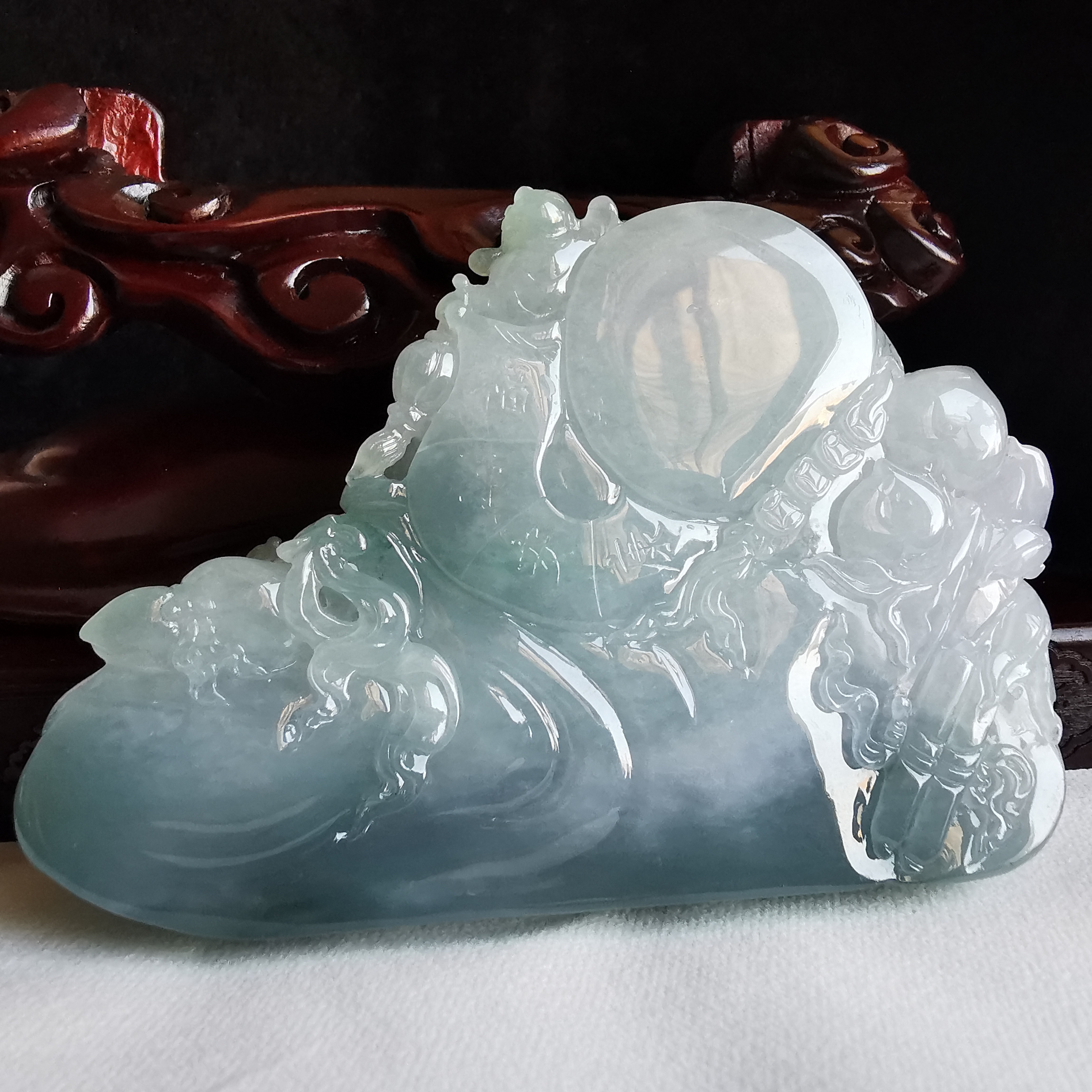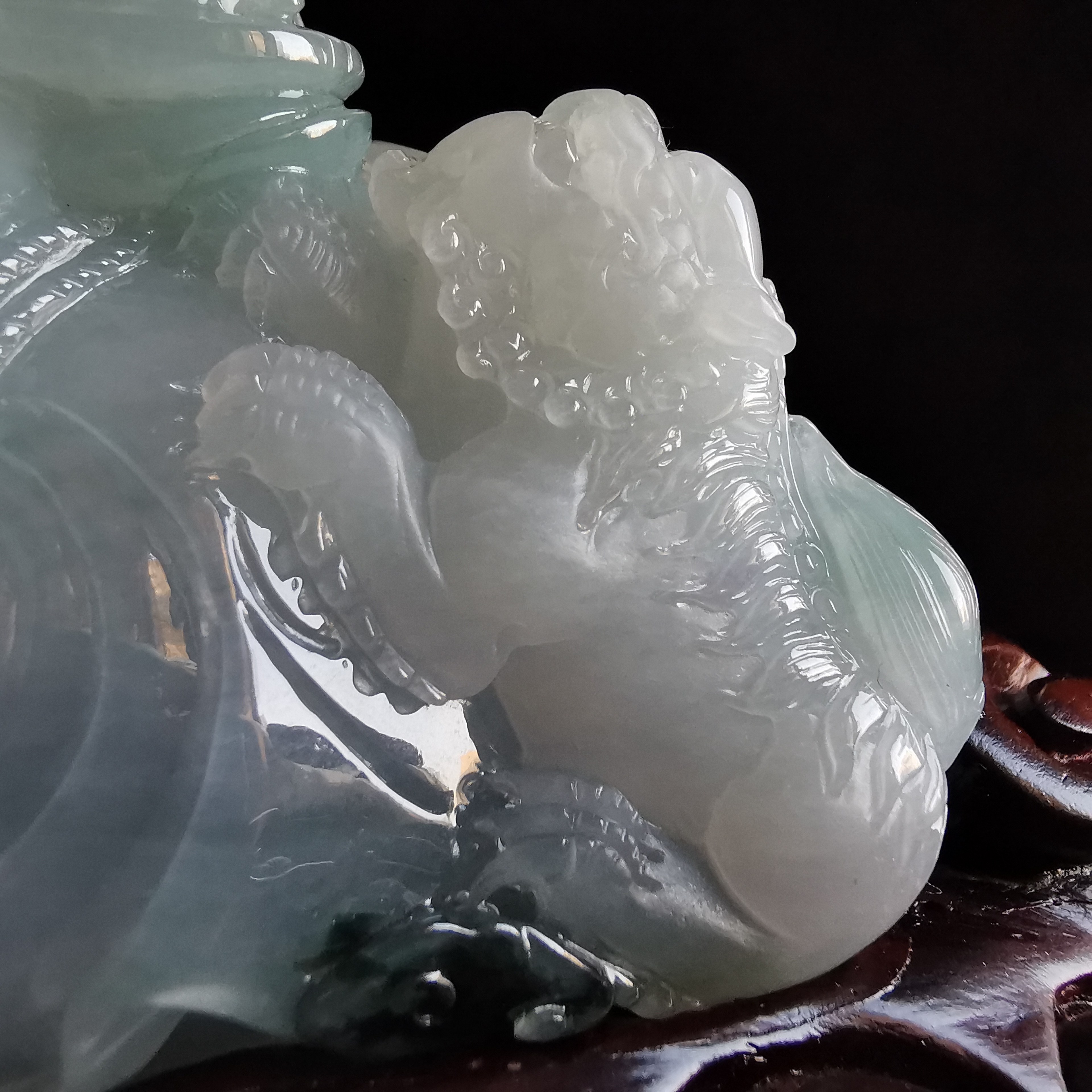 天然翡翠A玉,大師級全手工雕刻,巧雕,栩栩如生,連檀木木座。