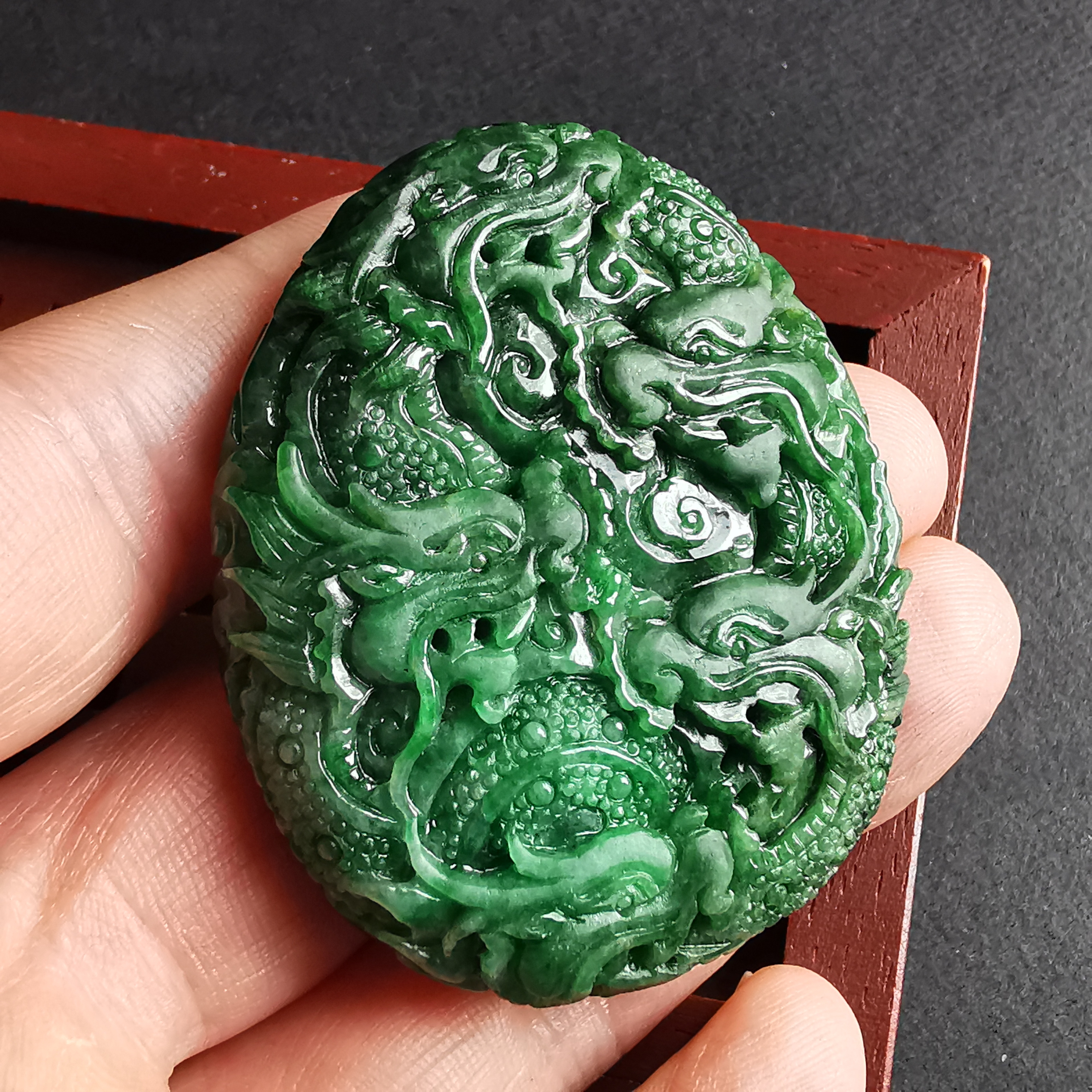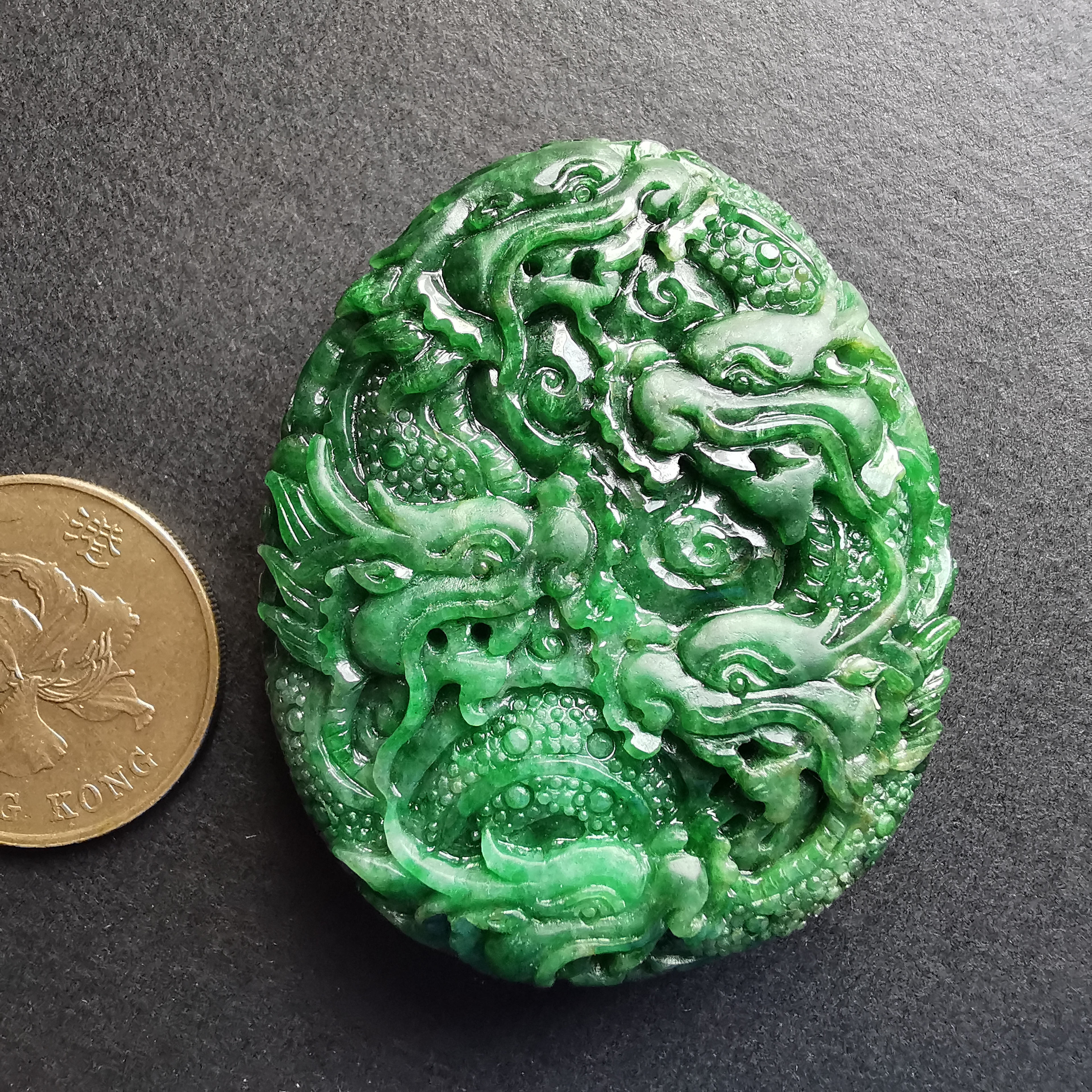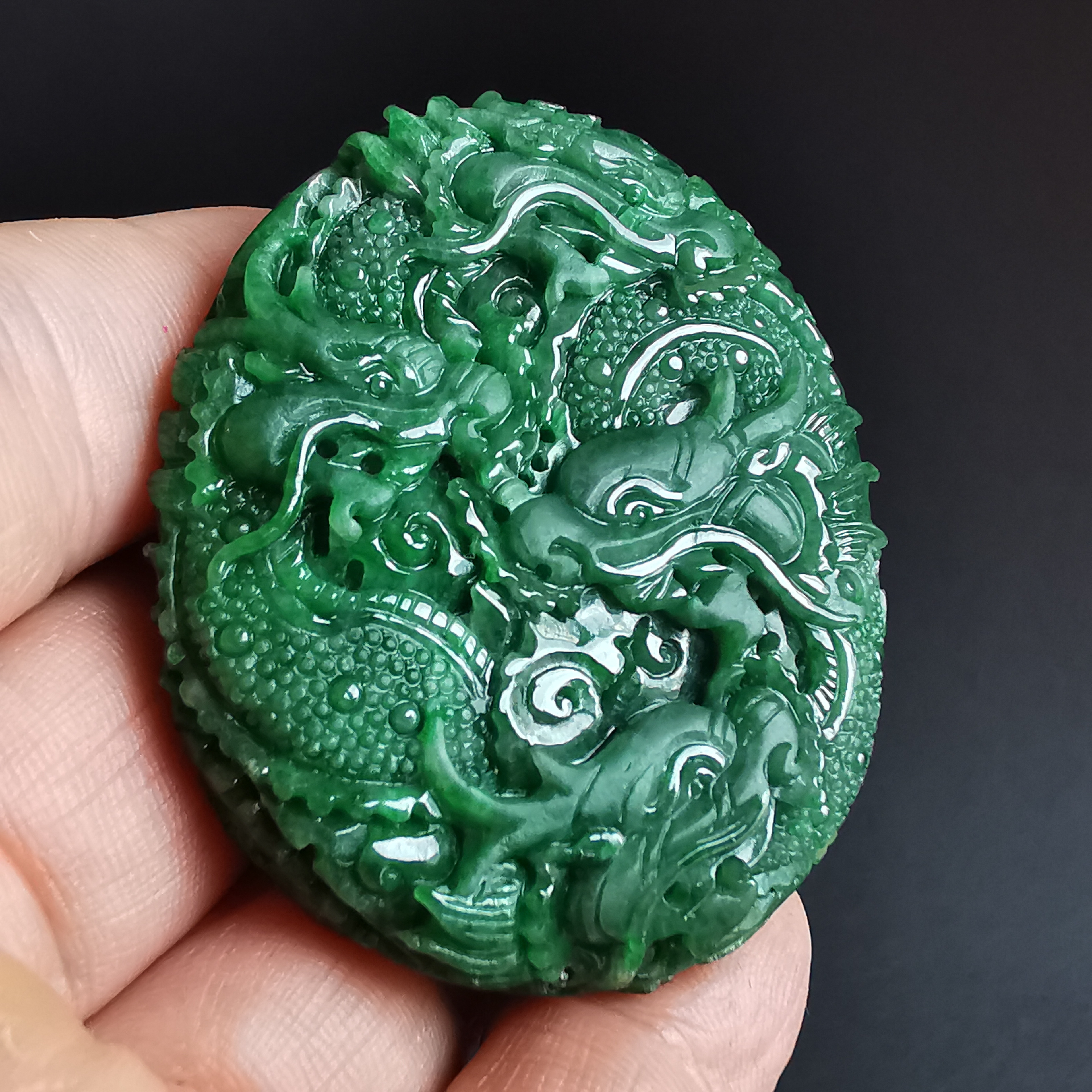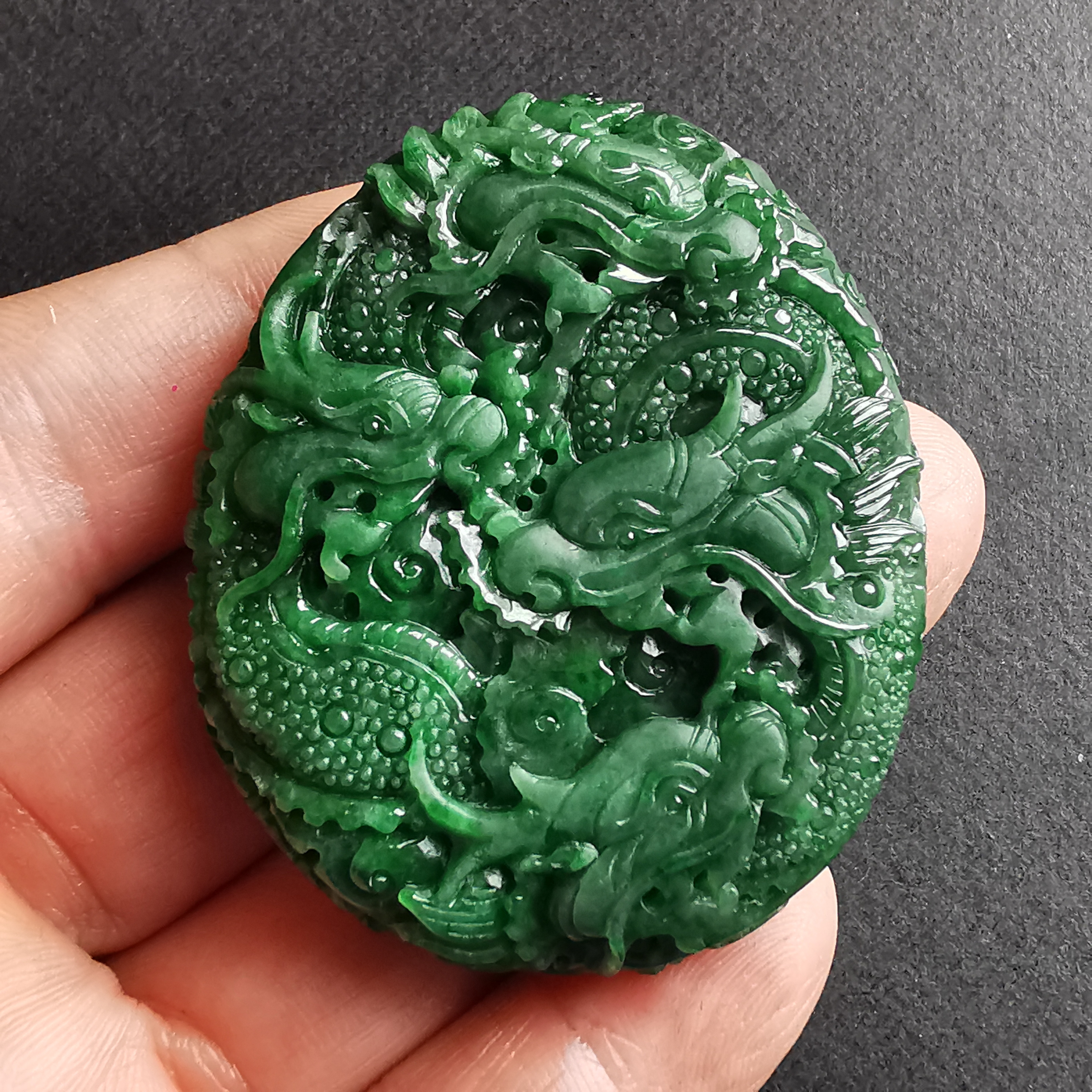 天然翡翠A玉,滿綠老料,大師級雕工,雙面雕