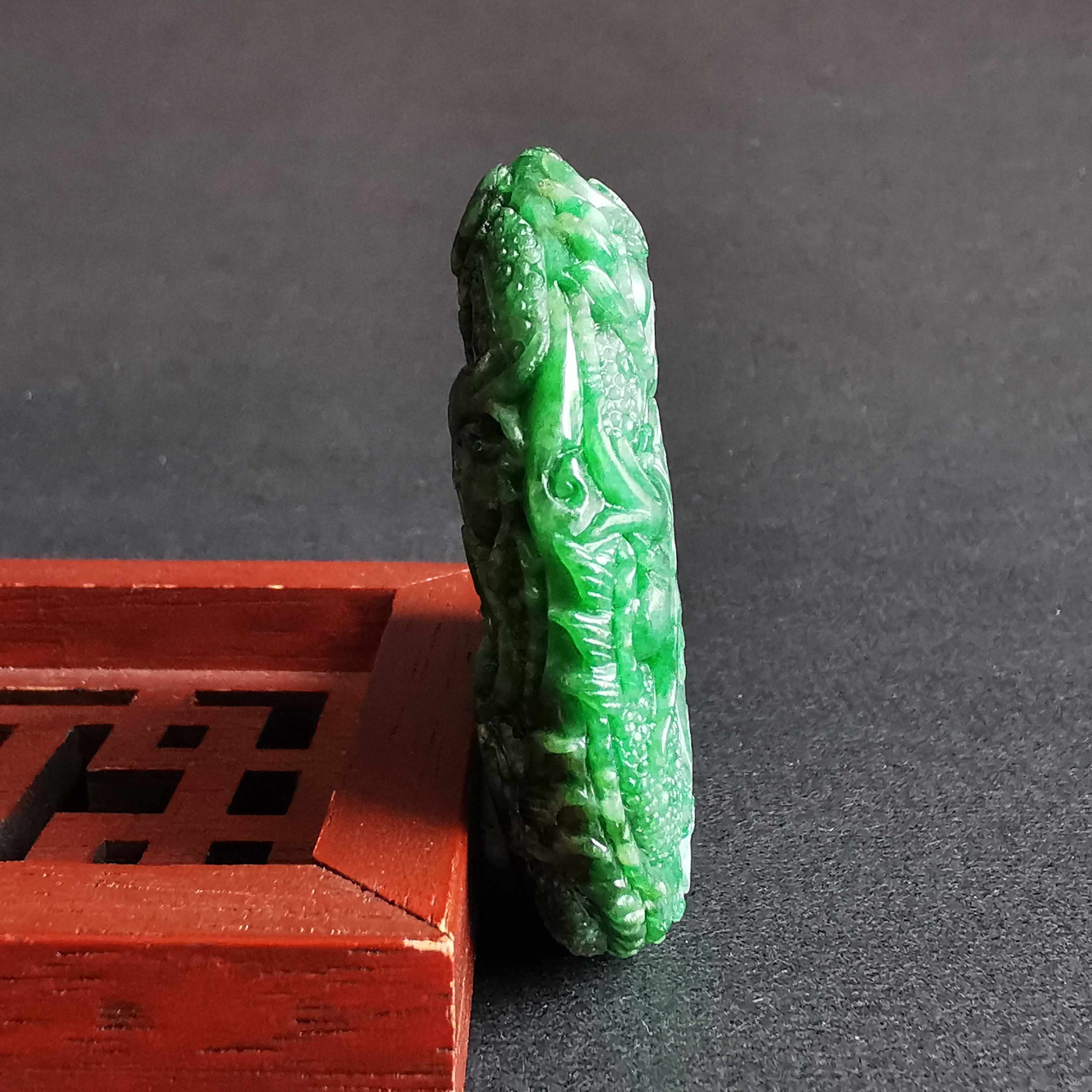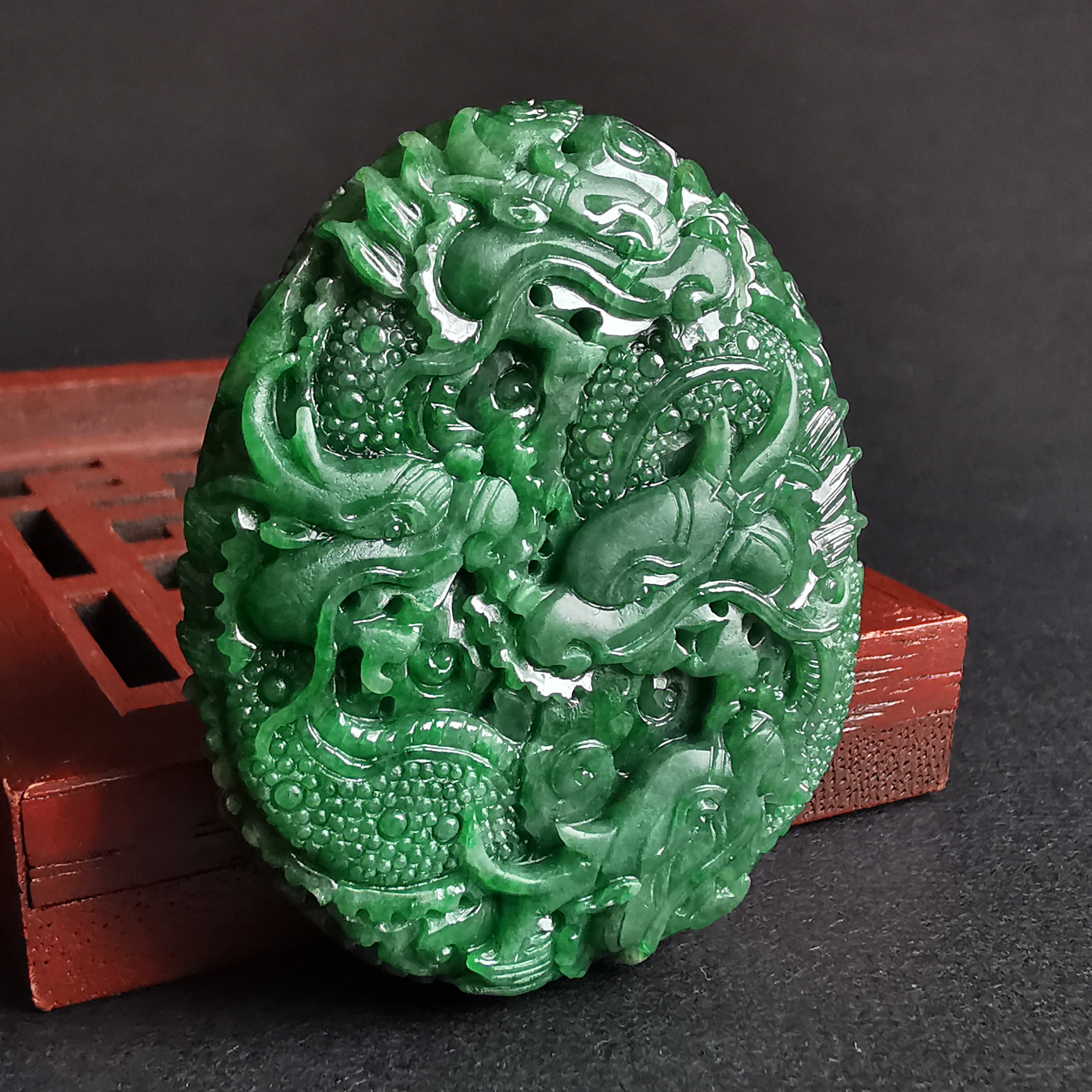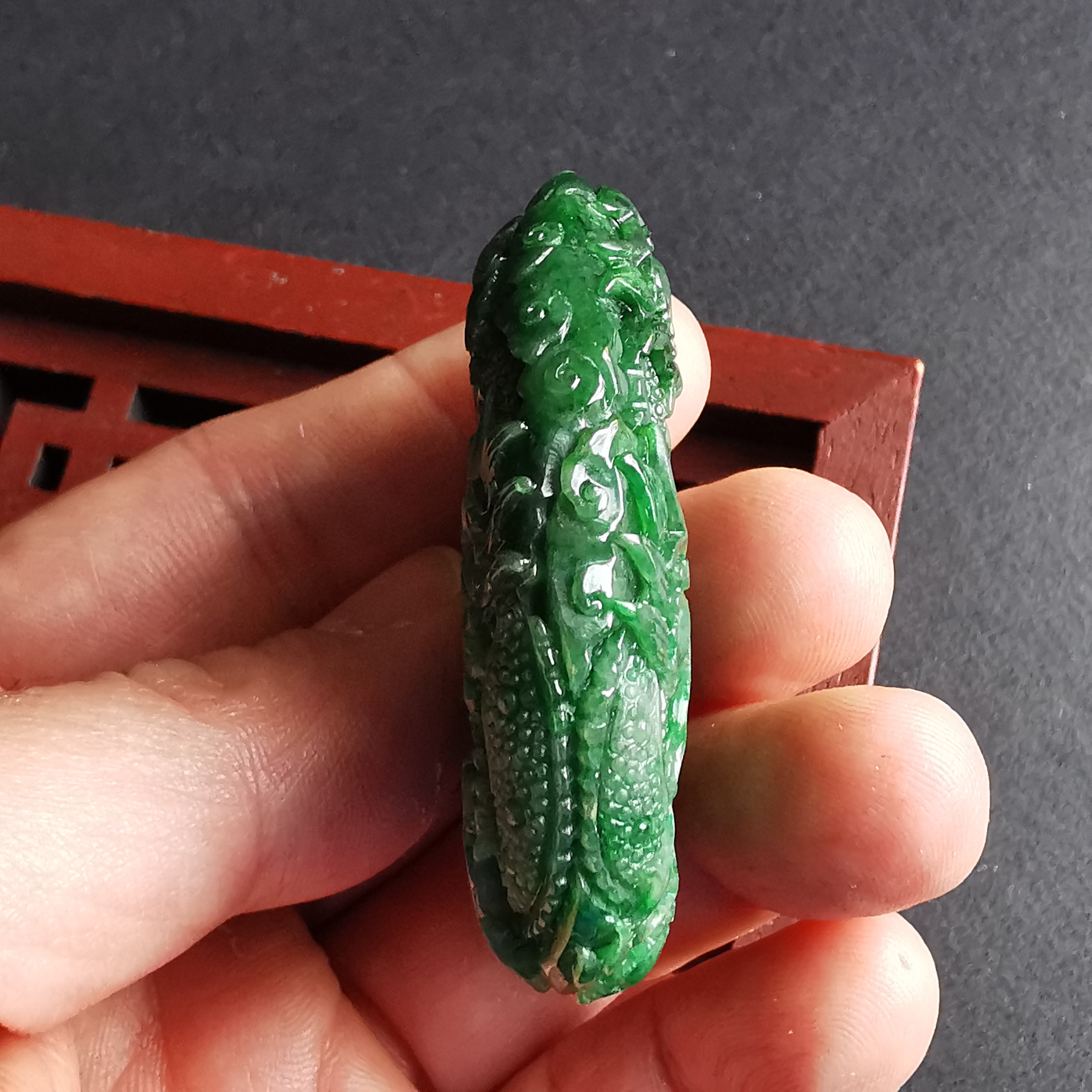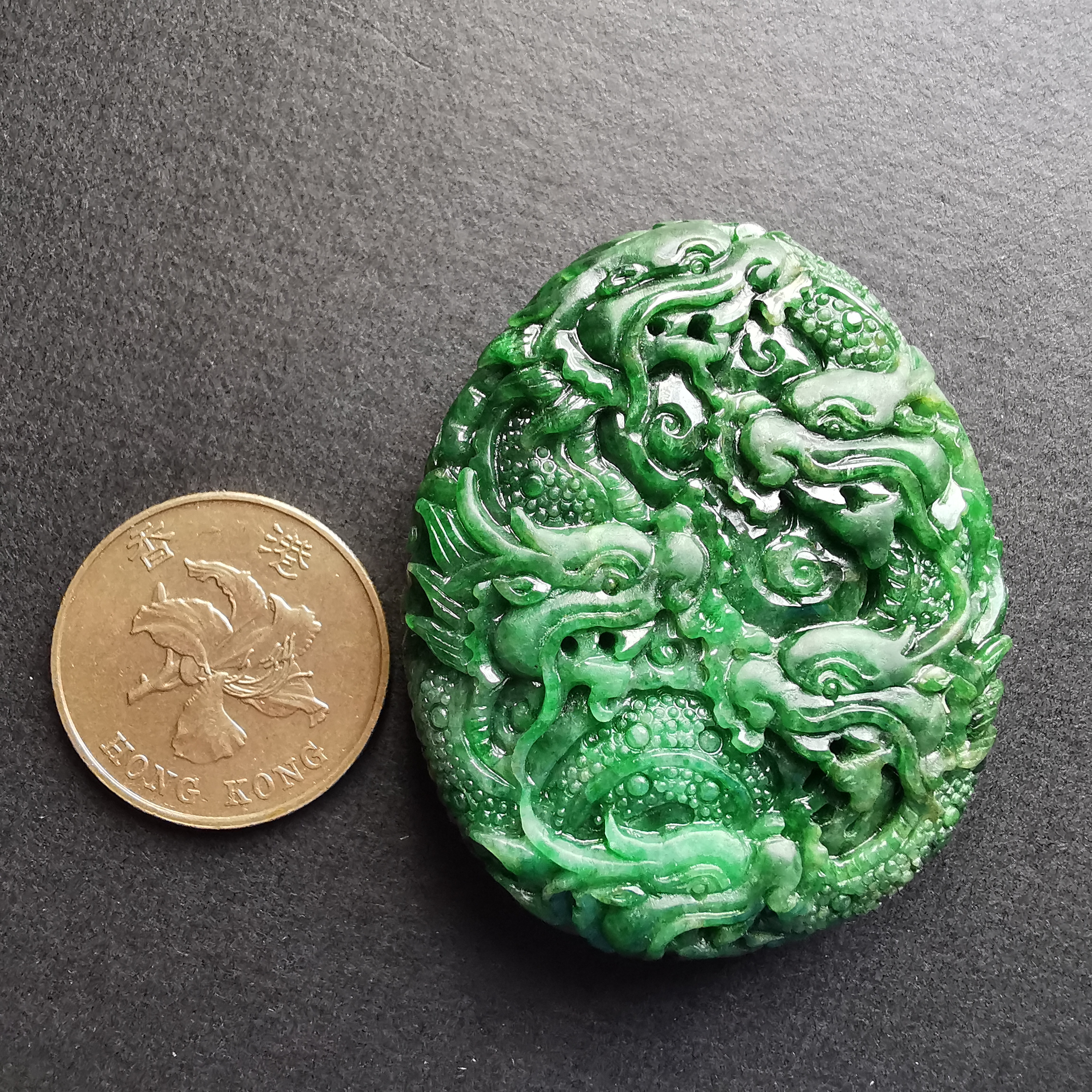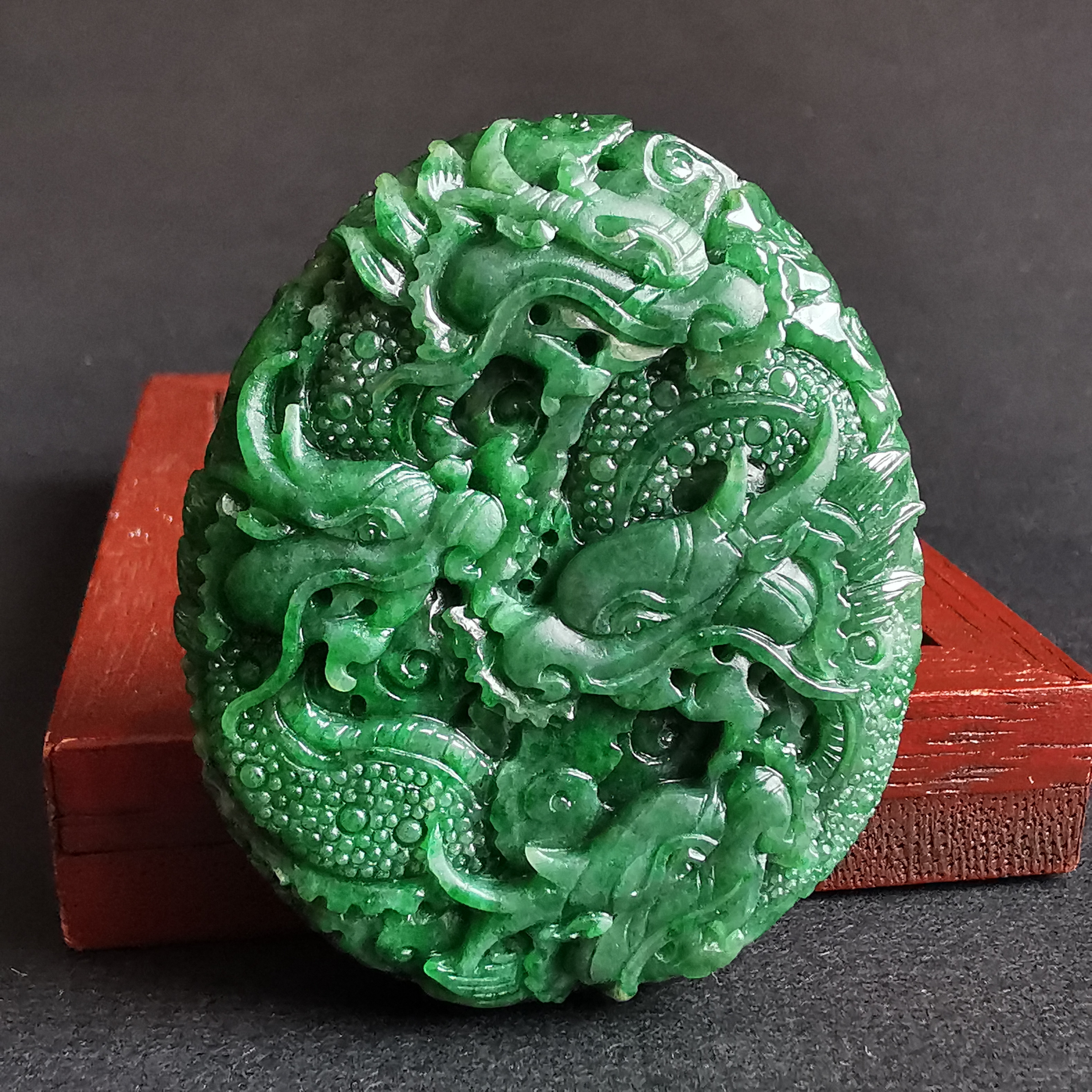 天然翡翠A玉,滿綠老料,大師級雕工,雙面雕