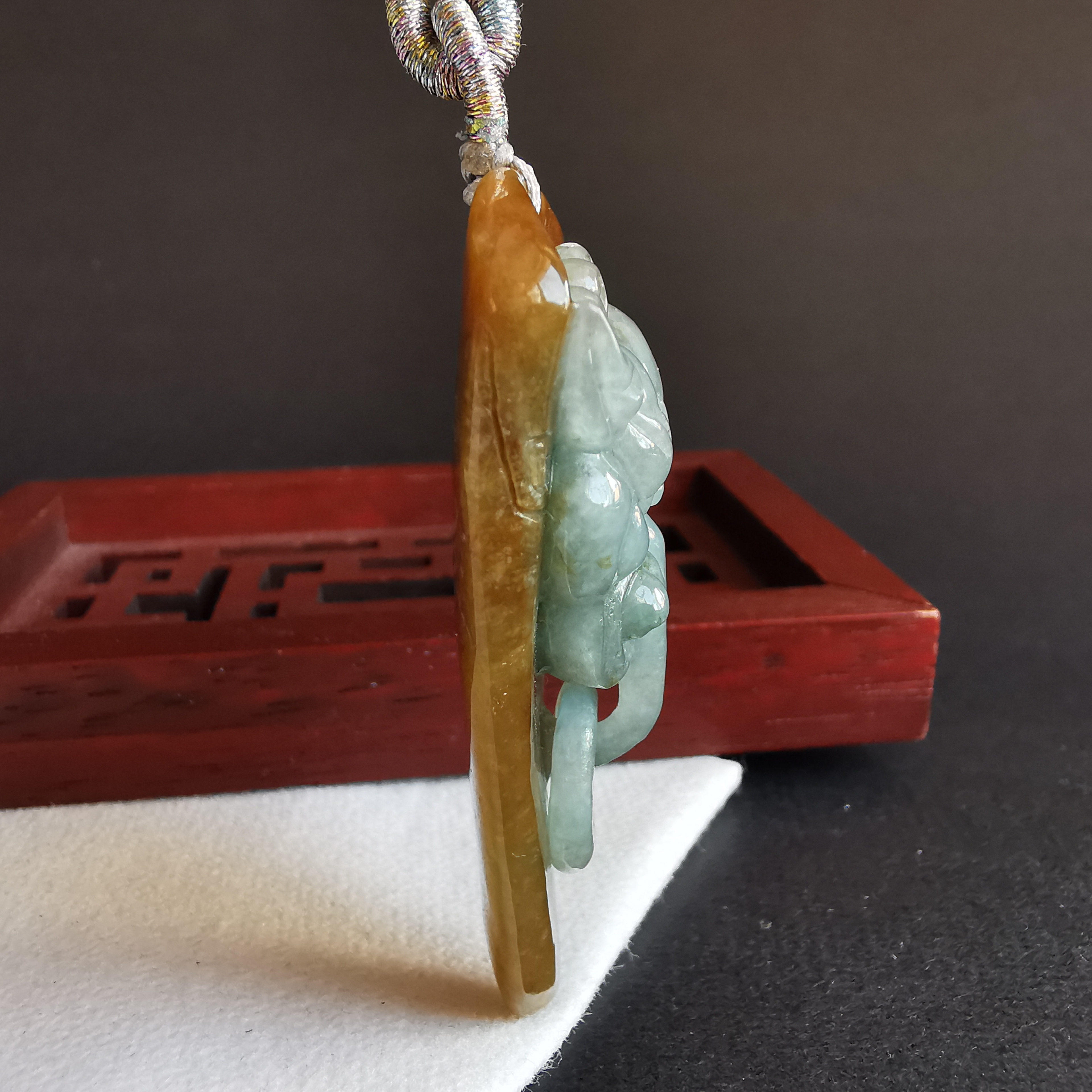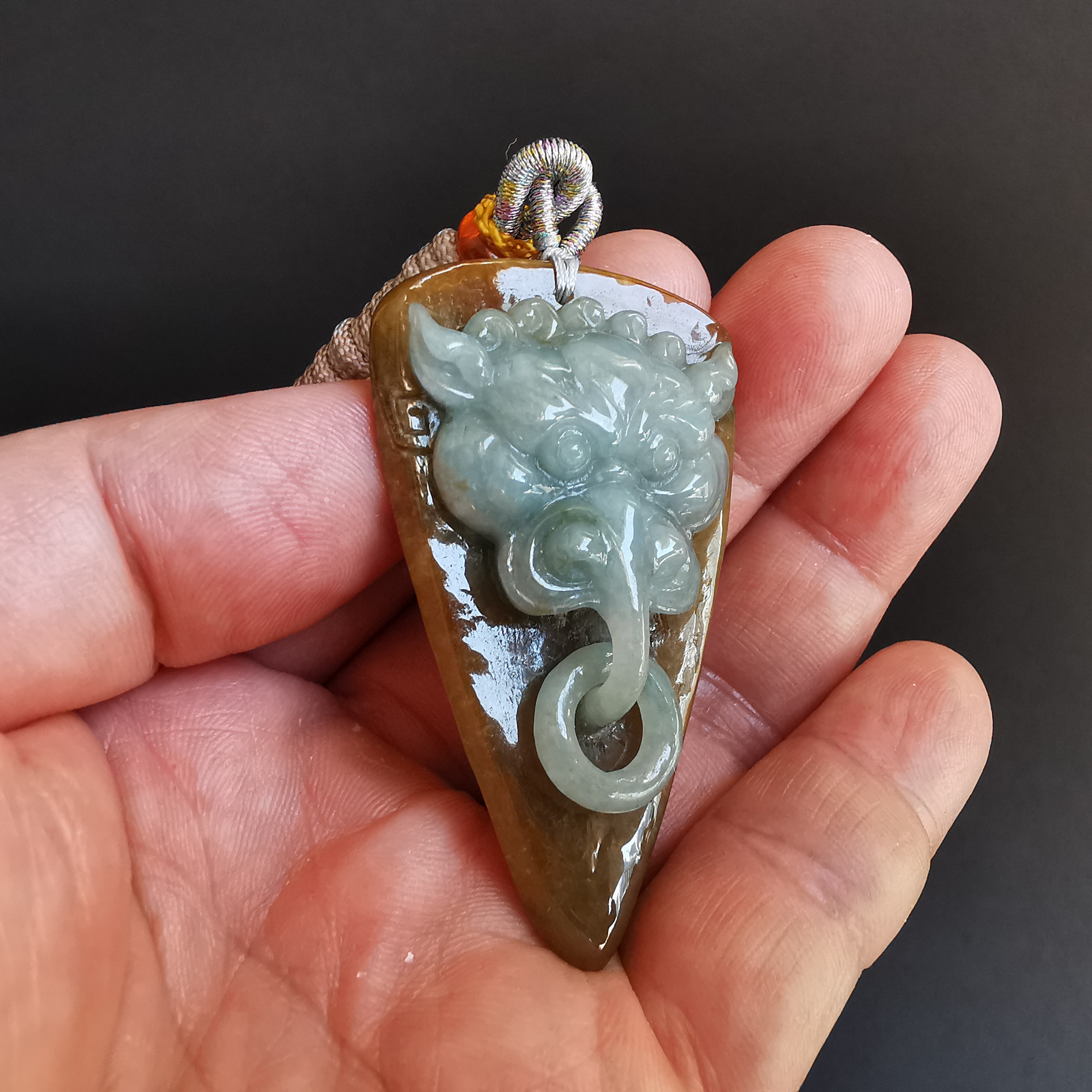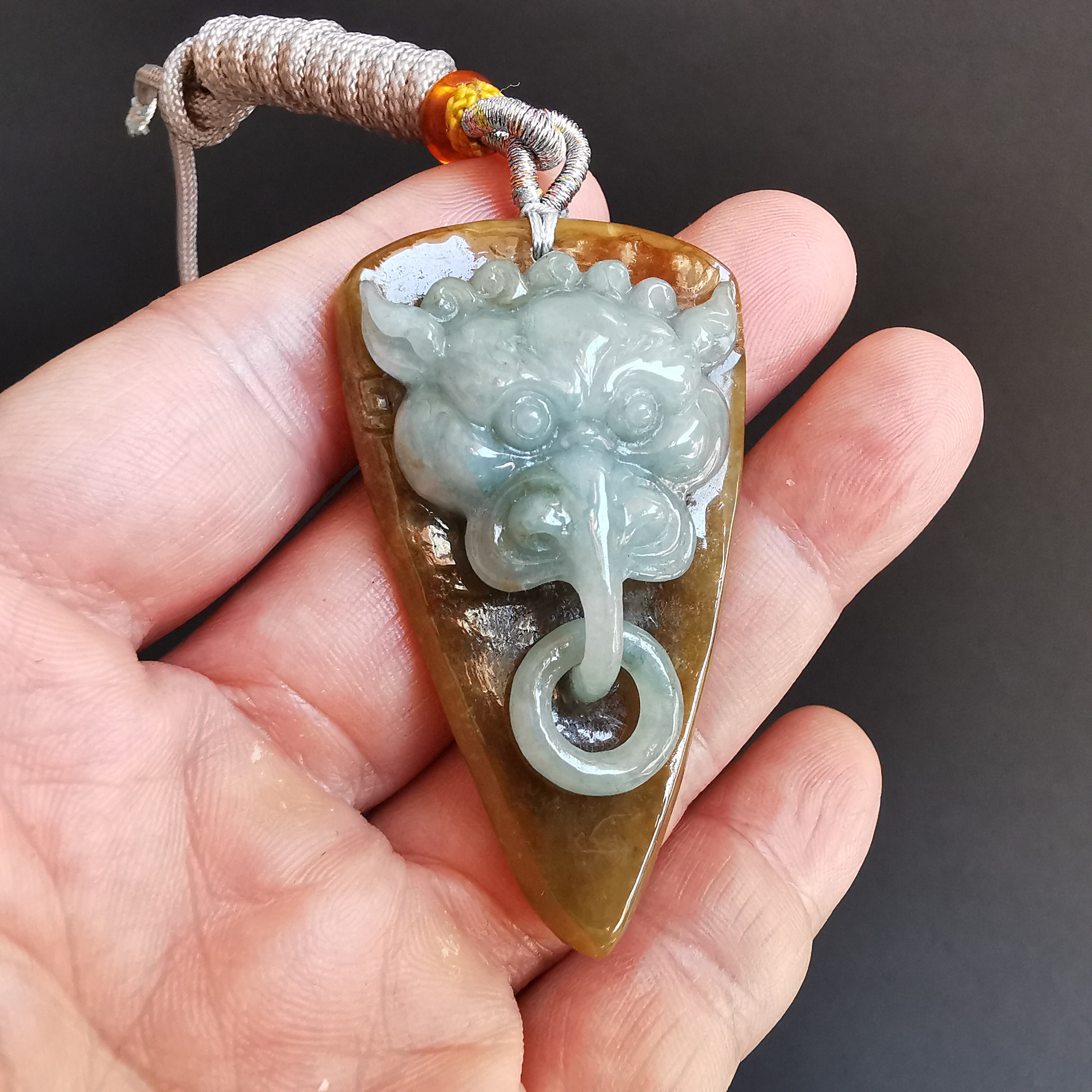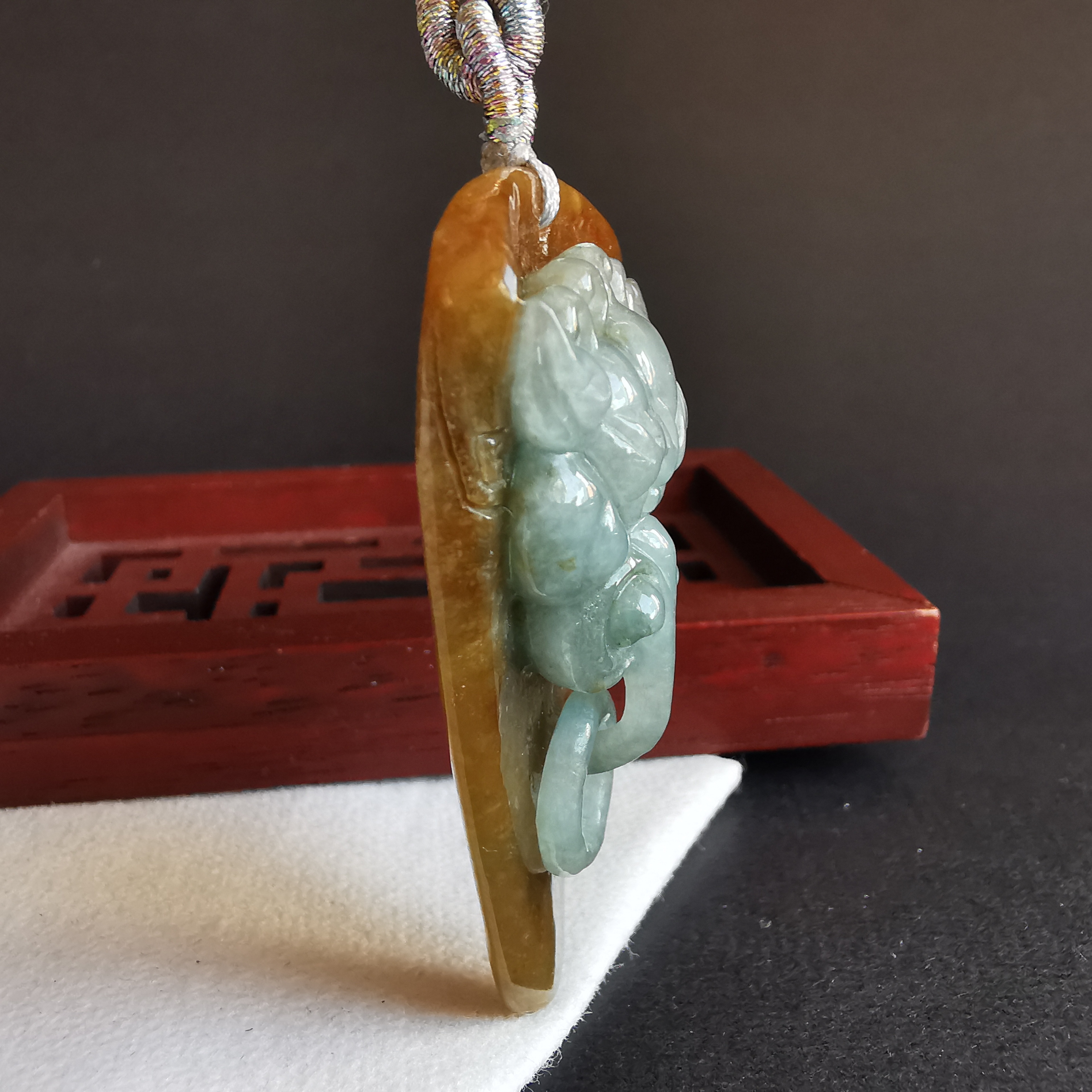 這件利用天然紅翡料包青肉,利用原石兩層色料巧雕而成。而嘴下的吊環是同料套雕而來。全手工雕刻,工藝十分仔細。佩戴起來十分吸睛!