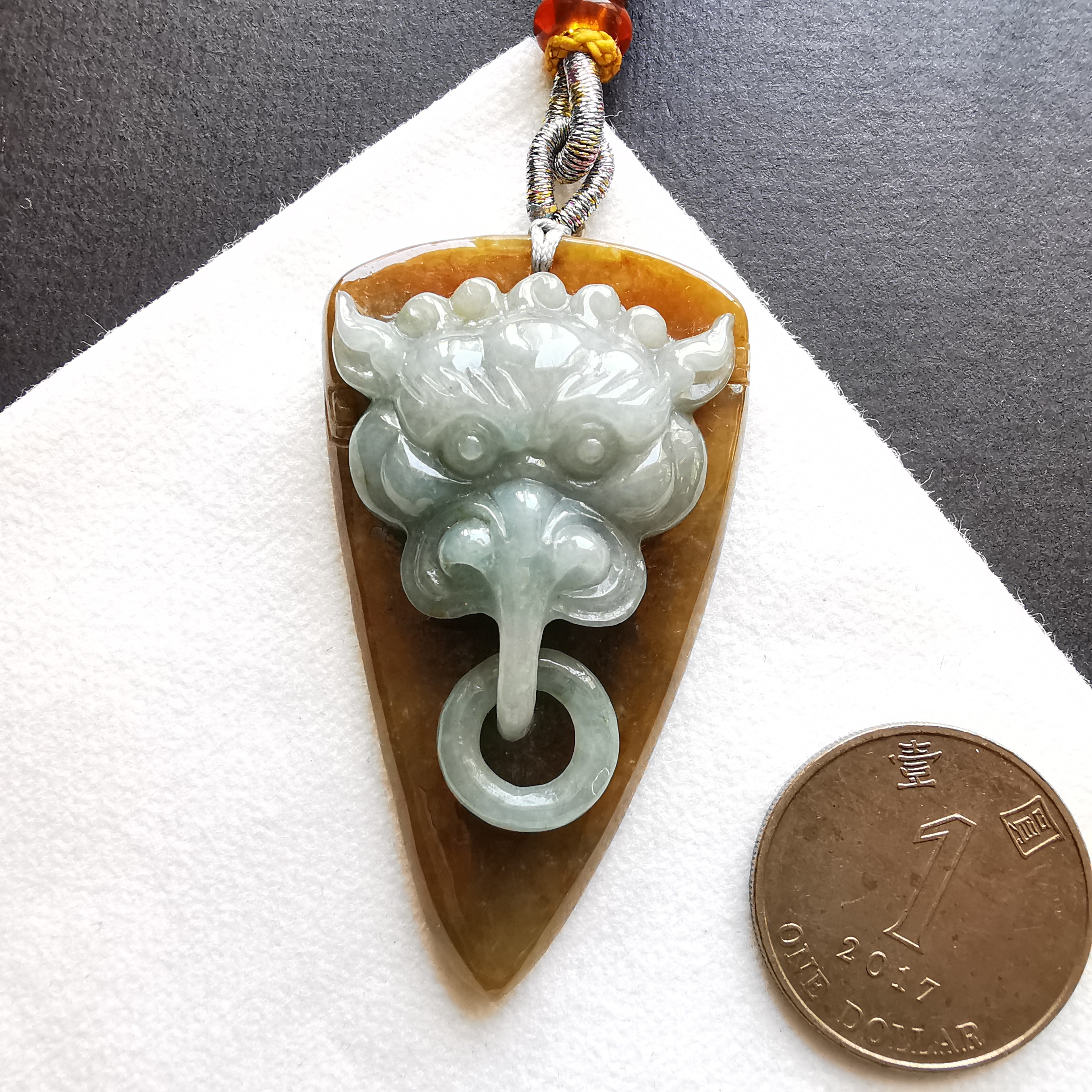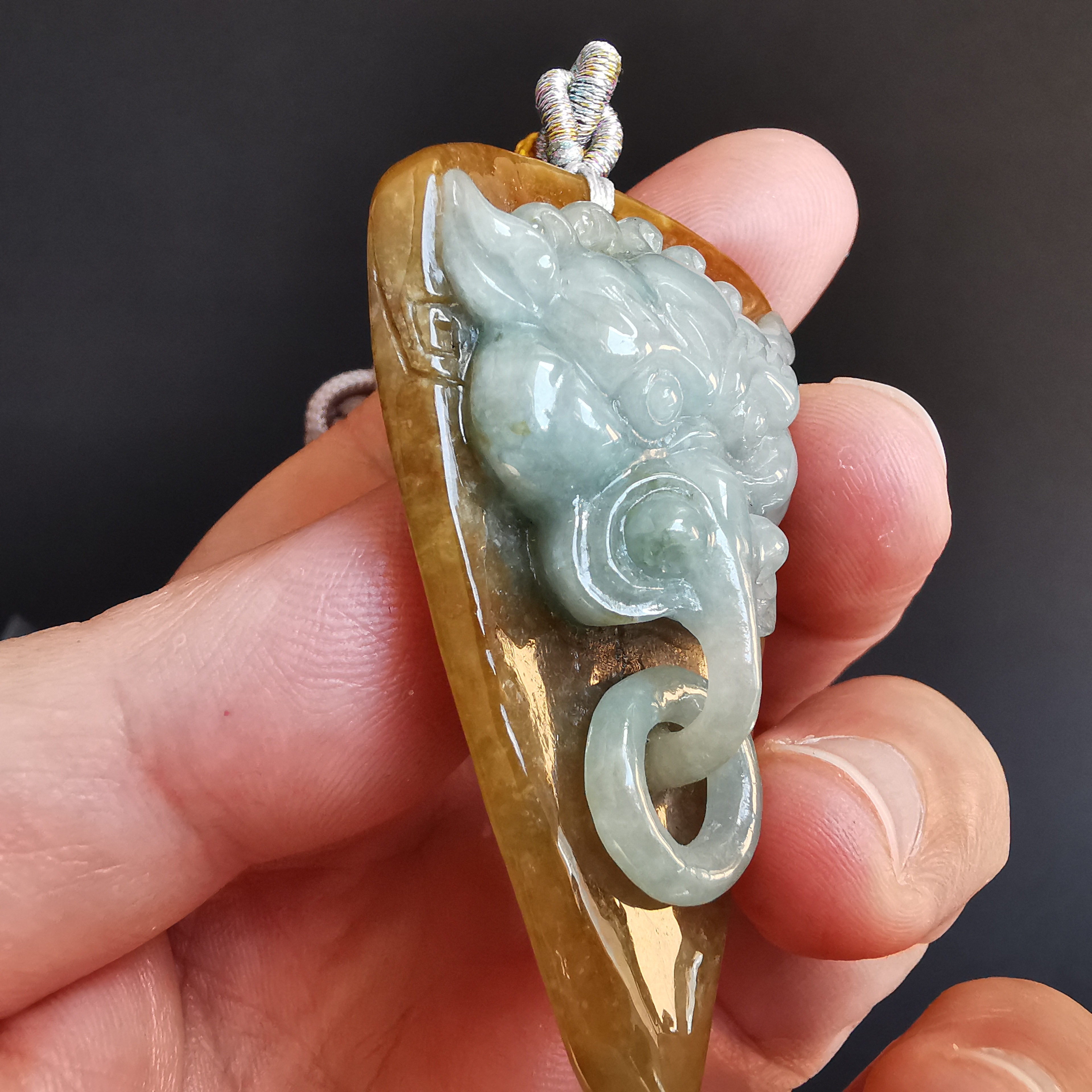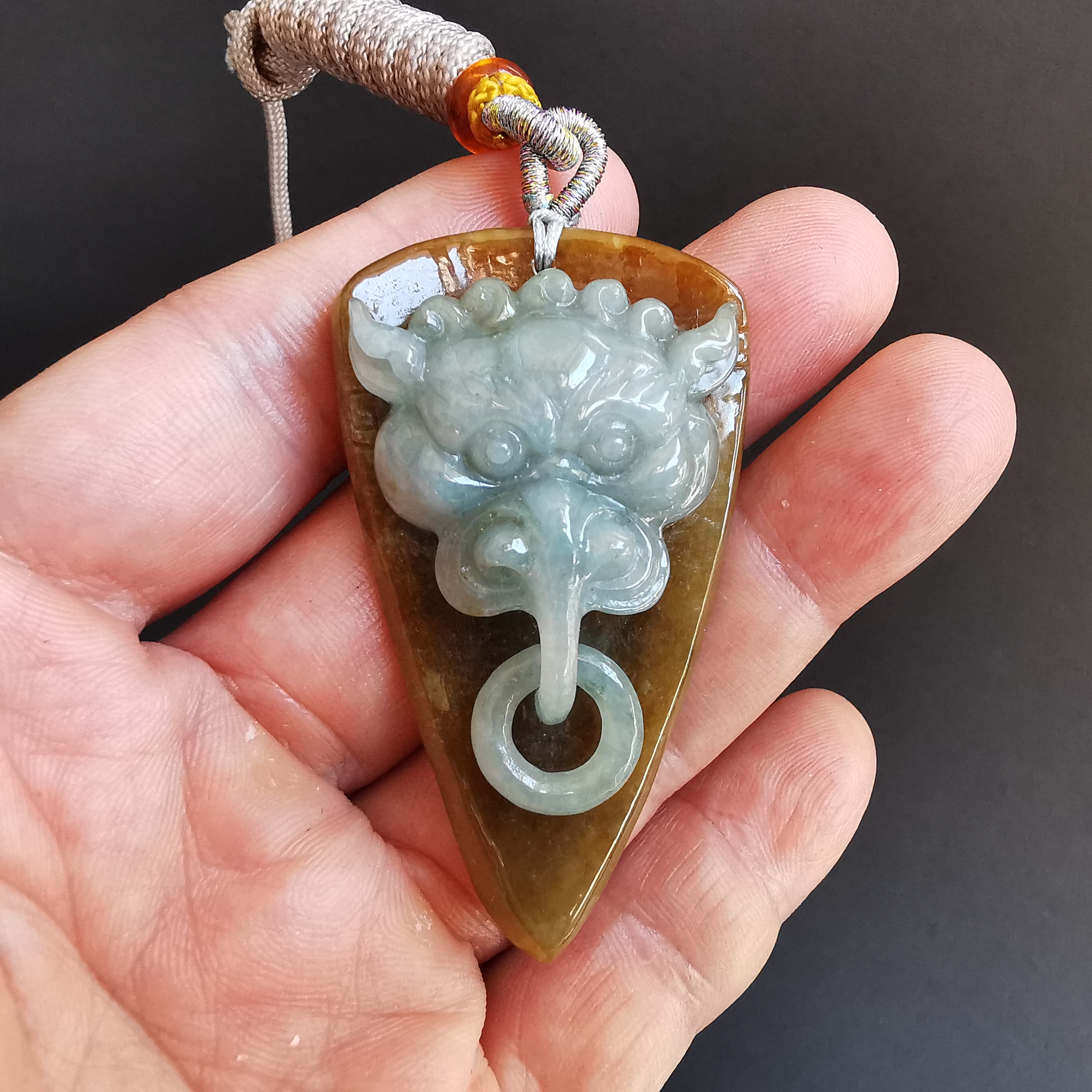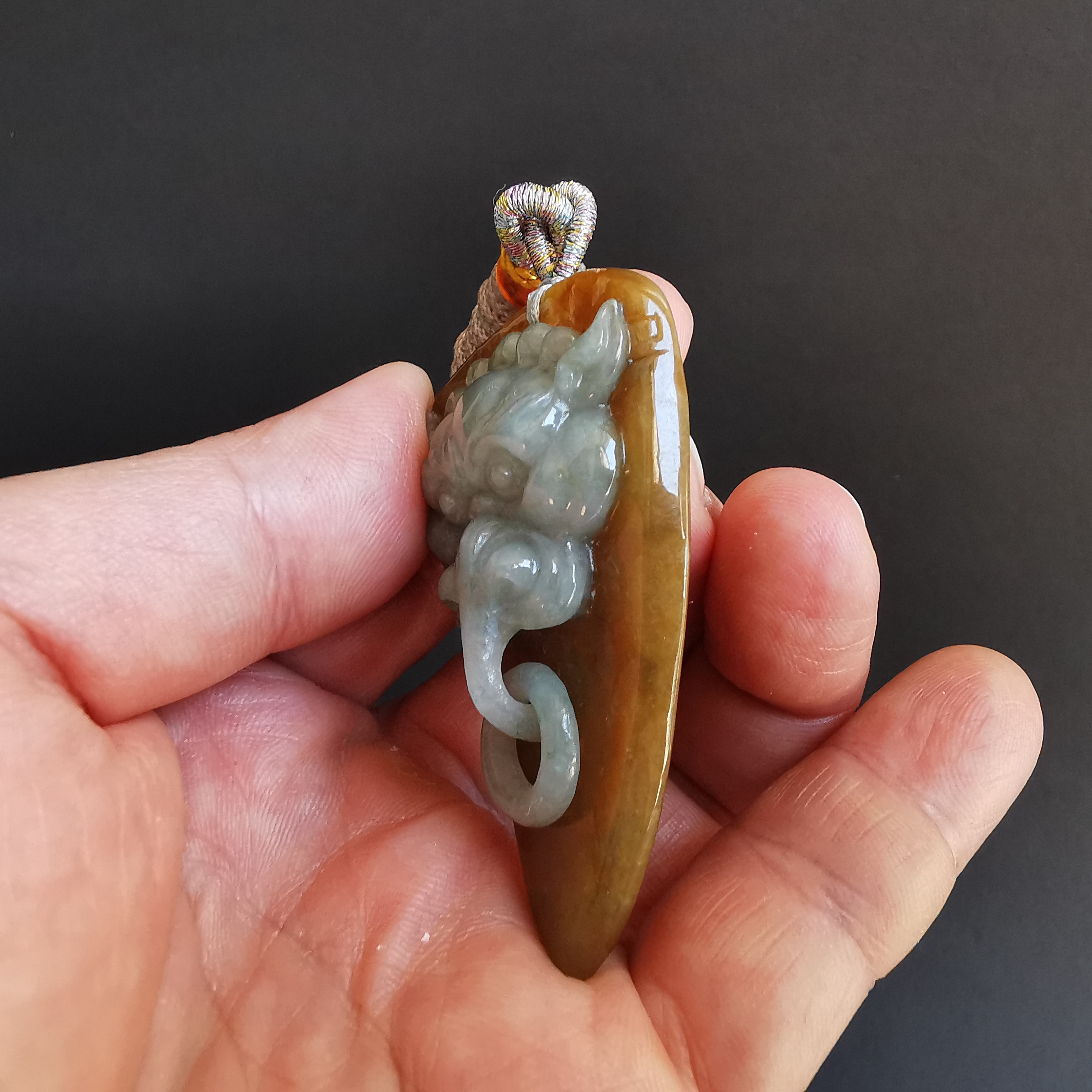這件利用天然紅翡料包青肉,利用原石兩層色料巧雕而成。而嘴下的吊環是同料套雕而來。全手工雕刻,工藝十分仔細。佩戴起來十分吸睛!