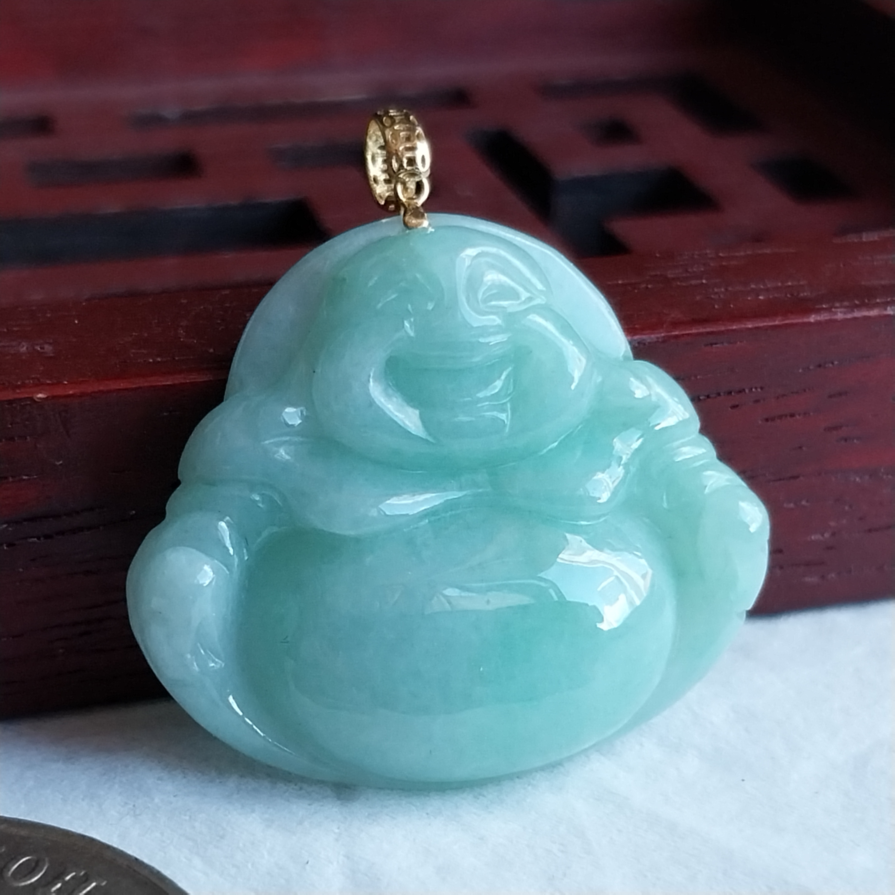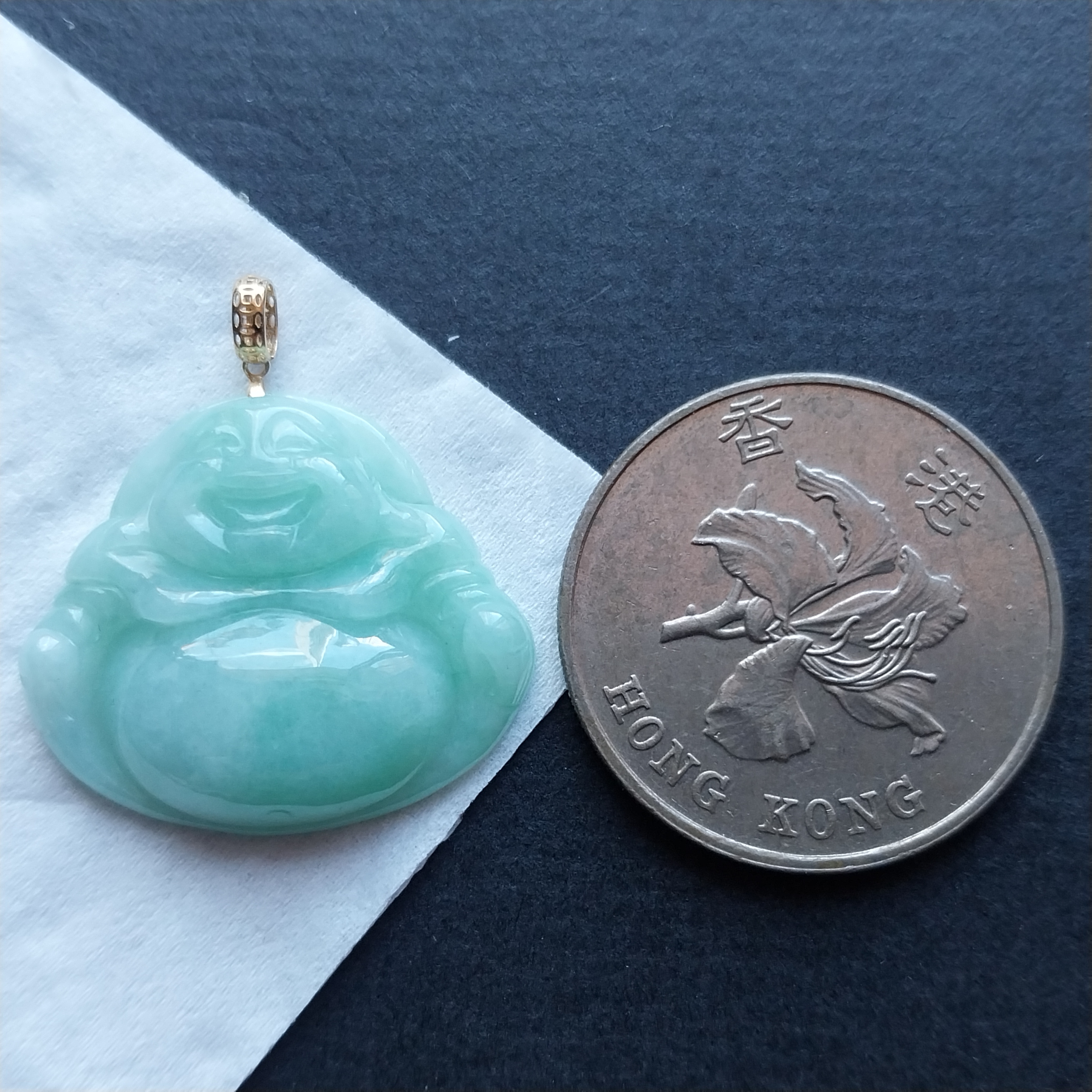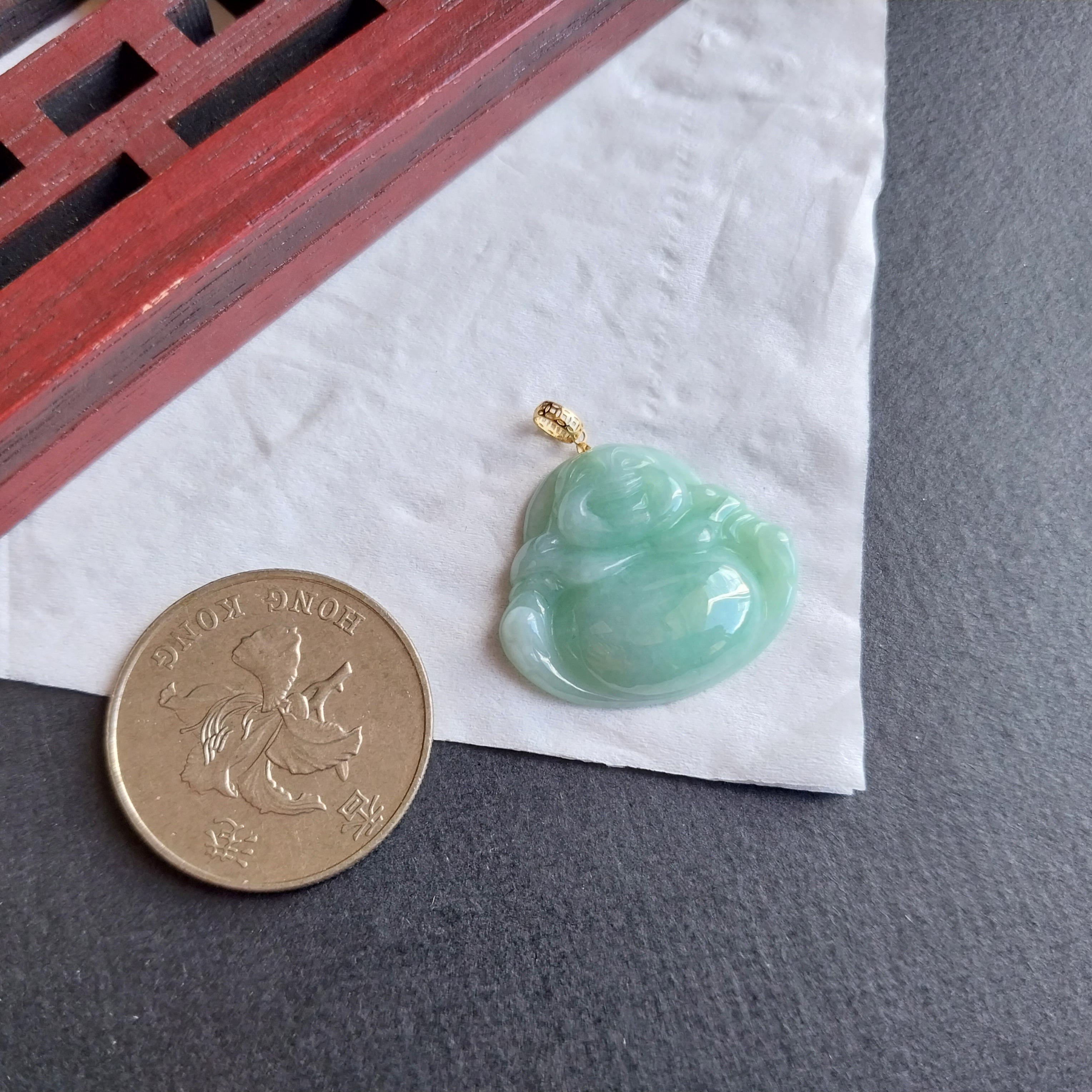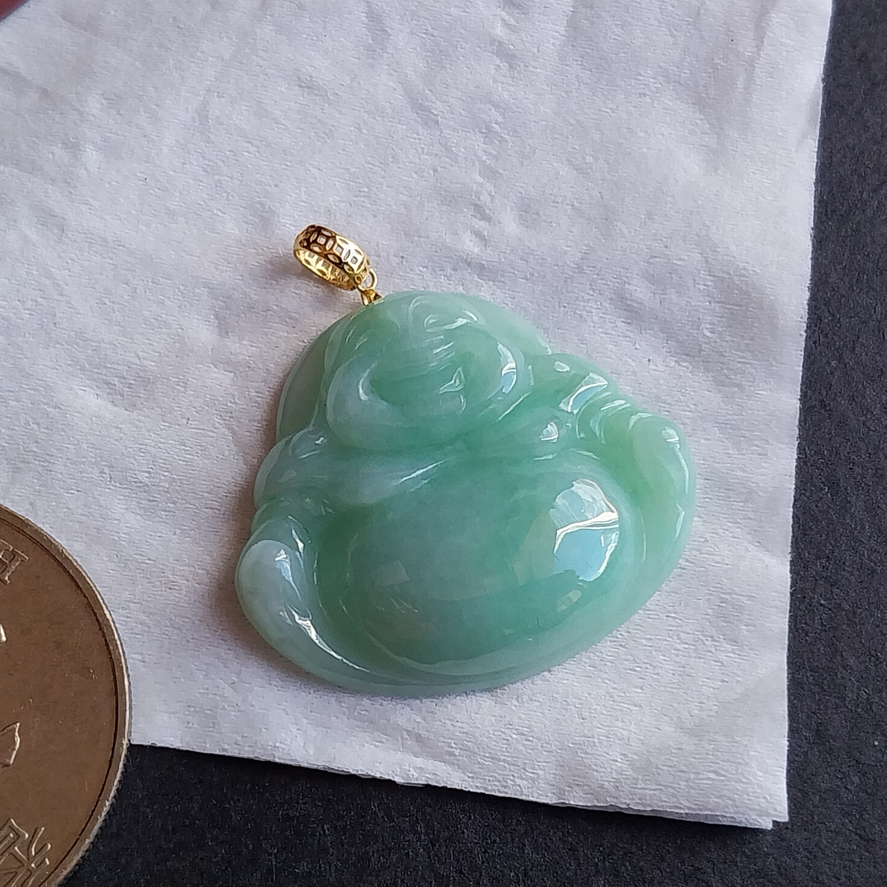 • 冰糯綠笑佛+18K金扣, 天然翡翠A玉, 緬甸玉, Jade, Jadeite