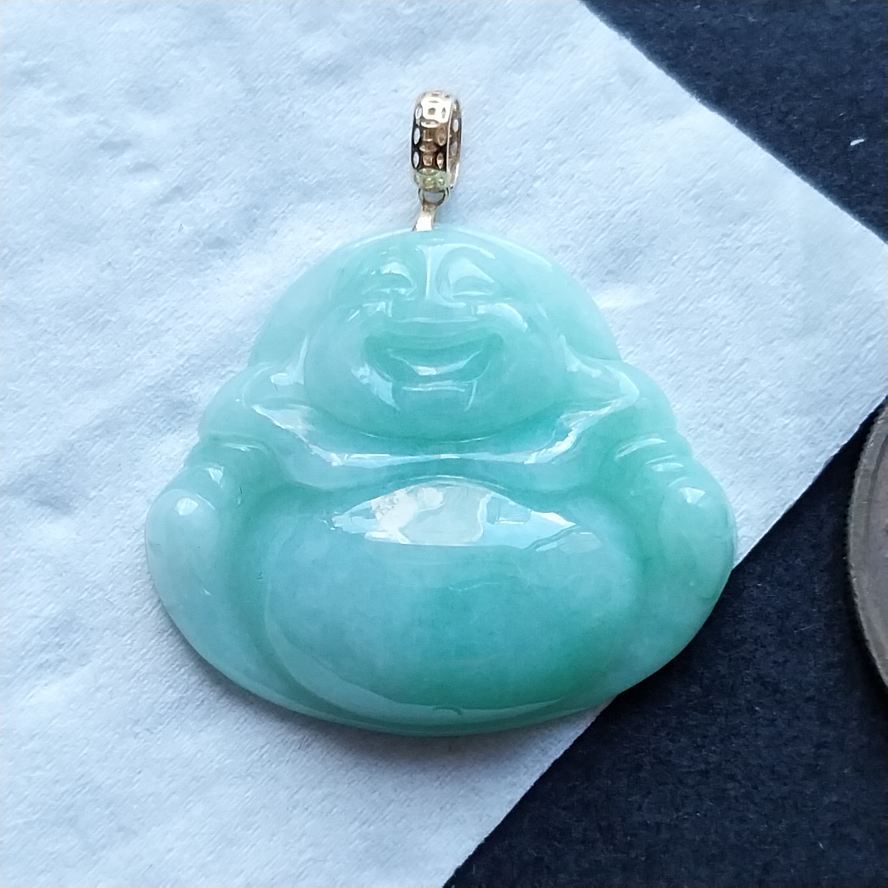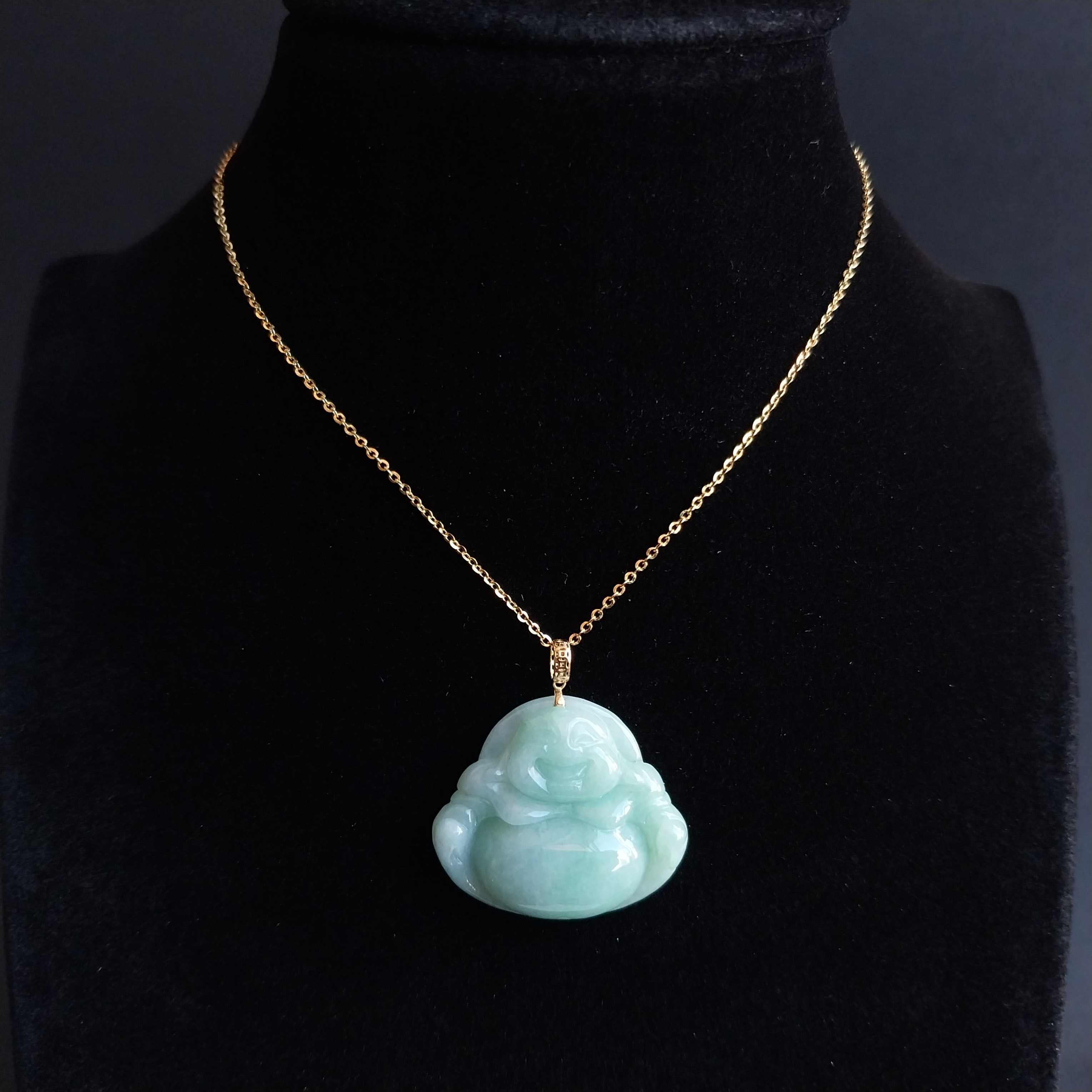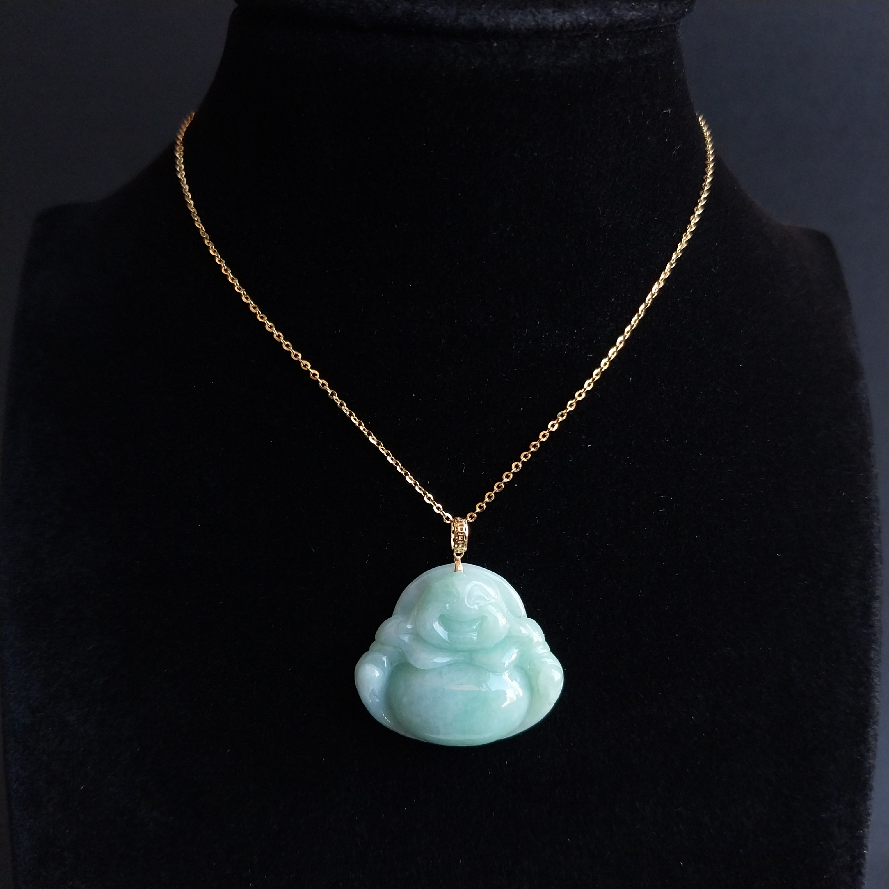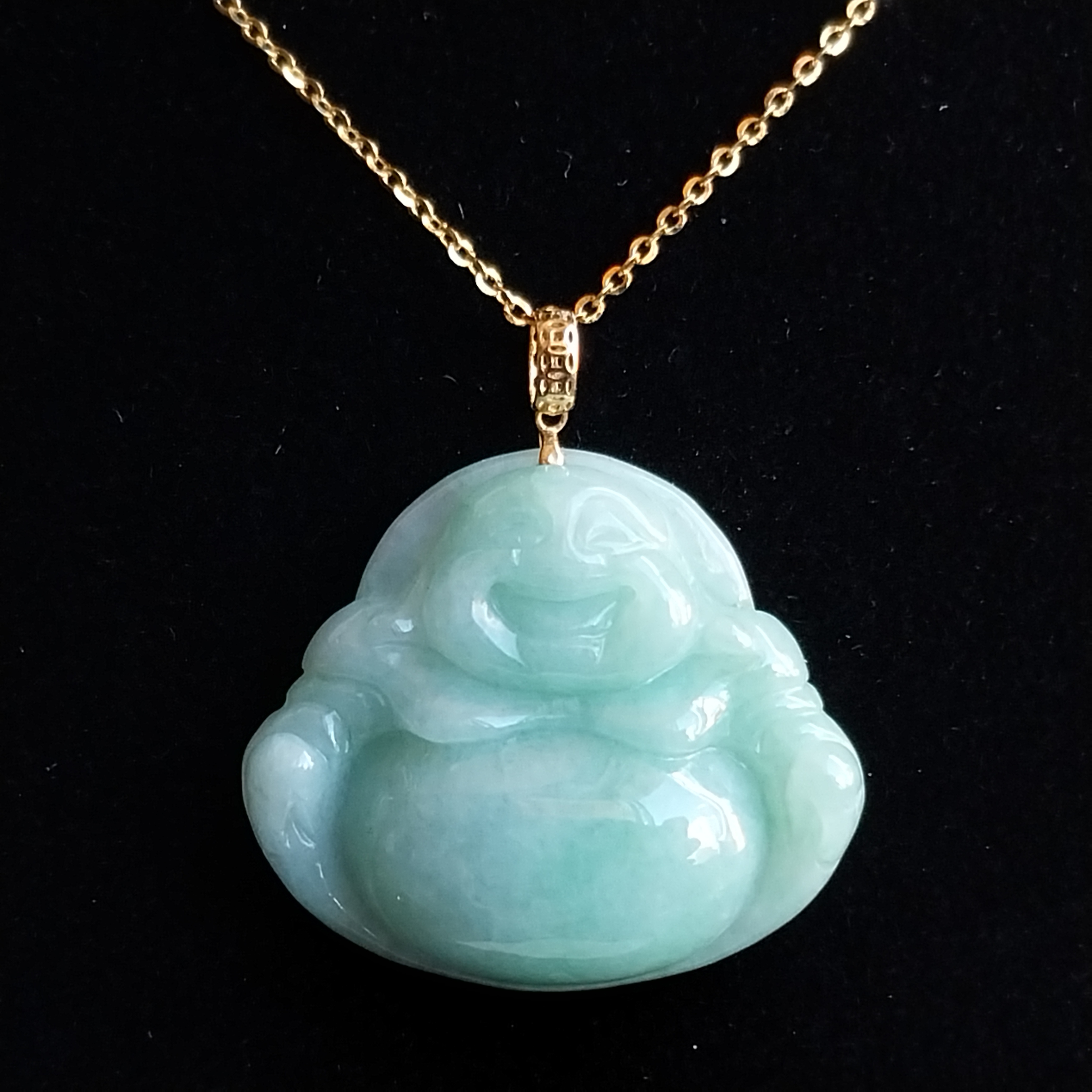 • 冰糯綠笑佛+18K金扣, 天然翡翠A玉, 緬甸玉, Jade, Jadeite