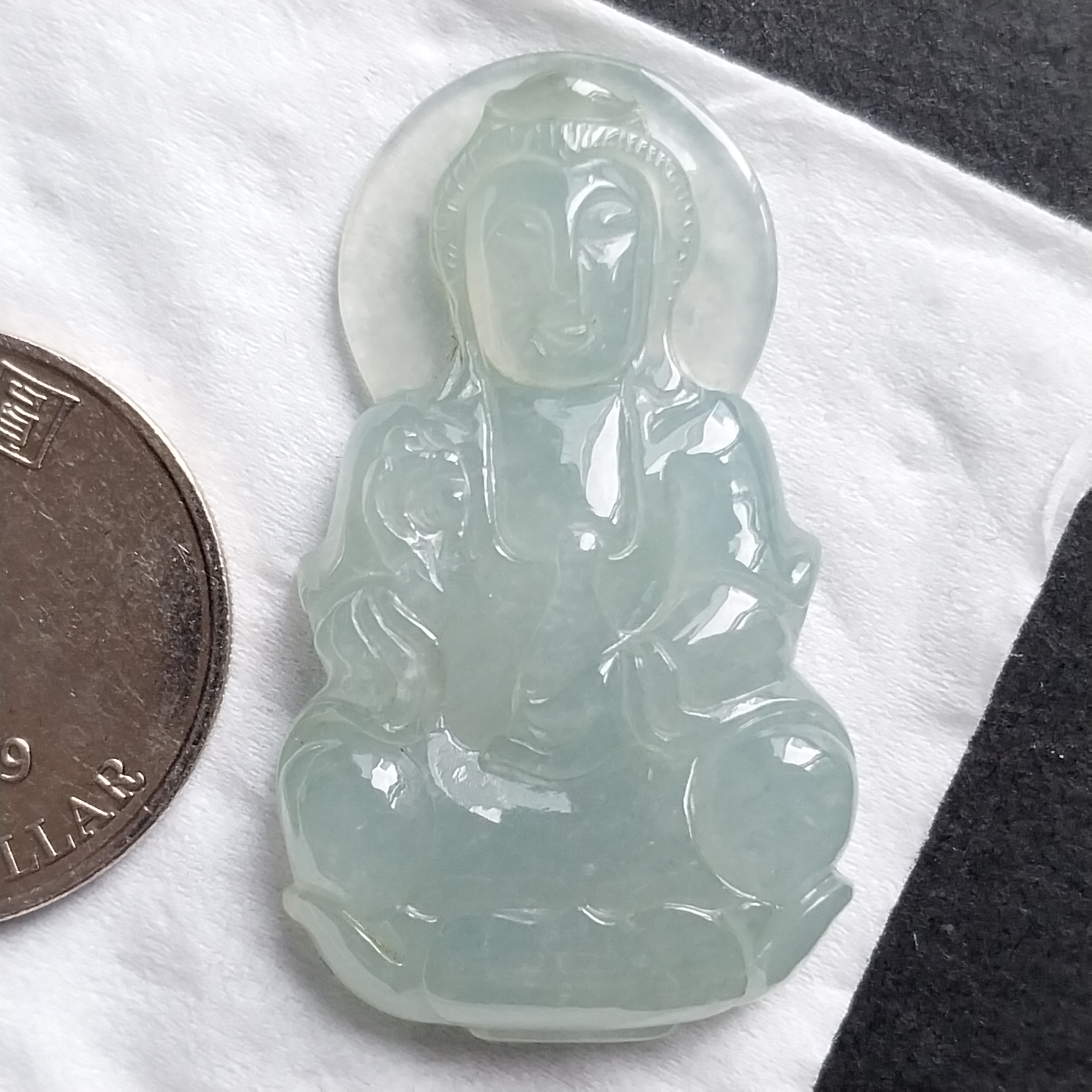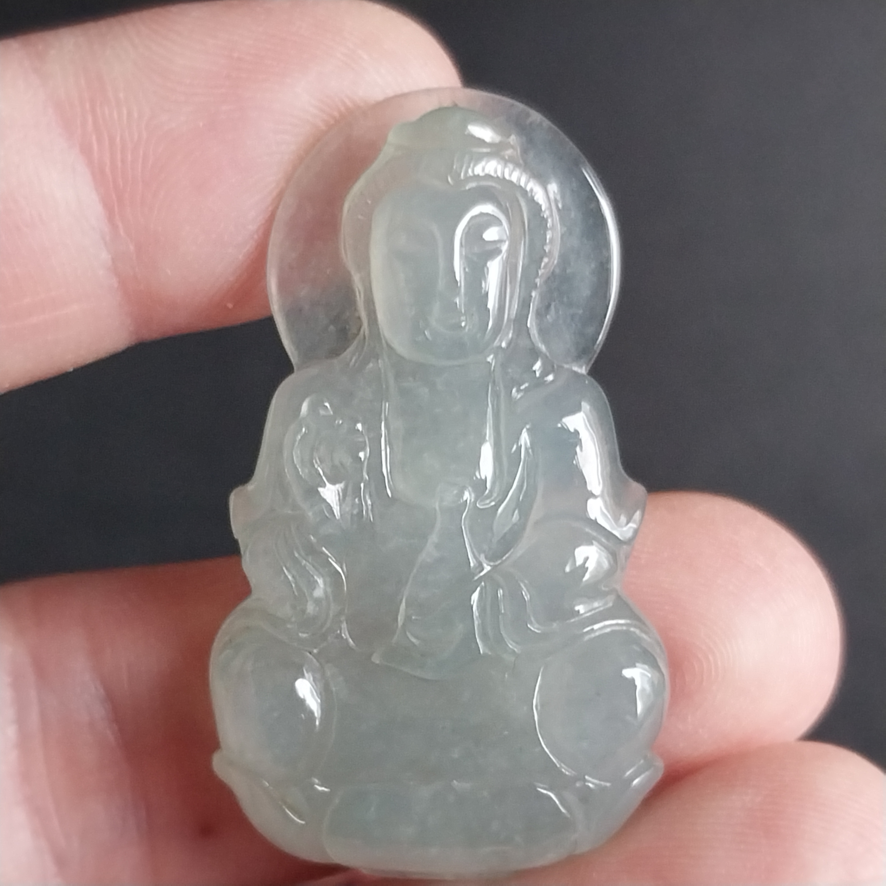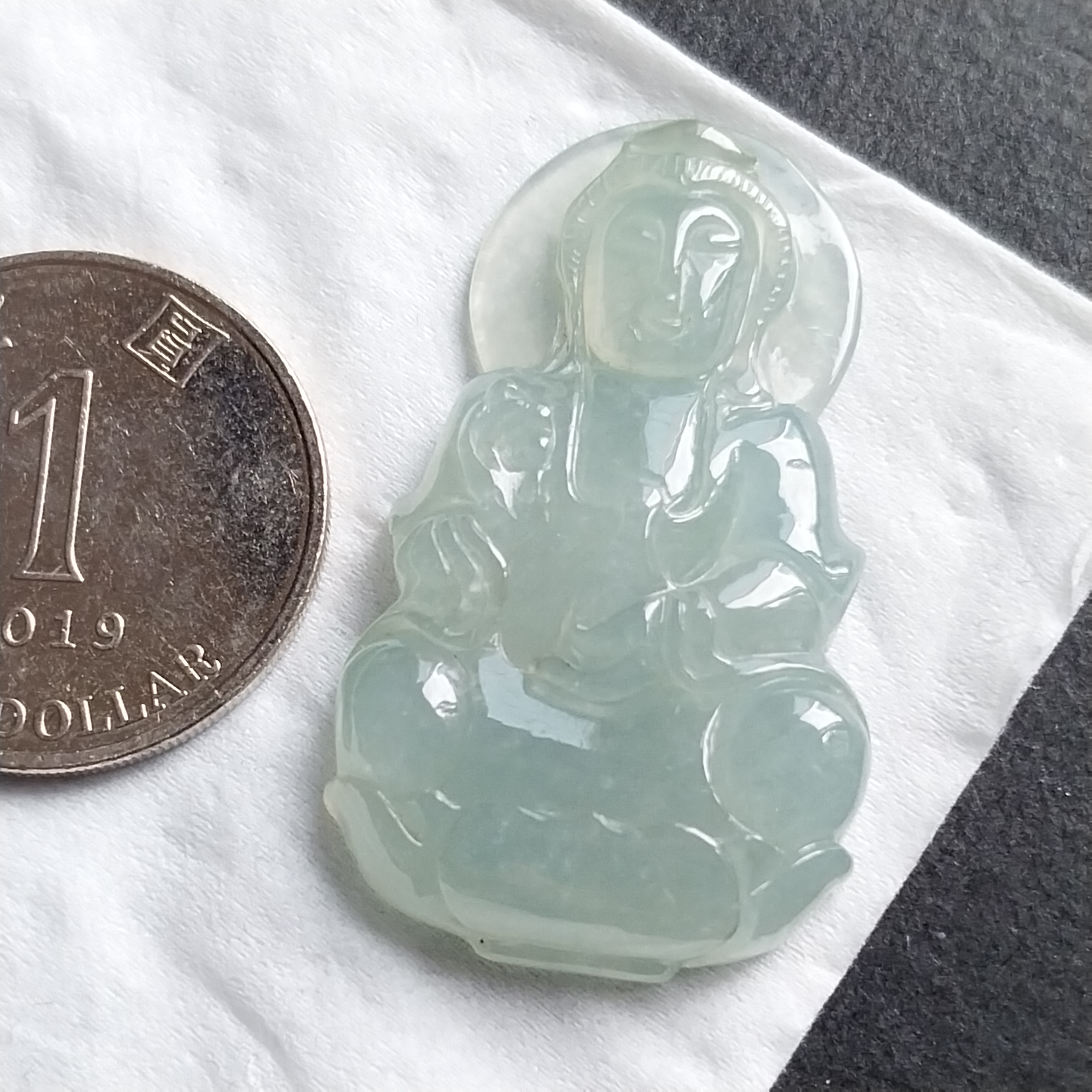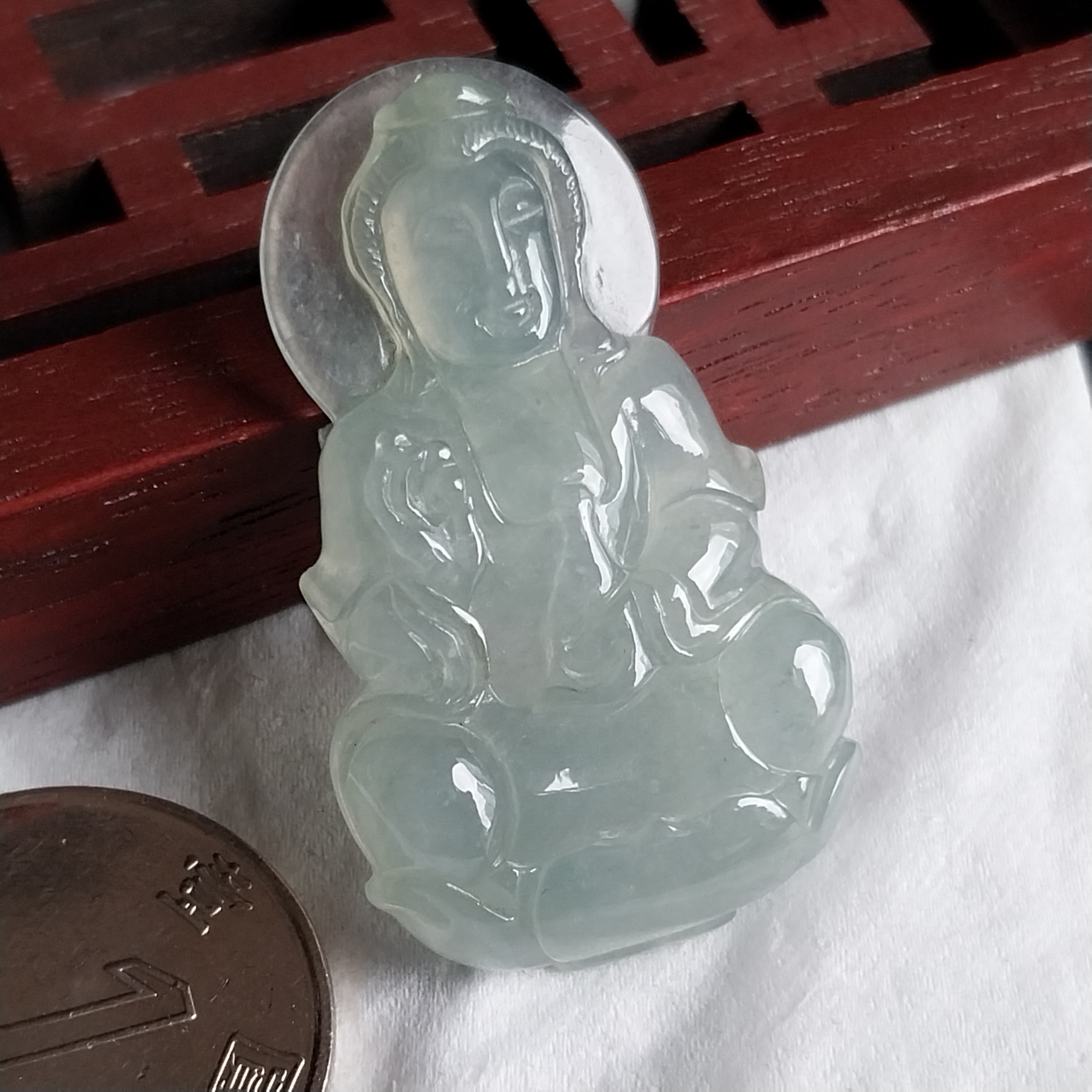 • 冰晴水綠坐蓮觀音吊墜, 天然翡翠A玉, 緬甸玉, Jade, Jadeite