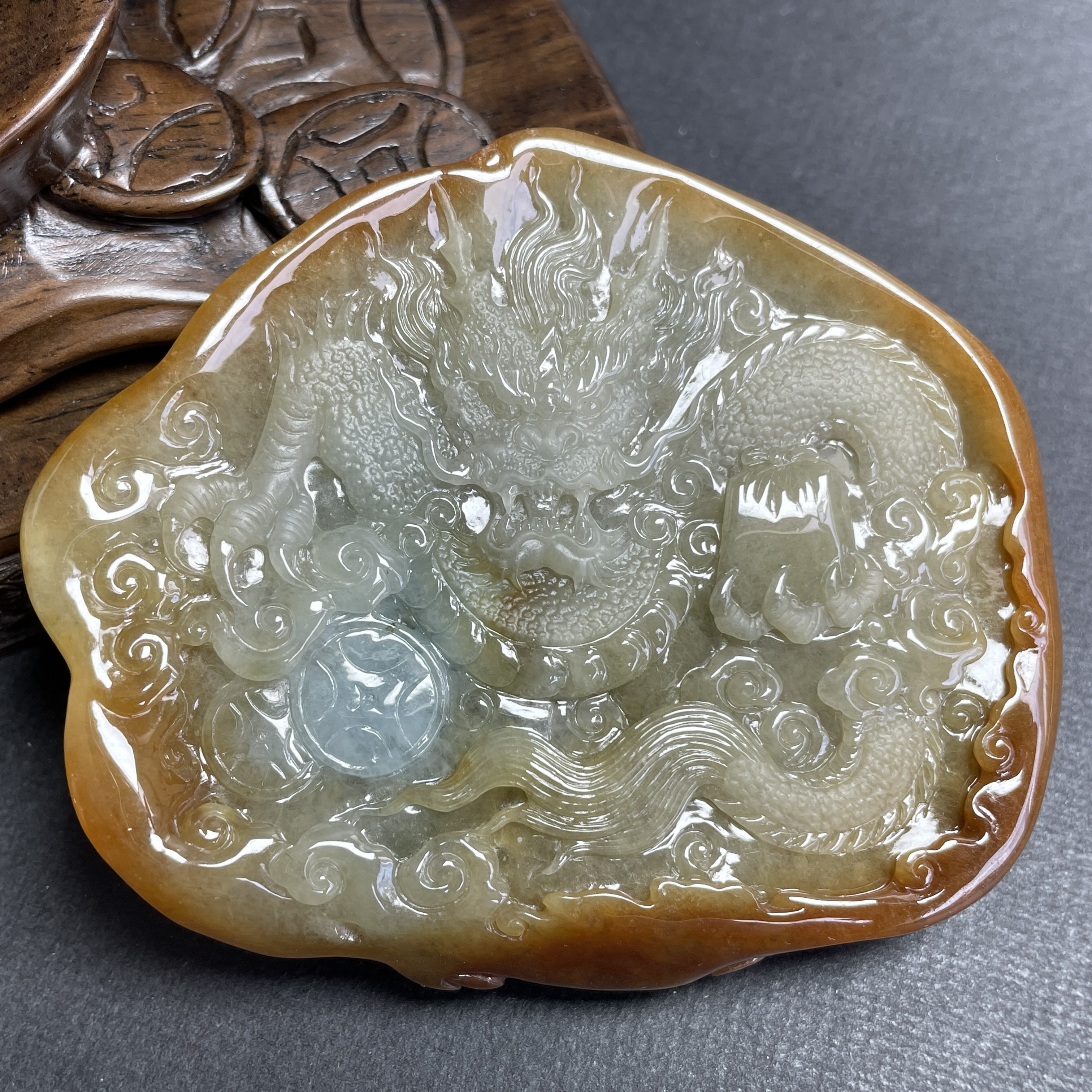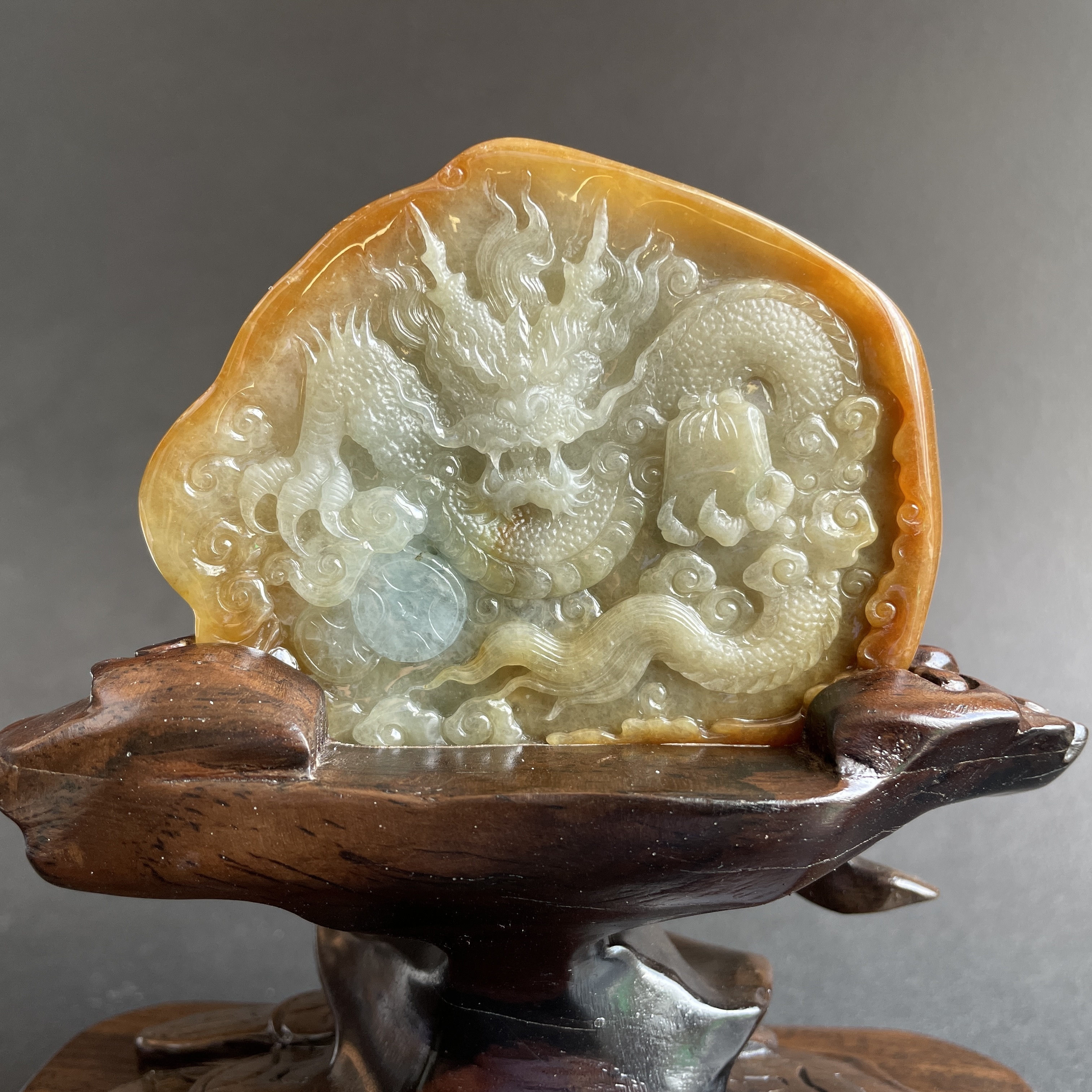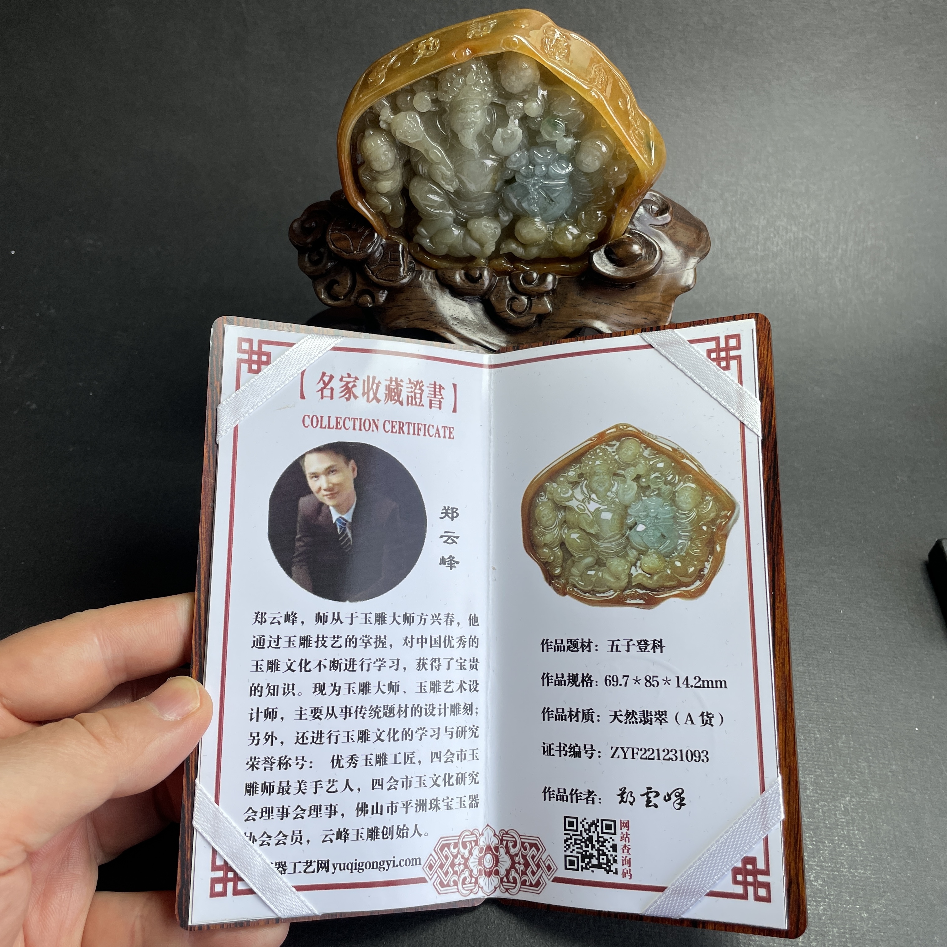 天然,完美無紋裂。大師級精雕。正面雕有「五子登科」,背面雕有「龍托印」。代表權勢,寓意加官晉爵、財源滾滾、招財進寶。配木底座。