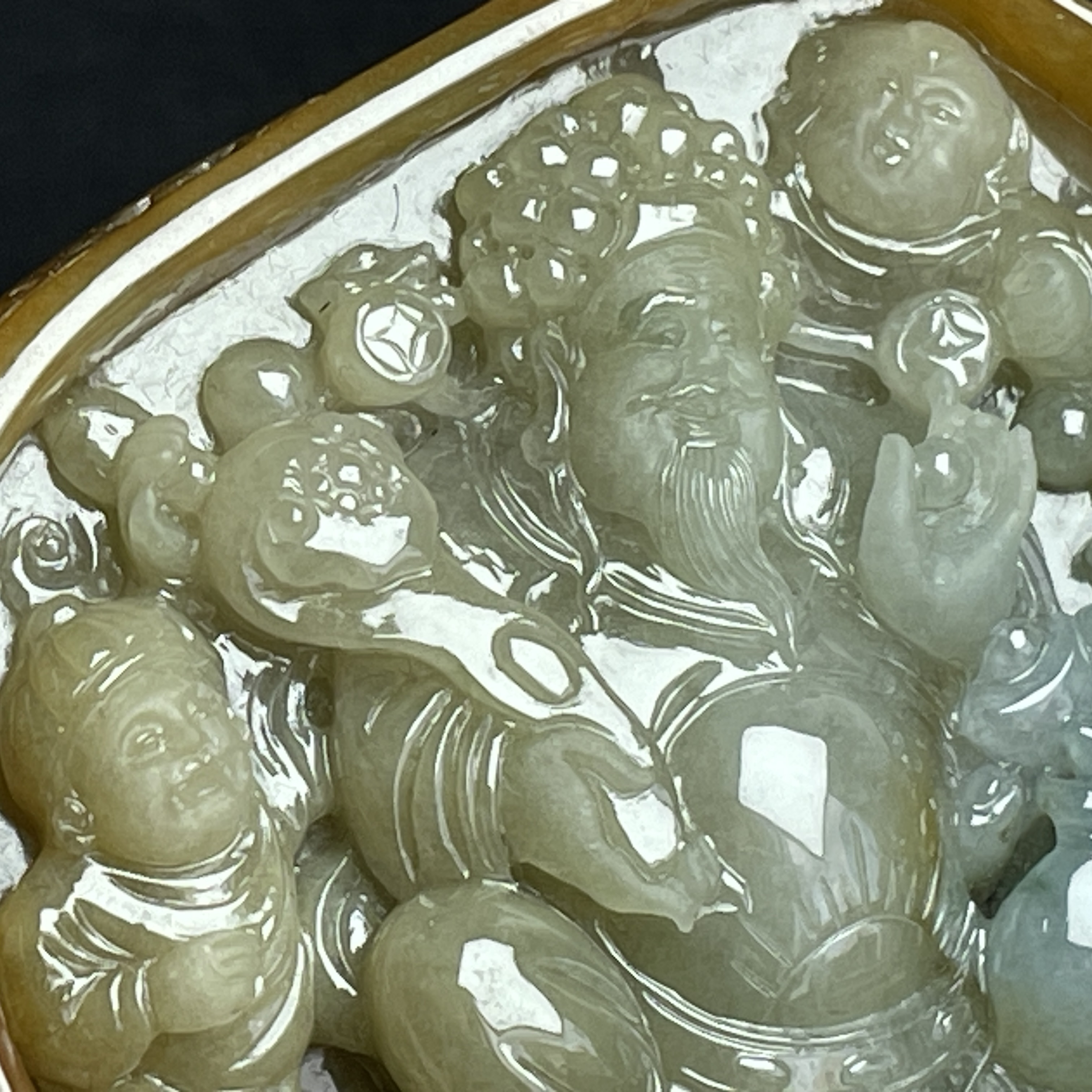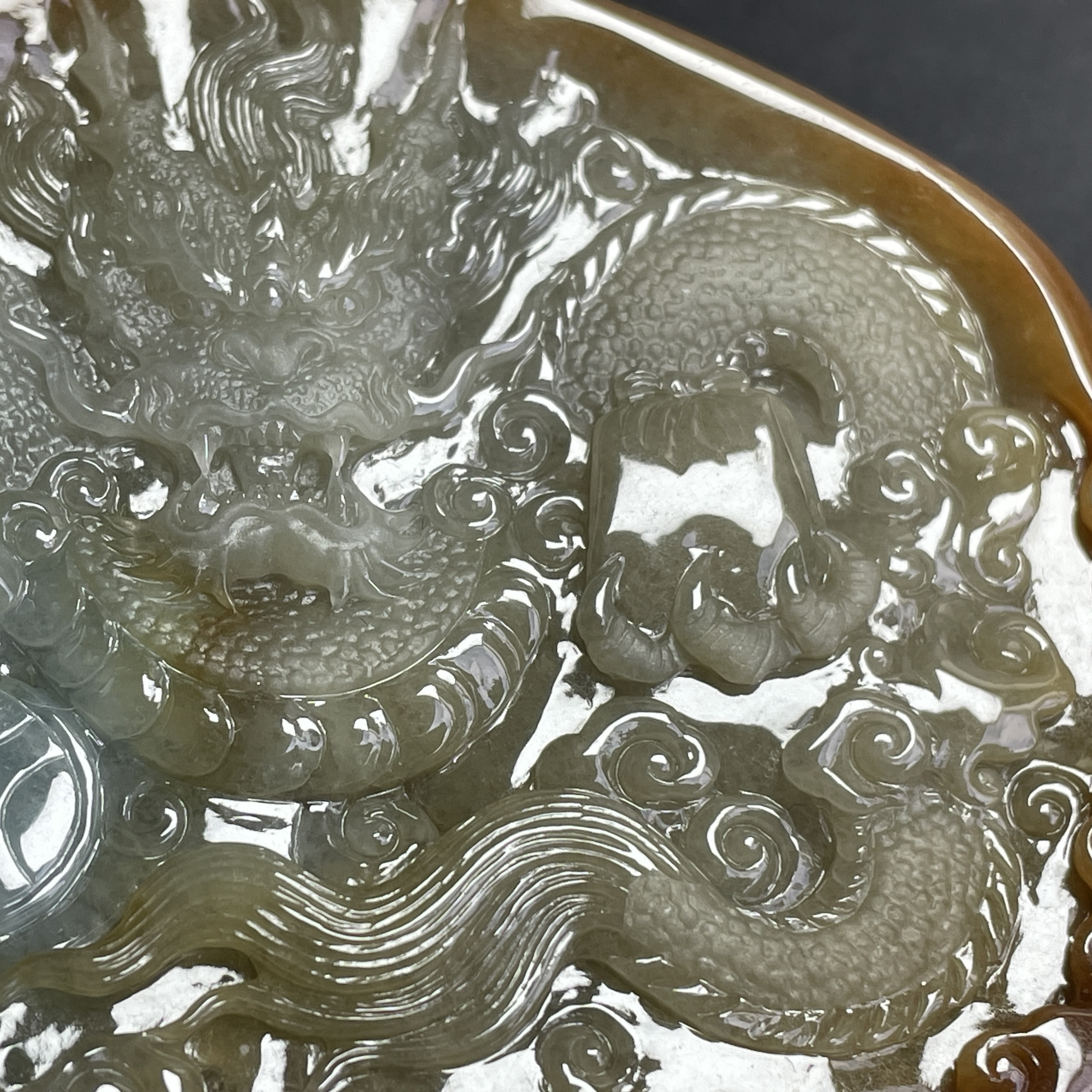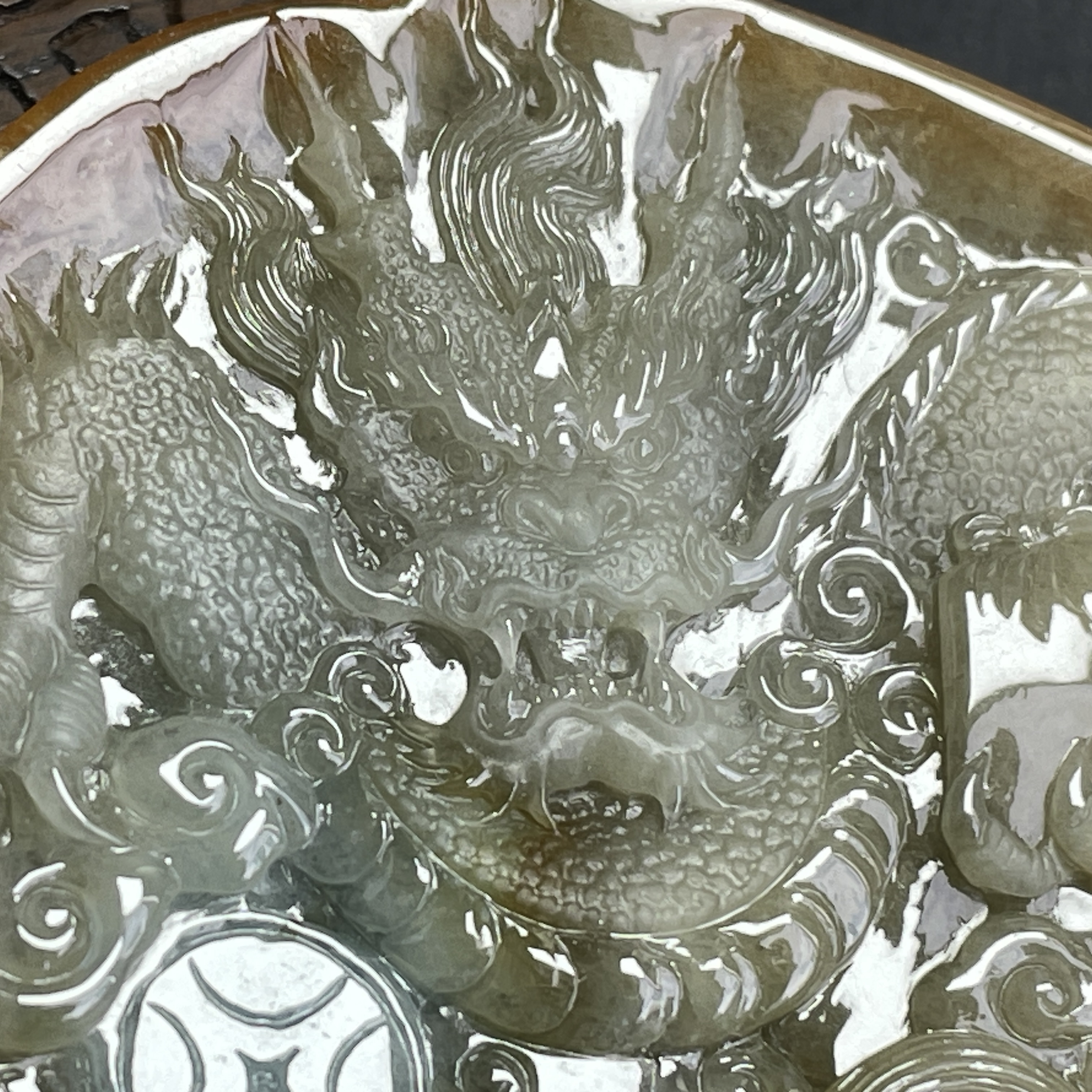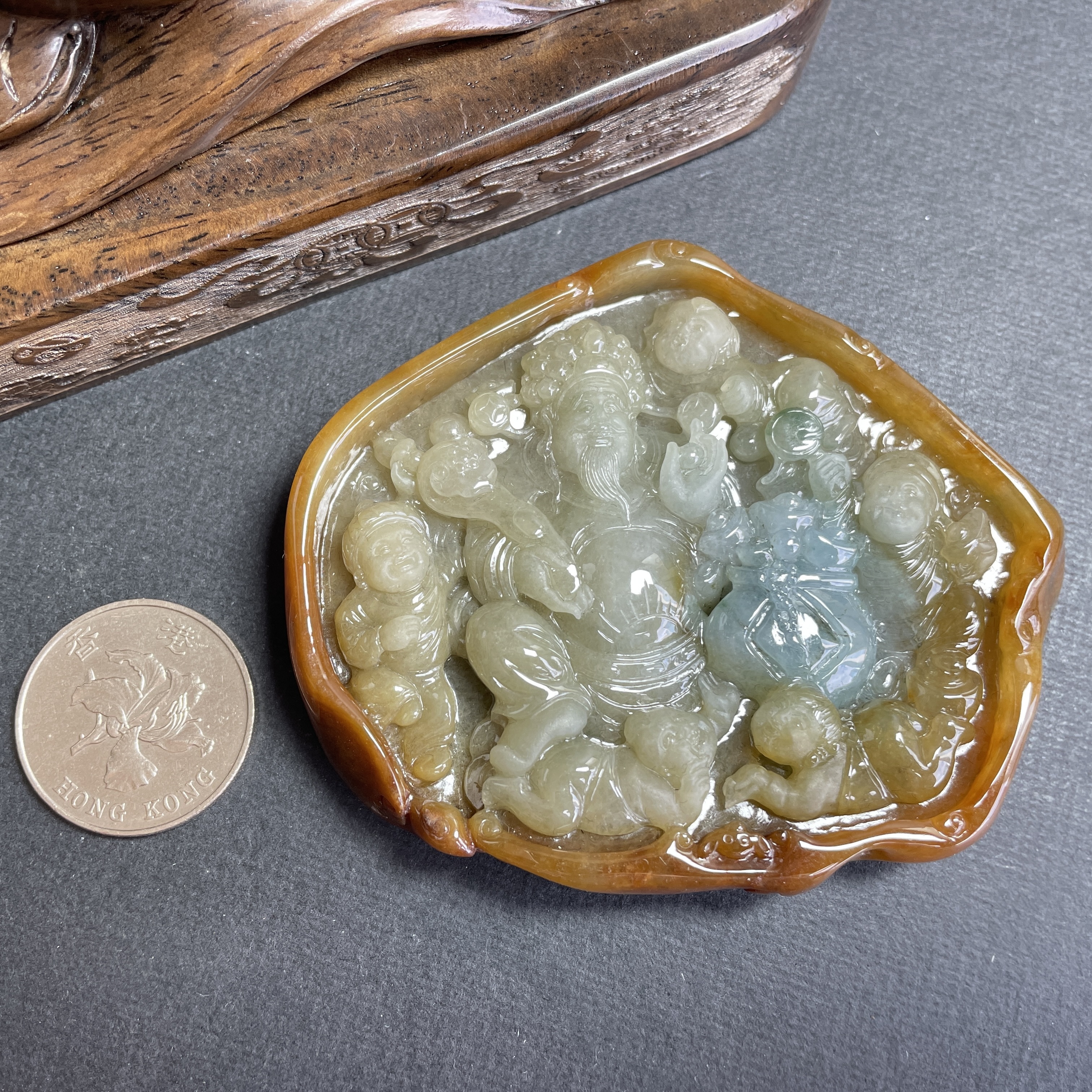 天然,完美無紋裂。大師級精雕。正面雕有「五子登科」,背面雕有「龍托印」。代表權勢,寓意加官晉爵、財源滾滾、招財進寶。配木底座。
