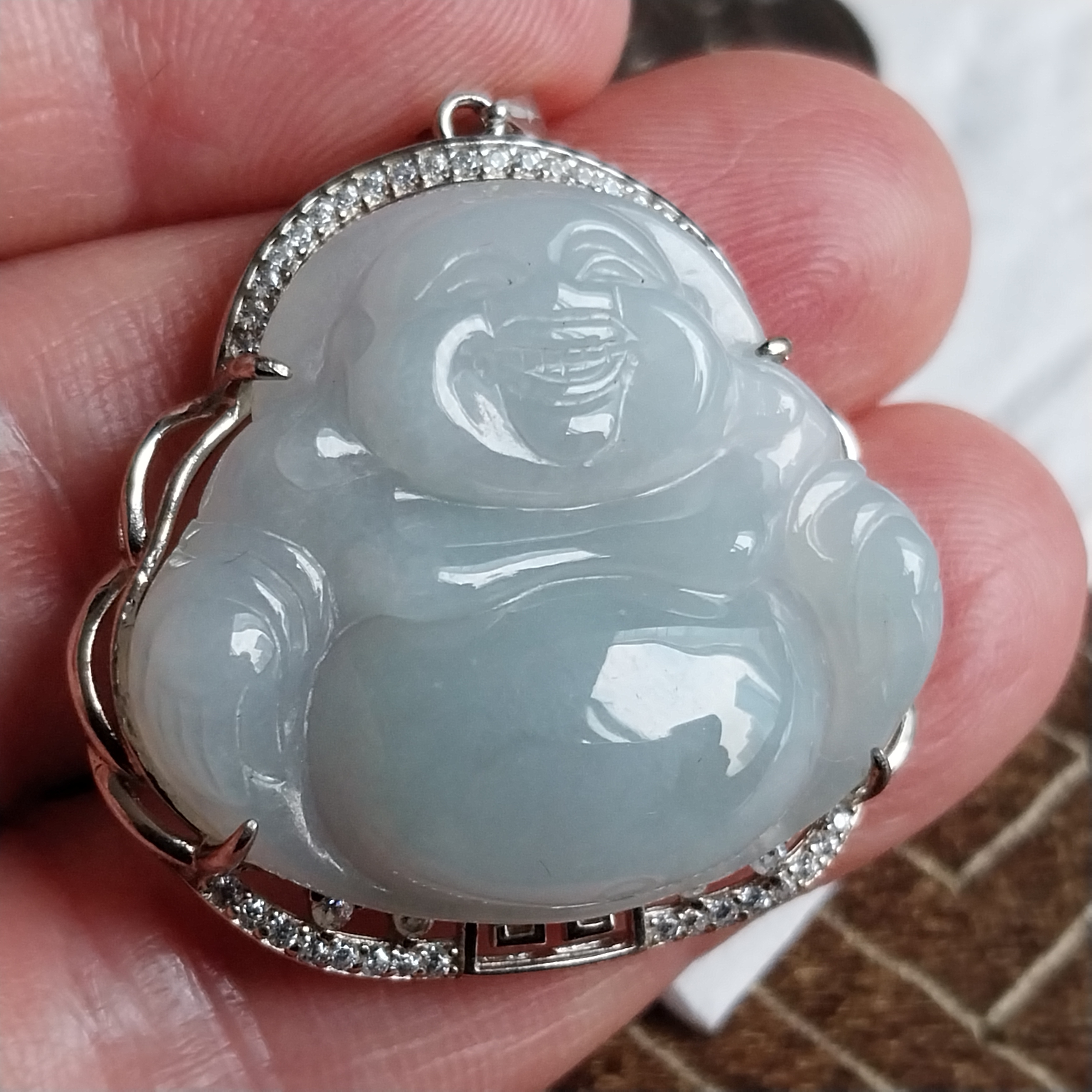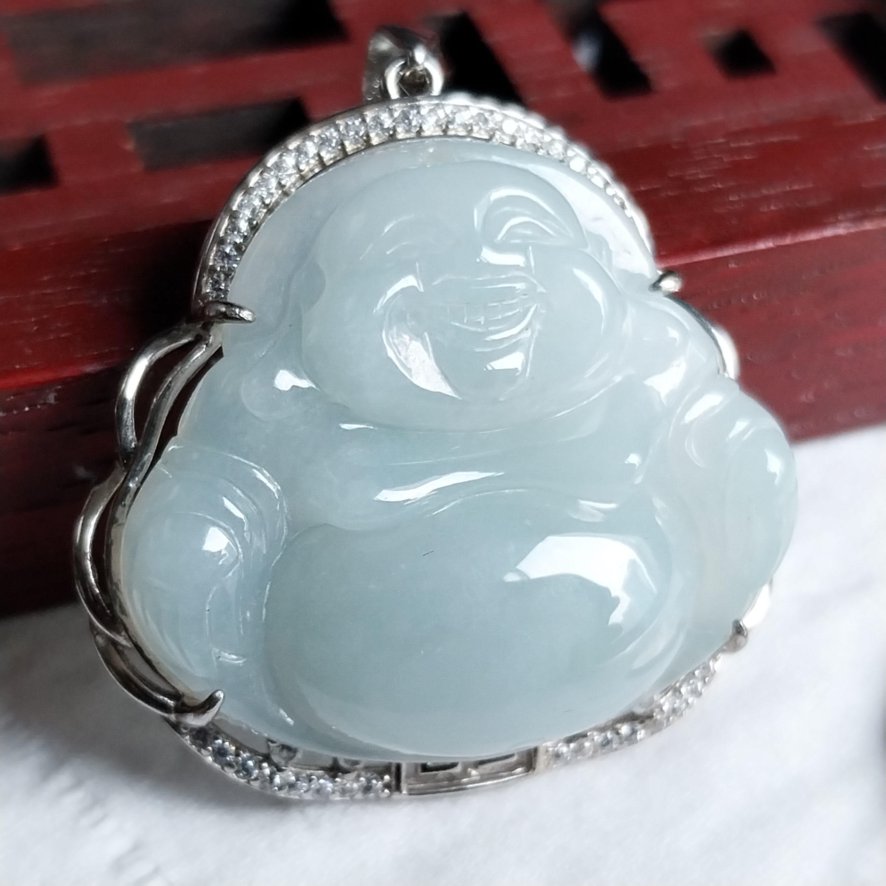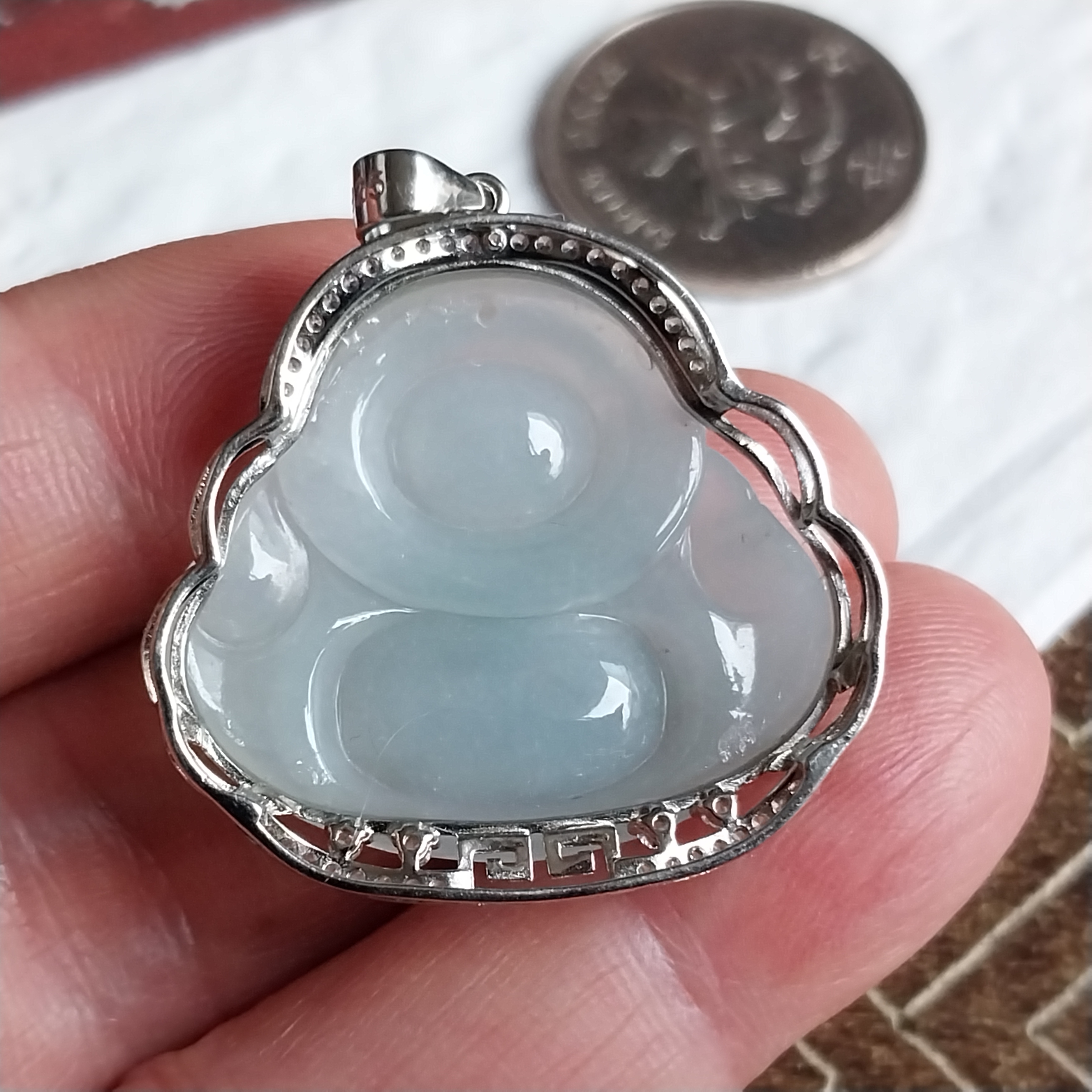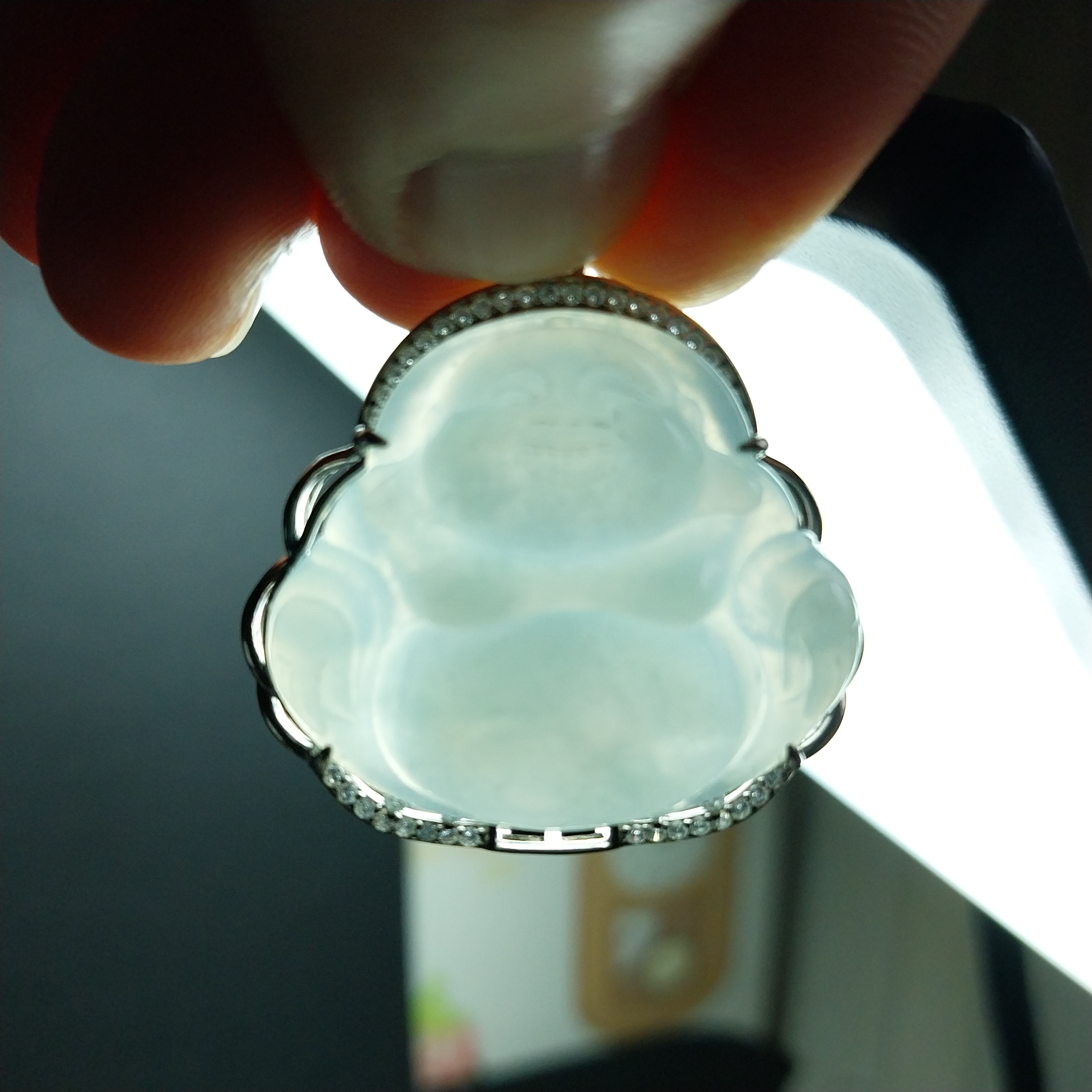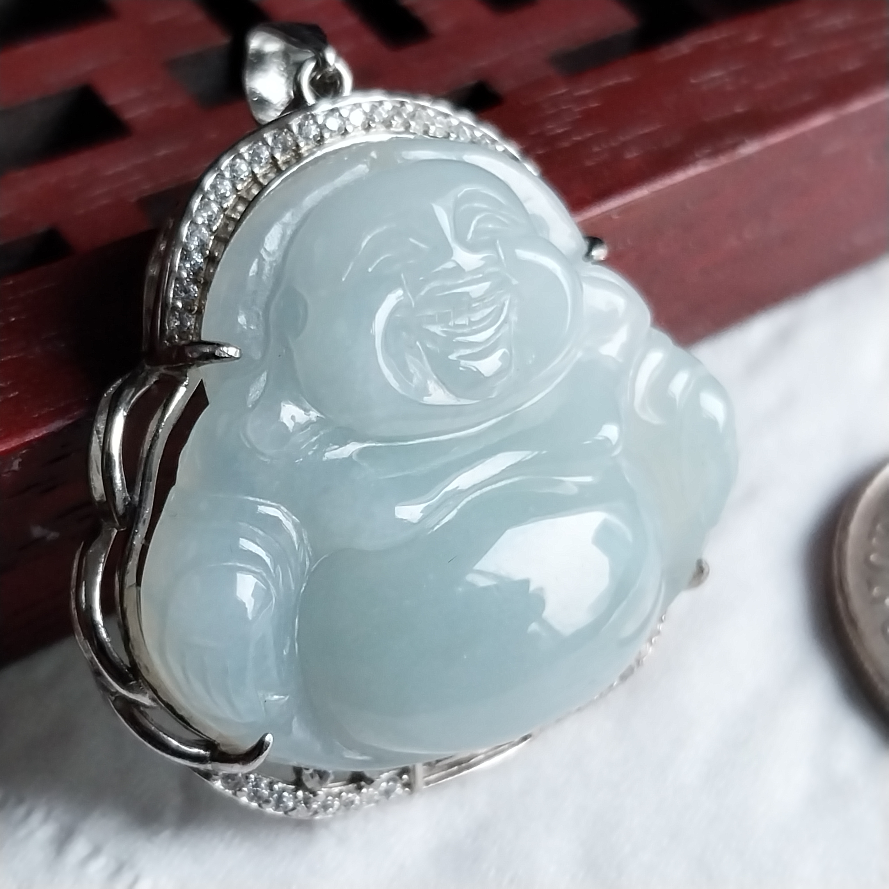 • 翡翠冰白銀鑲笑佛,天然翡翠A玉, 緬甸玉, Jade, Jadeite