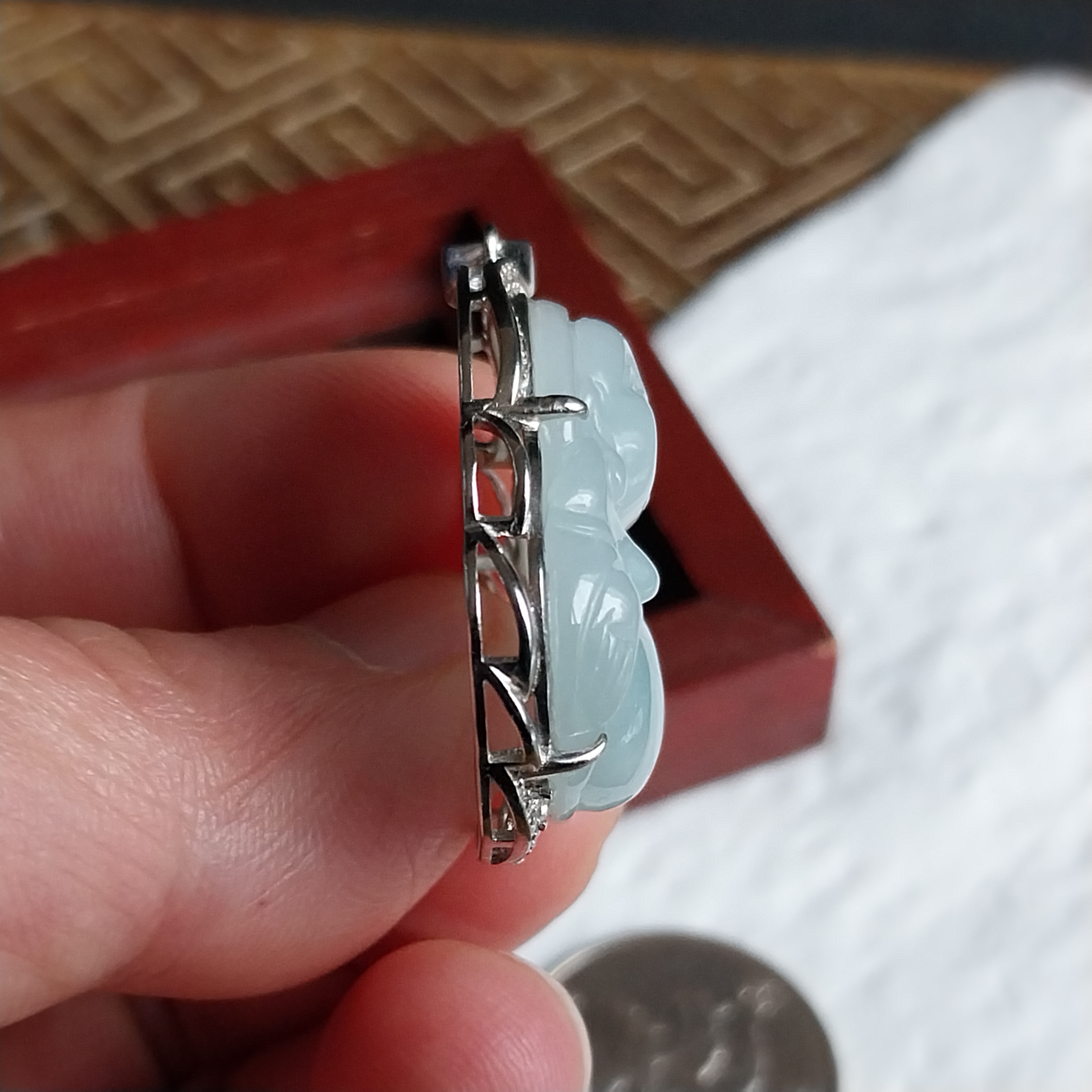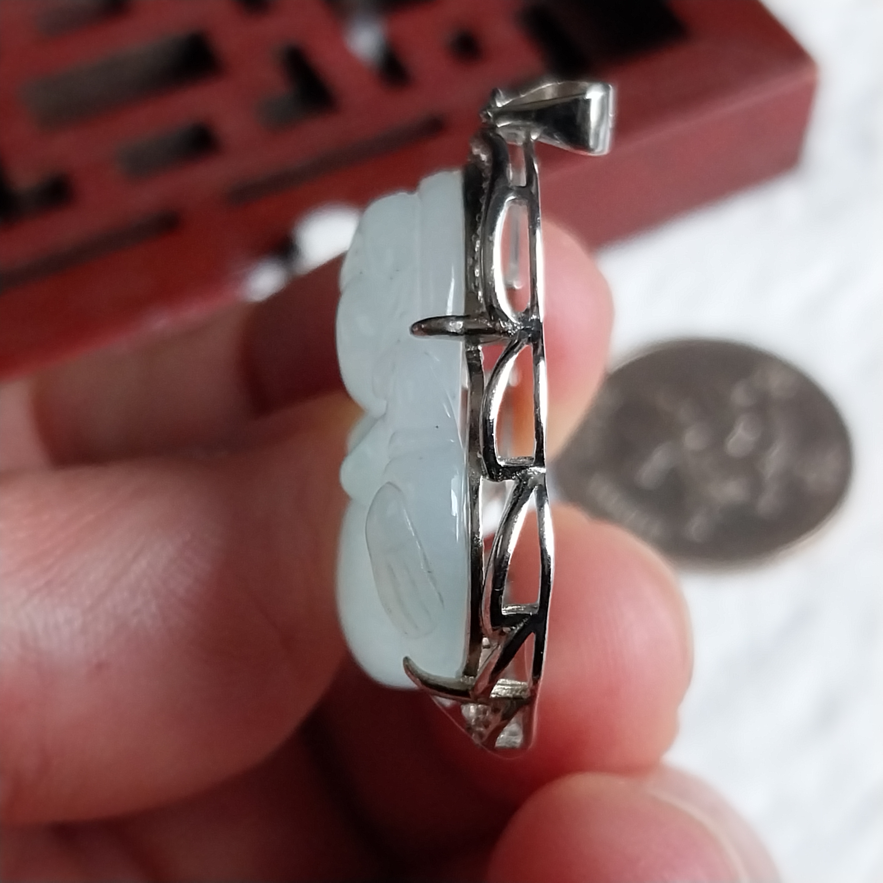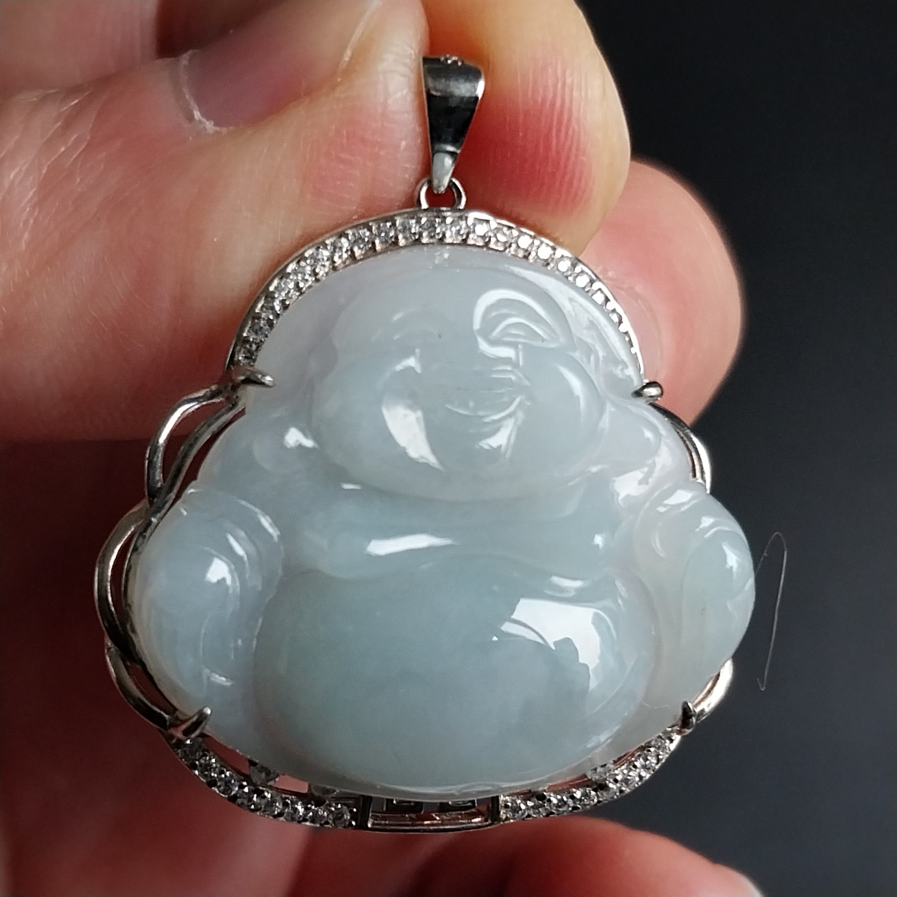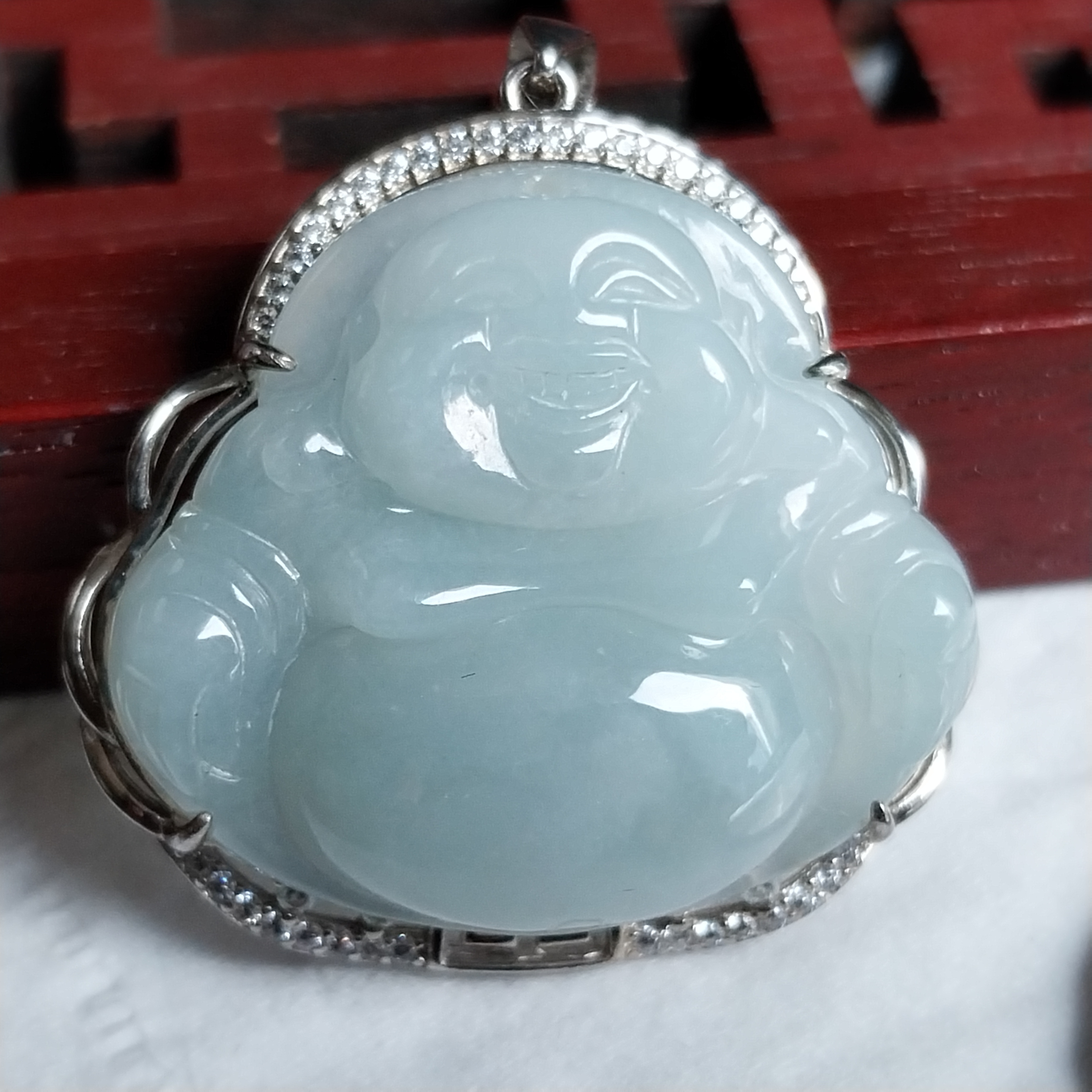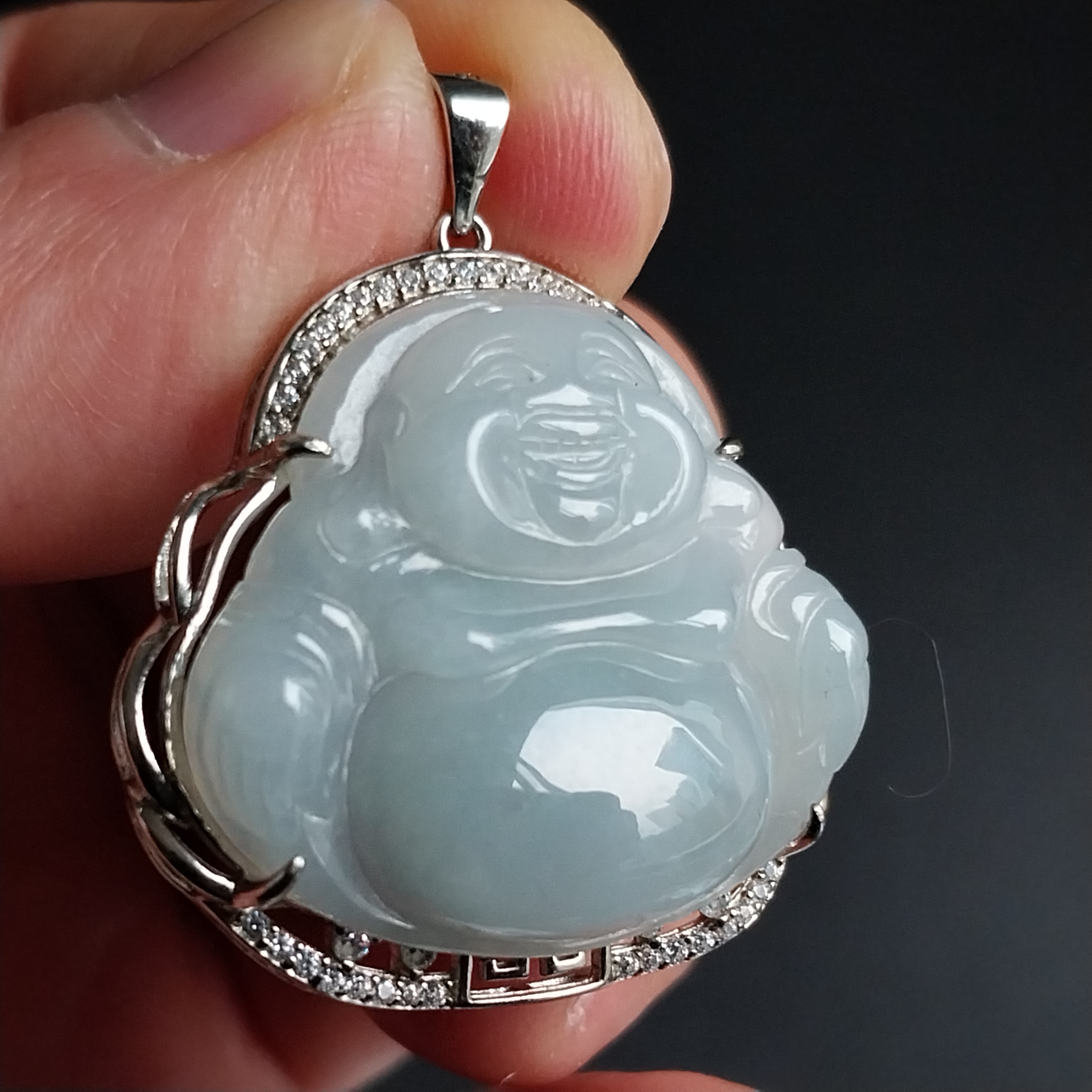 • 翡翠冰白銀鑲笑佛,天然翡翠A玉, 緬甸玉, Jade, Jadeite
