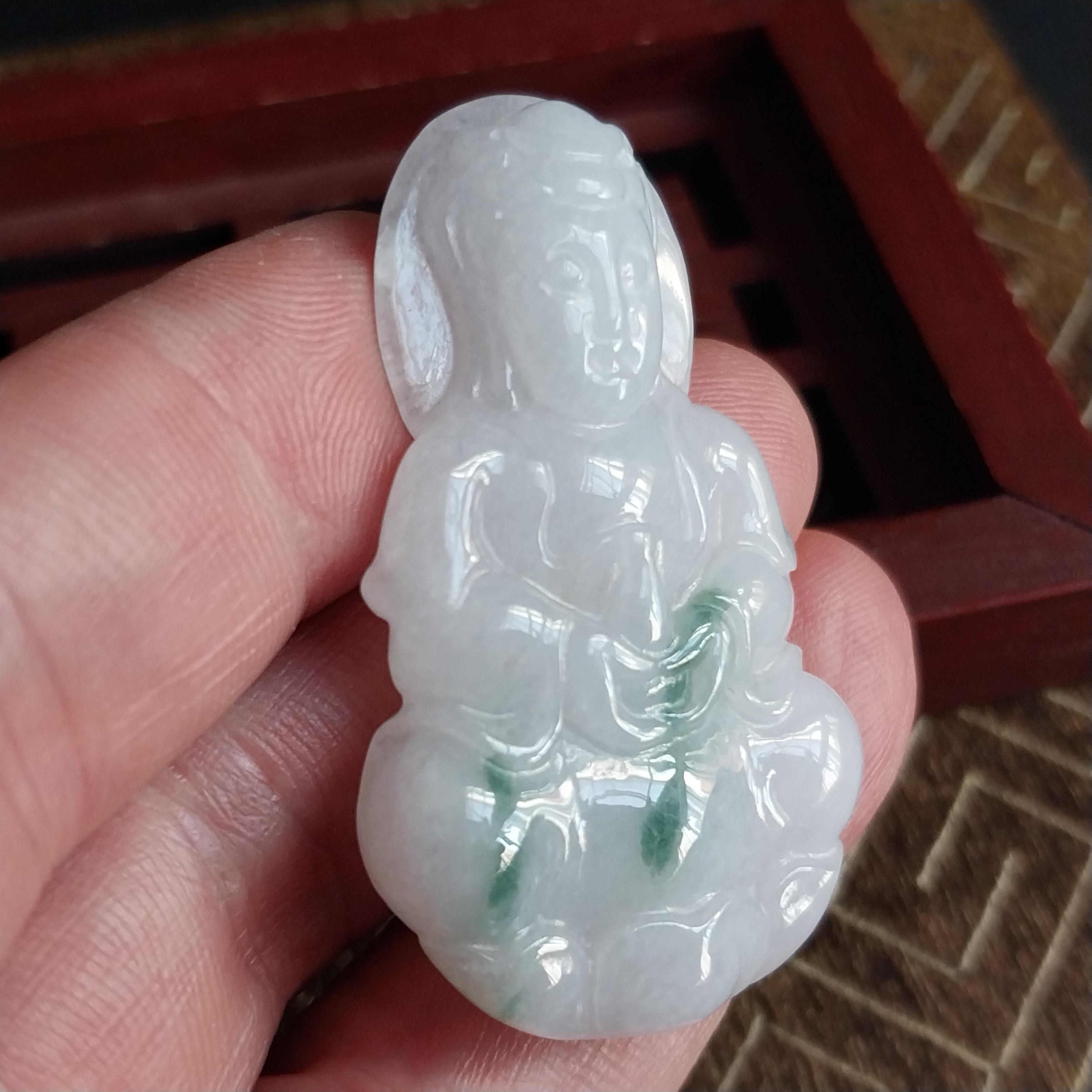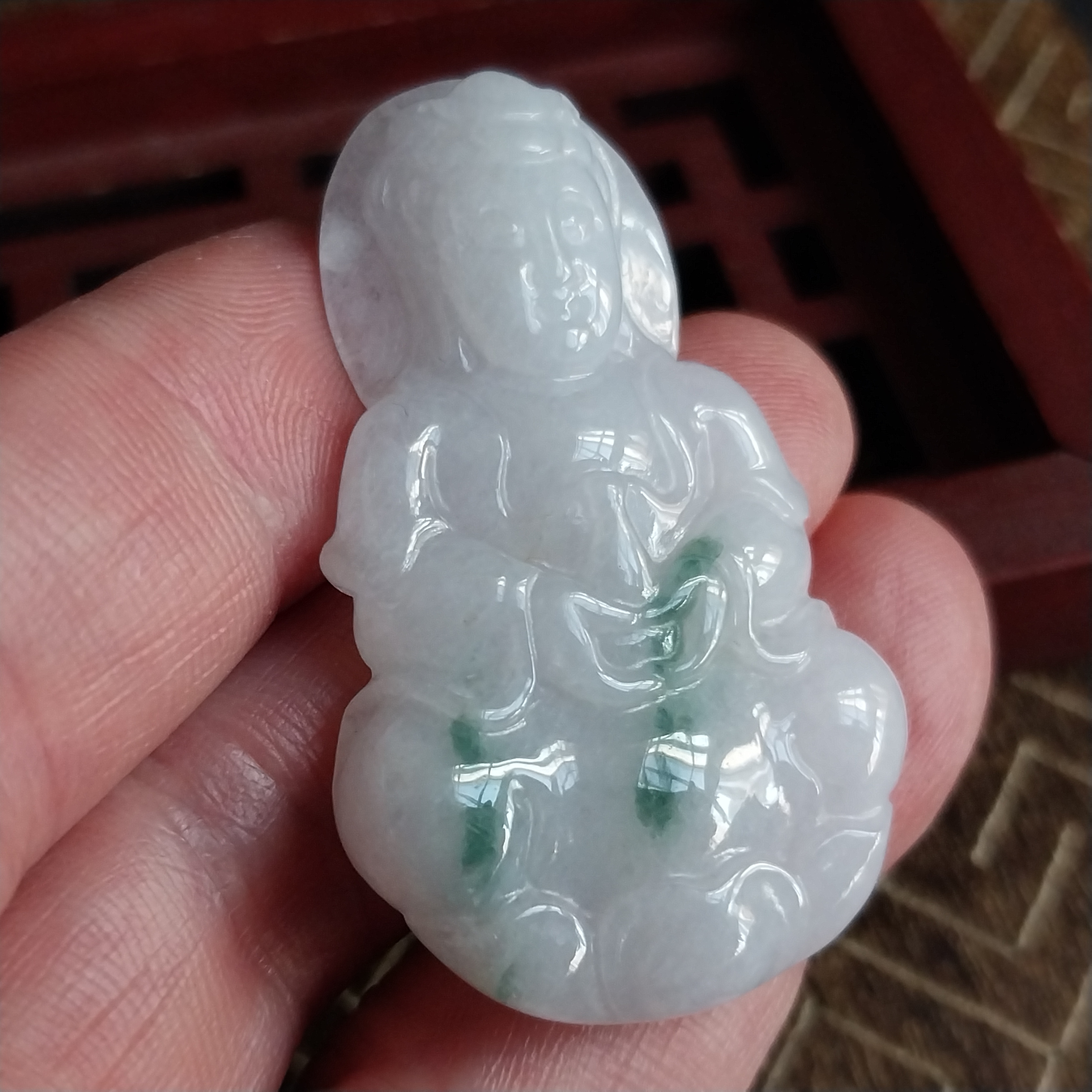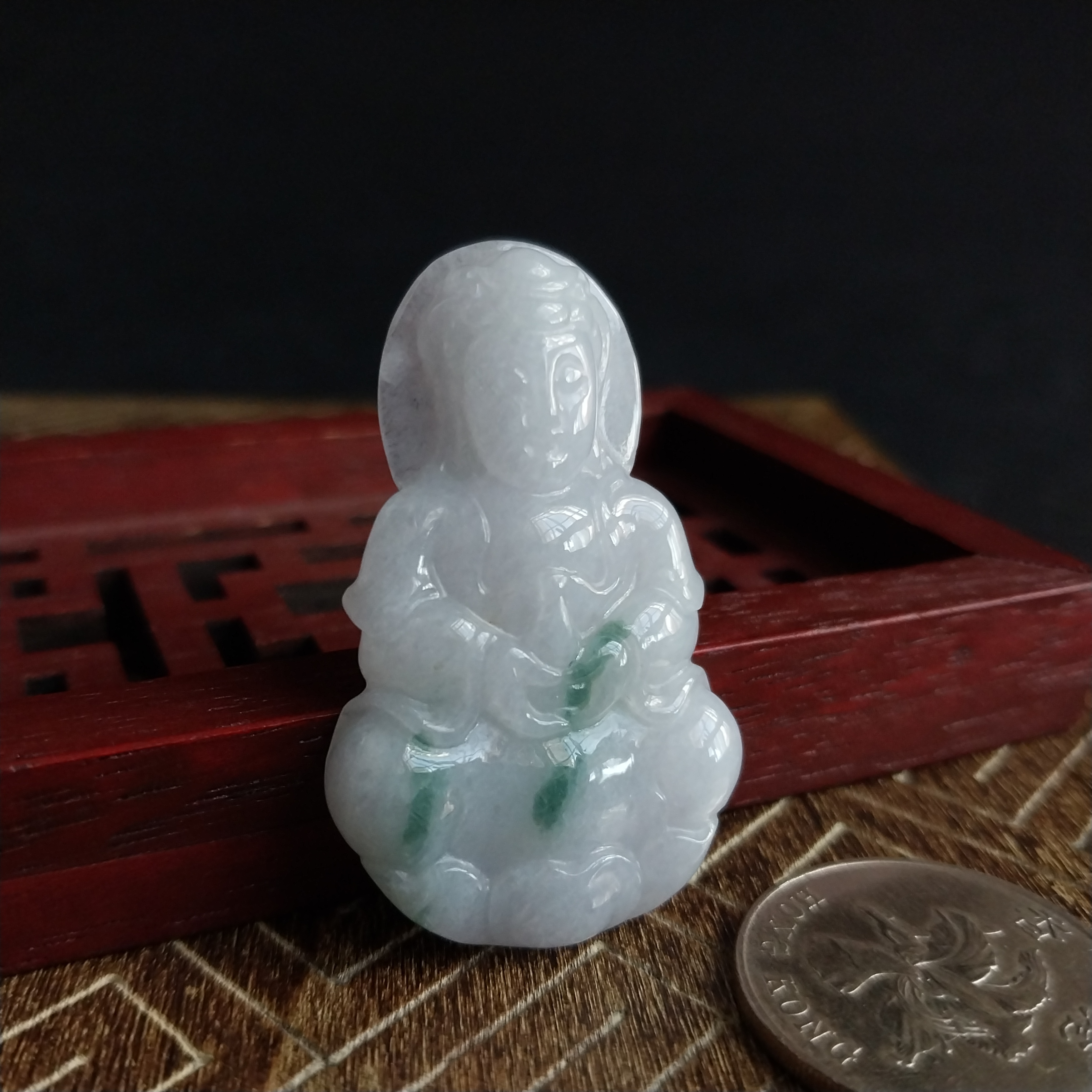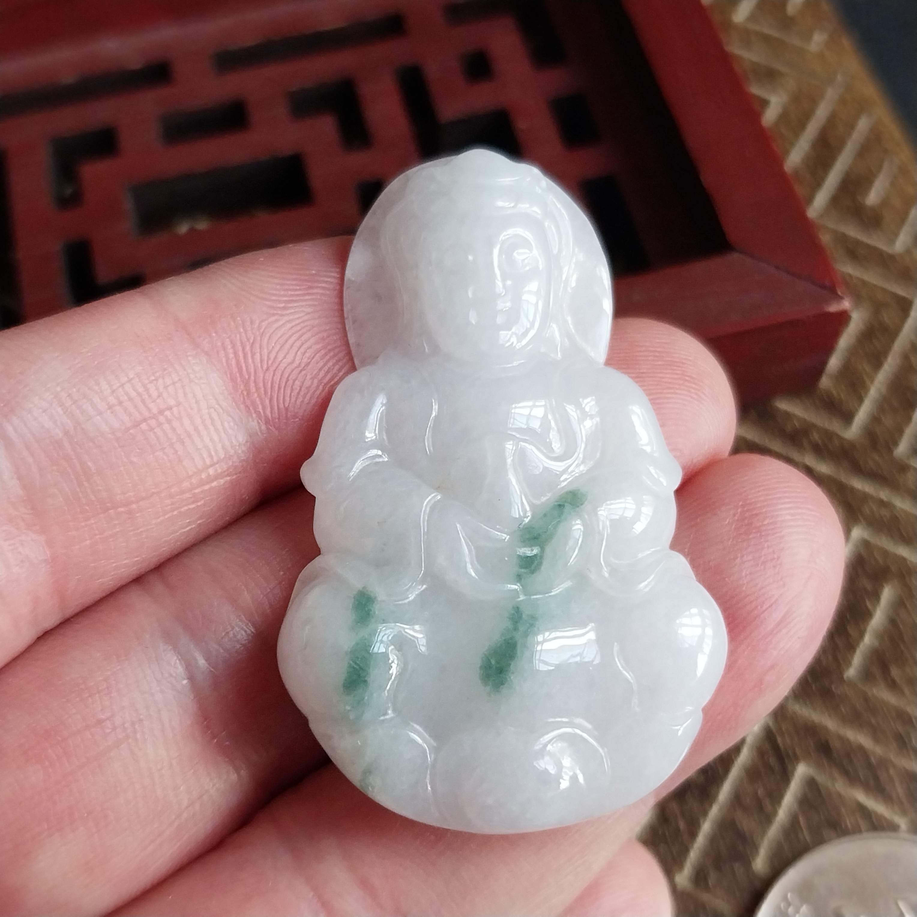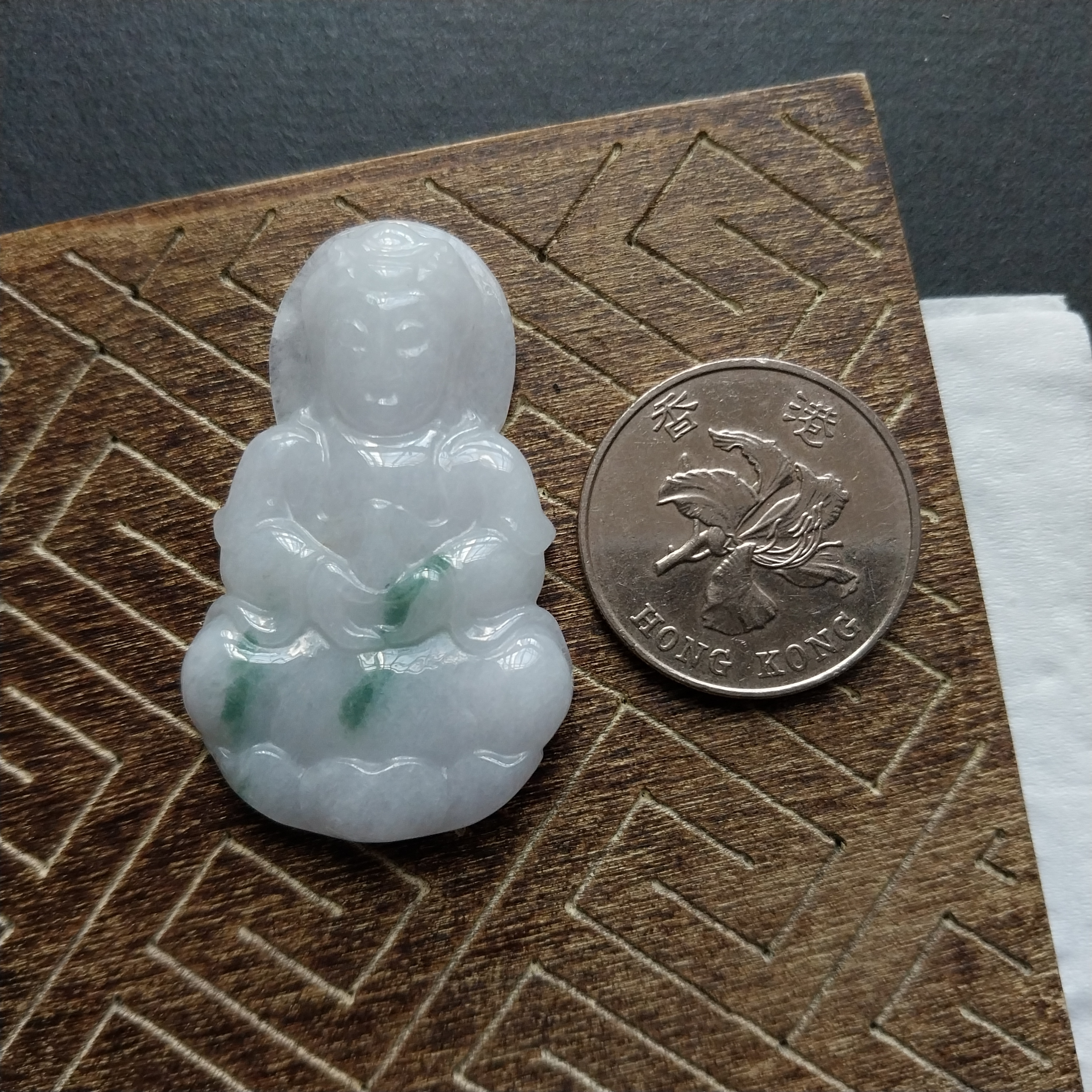 • 冰白飄綠坐蓮觀音吊墜,天然翡翠A玉, 緬甸玉, Jade, Jadeite