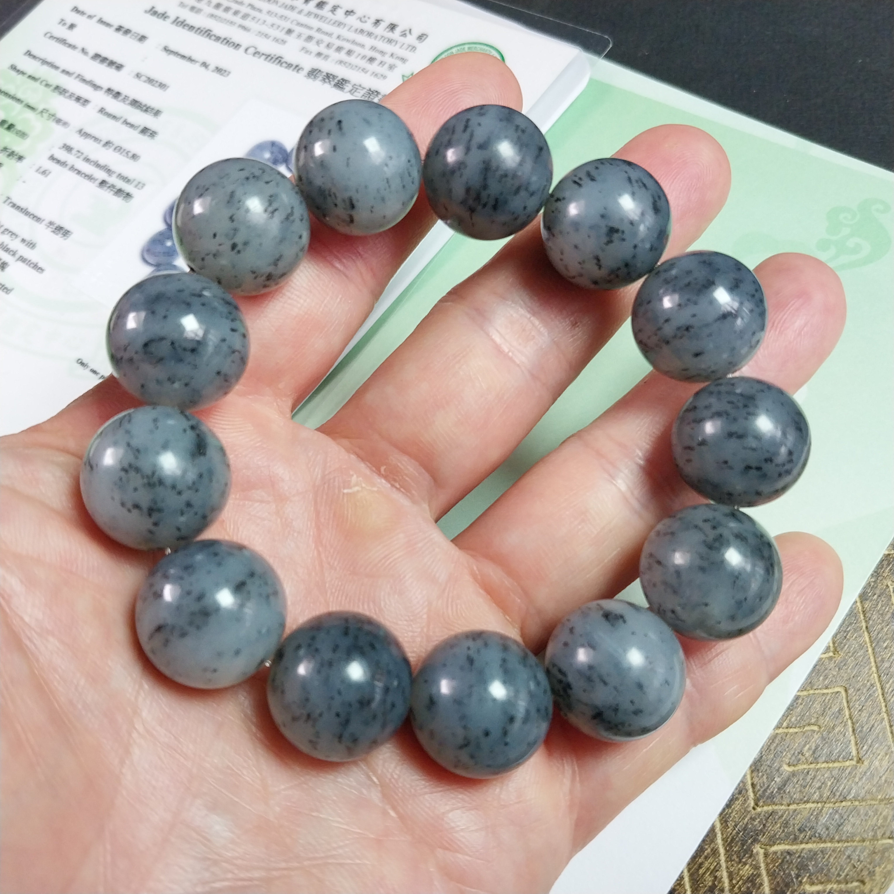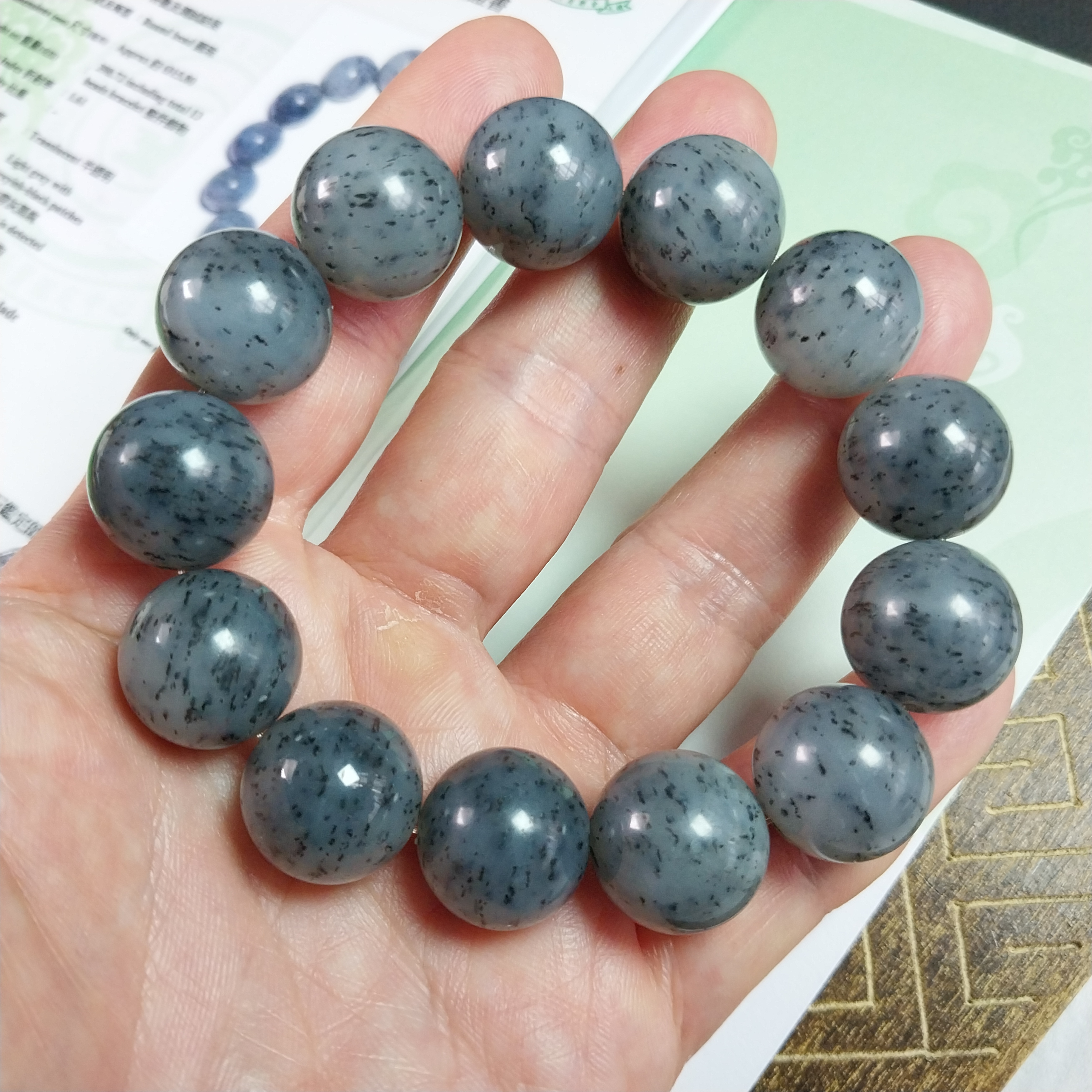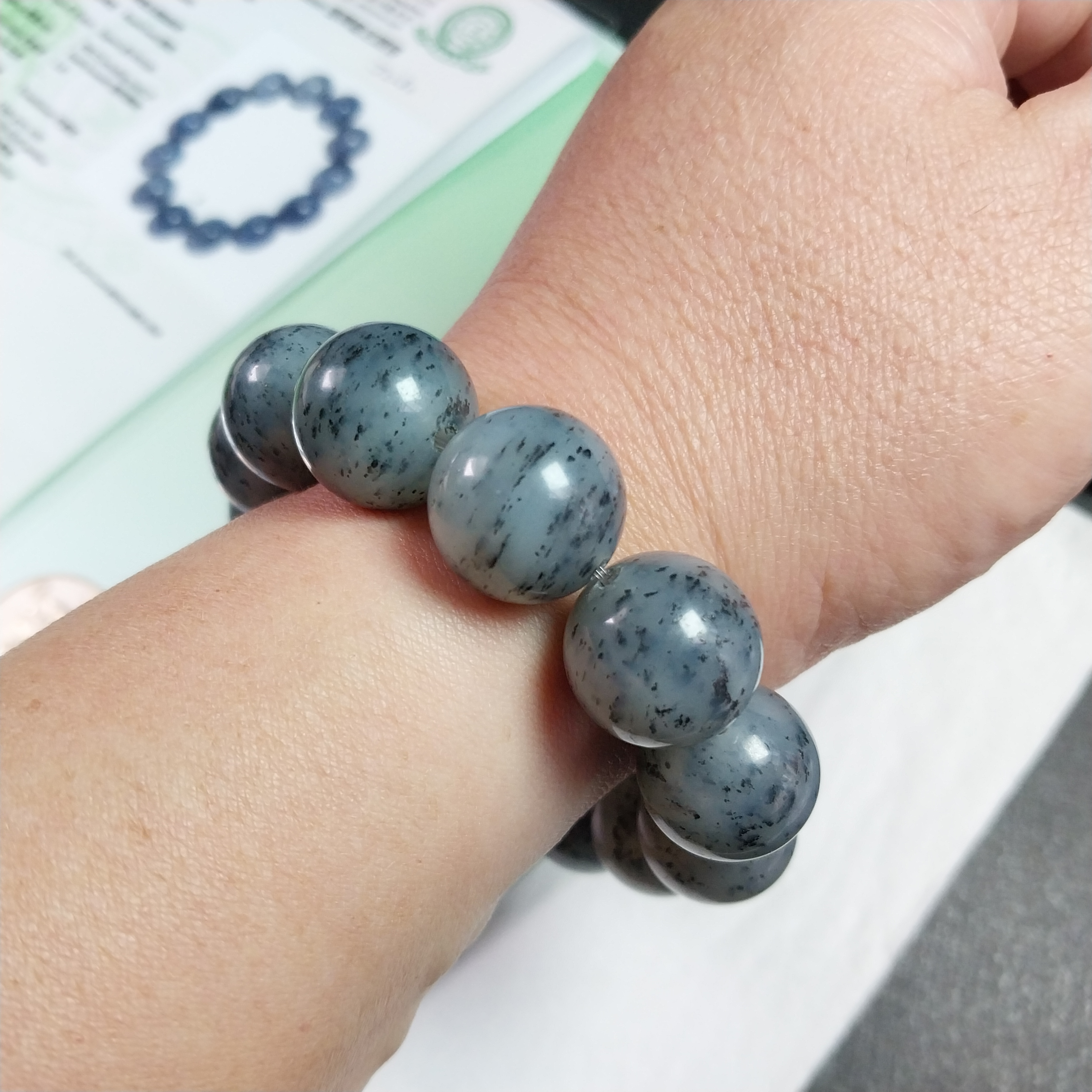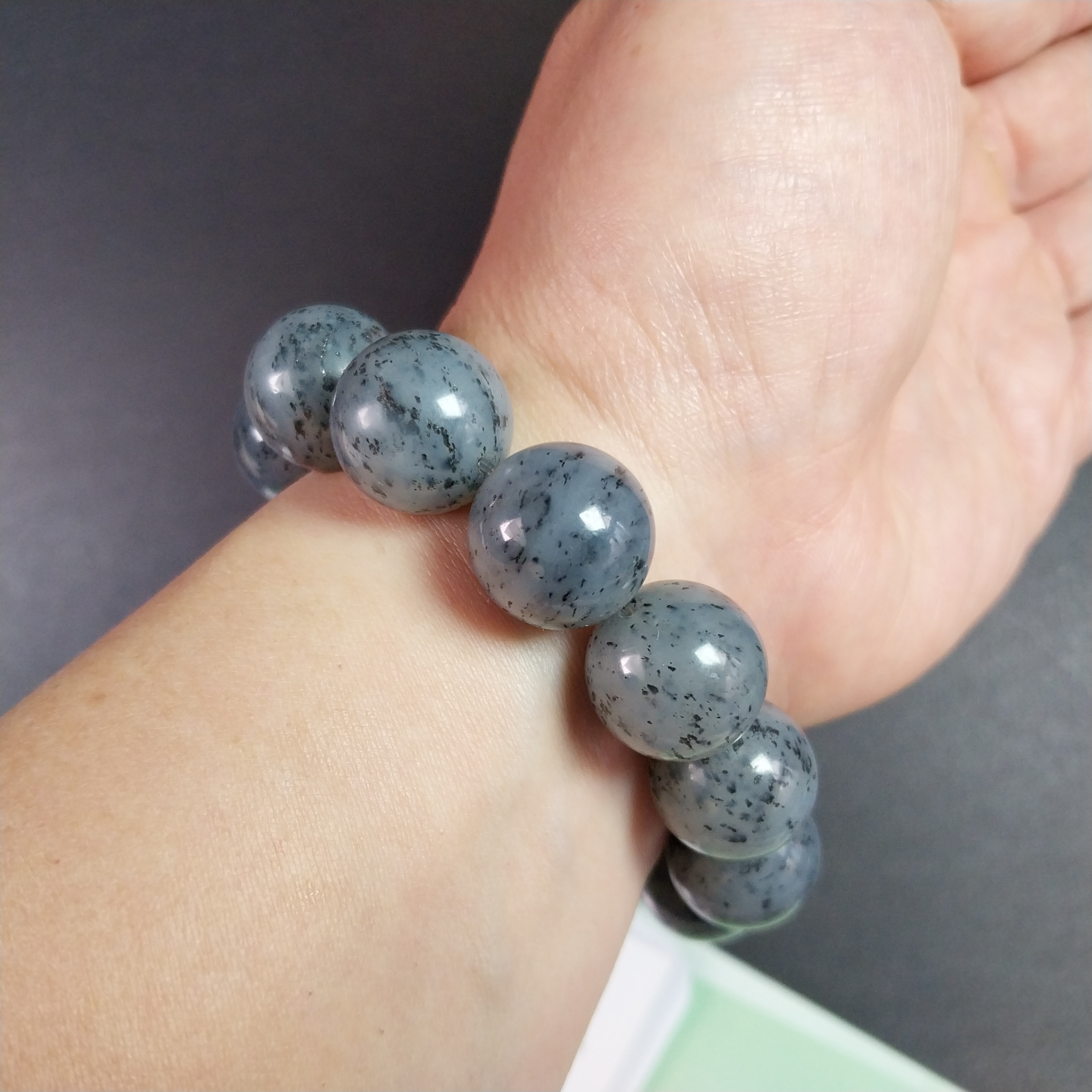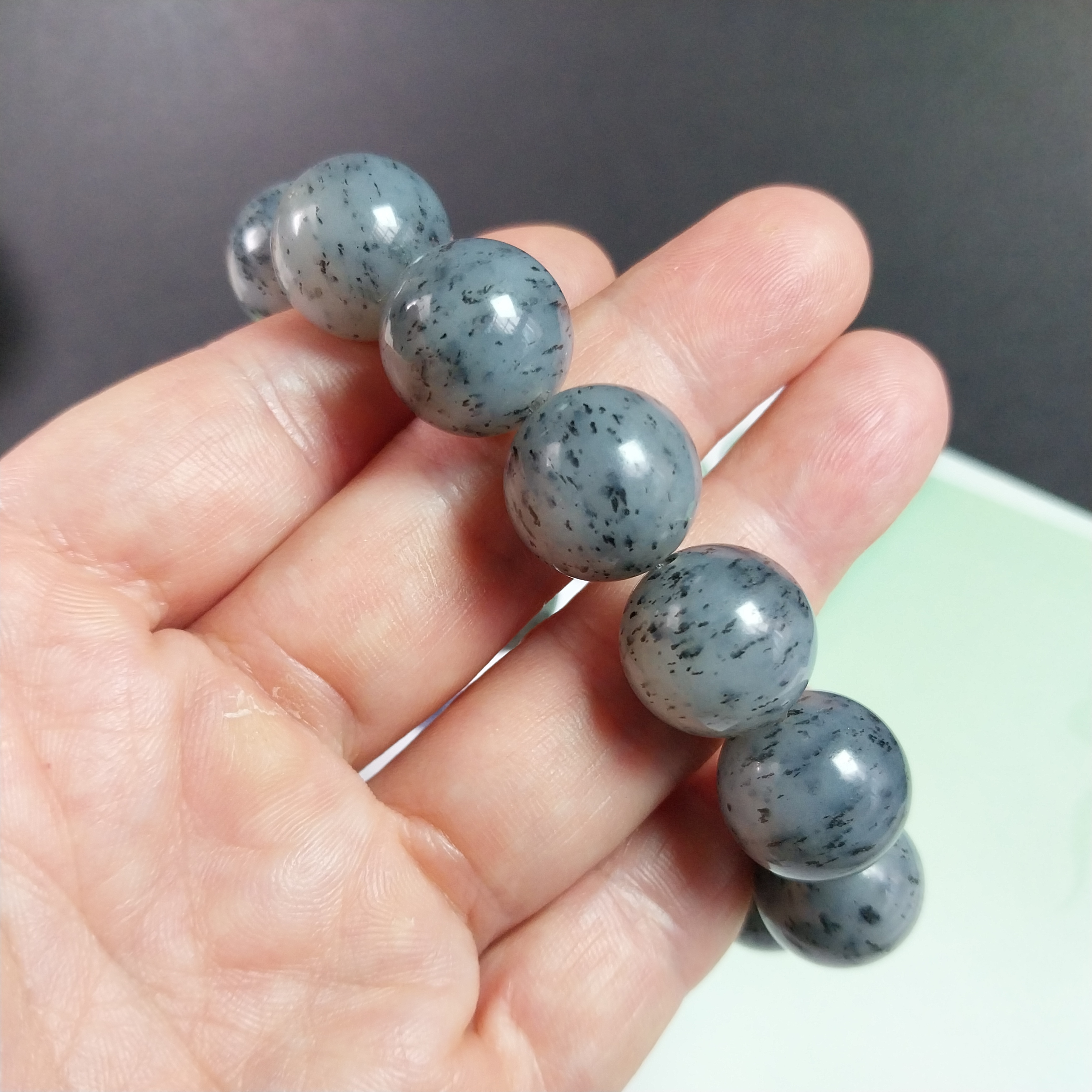 • 和田玉點墨青花手串 (16mm直徑),天然和田玉軟玉