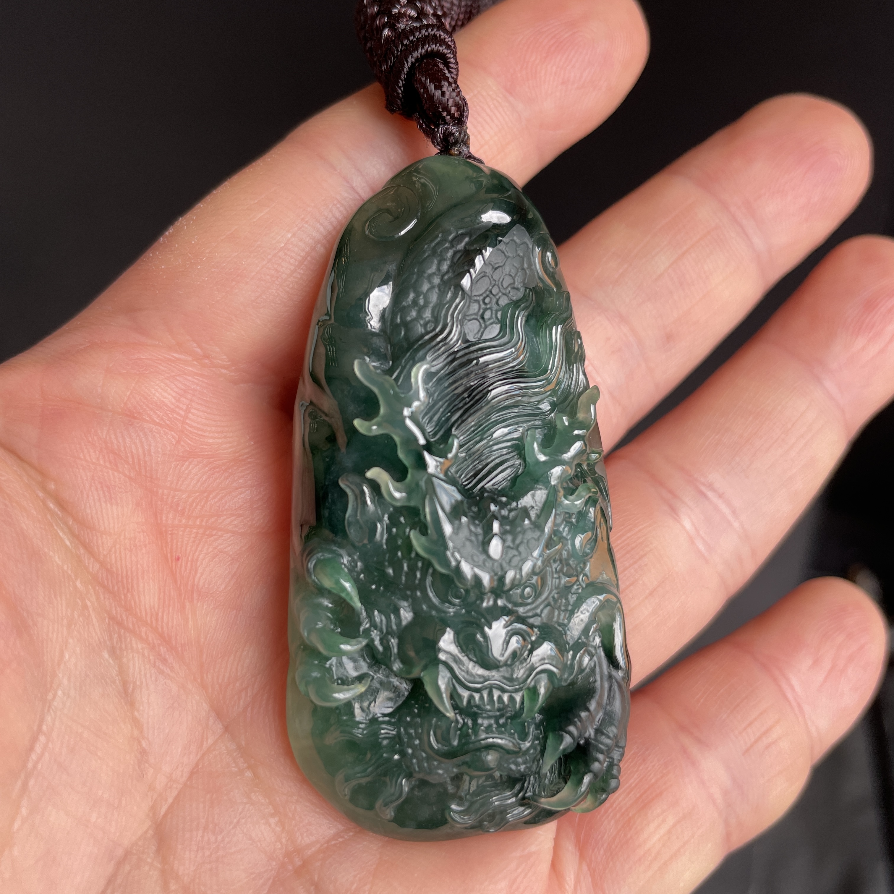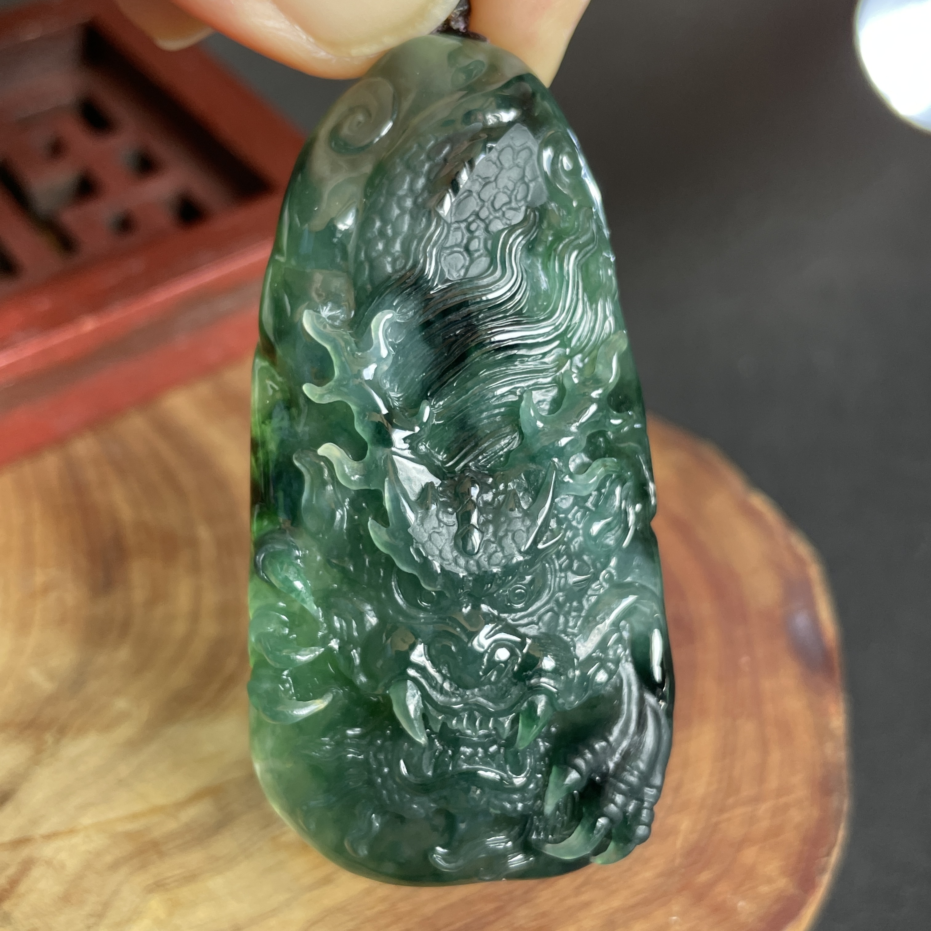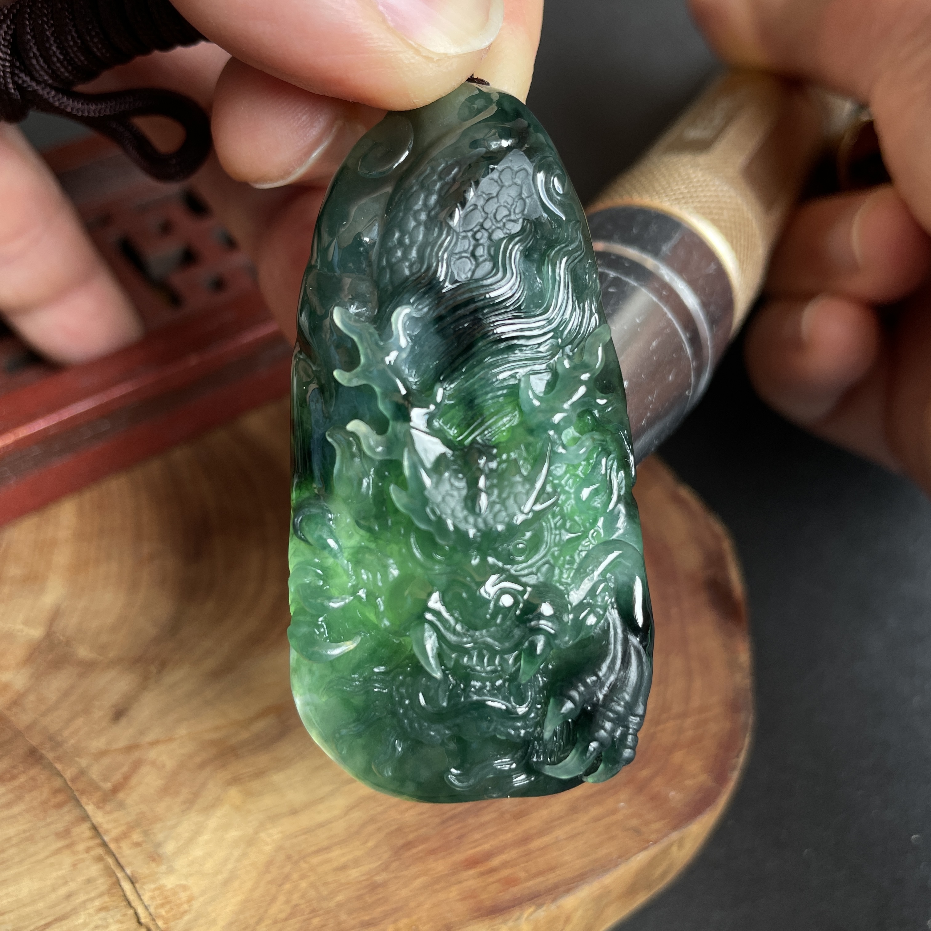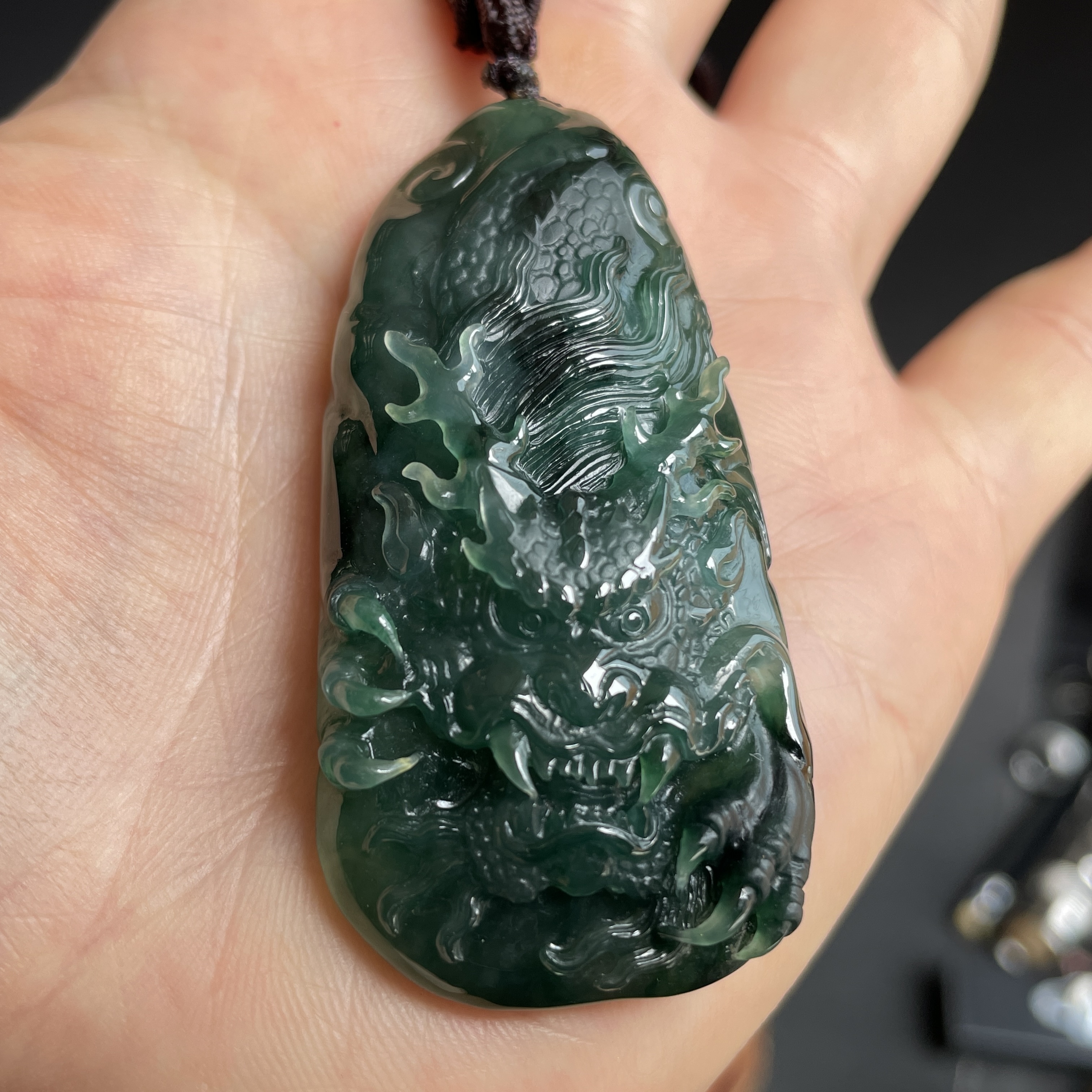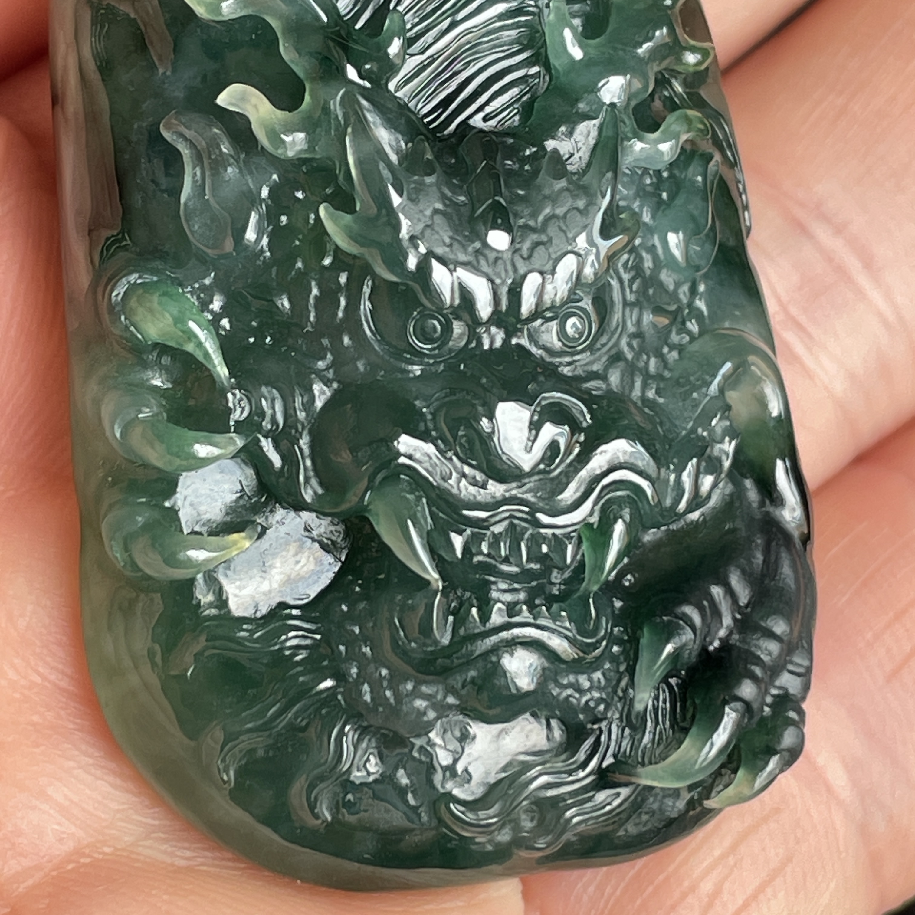 緬料莫西沙老藍水料,這料師傅收了多年,最近才拿來做貨。懂玉的老手都知道,莫西沙老藍水現在已不常見了,這種料拋光後起光起膠感。大師雕工,龍造型兇猛,完美。收藏價值高!