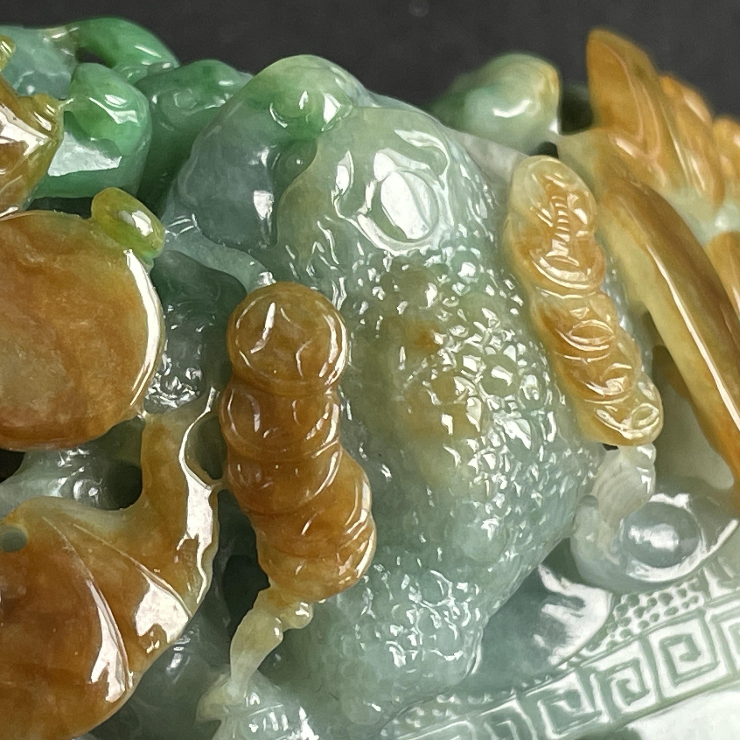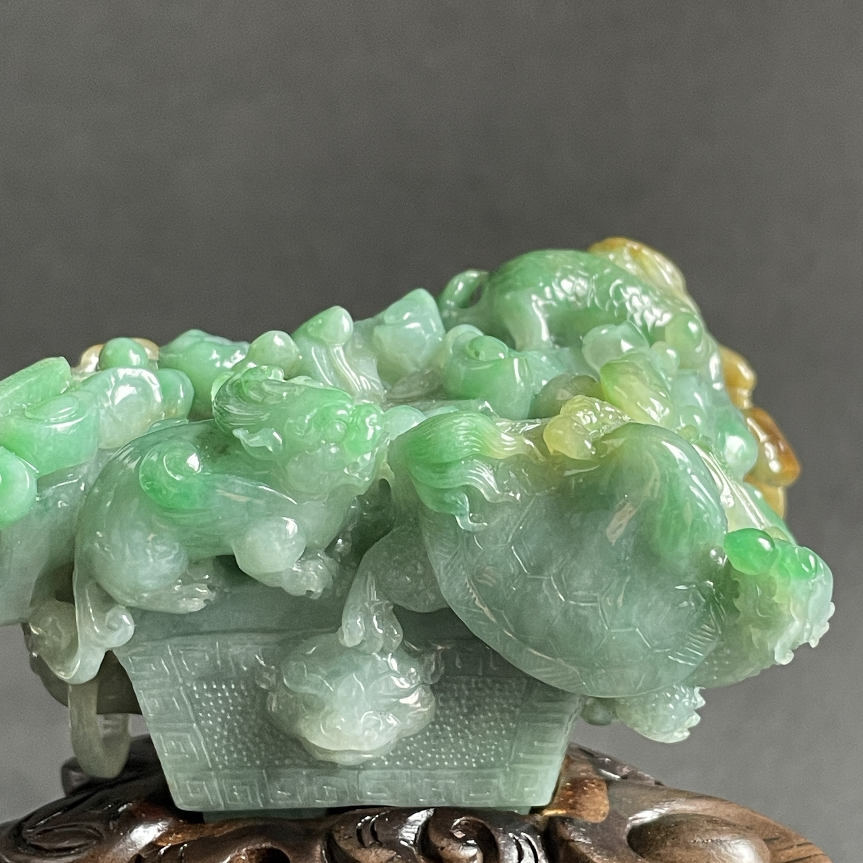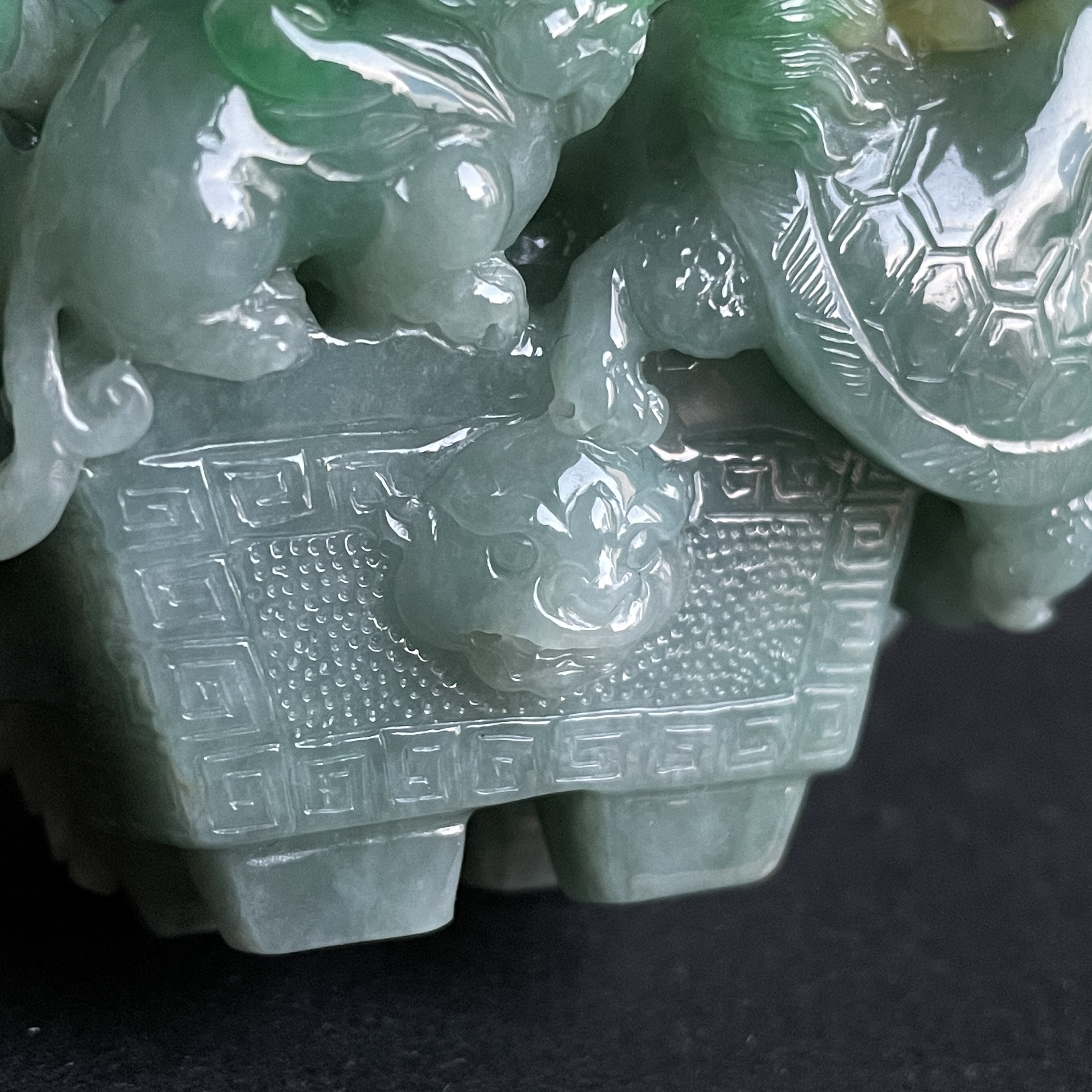 三彩料,鼎上刻有蝙蝠、麒麟、金蟾、貔貅、龍龜,有招財、聚寶、納福之寓意。大師作品,雕工仔細,完美無紋裂。附帶底座。