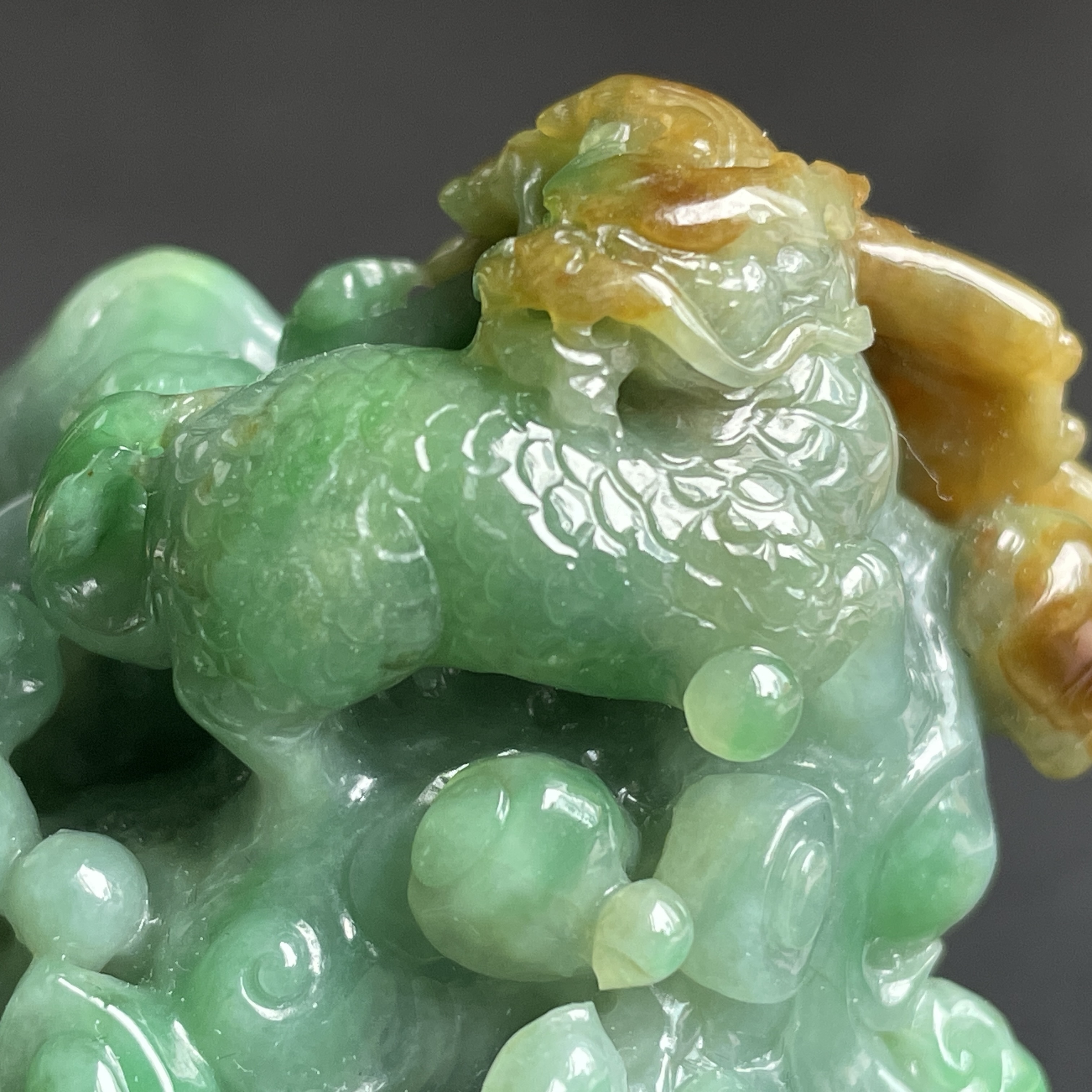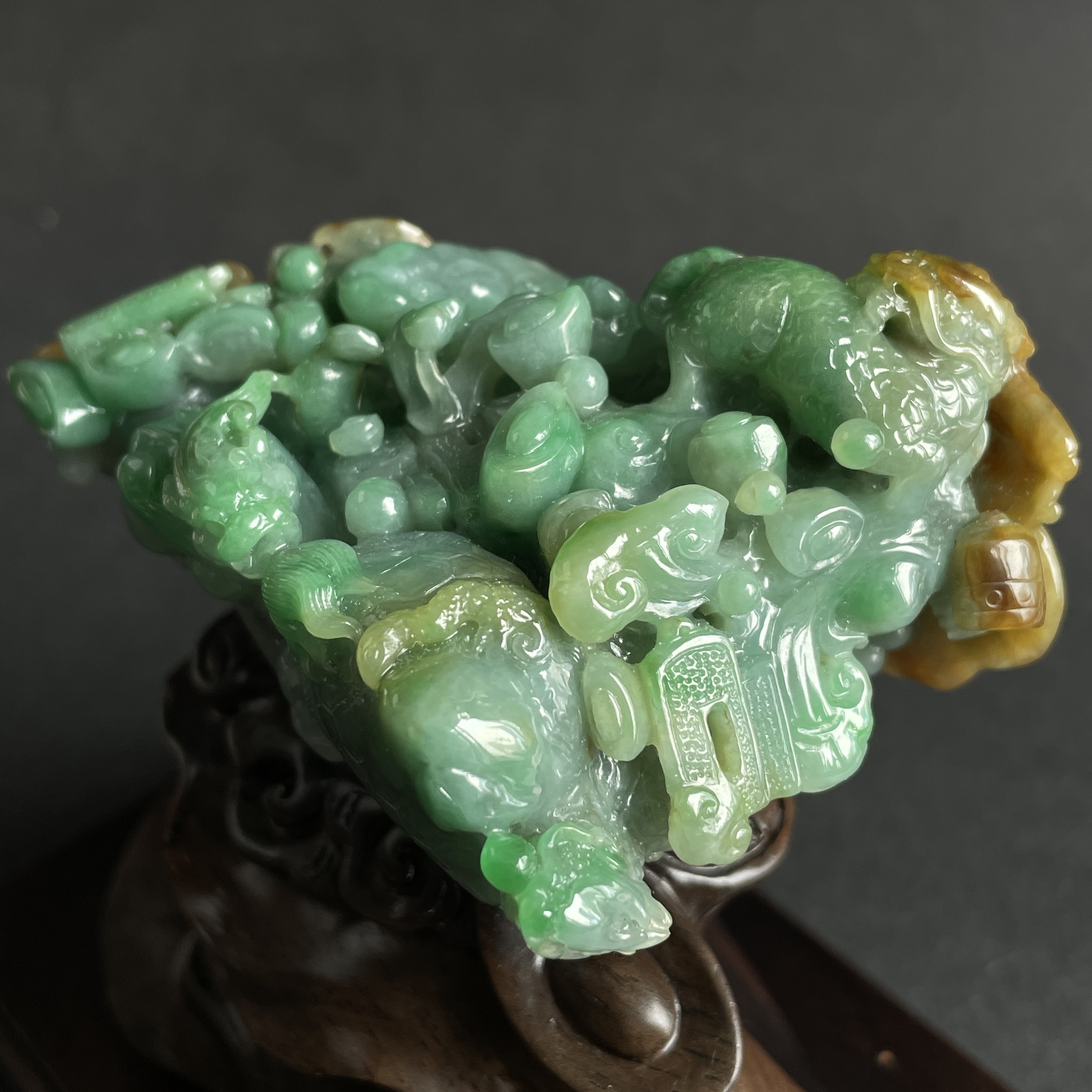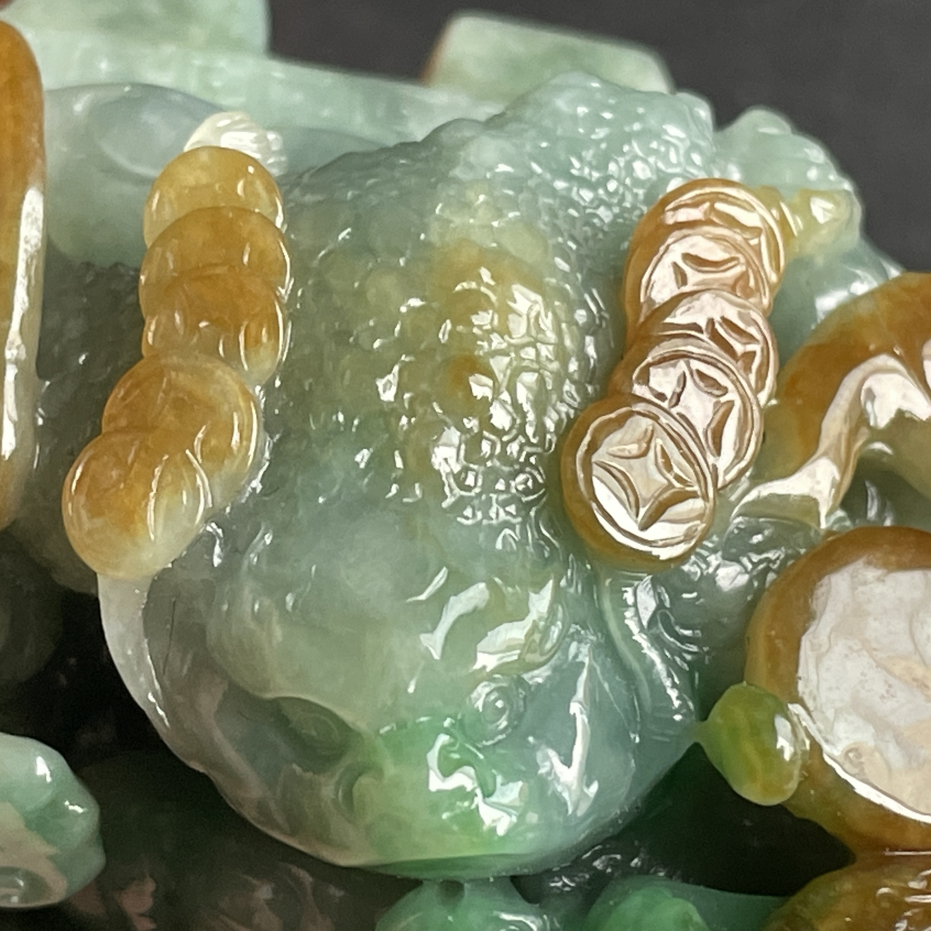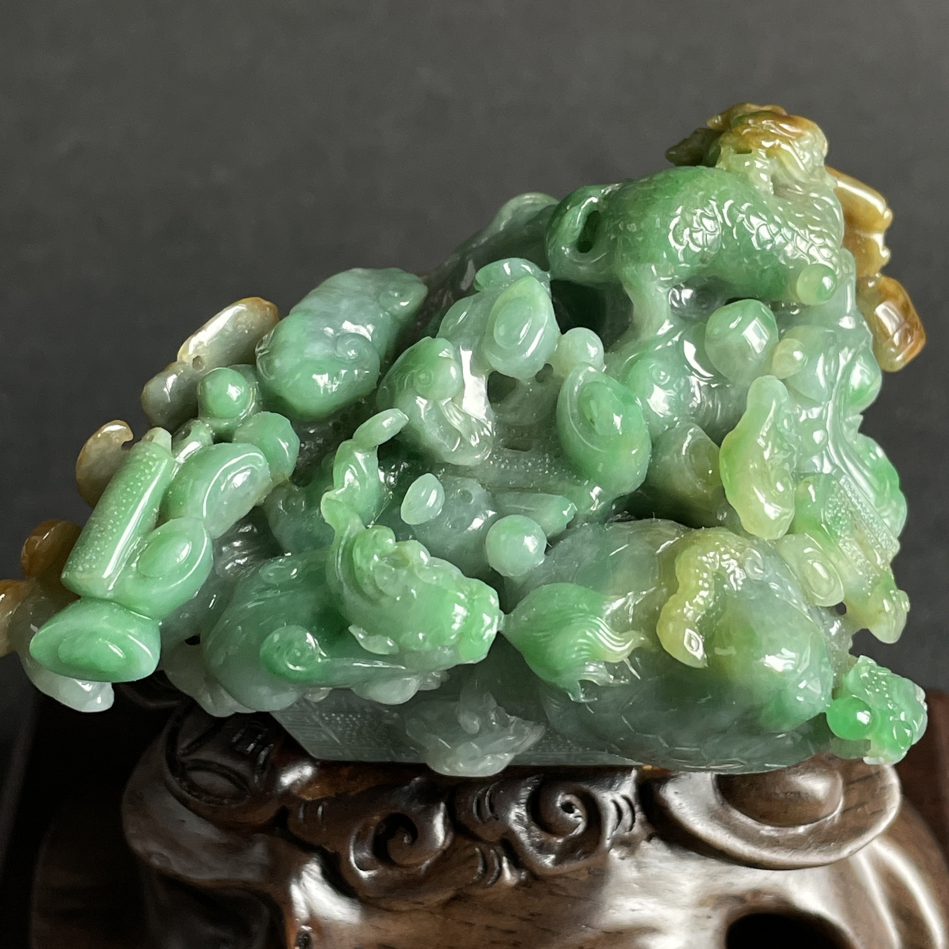 三彩料,鼎上刻有蝙蝠、麒麟、金蟾、貔貅、龍龜,有招財、聚寶、納福之寓意。大師作品,雕工仔細,完美無紋裂。附帶底座。