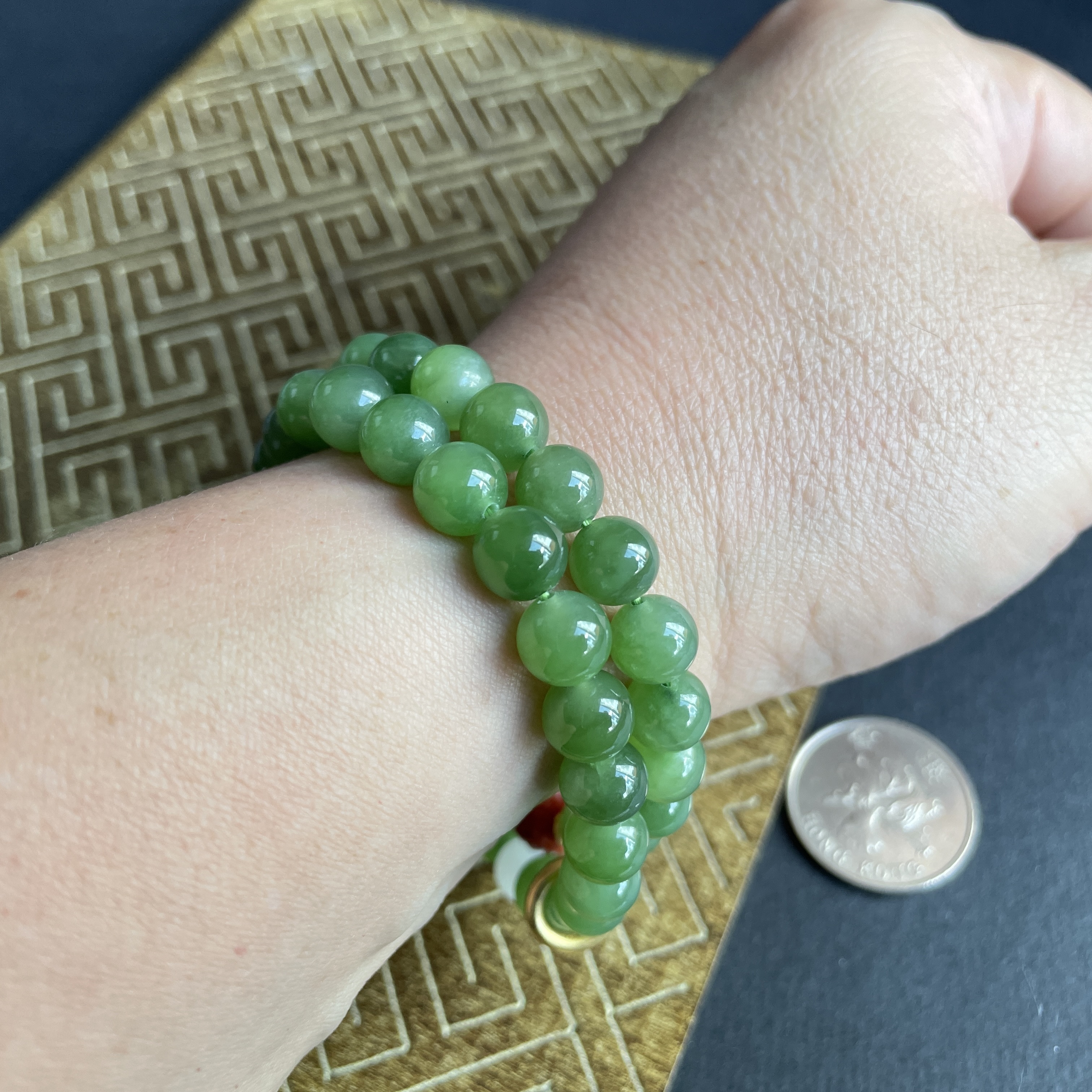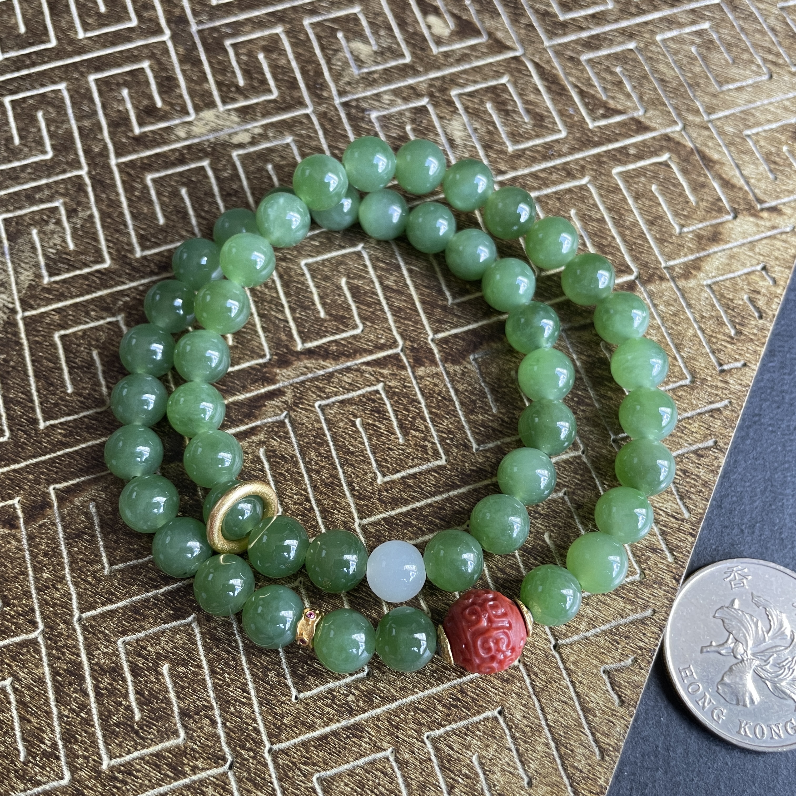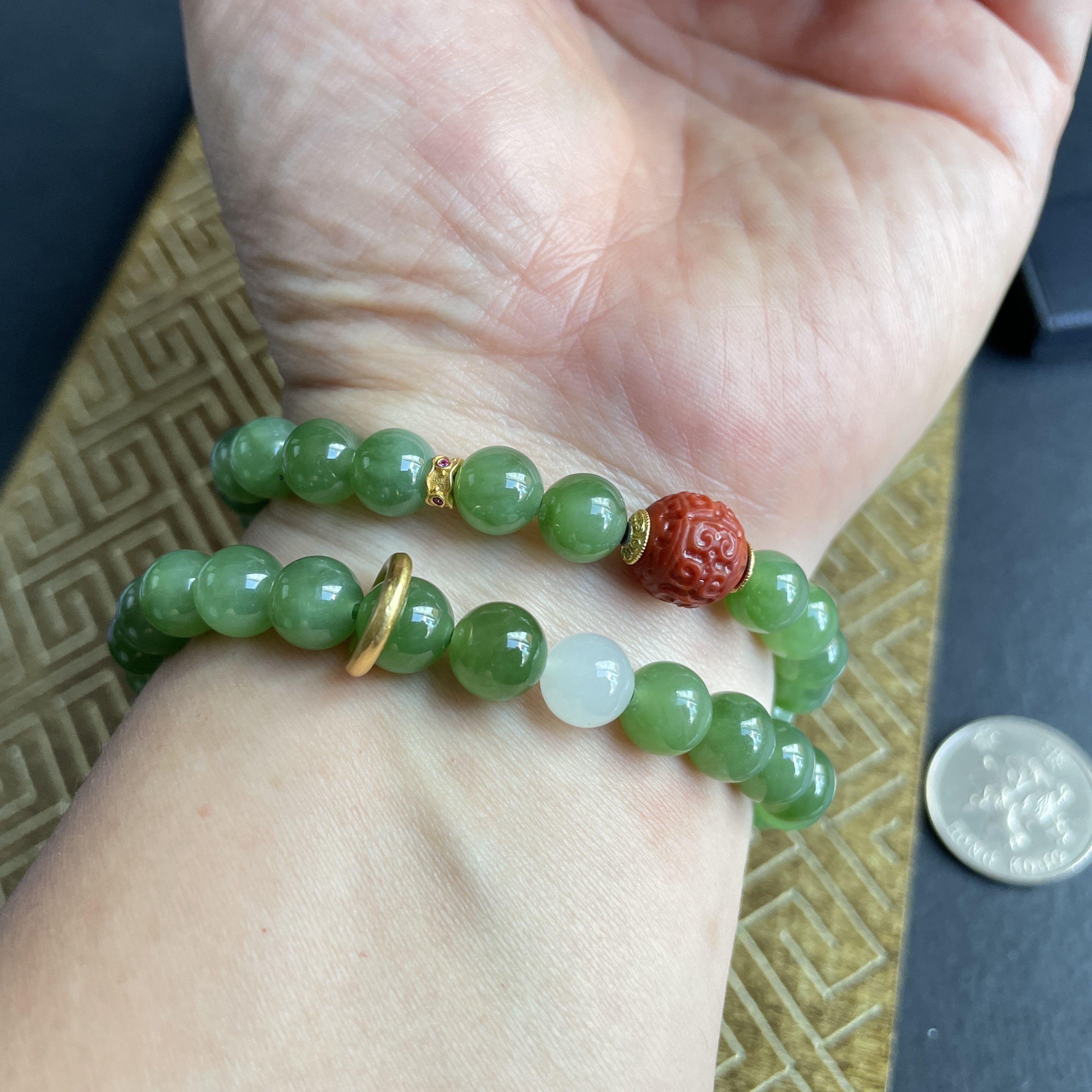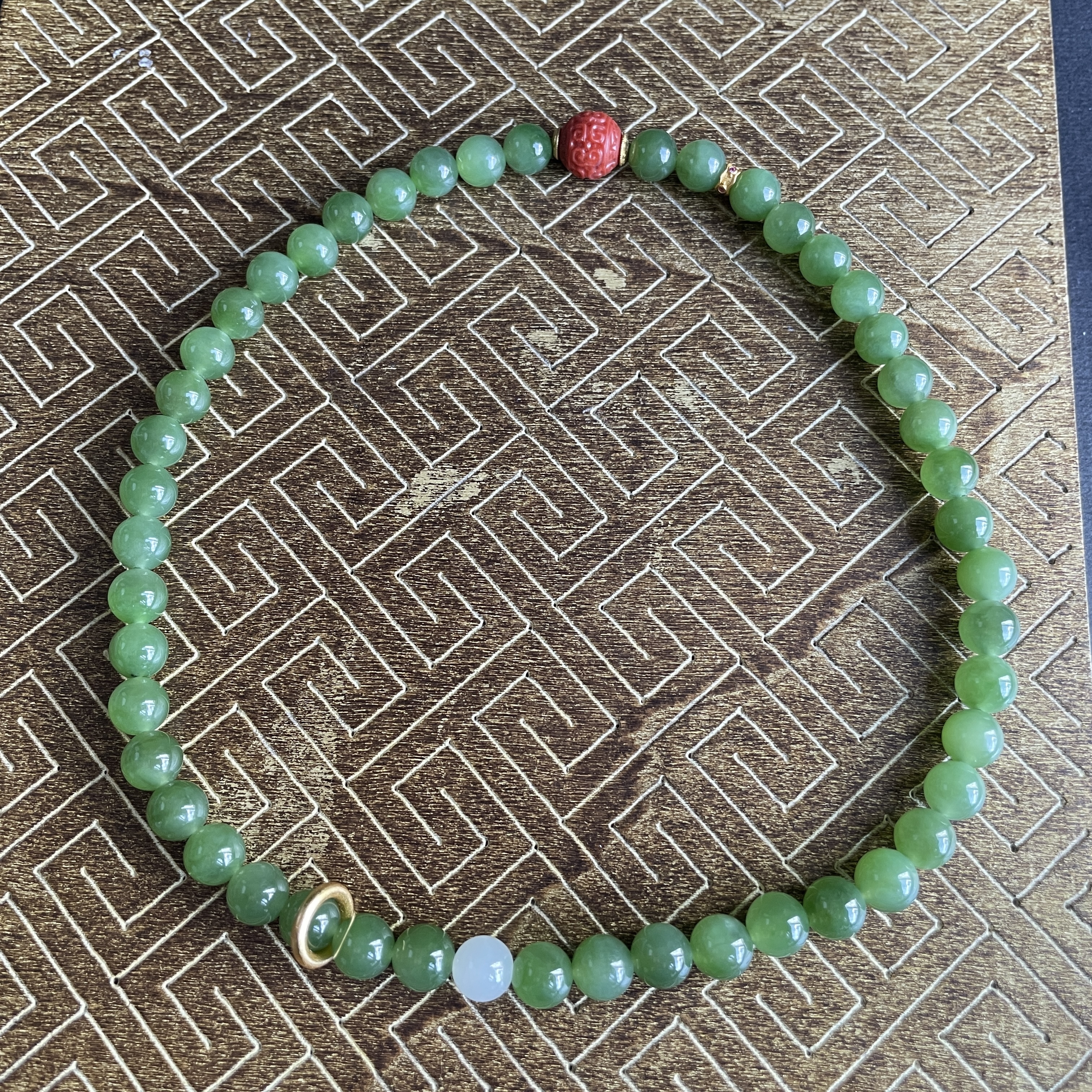 和田玉碧玉冰料,水潤,搭配南紅回紋珠、白玉、S925銀配件、彈性線,可做掛飾或雙圈手鏈。