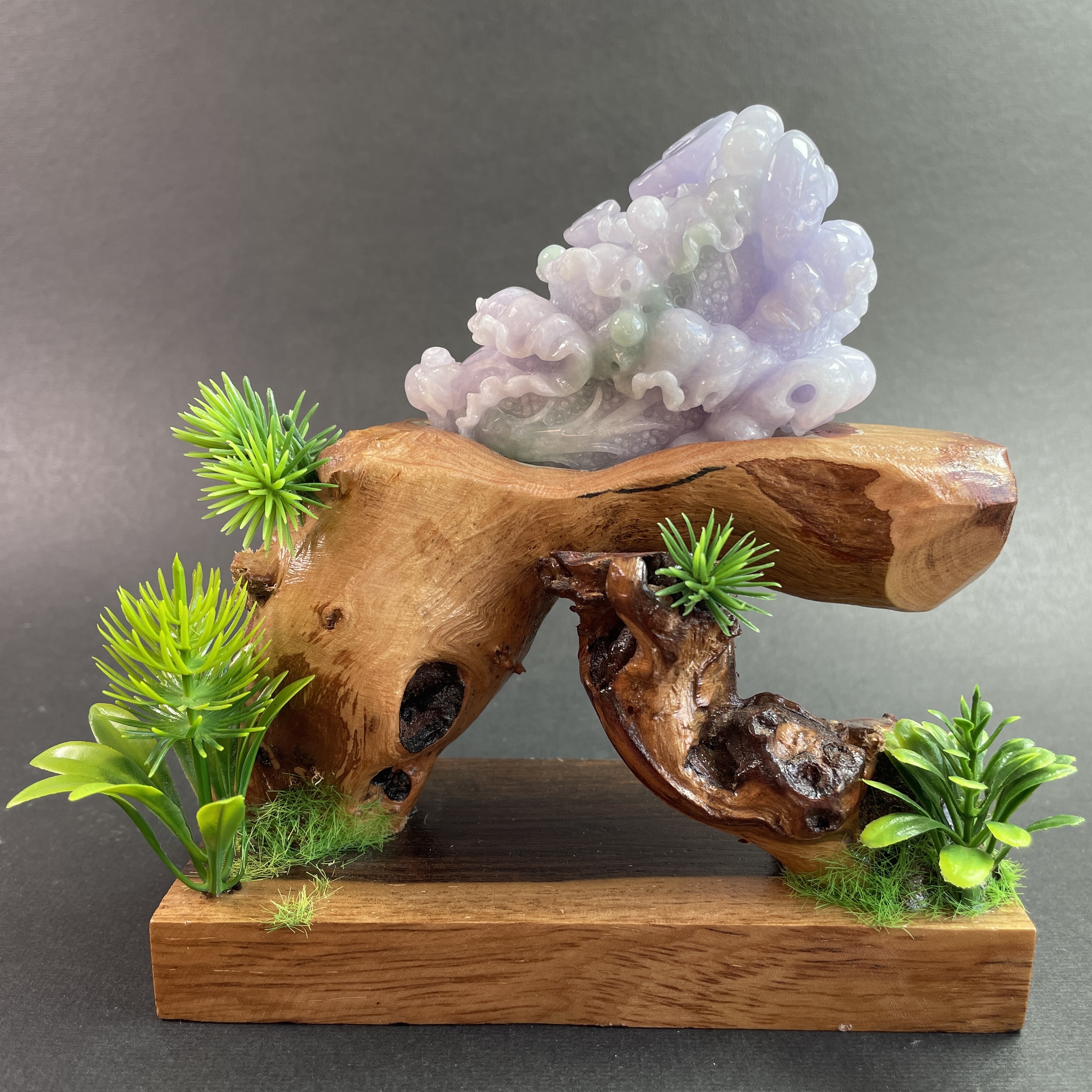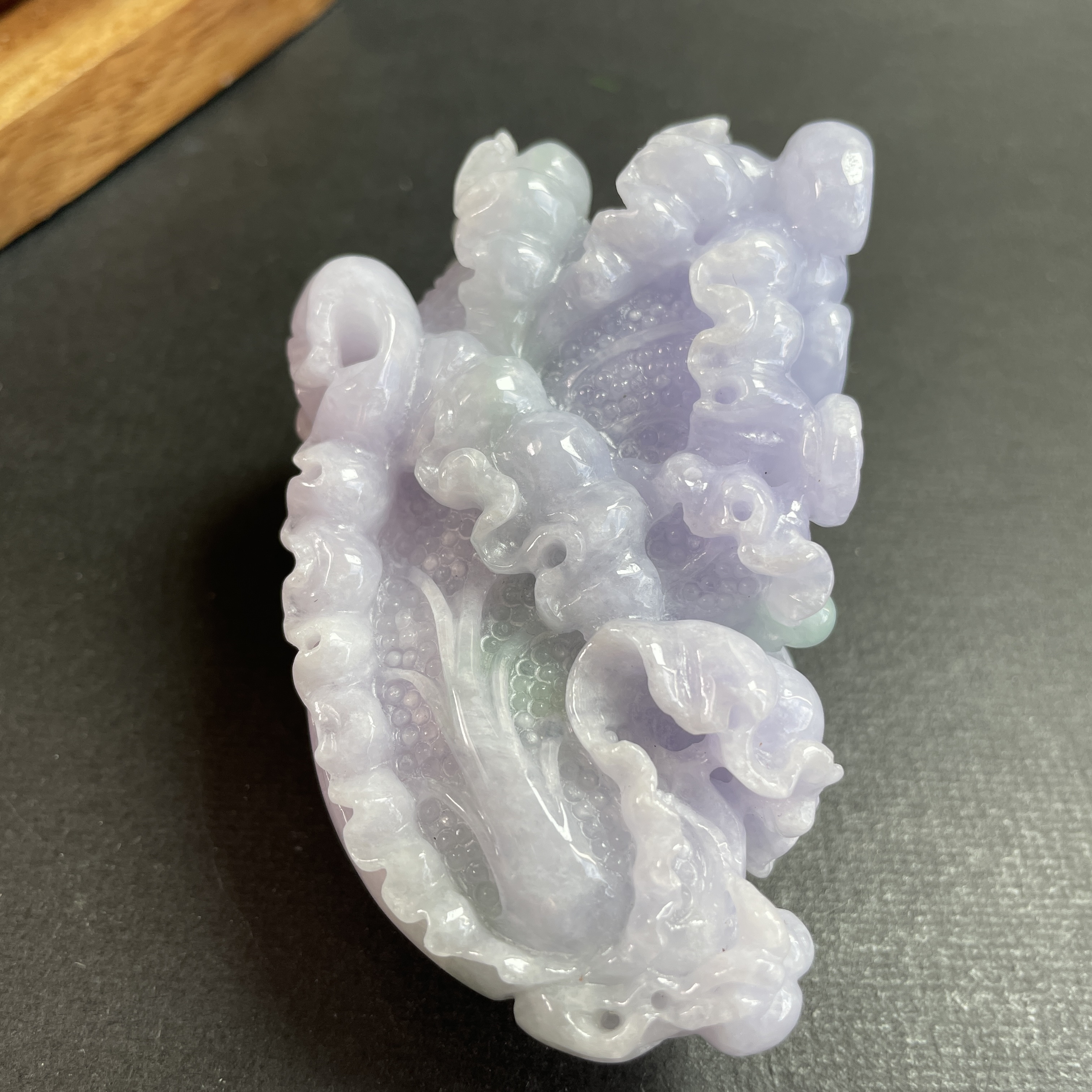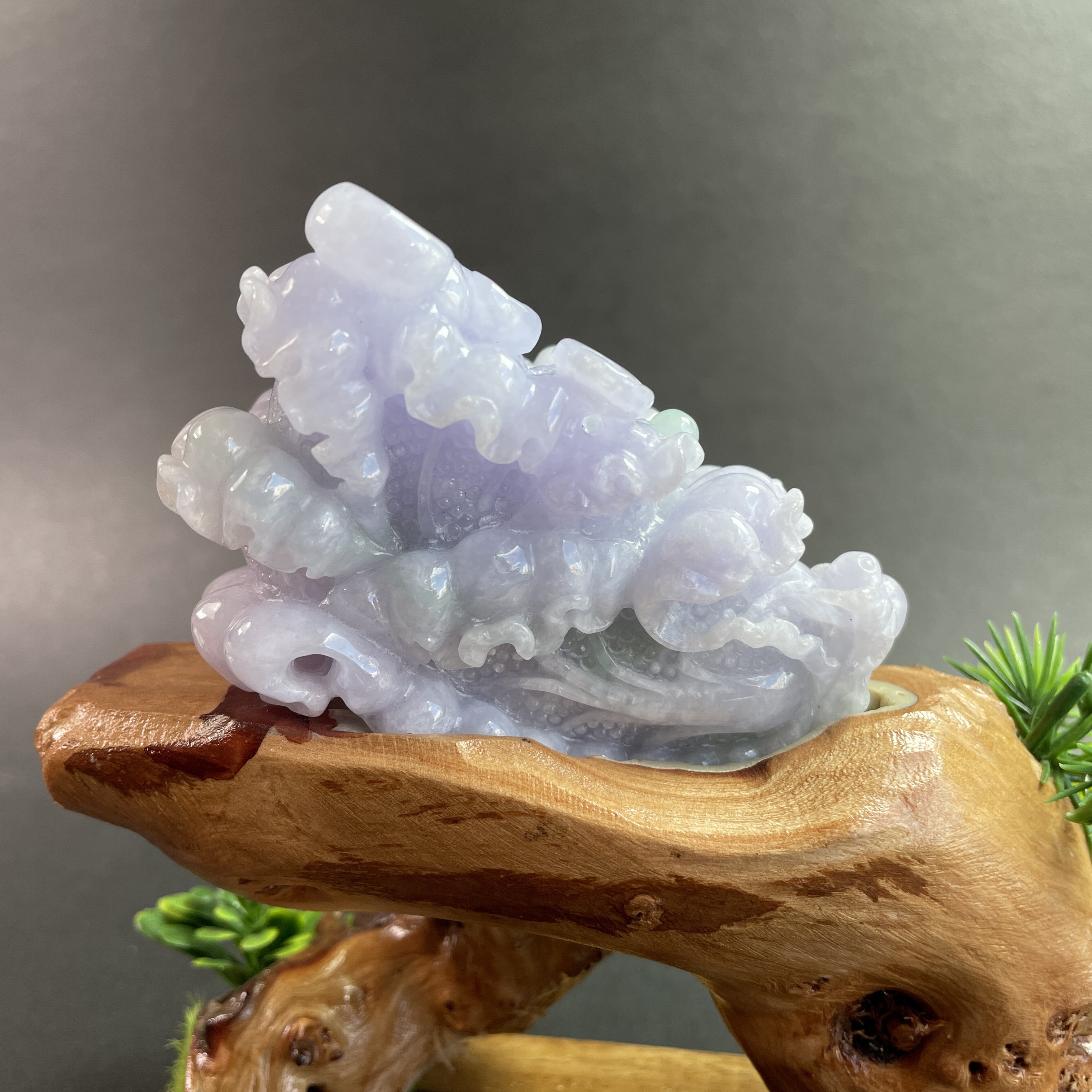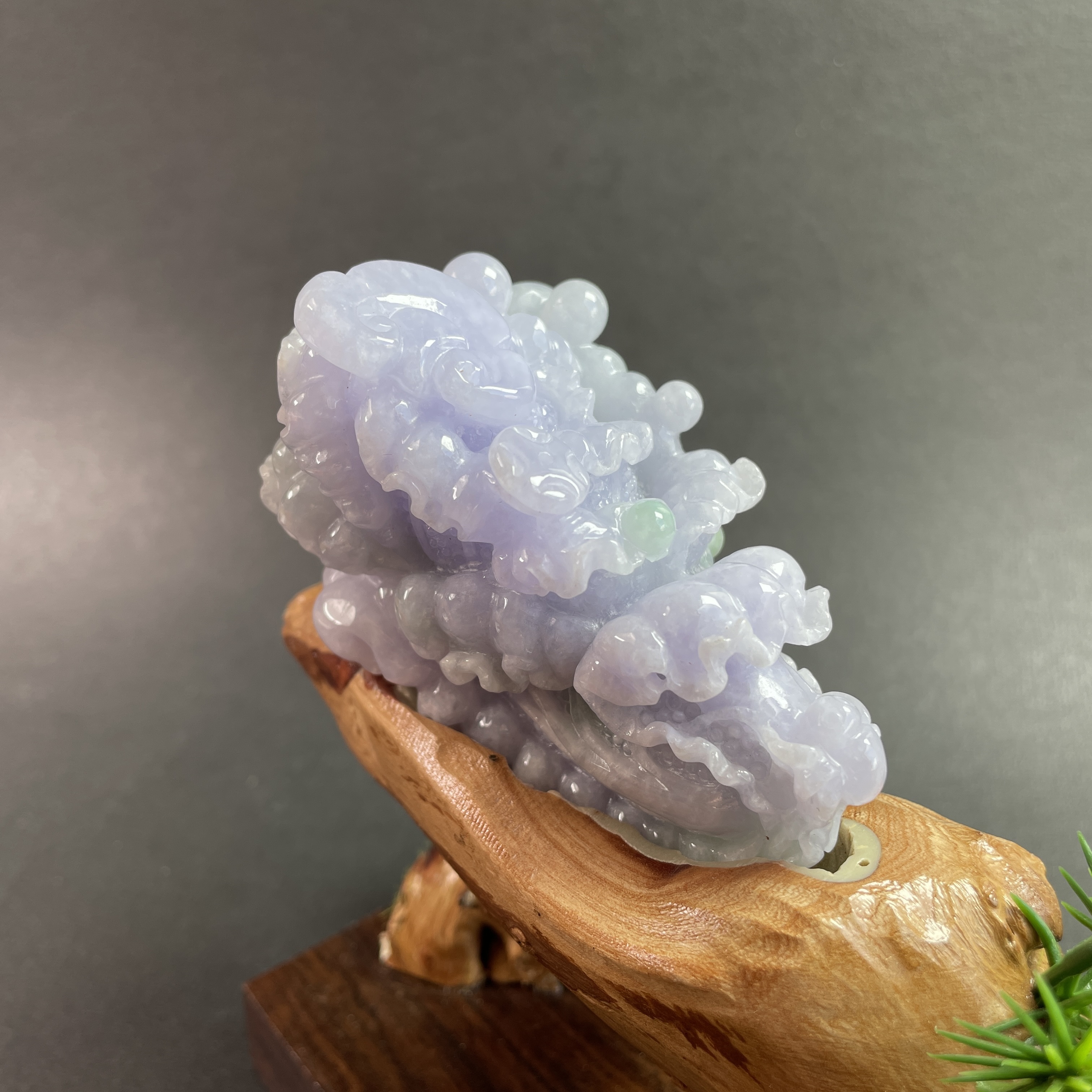 天然翡翠A玉,紫底帶綠飄花,紫色艷,見光不減,雕工精細,大件厚庄,配木座。有孔,也可綁繩作掛飾。