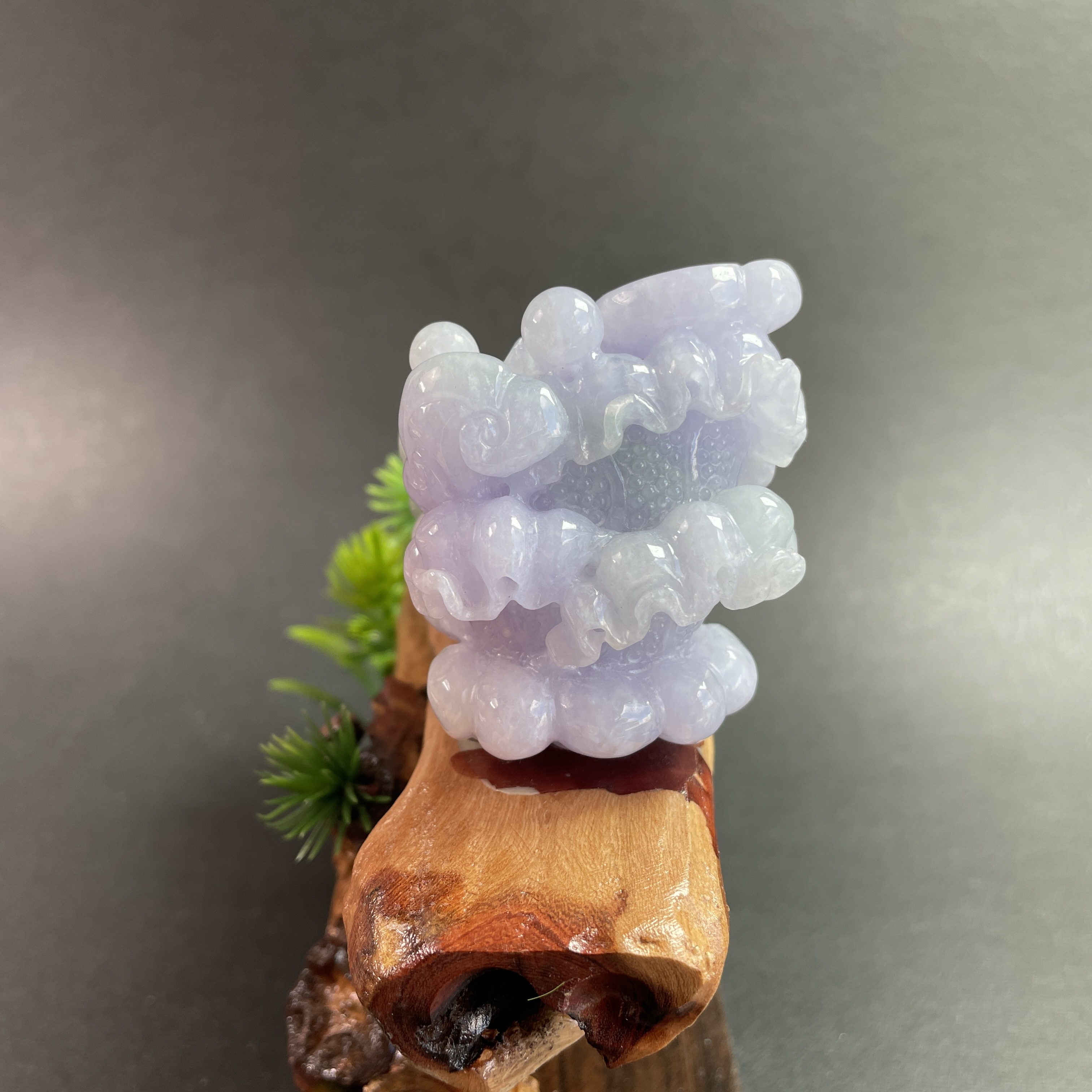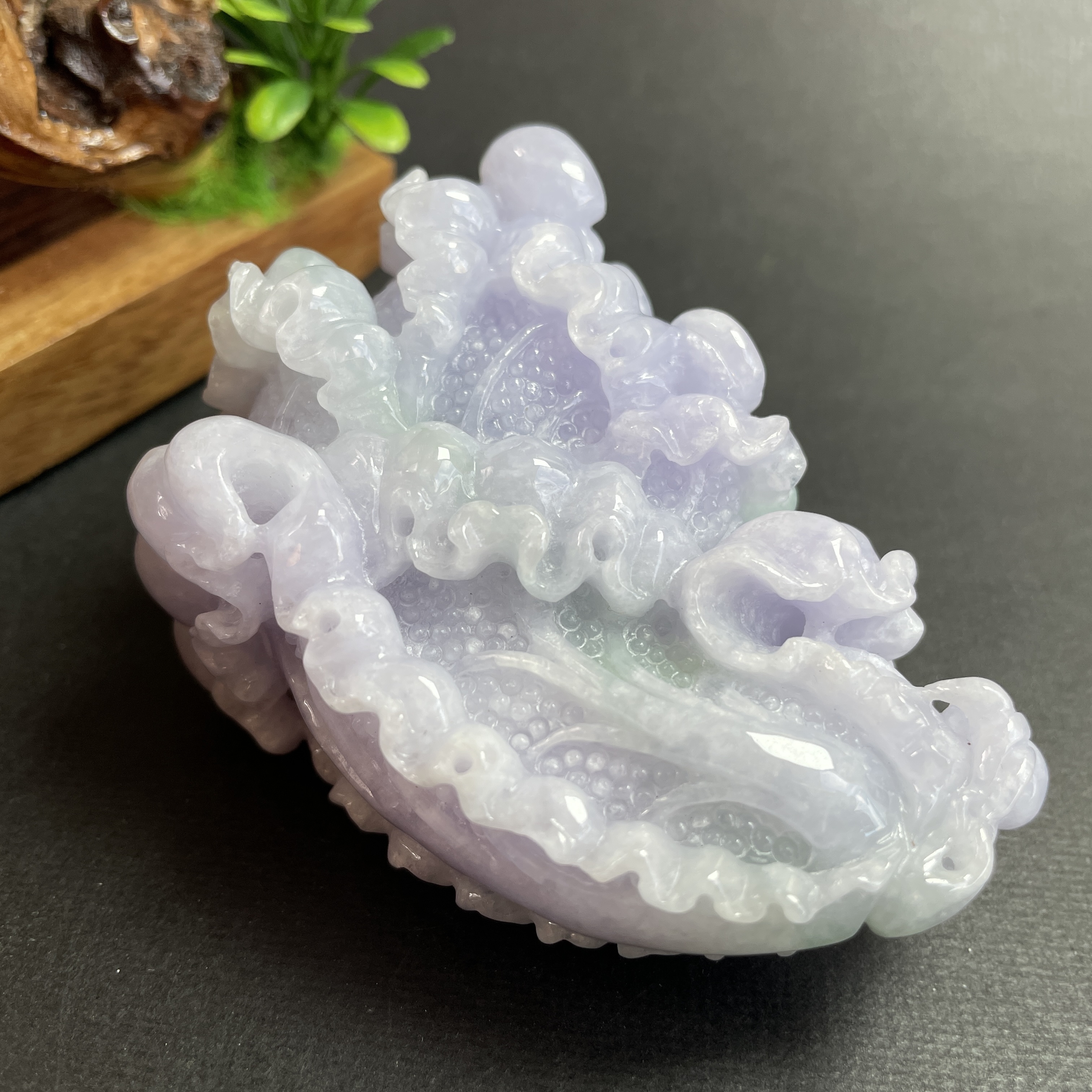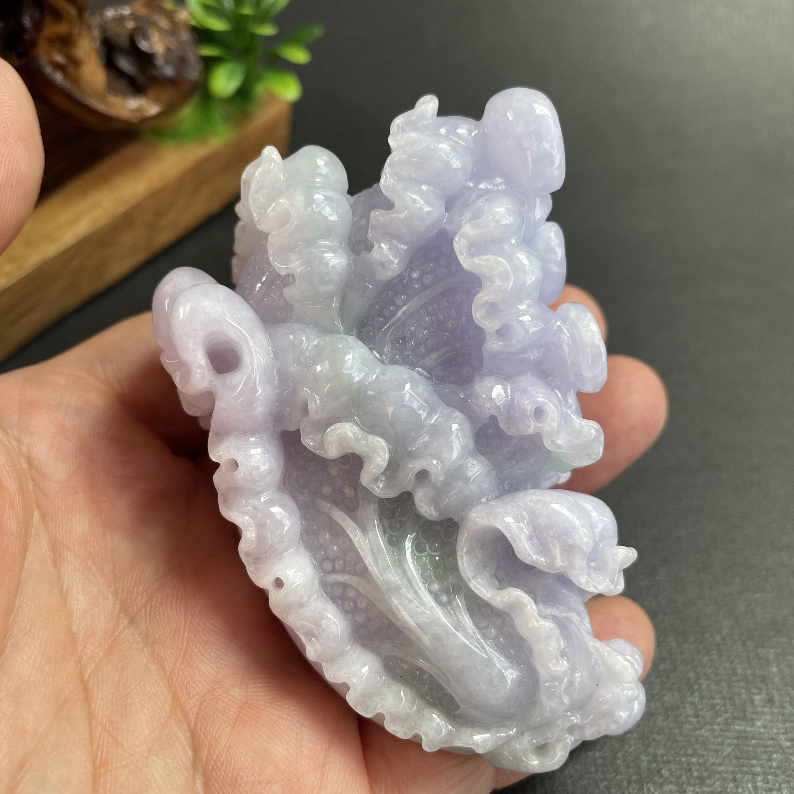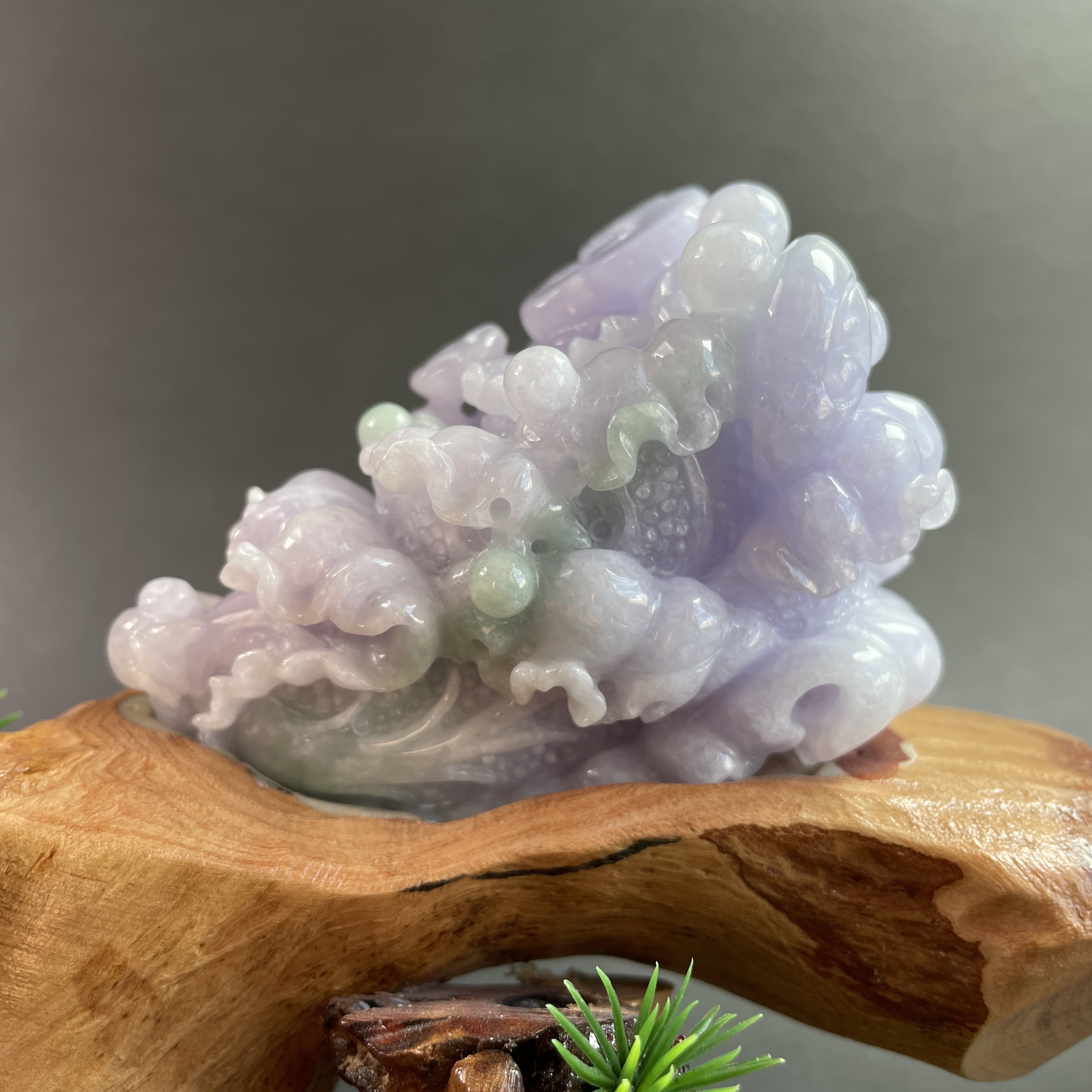 天然翡翠A玉,紫底帶綠飄花,紫色艷,見光不減,雕工精細,大件厚庄,配木座。有孔,也可綁繩作掛飾。