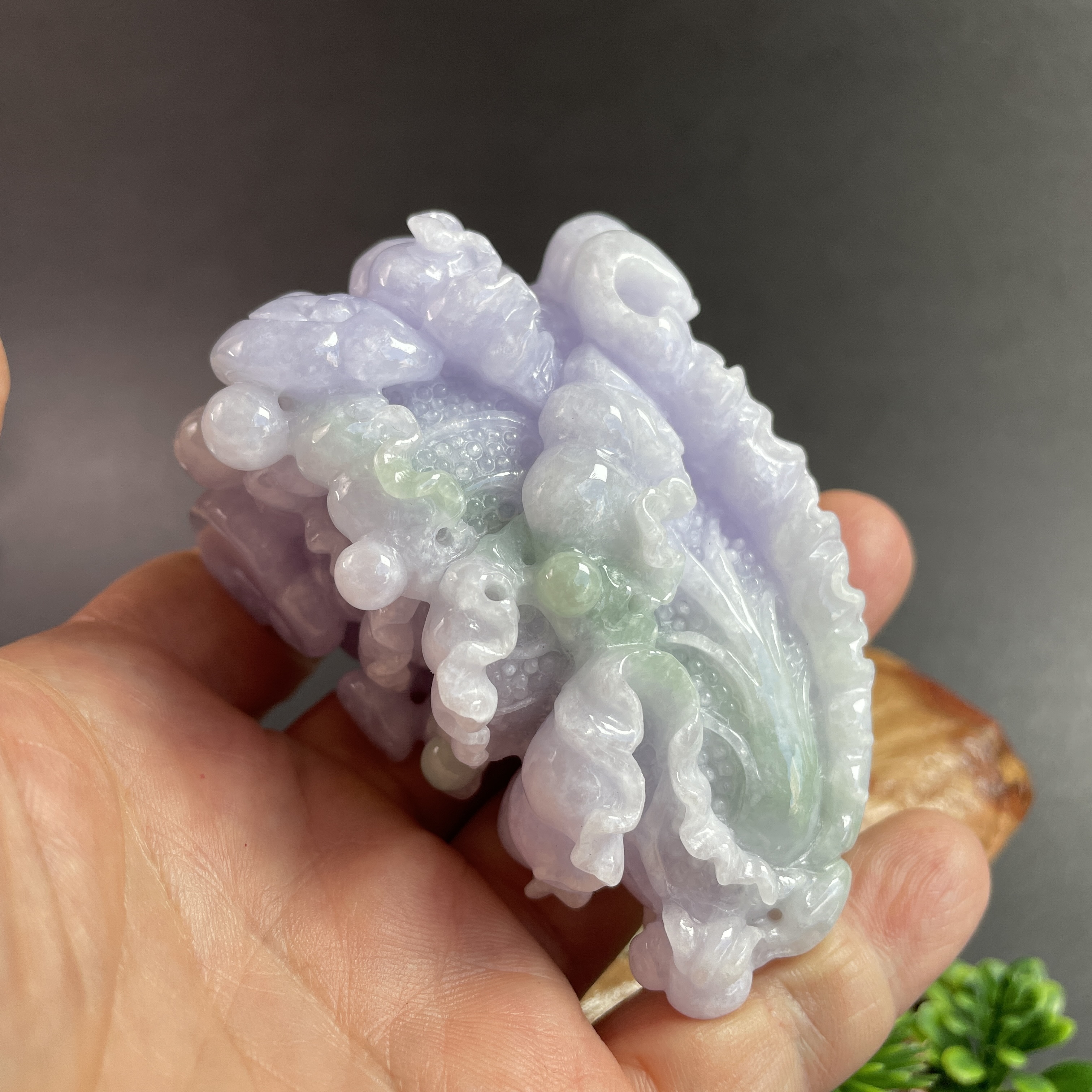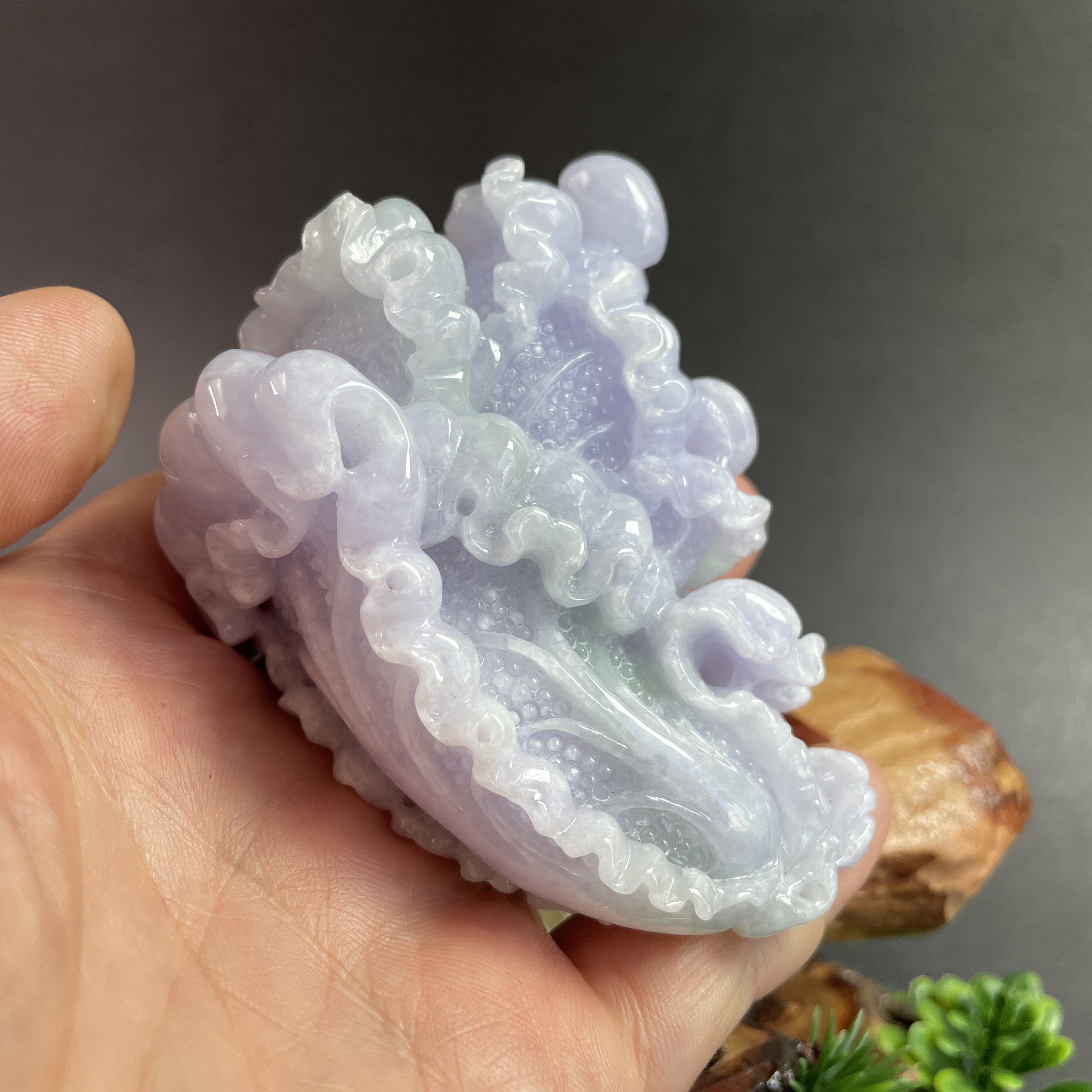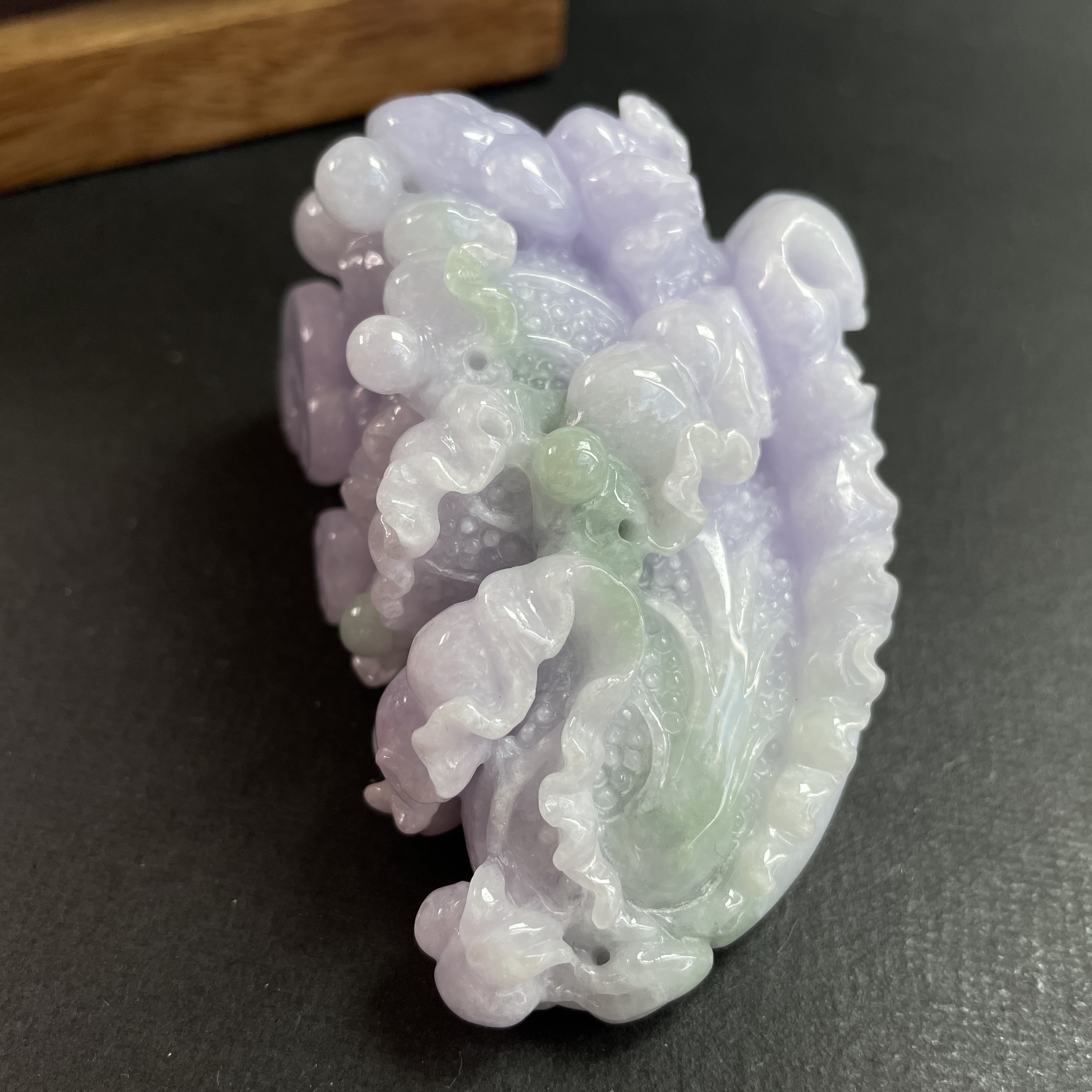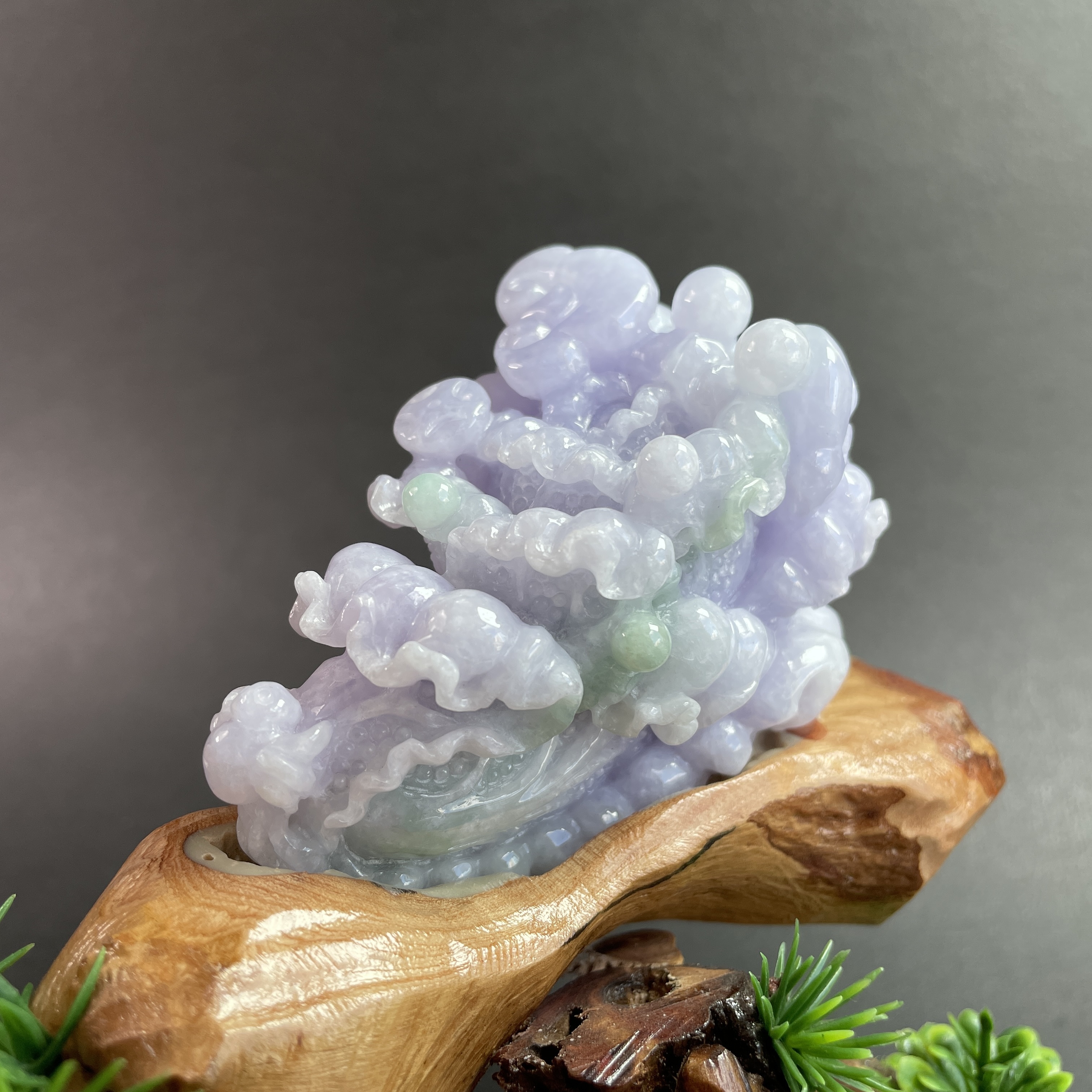 天然翡翠A玉,紫底帶綠飄花,紫色艷,見光不減,雕工精細,大件厚庄,配木座。有孔,也可綁繩作掛飾。