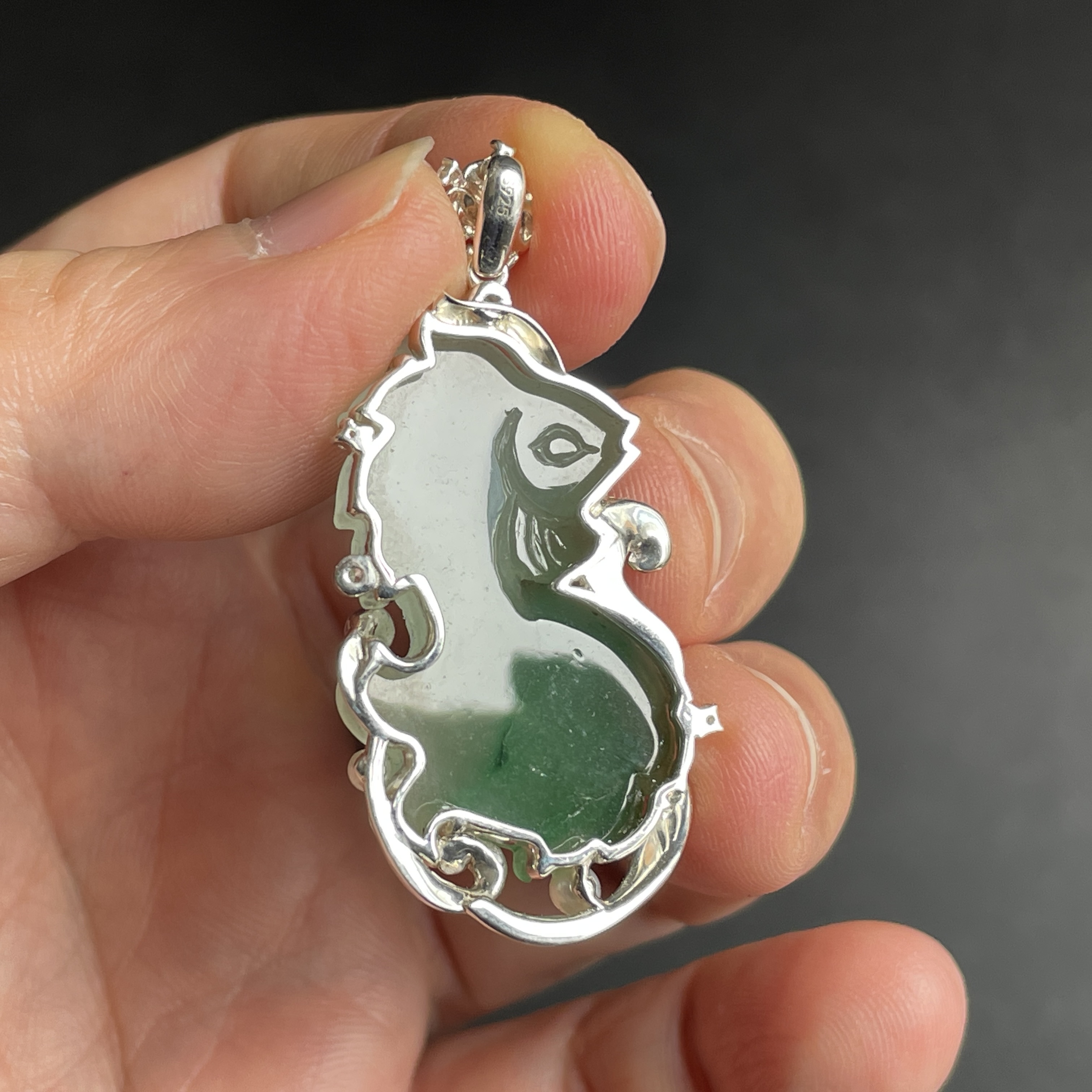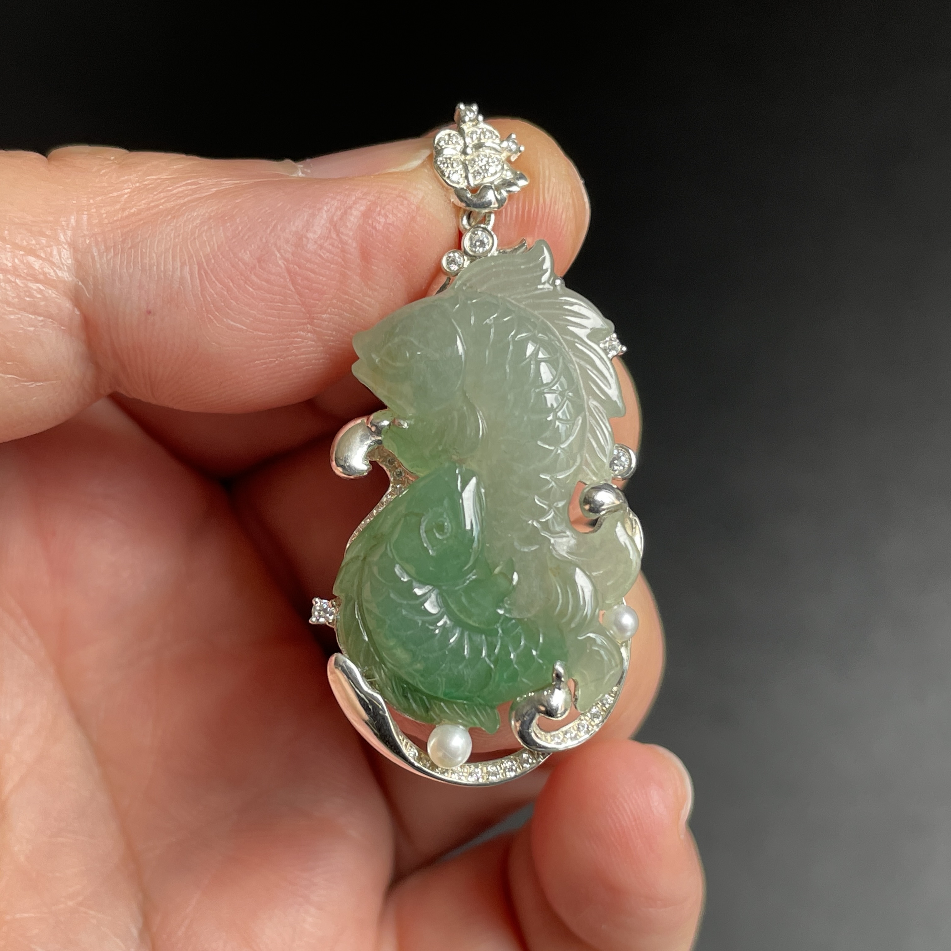 天然翡翠A玉,師傅在這件雙彩的天然翡翠,巧妙地手工雕刻了兩條鯉魚,鱗片精雕細琢,魚鰭靈動欲飛。碧波流轉間宛若遊動。925銀配珍珠、鋯石鑲嵌。以玉石承載「雙魚戲水」之美