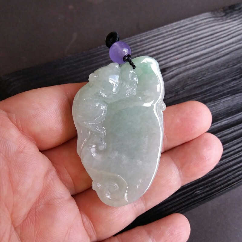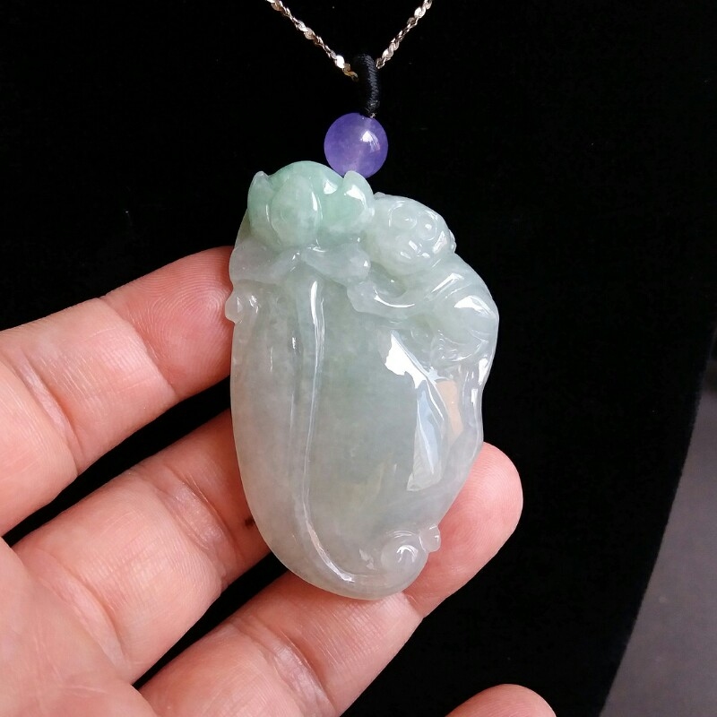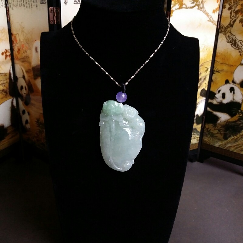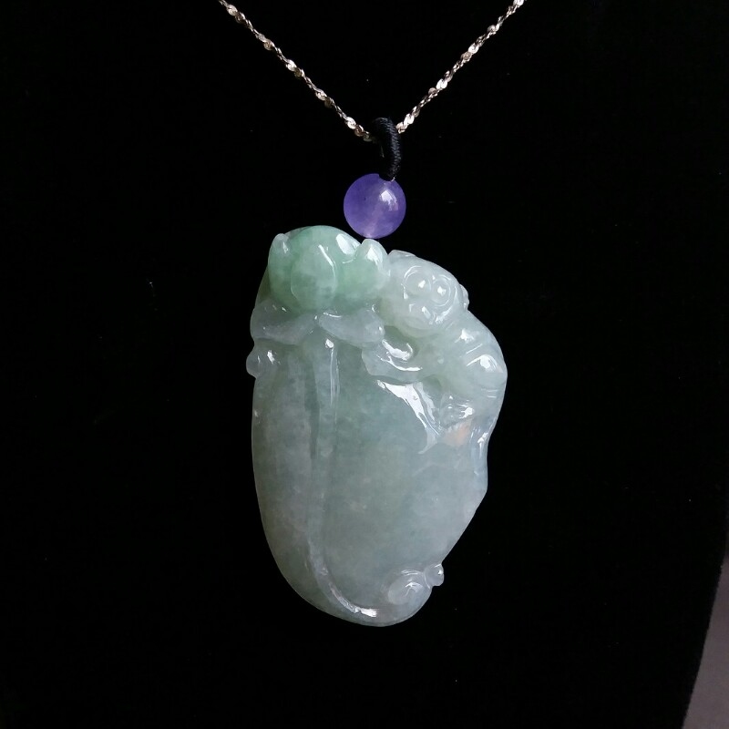 • 冰糯蓮花靈猴壽桃吊墜, 天然翡翠A玉, 緬甸玉, Jade, Jadeite